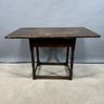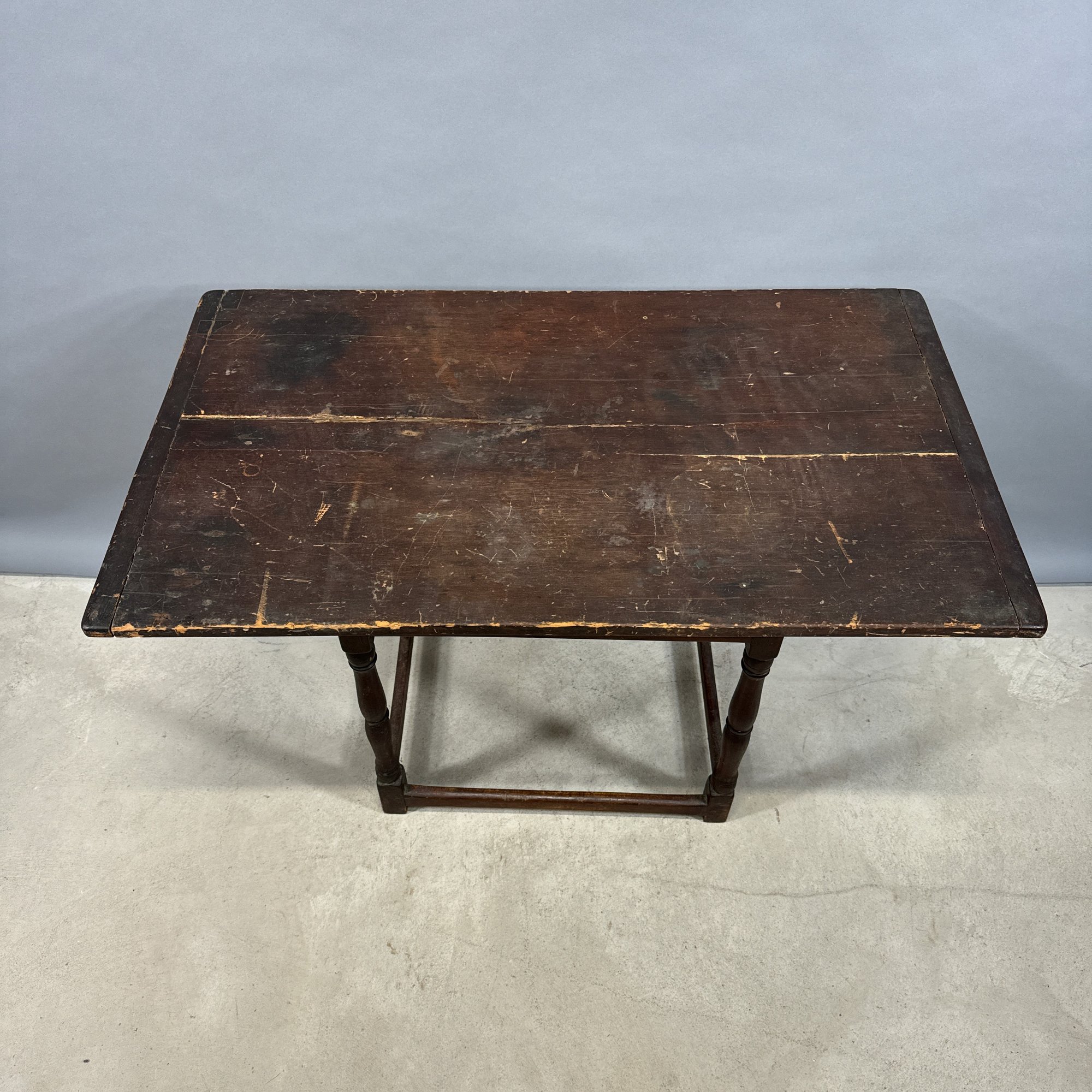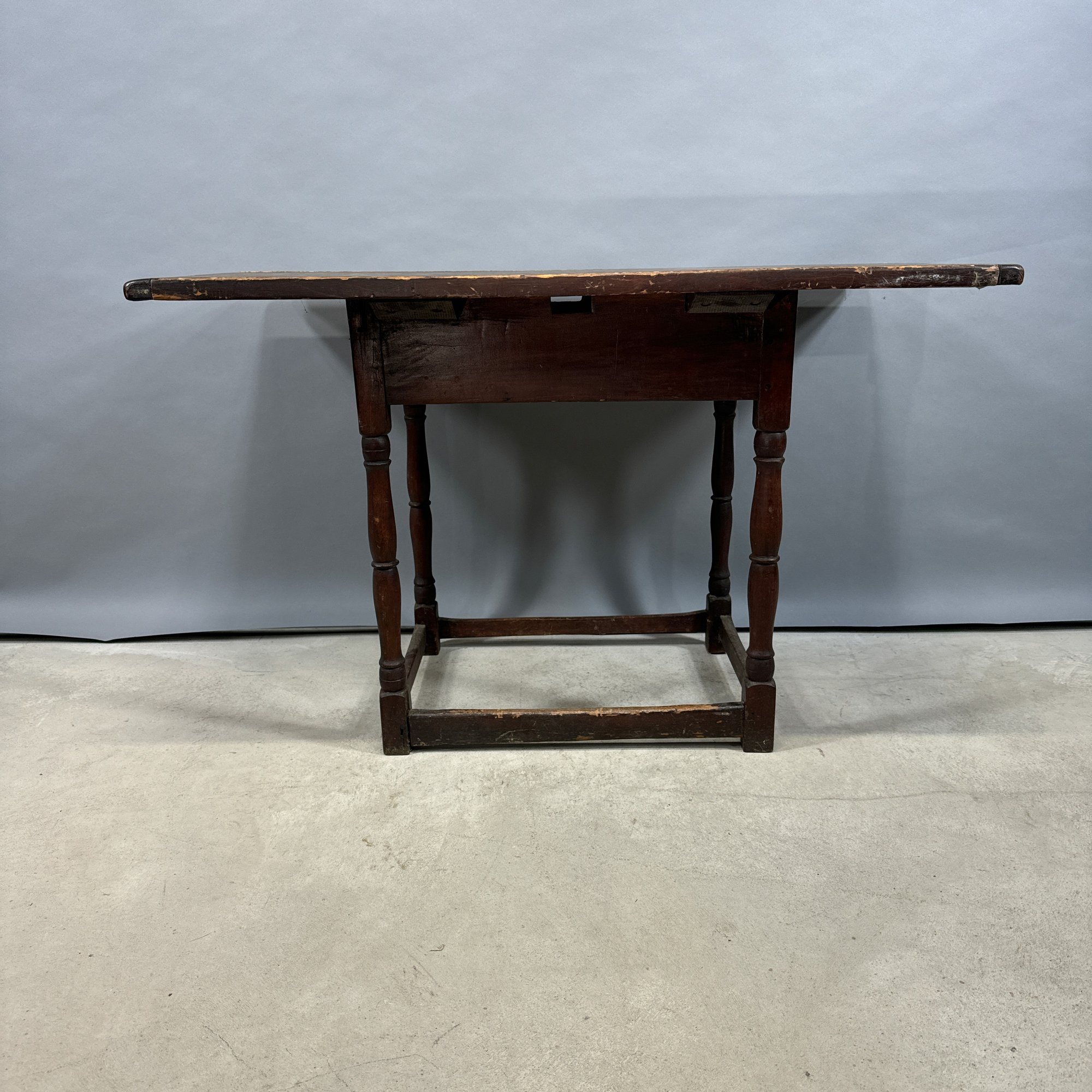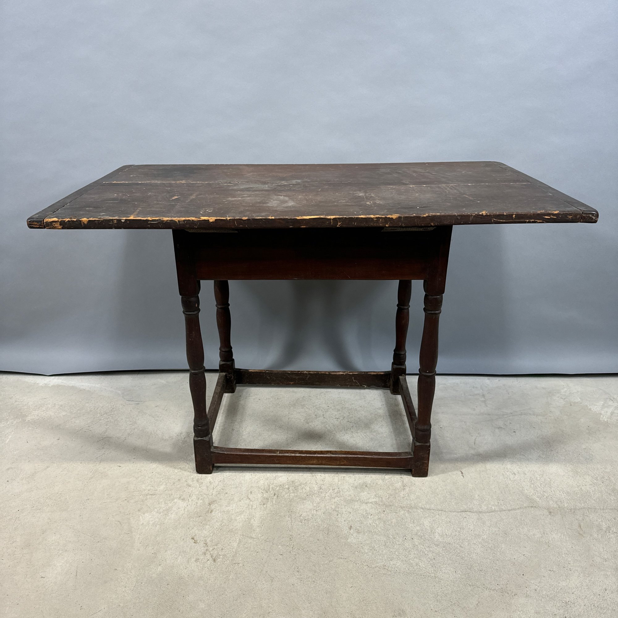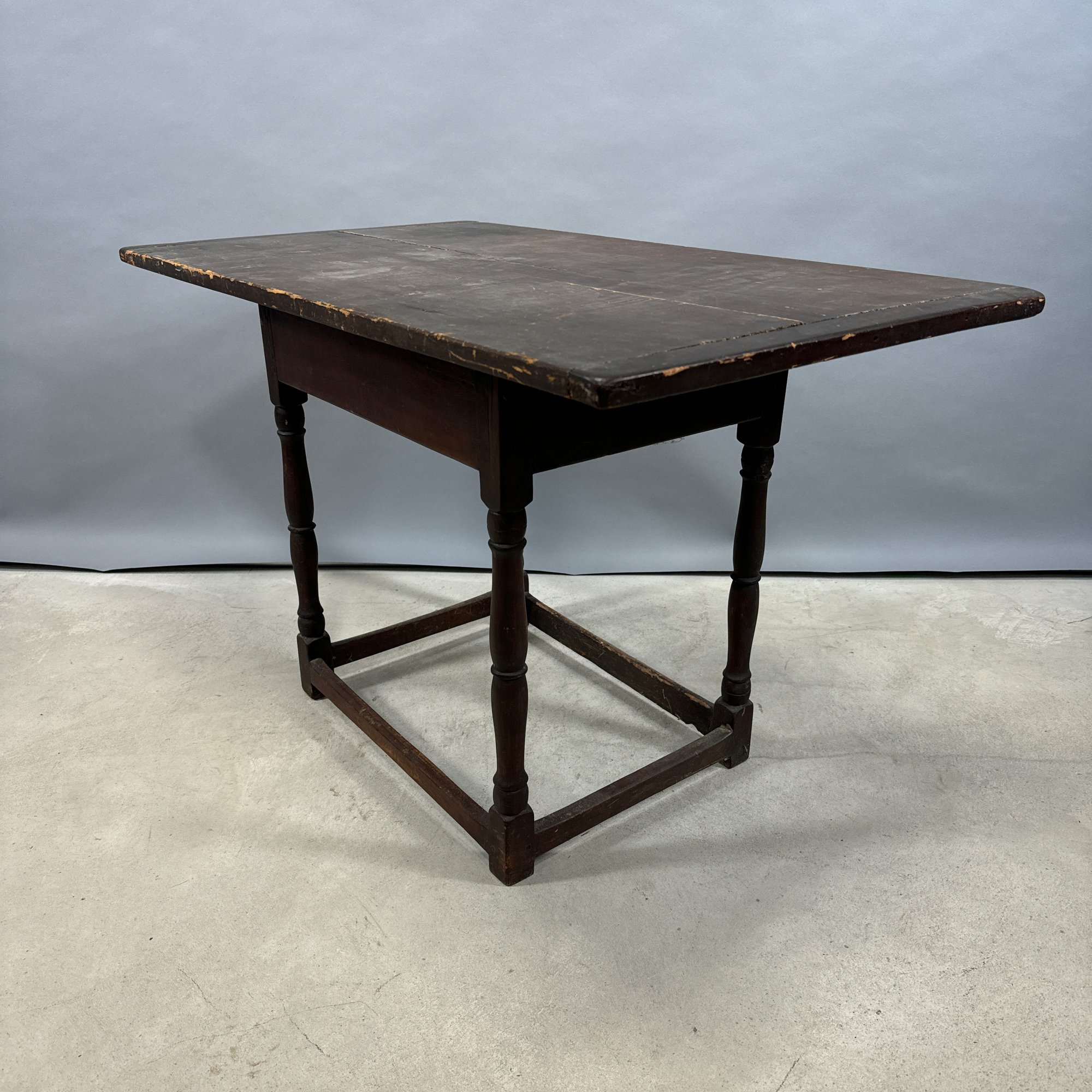 New England Pine Tavern Table in Black Paint. The rectangular overhanging two-board top above a plain frieze, raised on ring-turned vase-shaped and block legs joined by a box stretcher.