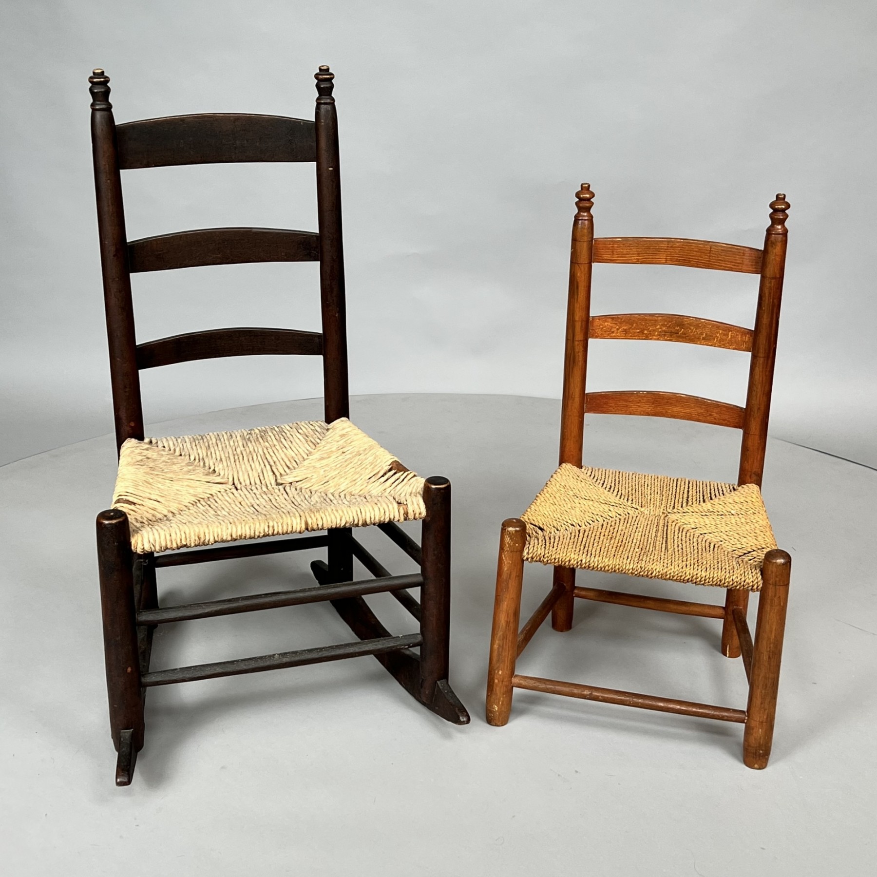 The first in black paint and the second stained pine, each with woven rush seat, and with the characteristic double turned finials.