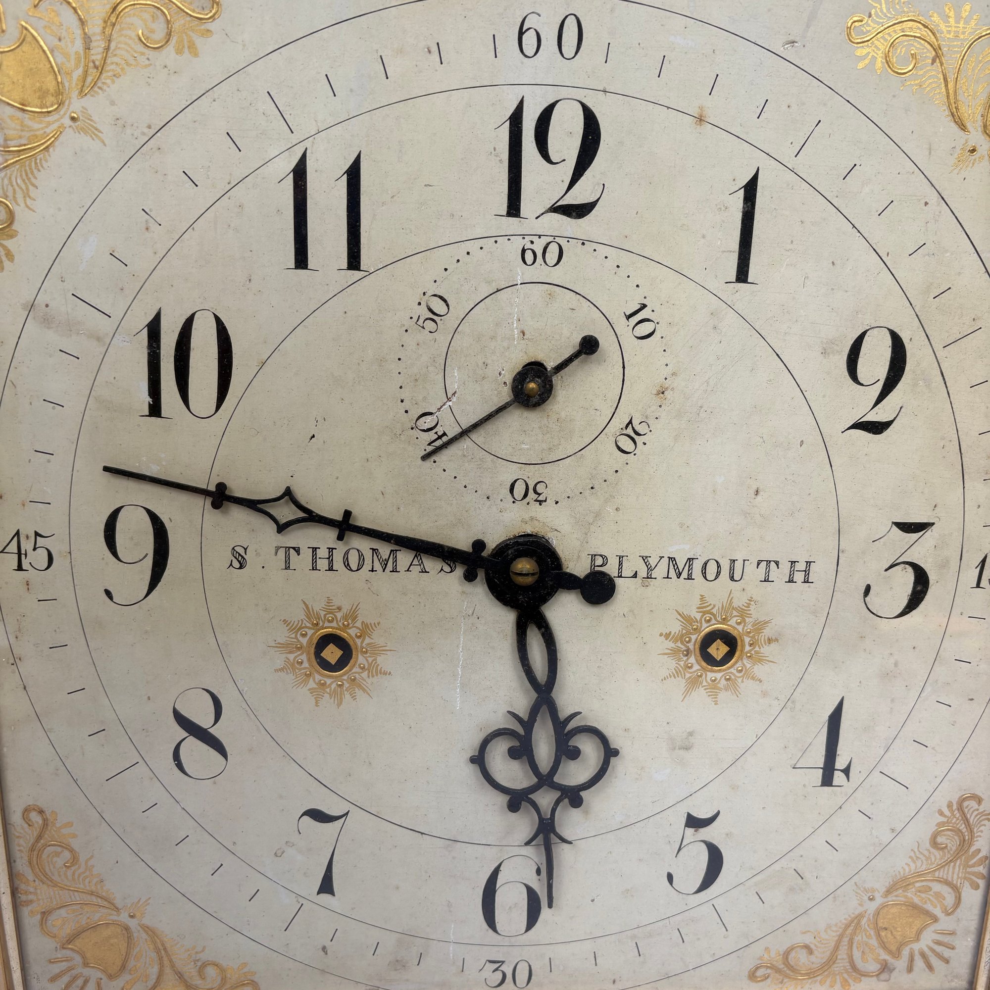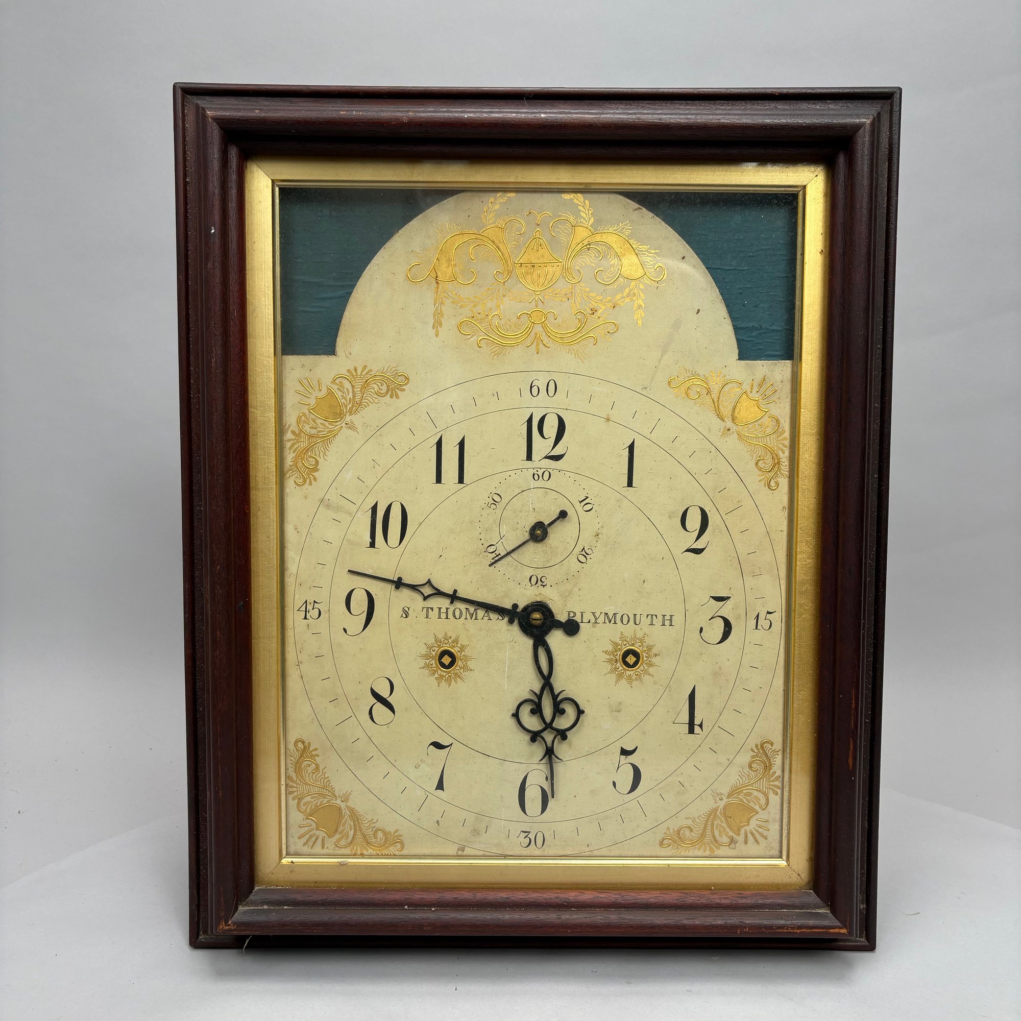 New England Tall Case Clock Face, Seth Thomas, Plymouth, Connecticut, 1813-1818. The gilt-decorated white wood face signed "S. Thomas/ Plymouth;" housed in a walnut shadowbox frame.