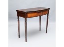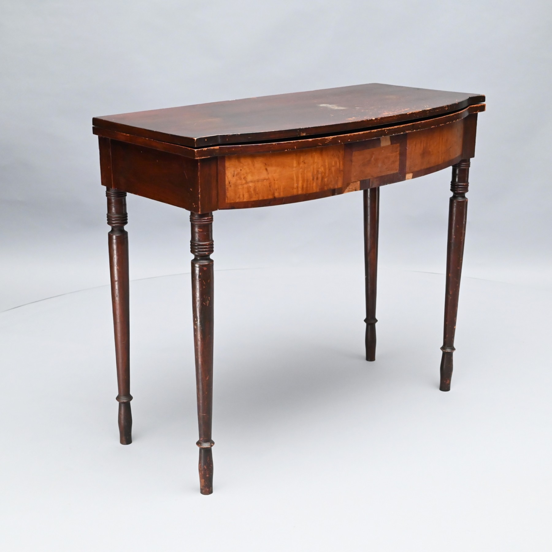 The oblong hinged top with elliptical front, above a tiger maple and contrasting mahogany veneer frieze, raised on turned tapered legs ending in swelled cuffs.