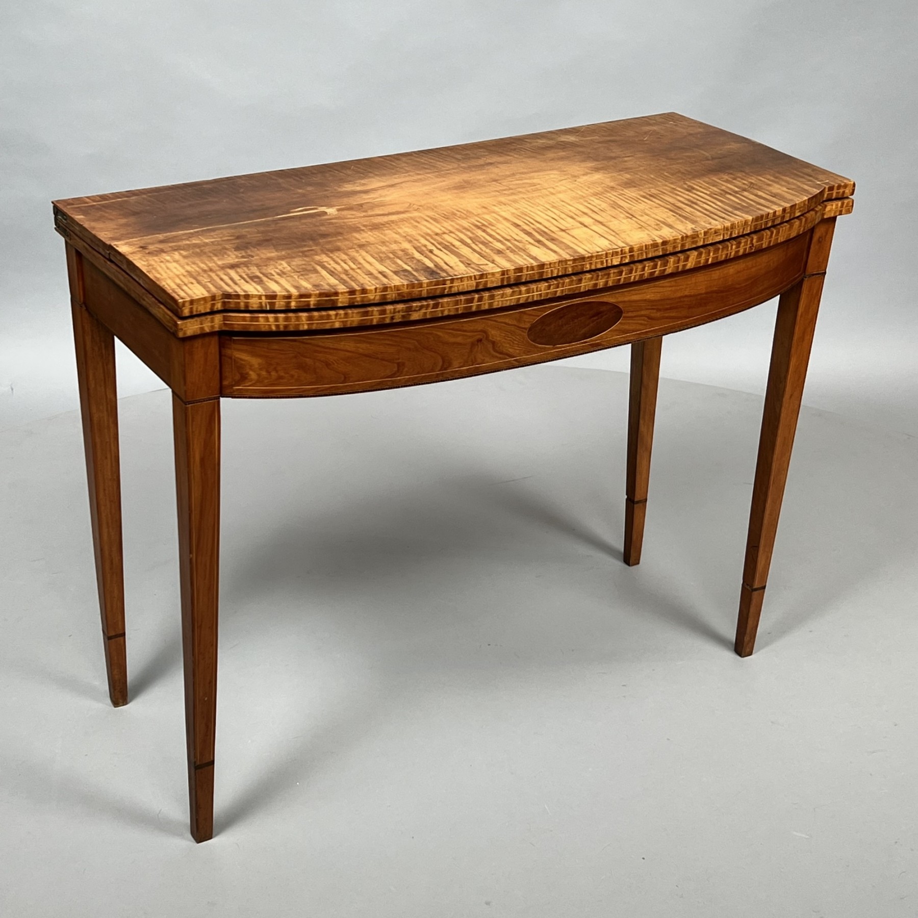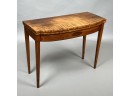 The oblong top with bowfront above a string inlaid frieze centering a contrasting oval panel, raised on square tapered legs.