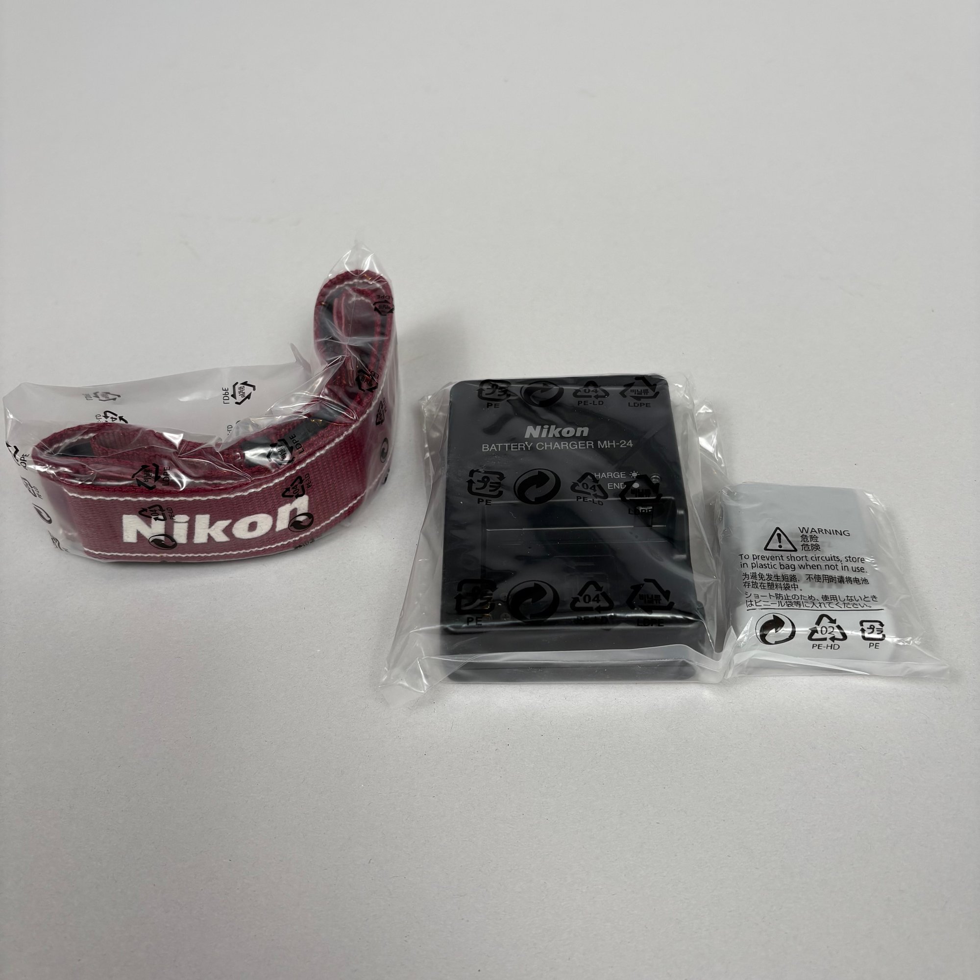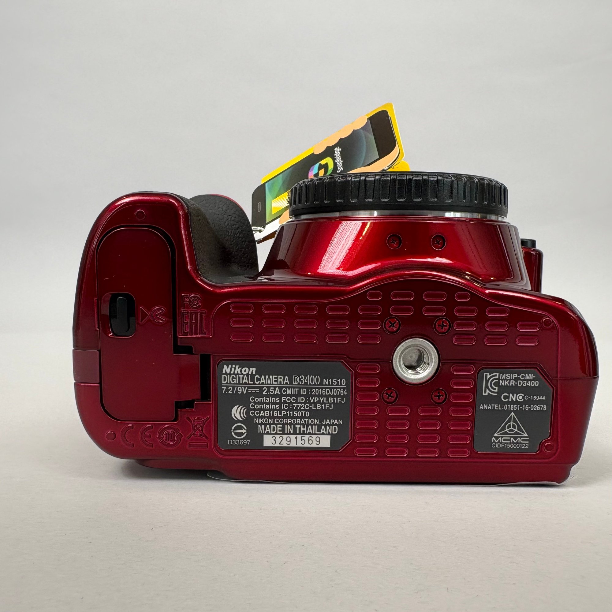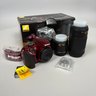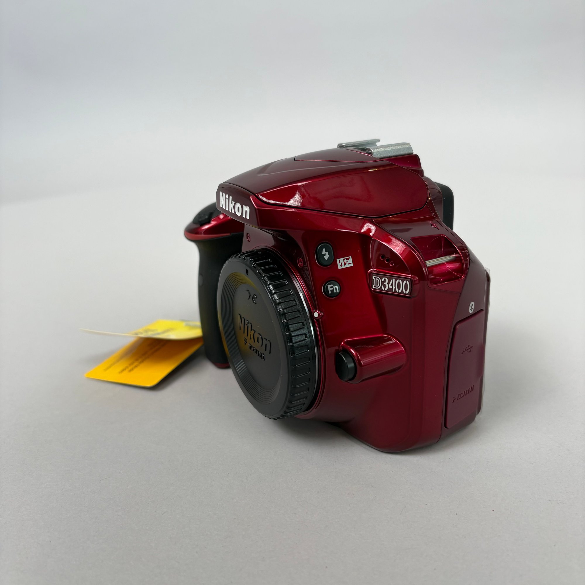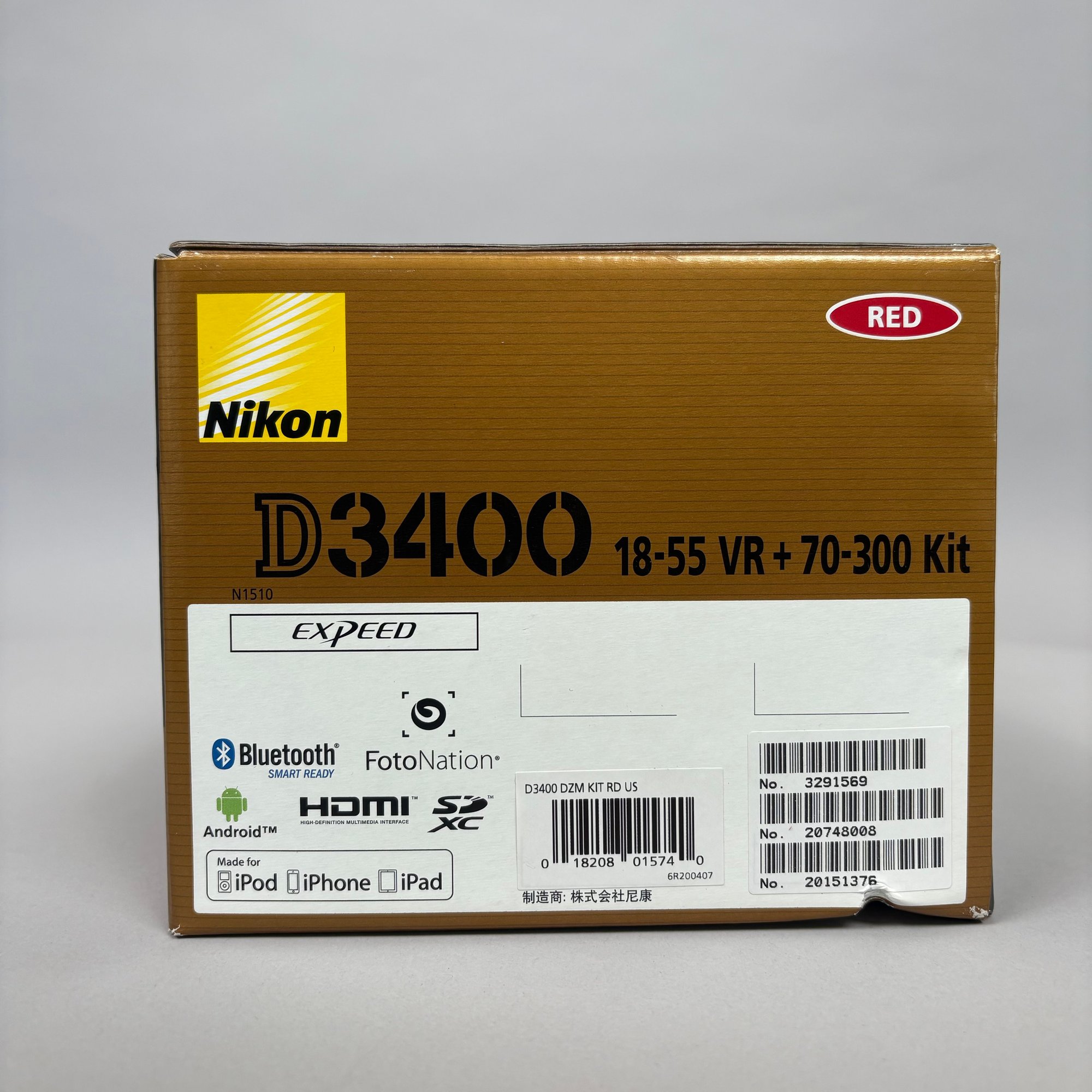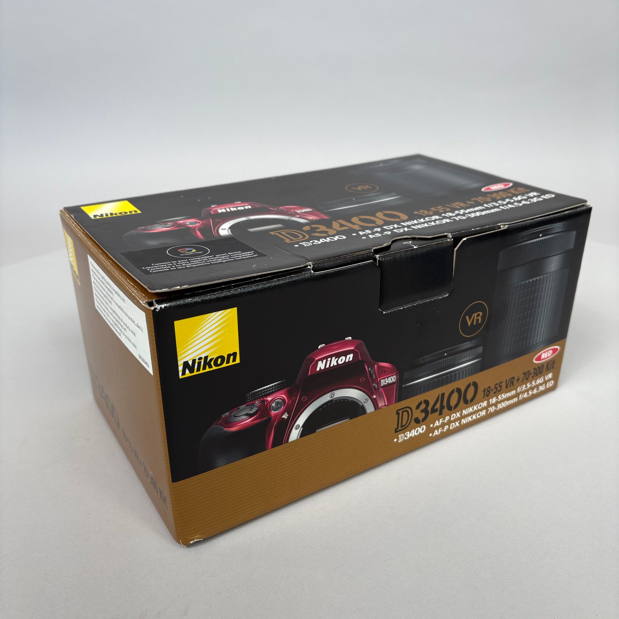 New in Box Nikon D3400 18-55 VR + 70-300 Kit. Including a red camera, an AF-P DX Nikkor 18-55mm f/3.5-5.6G VR, an AF-P DX Nikkor 70-300mm f/4.5-6.3G ED, charger and one battery, and a camera strap.
