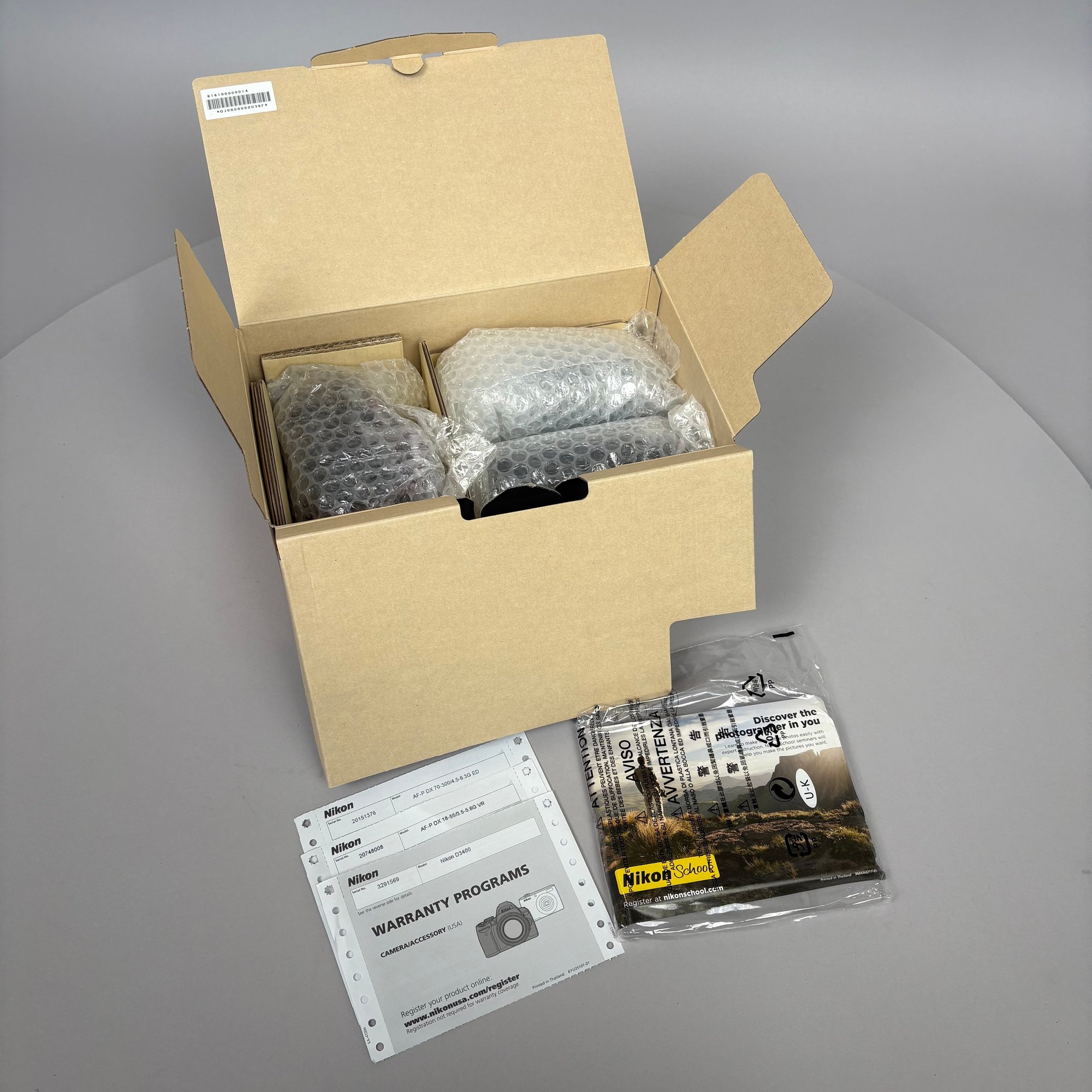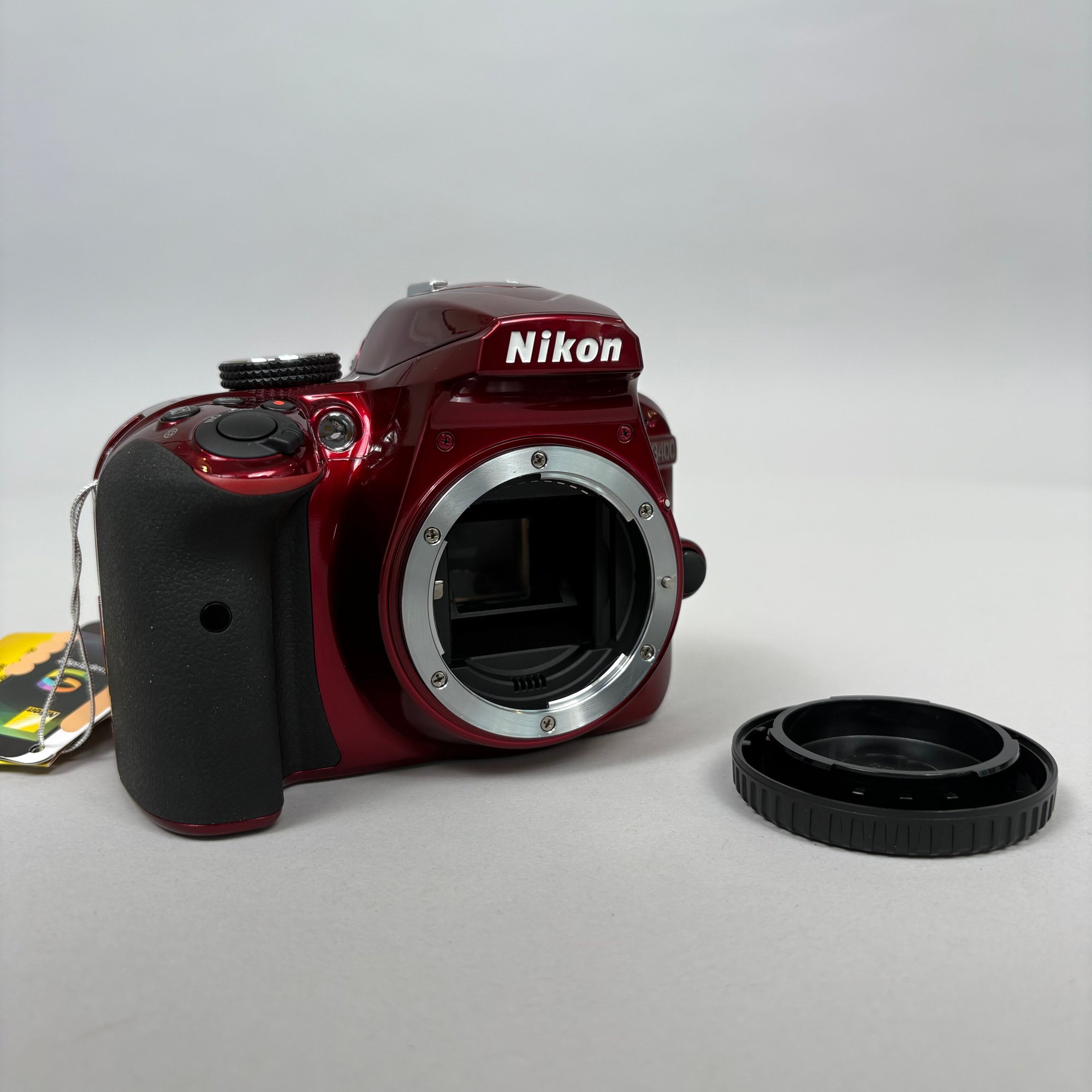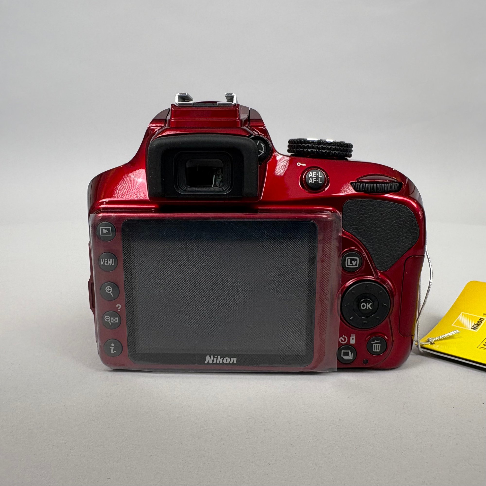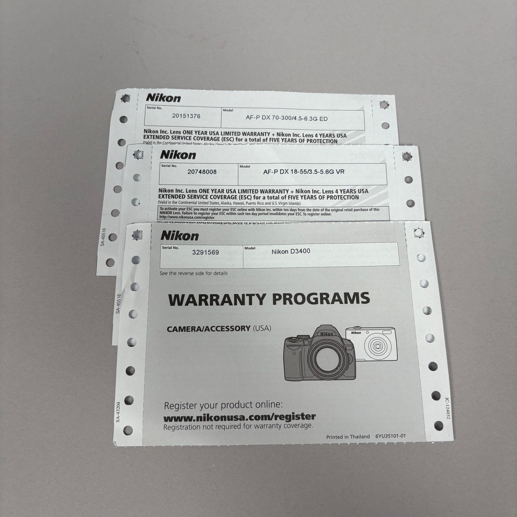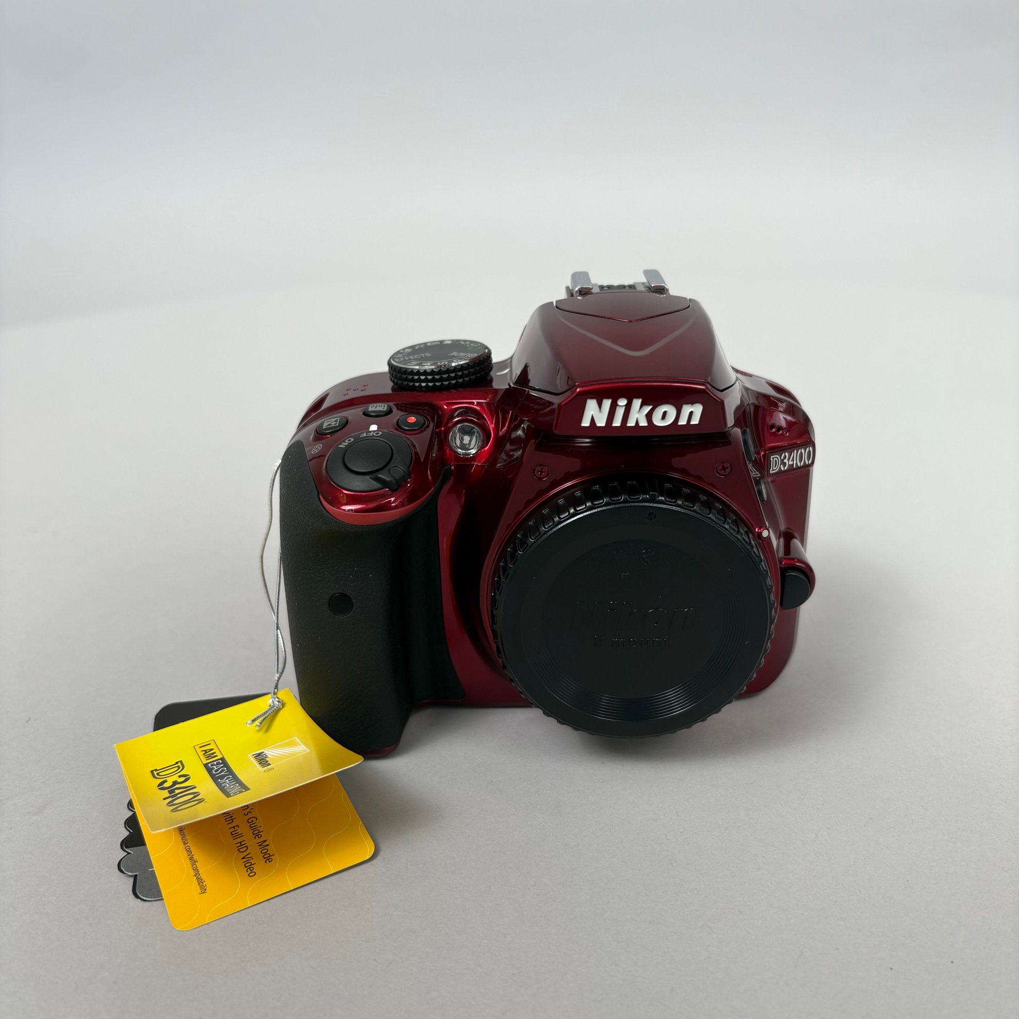 New in Box Nikon D3400 18-55 VR + 70-300 Kit. Including a red camera, an AF-P DX Nikkor 18-55mm f/3.5-5.6G VR, an AF-P DX Nikkor 70-300mm f/4.5-6.3G ED, charger and one battery, and a camera strap.