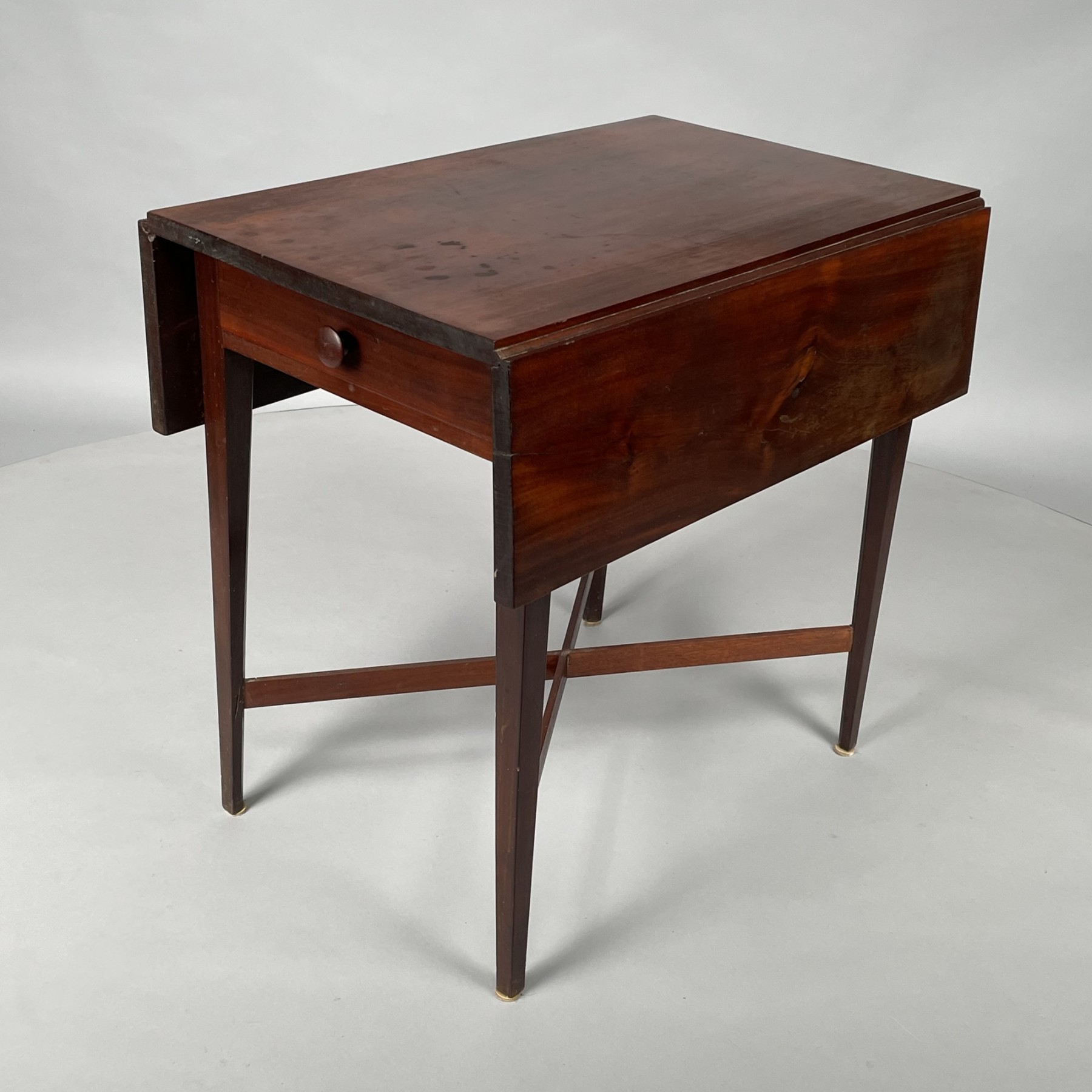 The oblong hinged top with rectangular leaves, above a straight frieze with single drawer, raised on square tapered legs joined by an X-form stretcher.