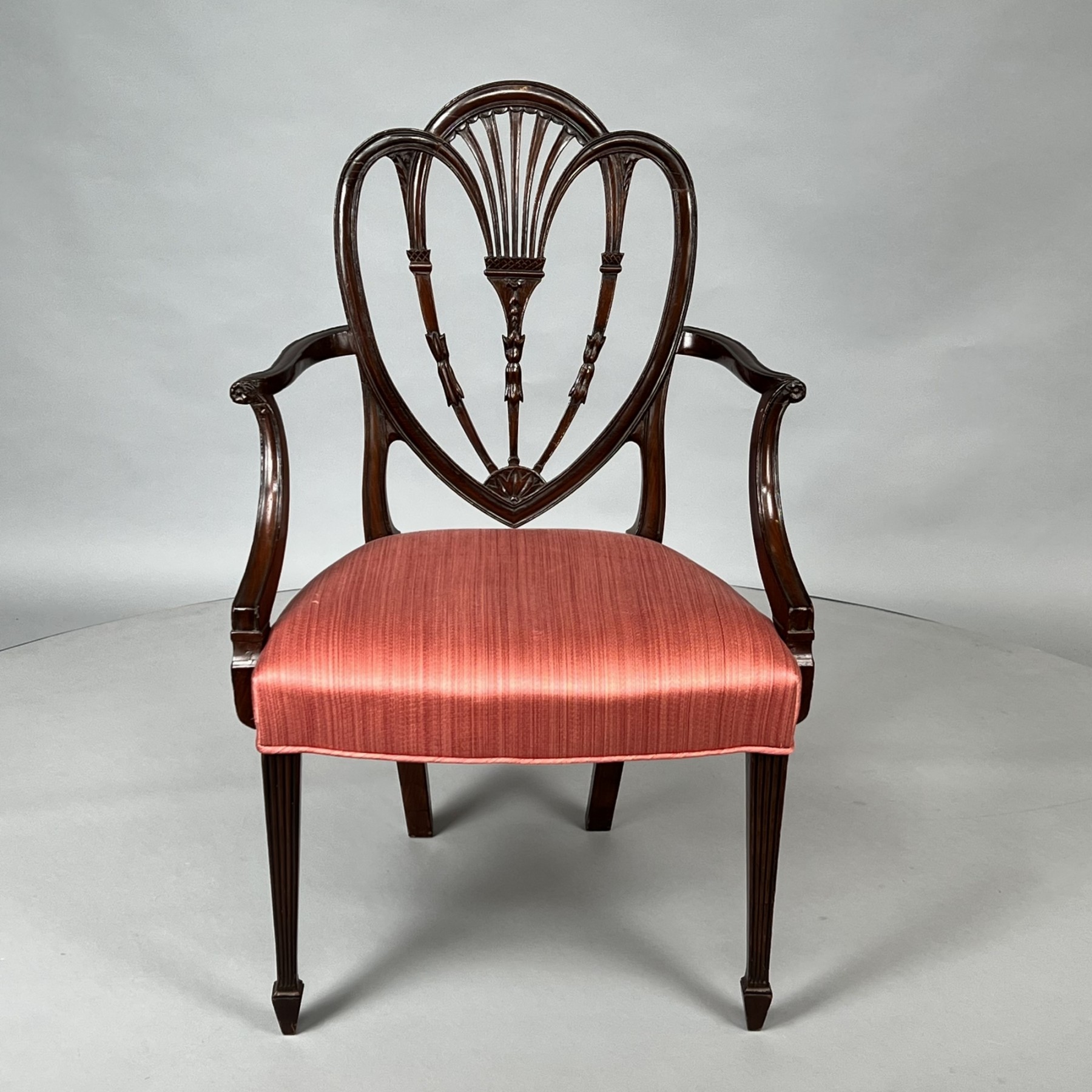 The molded heart-shaped back enclosing a fanned splat above three stylized baskets and bell flowers, the out-scrolled arms on curved supports, the over-upholstered seat raised on frontal square tapered legs ending in spade feet.