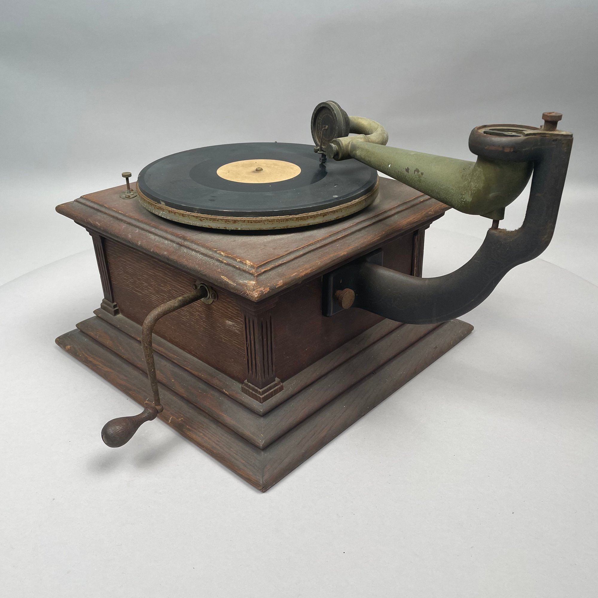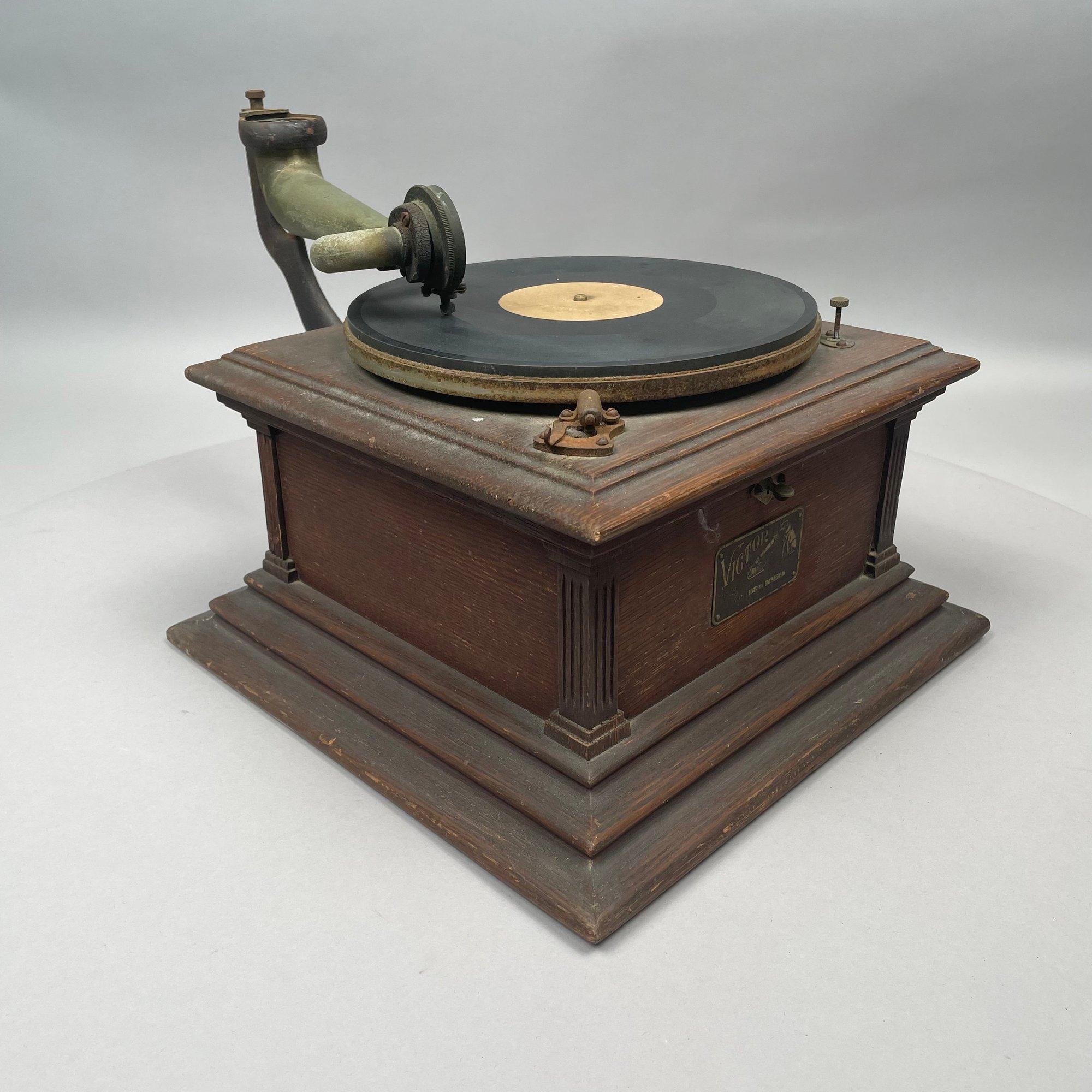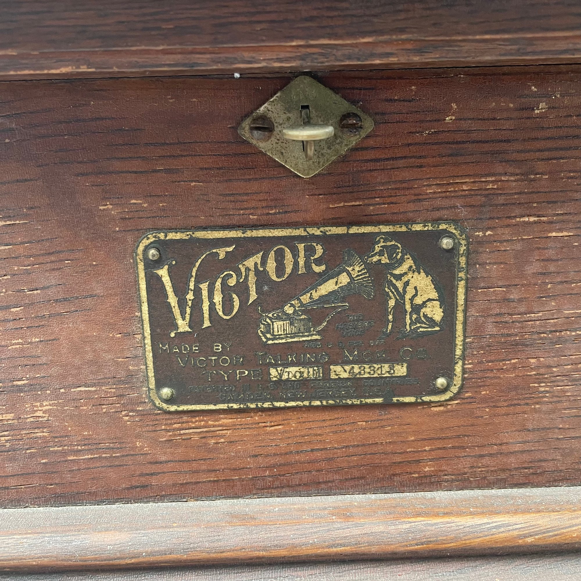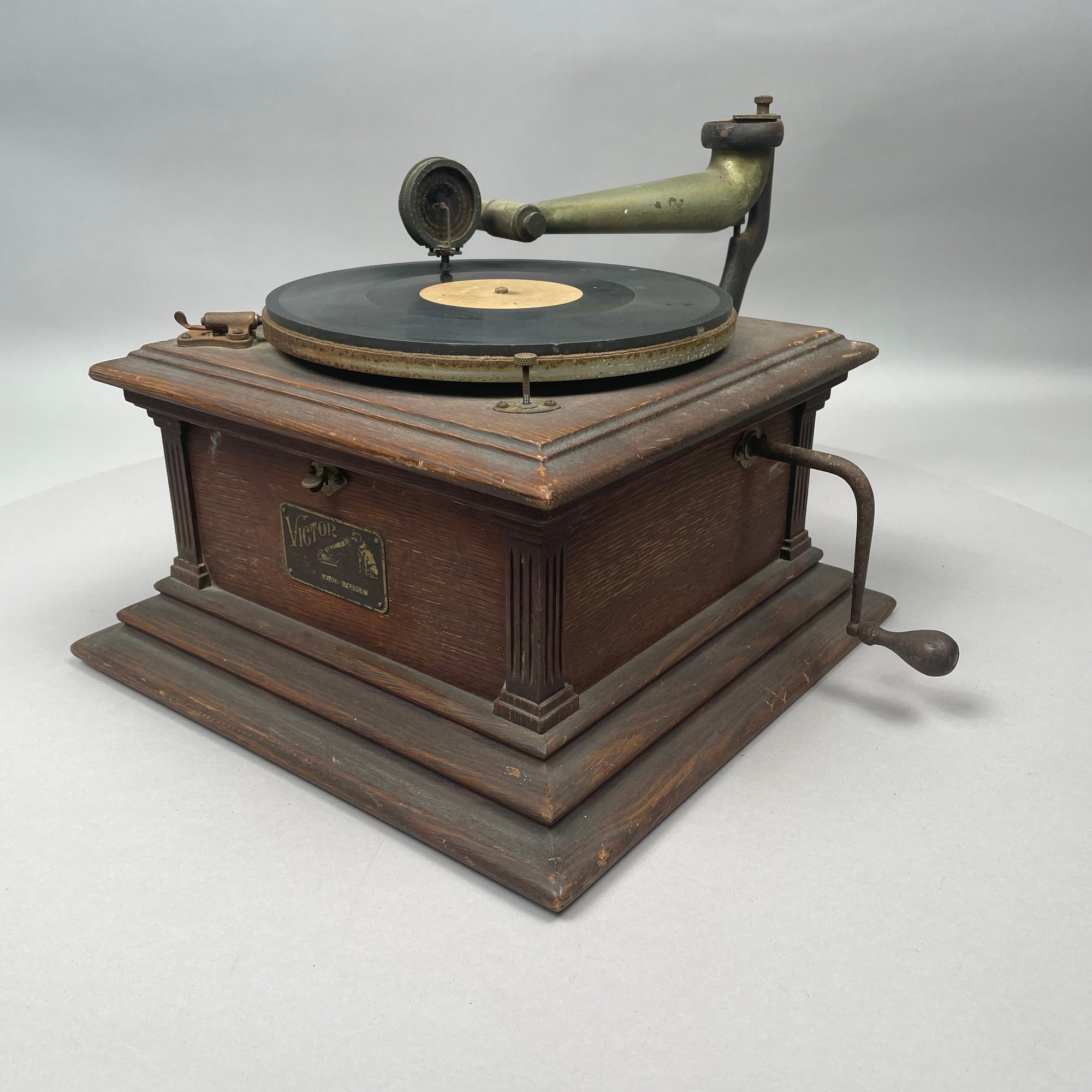 External Horn Victor, Victor Talking Machine Company, Camden, New Jersey, 1906-1909. Model "TYPE VIC III, #43313." The oak case with affixed with a brass label including the model and serial numbers, the black-painted steel and brass "flower" horn with a "VICTOR TALKING MACHINE" Nipper label.