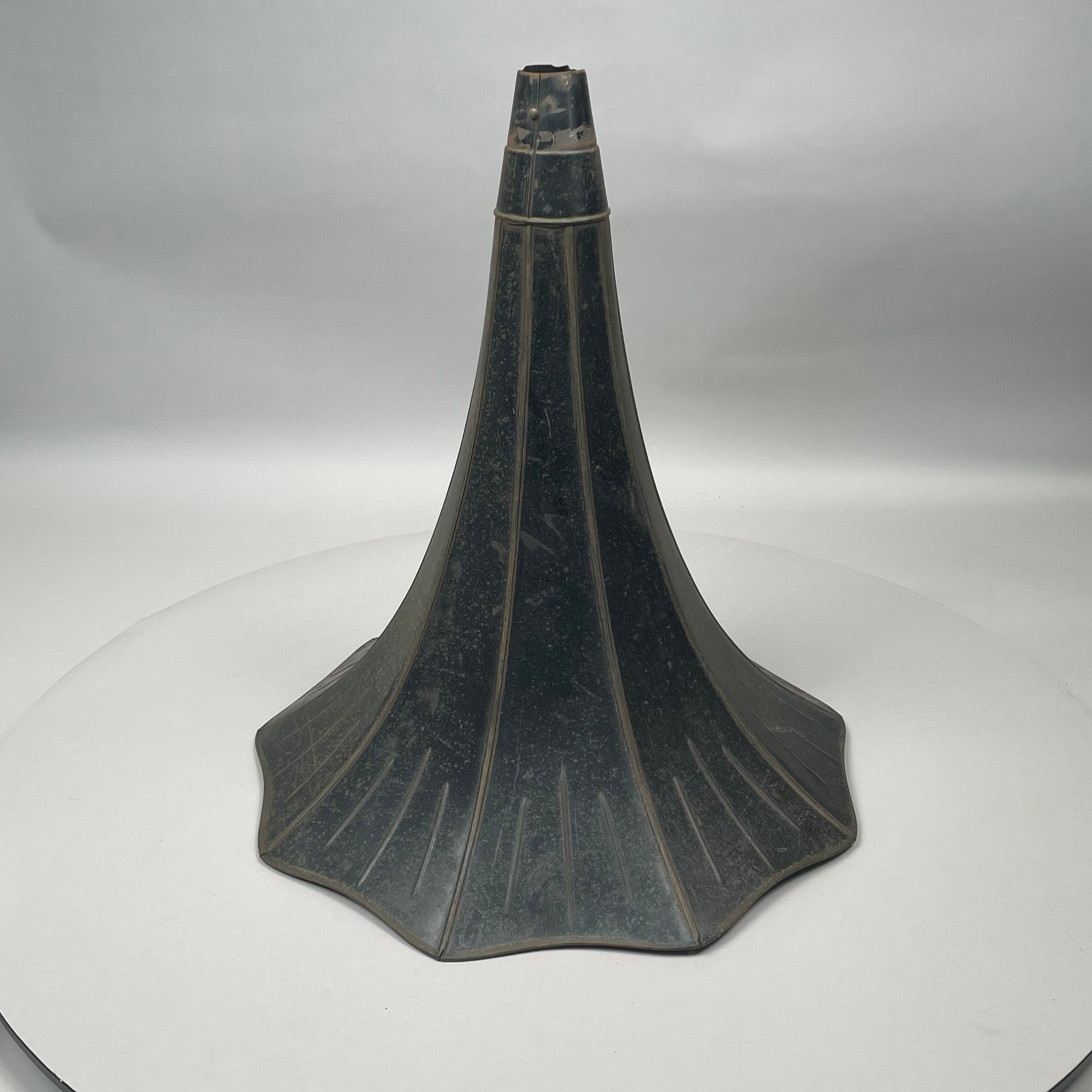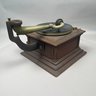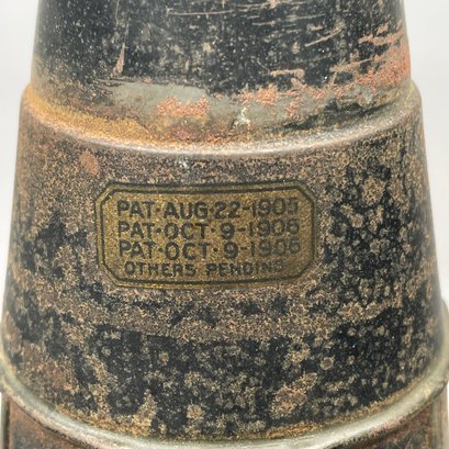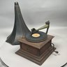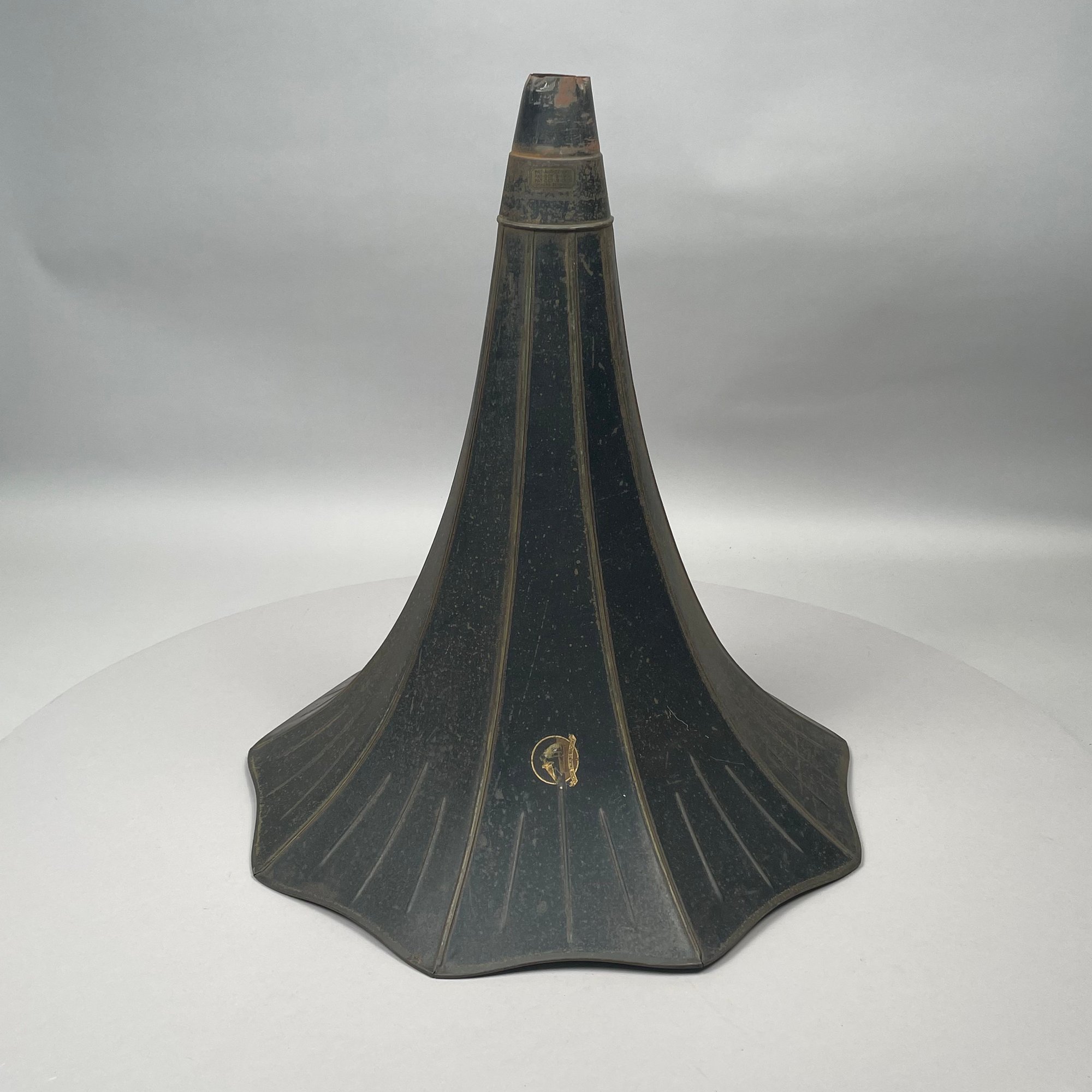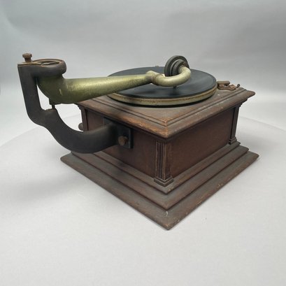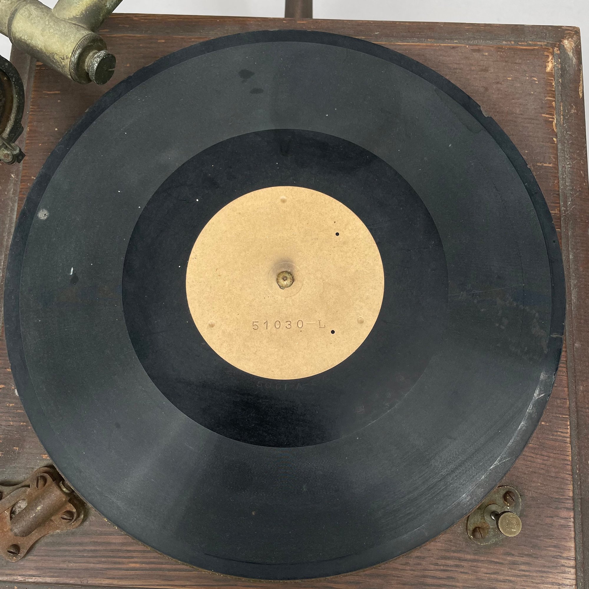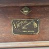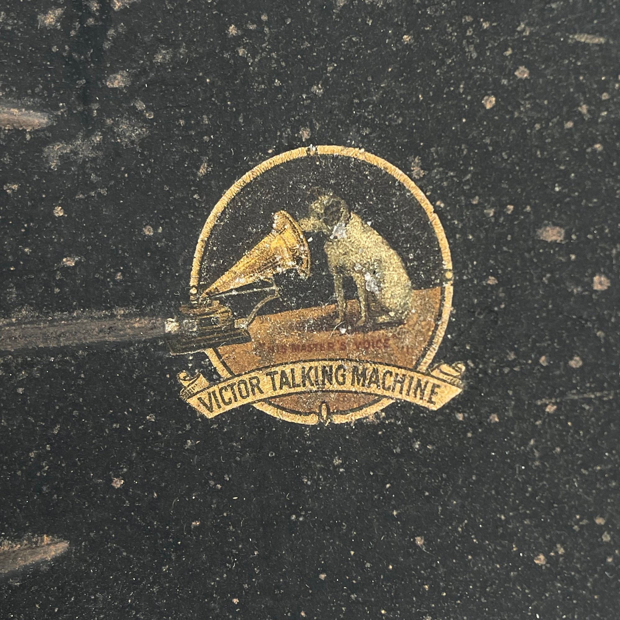 External Horn Victor, Victor Talking Machine Company, Camden, New Jersey, 1906-1909. Model "TYPE VIC III, #43313." The oak case with affixed with a brass label including the model and serial numbers, the black-painted steel and brass "flower" horn with a "VICTOR TALKING MACHINE" Nipper label.