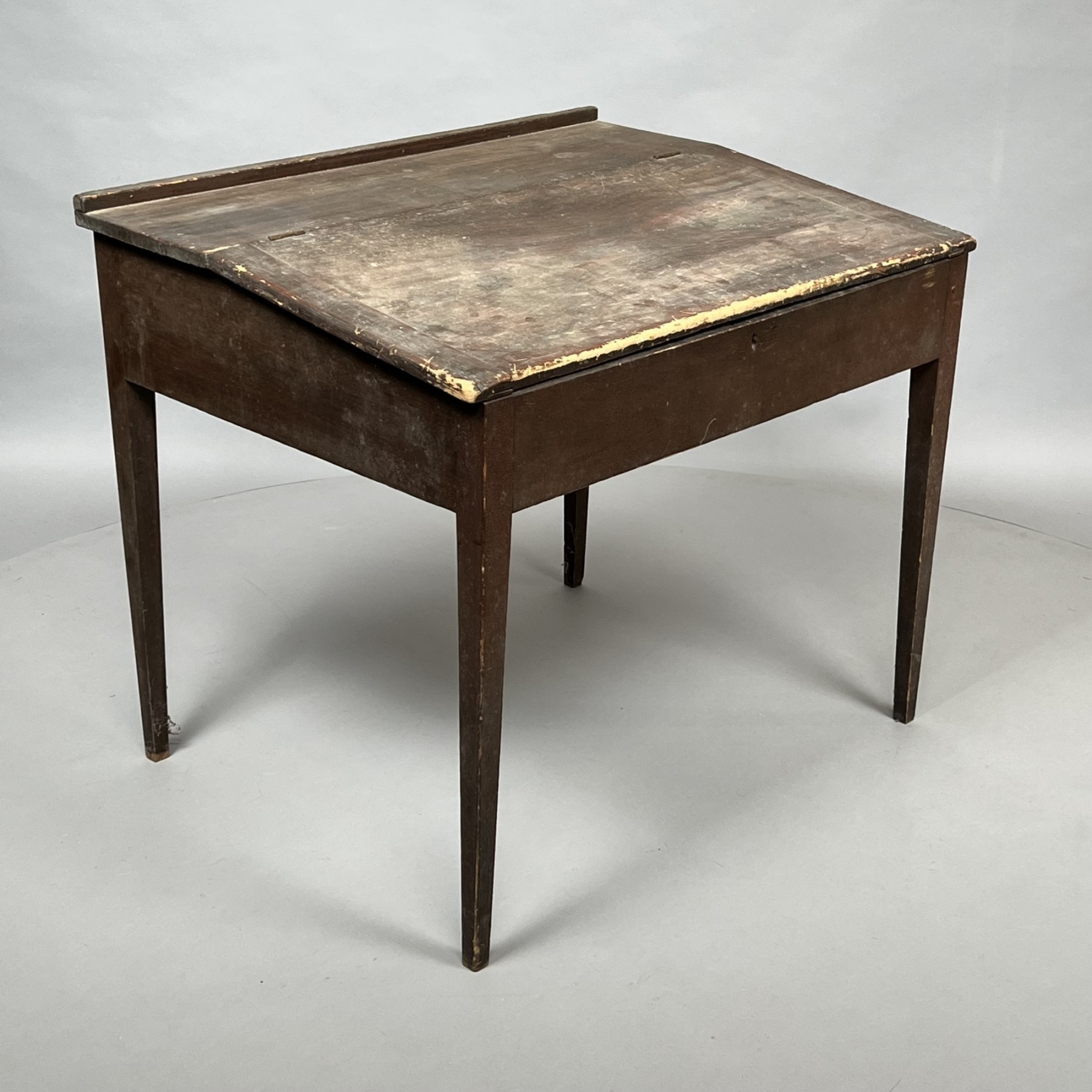 The canted rectangular hinged top opening to a compartment with pigeon holes, raised on square tapered legs.