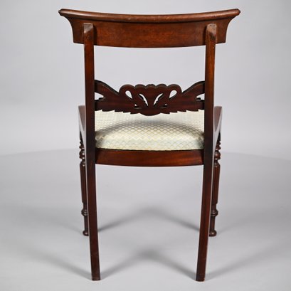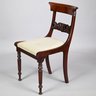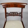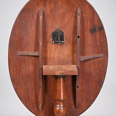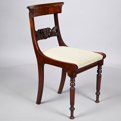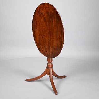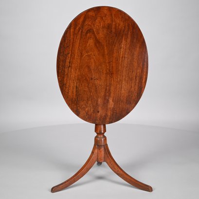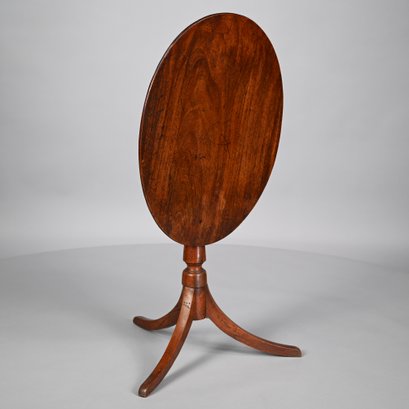 Federal Mahogany Oval Tilt-Top Candlestand and an Empire Carved Mahogany Side Chair. The oval top tilting above the standard turned in tapered, vase-form and cylindrical sections, raised on sabre legs; the chair with tablet crest ending in concentric spiral ears, above the backsplat of a pair of swans centering foliage, the seat raised on frontal spool-turned and reeded legs ending in cuff feet.