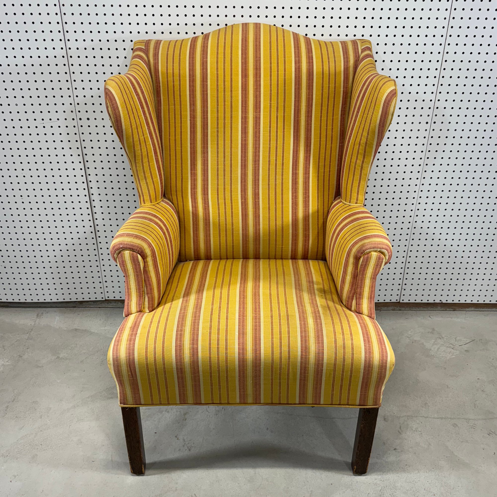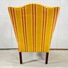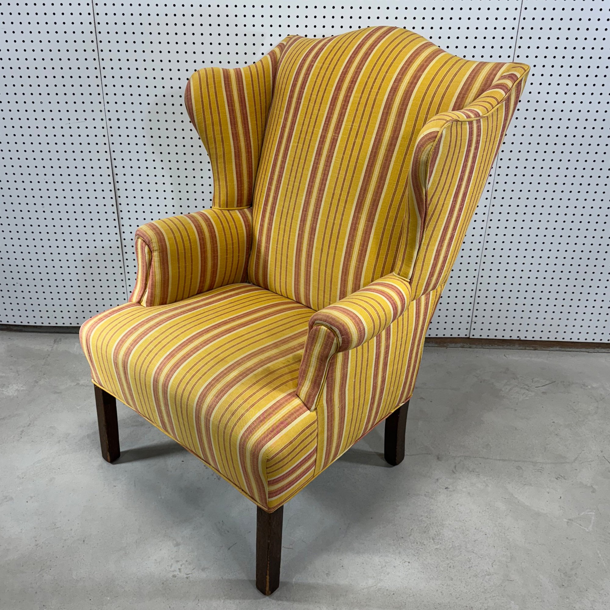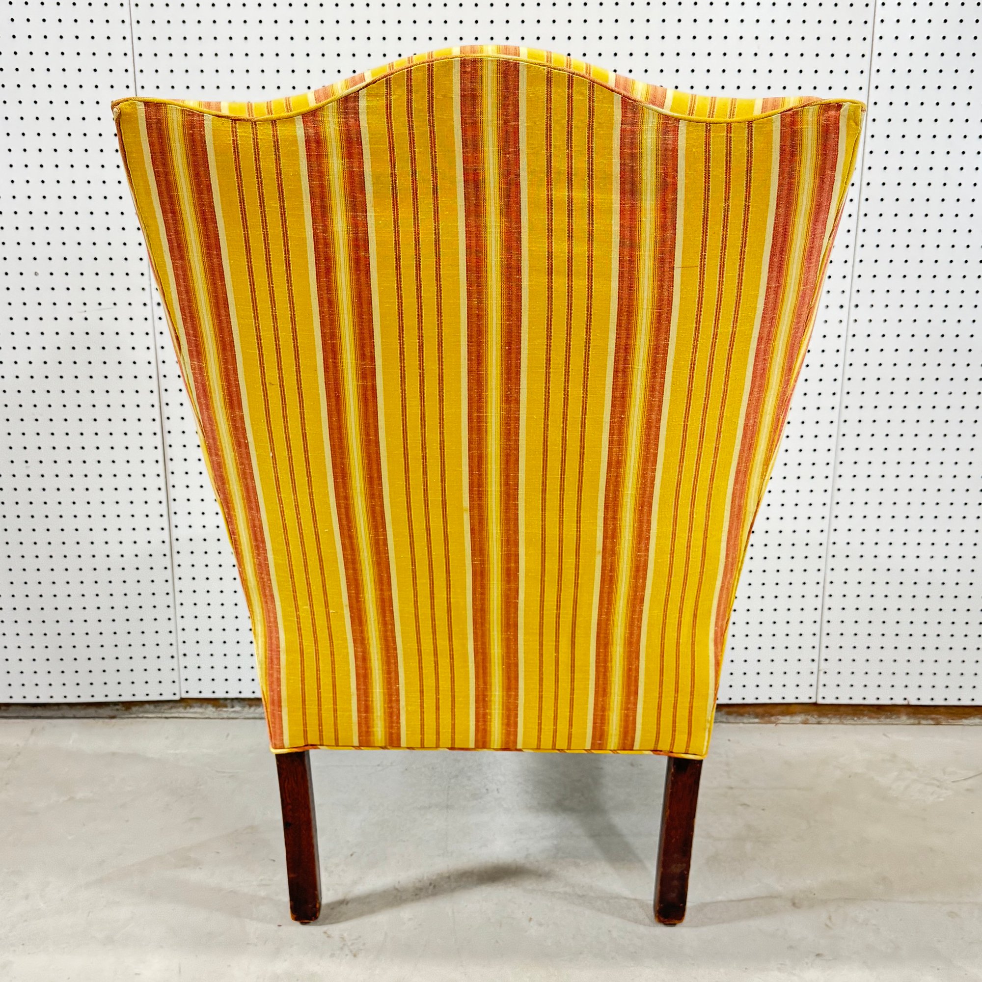 Federal Style Upholstered Wing-Back Chair on Mahogany Straight Legs, Upholstered in Striped Fabric.
