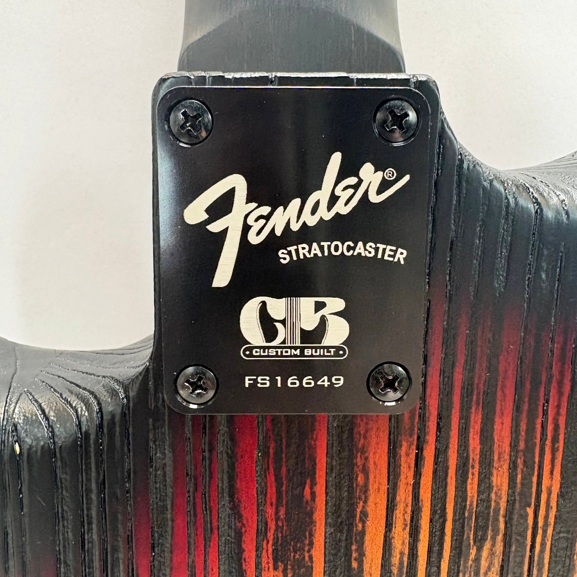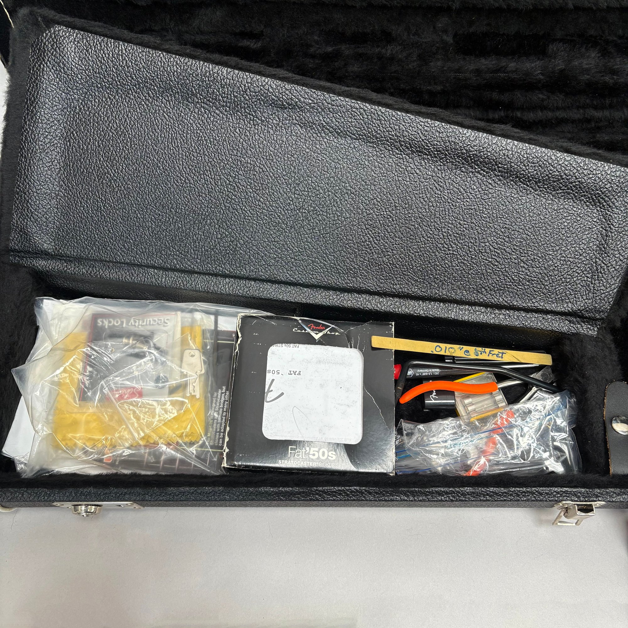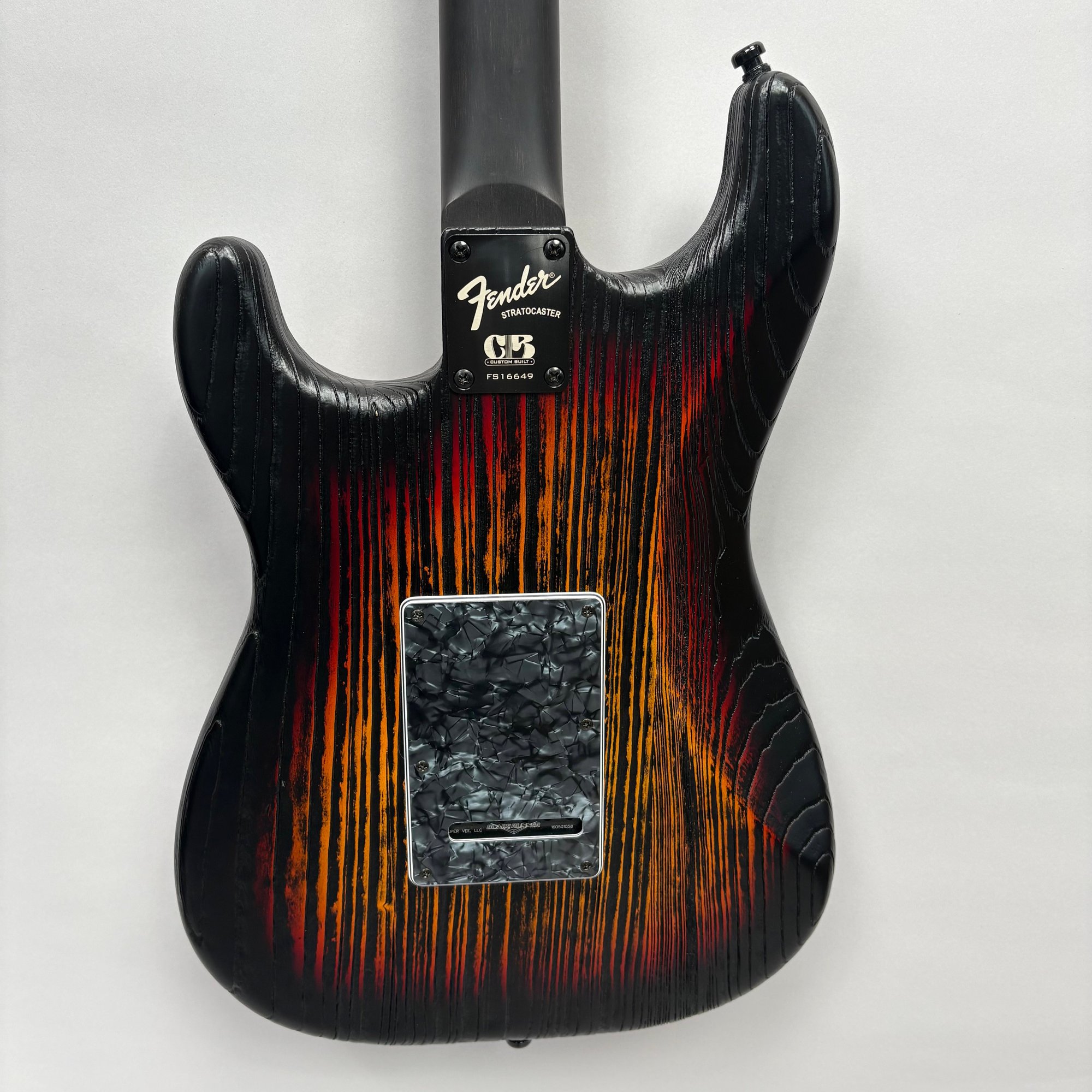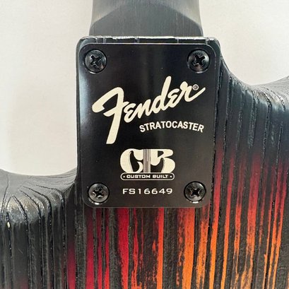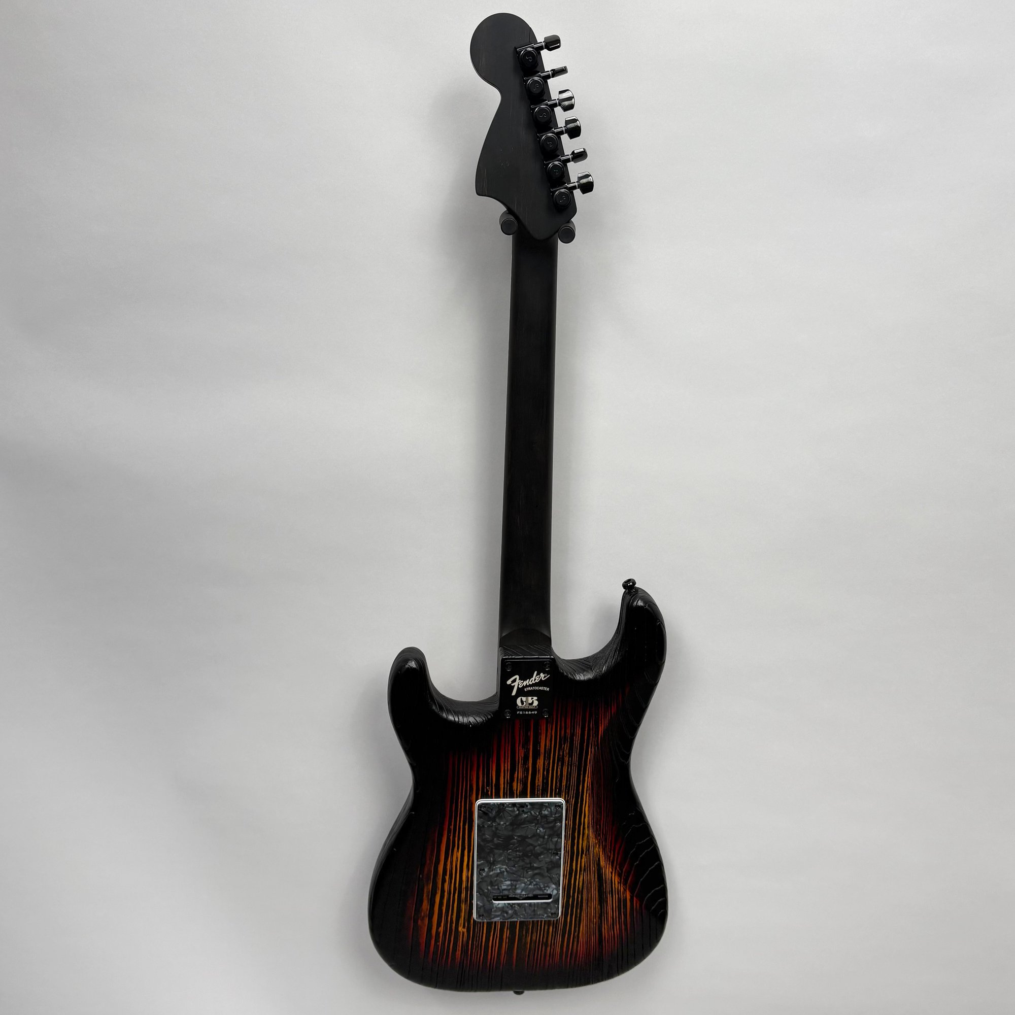 Fender Musical Instruments Corp. Custom Built Sandblasted Black Swamp Ash Stratocaster, Serial Number US15054520, Model Number FS16649, 2015, and Case. Right-handed, rosewood fretboard inlaid with pearloid frets and bindings, the grey and black "graphical" pickguard and matching tremolo cover plate in high gloss plastic, marked on the chrome neck plate "Fender/ STRATOCASTER/ CB/ CUSTOM BUILT/ FS16649;" also including an owner's manual, Fender RoHS inspection tag, warranty card, Sweetwater guitar evaluation signed by Matt Nelson and Brian Rutan (?), tools, information sheets and cards for controls and volume, adjustment of the truss rod, "Mag-Lok Tremolo Anti-Deflection Device" card, empty "FRETWRAPS" envelope, brass stick marked ".010 @ 8th Fret," "FAT '50s" Strat boxed set of three pickups, empty envelope for a replacement neck for a Fender or Squire by Fender guitar or bass, Fender polishing cloth, Fender bookmark and bumper sticker, a packing slip from Warmoth Guitar Products, Inc. for changes to the custom order, a Rothko & Frost Ltd. Custom Shop 70s curve style guitar headstock waterslide decal transfer-sheet, printed in gold on a pale blue field "Fender STRATOCASTER/ BLACK SANDBLASTED/ ORIGINAL/ Contour/ Body" with sales receipt, and a black hardshell case lined in black velvet and with two keys, G. & G. (Ben Germain and Efren Guzman) Quality Cases made for Fender Limited Editions, affixed with a black and silver "Fender" nameplate under the handle, and an oval silver logo badge on the interior printed "G & G/ The Original Vintage/ Case Co./ MADE IN U.S.A.," and a boxed Schaller security lock. Together with a Gruv Gear "Ernie Ball" Solostrap black Neoprene guitar strap, the chrome fasteners each marked "GRUVGEAR/ MAKE LIFE GRUV," and a bookmark.
