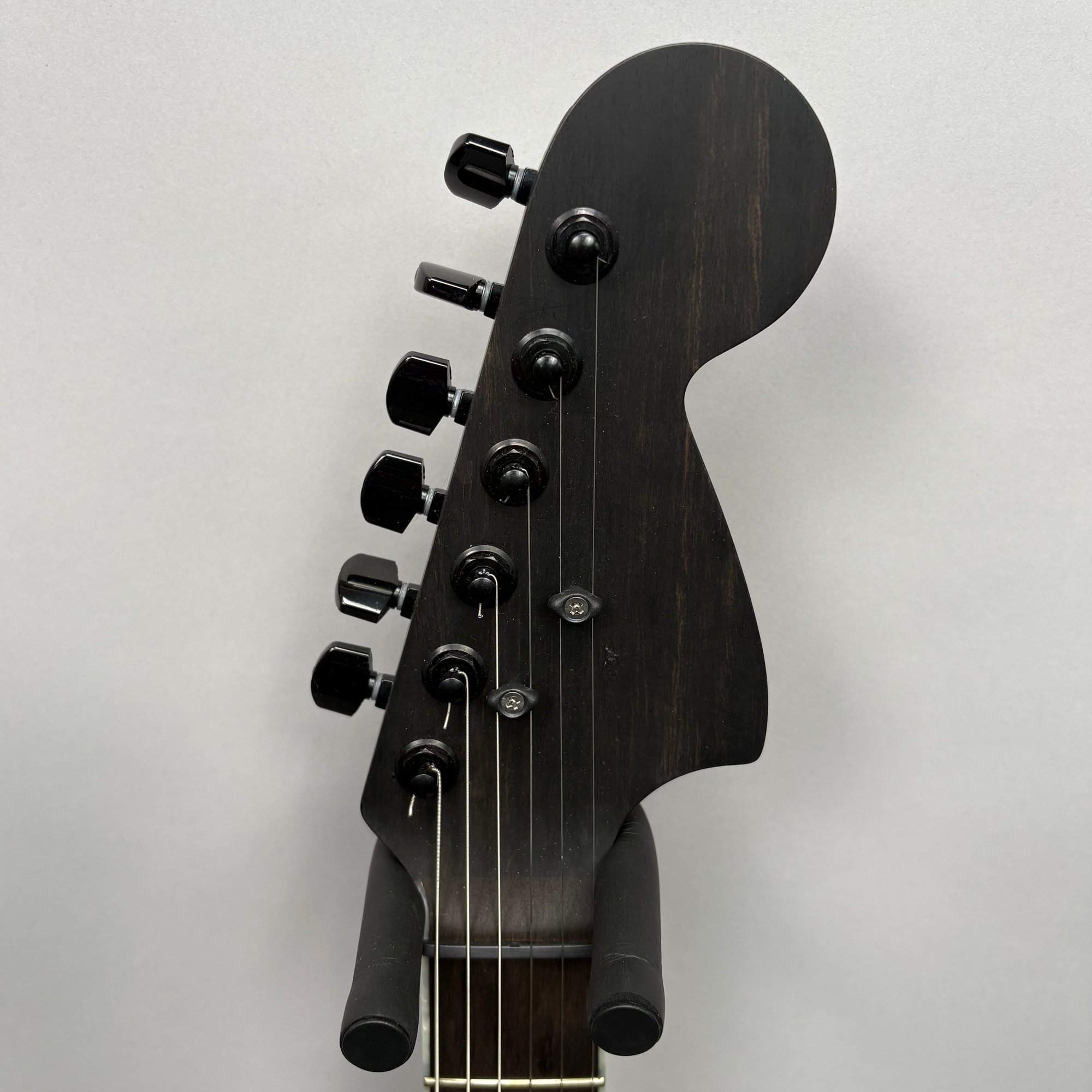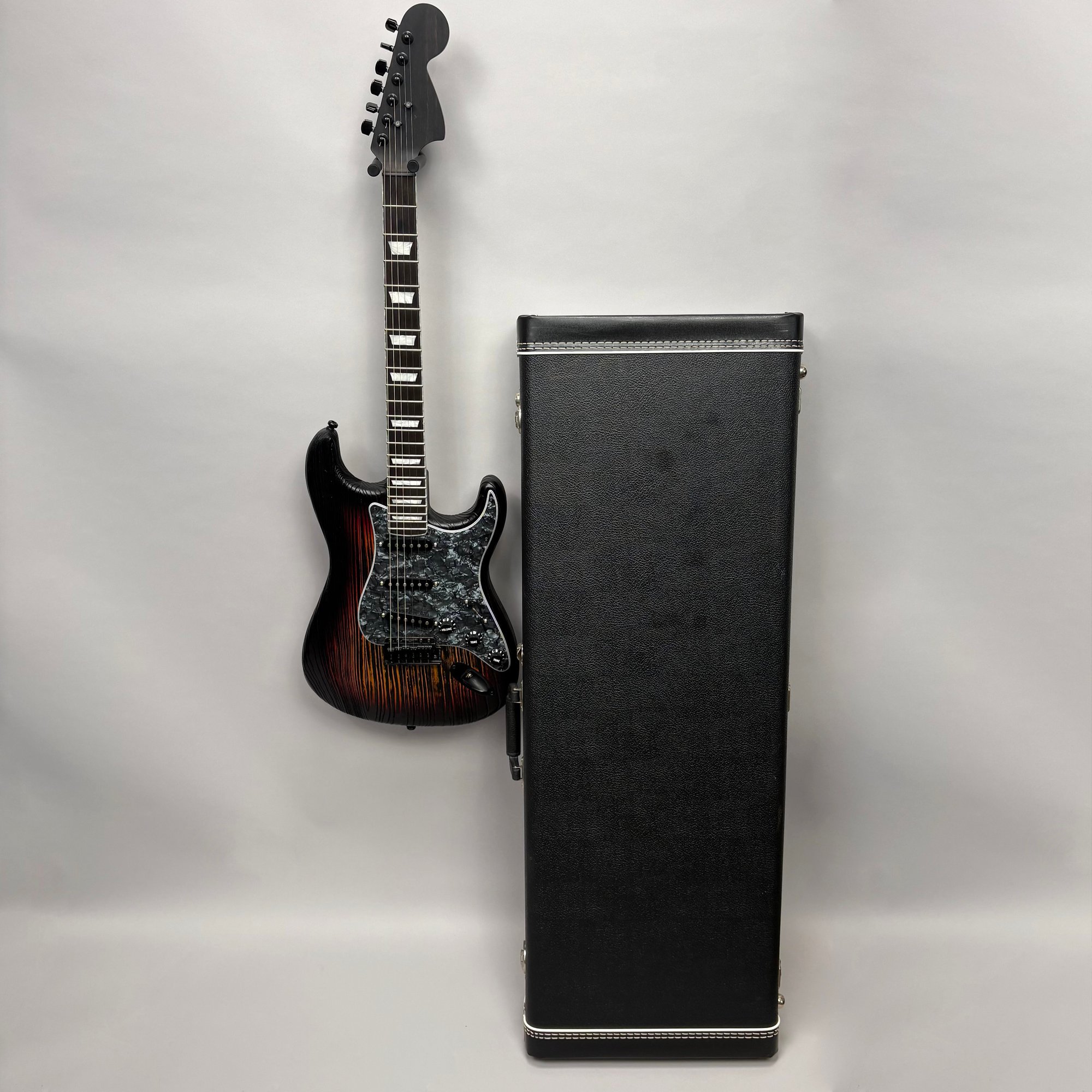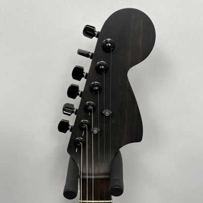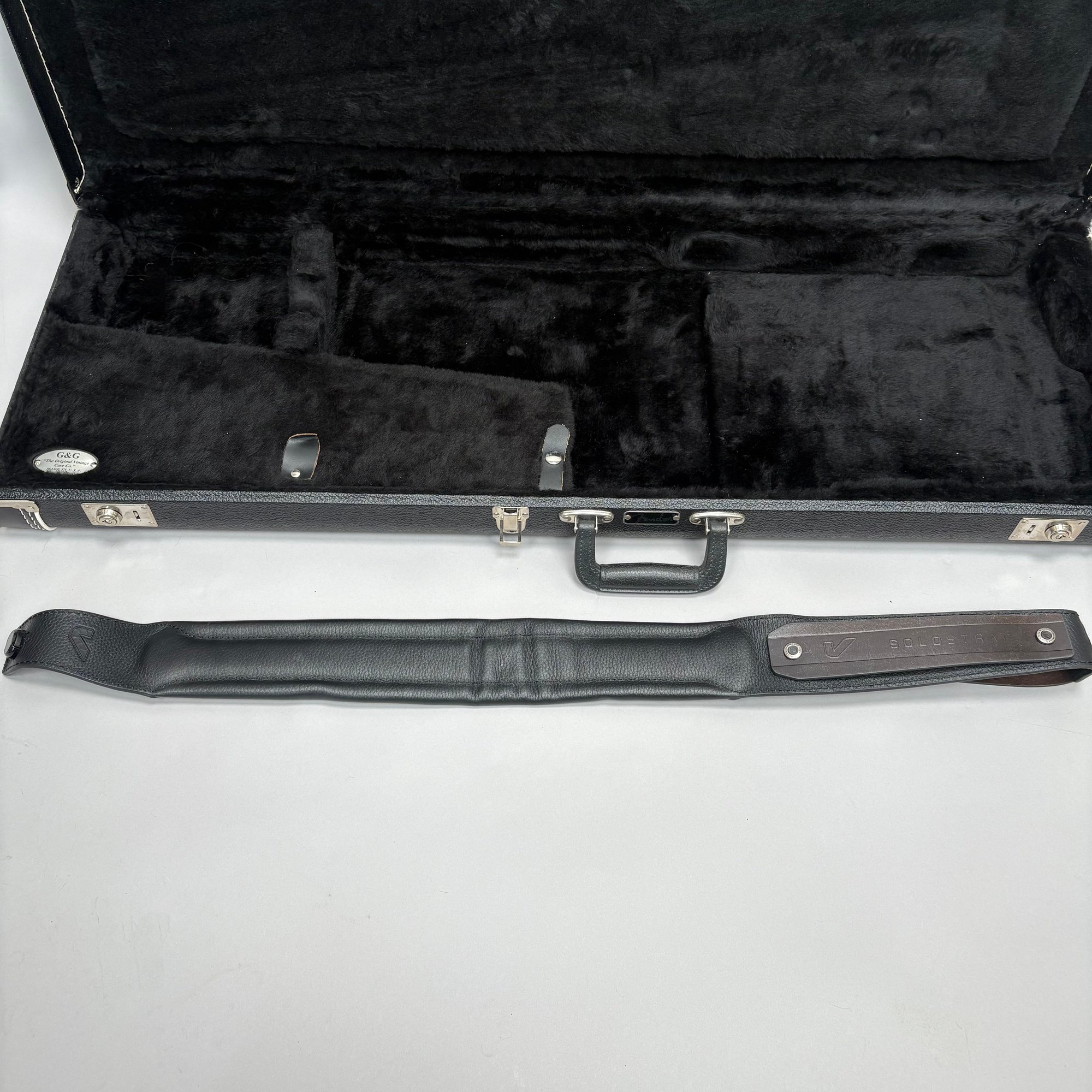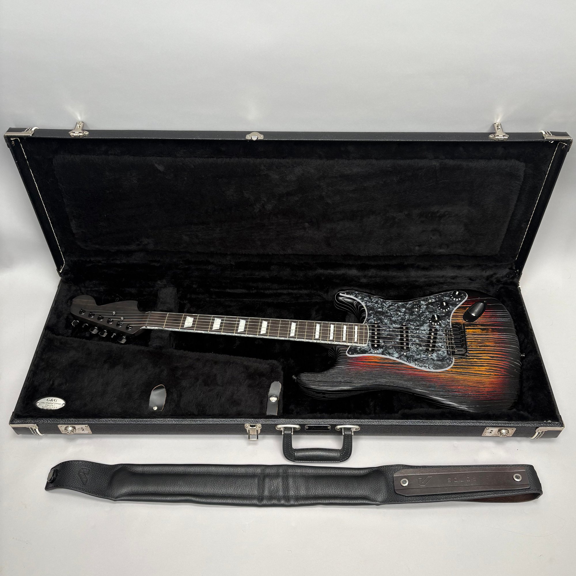 Fender Musical Instruments Corp. Custom Built Sandblasted Black Swamp Ash Stratocaster, Serial Number US15054520, Model Number FS16649, 2015, and Case. Right-handed, rosewood fretboard inlaid with pearloid frets and bindings, the grey and black "graphical" pickguard and matching tremolo cover plate in high gloss plastic, marked on the chrome neck plate "Fender/ STRATOCASTER/ CB/ CUSTOM BUILT/ FS16649;" also including an owner's manual, Fender RoHS inspection tag, warranty card, Sweetwater guitar evaluation signed by Matt Nelson and Brian Rutan (?), tools, information sheets and cards for controls and volume, adjustment of the truss rod, "Mag-Lok Tremolo Anti-Deflection Device" card, empty "FRETWRAPS" envelope, brass stick marked ".010 @ 8th Fret," "FAT '50s" Strat boxed set of three pickups, empty envelope for a replacement neck for a Fender or Squire by Fender guitar or bass, Fender polishing cloth, Fender bookmark and bumper sticker, a packing slip from Warmoth Guitar Products, Inc. for changes to the custom order, a Rothko & Frost Ltd. Custom Shop 70s curve style guitar headstock waterslide decal transfer-sheet, printed in gold on a pale blue field "Fender STRATOCASTER/ BLACK SANDBLASTED/ ORIGINAL/ Contour/ Body" with sales receipt, and a black hardshell case lined in black velvet and with two keys, G. & G. (Ben Germain and Efren Guzman) Quality Cases made for Fender Limited Editions, affixed with a black and silver "Fender" nameplate under the handle, and an oval silver logo badge on the interior printed "G & G/ The Original Vintage/ Case Co./ MADE IN U.S.A.," and a boxed Schaller security lock. Together with a Gruv Gear "Ernie Ball" Solostrap black Neoprene guitar strap, the chrome fasteners each marked "GRUVGEAR/ MAKE LIFE GRUV," and a bookmark.