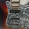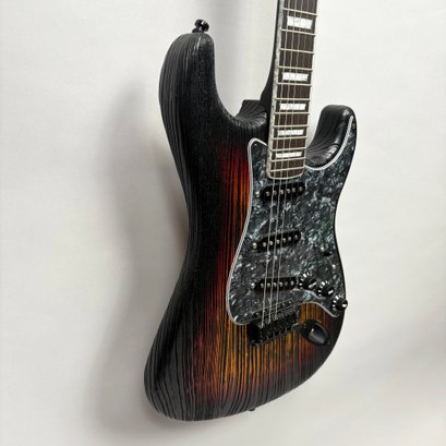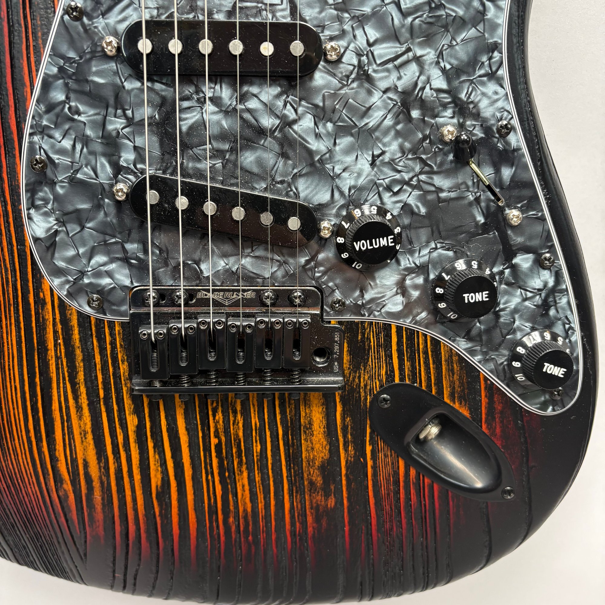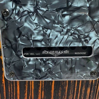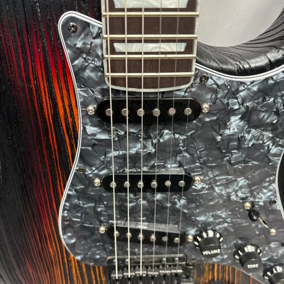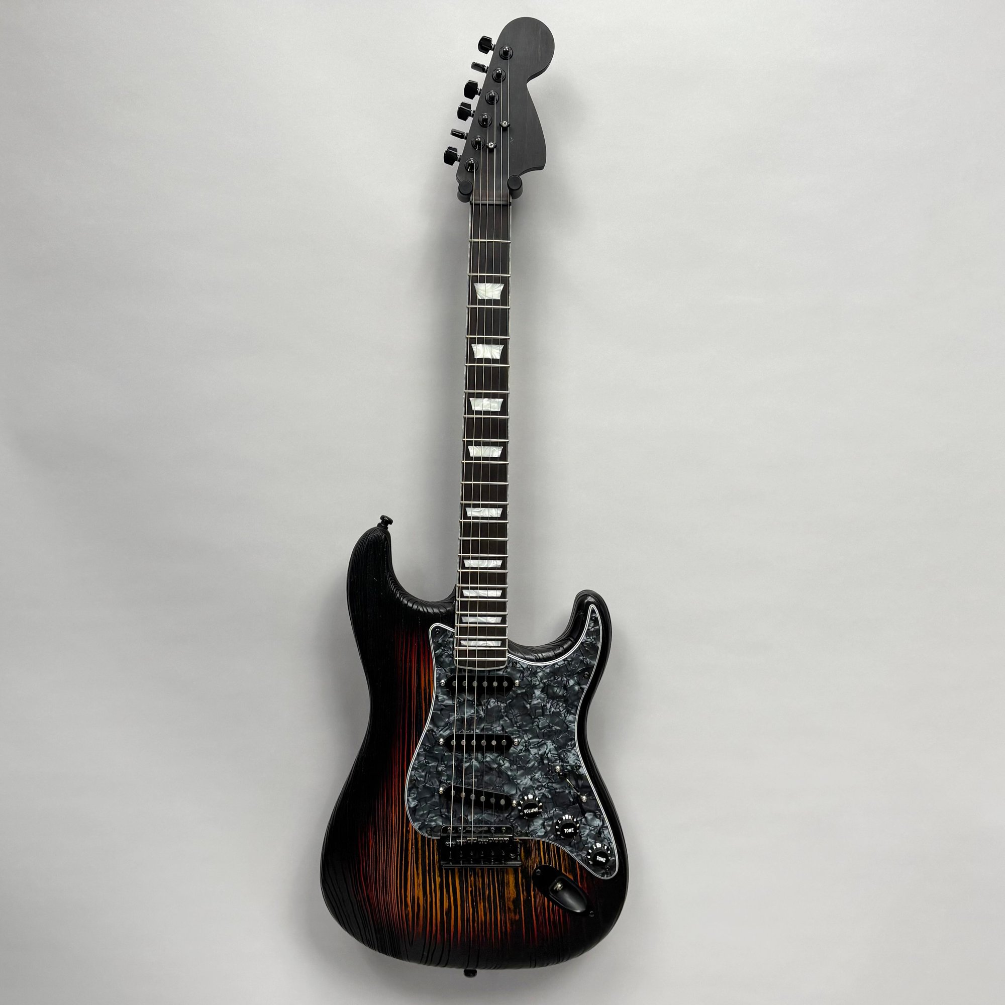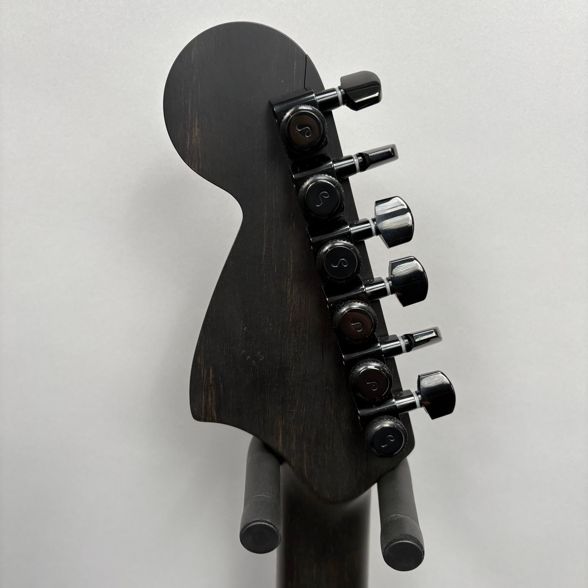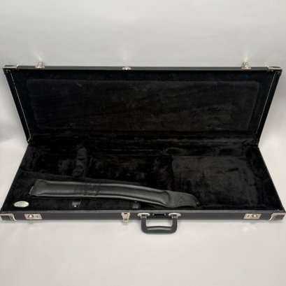 Fender Musical Instruments Corp. Custom Built Sandblasted Black Swamp Ash Stratocaster, Serial Number US15054520, Model Number FS16649, 2015, and Case. Right-handed, rosewood fretboard inlaid with pearloid frets and bindings, the grey and black "graphical" pickguard and matching tremolo cover plate in high gloss plastic, marked on the chrome neck plate "Fender/ STRATOCASTER/ CB/ CUSTOM BUILT/ FS16649;" also including an owner's manual, Fender RoHS inspection tag, warranty card, Sweetwater guitar evaluation signed by Matt Nelson and Brian Rutan (?), tools, information sheets and cards for controls and volume, adjustment of the truss rod, "Mag-Lok Tremolo Anti-Deflection Device" card, empty "FRETWRAPS" envelope, brass stick marked ".010 @ 8th Fret," "FAT '50s" Strat boxed set of three pickups, empty envelope for a replacement neck for a Fender or Squire by Fender guitar or bass, Fender polishing cloth, Fender bookmark and bumper sticker, a packing slip from Warmoth Guitar Products, Inc. for changes to the custom order, a Rothko & Frost Ltd. Custom Shop 70s curve style guitar headstock waterslide decal transfer-sheet, printed in gold on a pale blue field "Fender STRATOCASTER/ BLACK SANDBLASTED/ ORIGINAL/ Contour/ Body" with sales receipt, and a black hardshell case lined in black velvet and with two keys, G. & G. (Ben Germain and Efren Guzman) Quality Cases made for Fender Limited Editions, affixed with a black and silver "Fender" nameplate under the handle, and an oval silver logo badge on the interior printed "G & G/ The Original Vintage/ Case Co./ MADE IN U.S.A.," and a boxed Schaller security lock. Together with a Gruv Gear "Ernie Ball" Solostrap black Neoprene guitar strap, the chrome fasteners each marked "GRUVGEAR/ MAKE LIFE GRUV," and a bookmark.