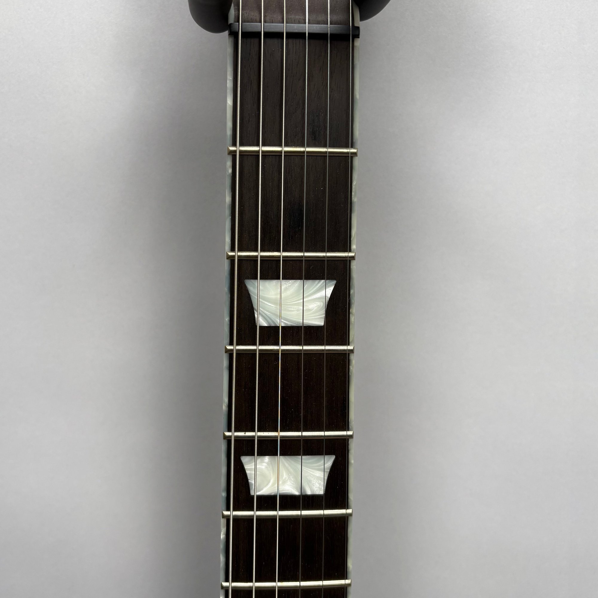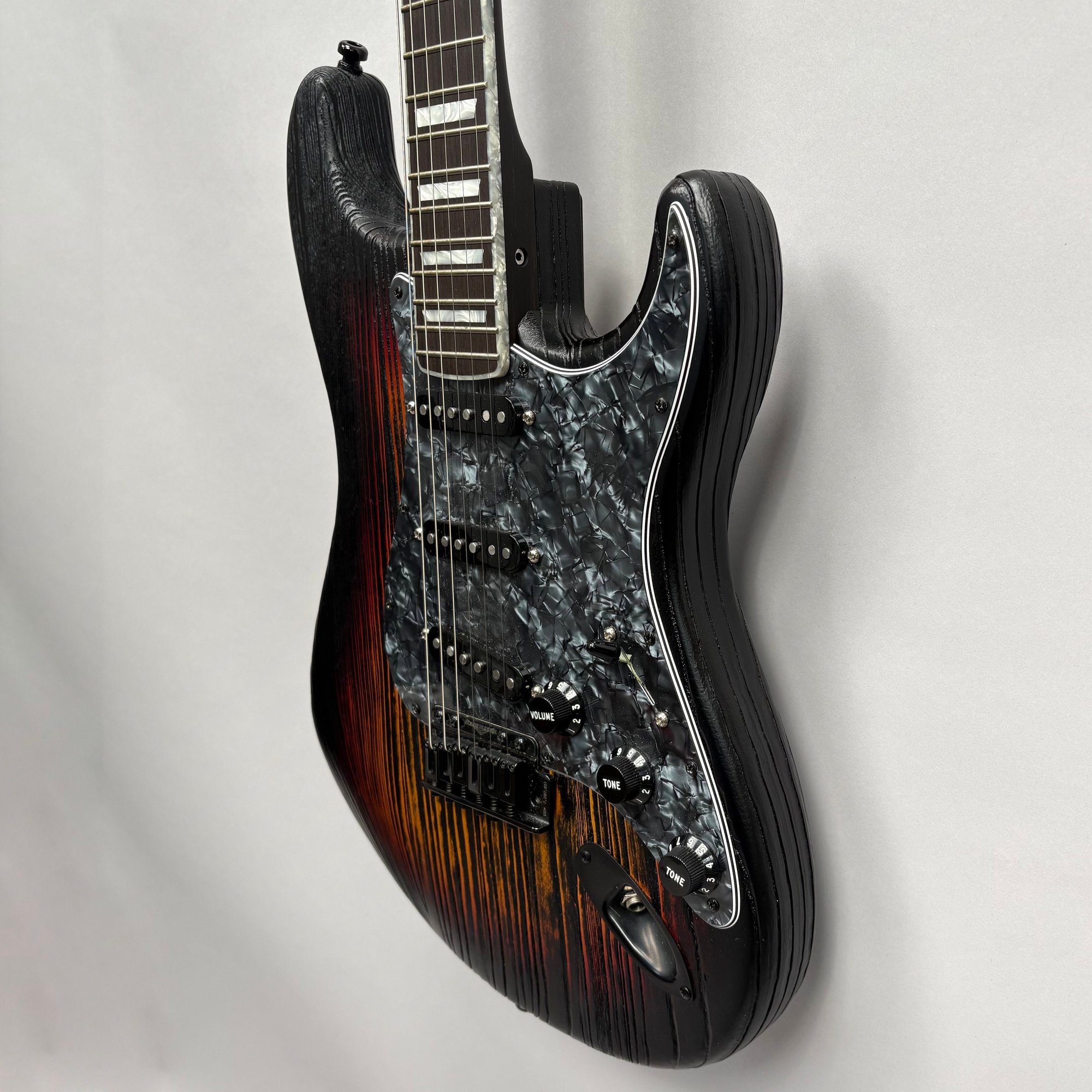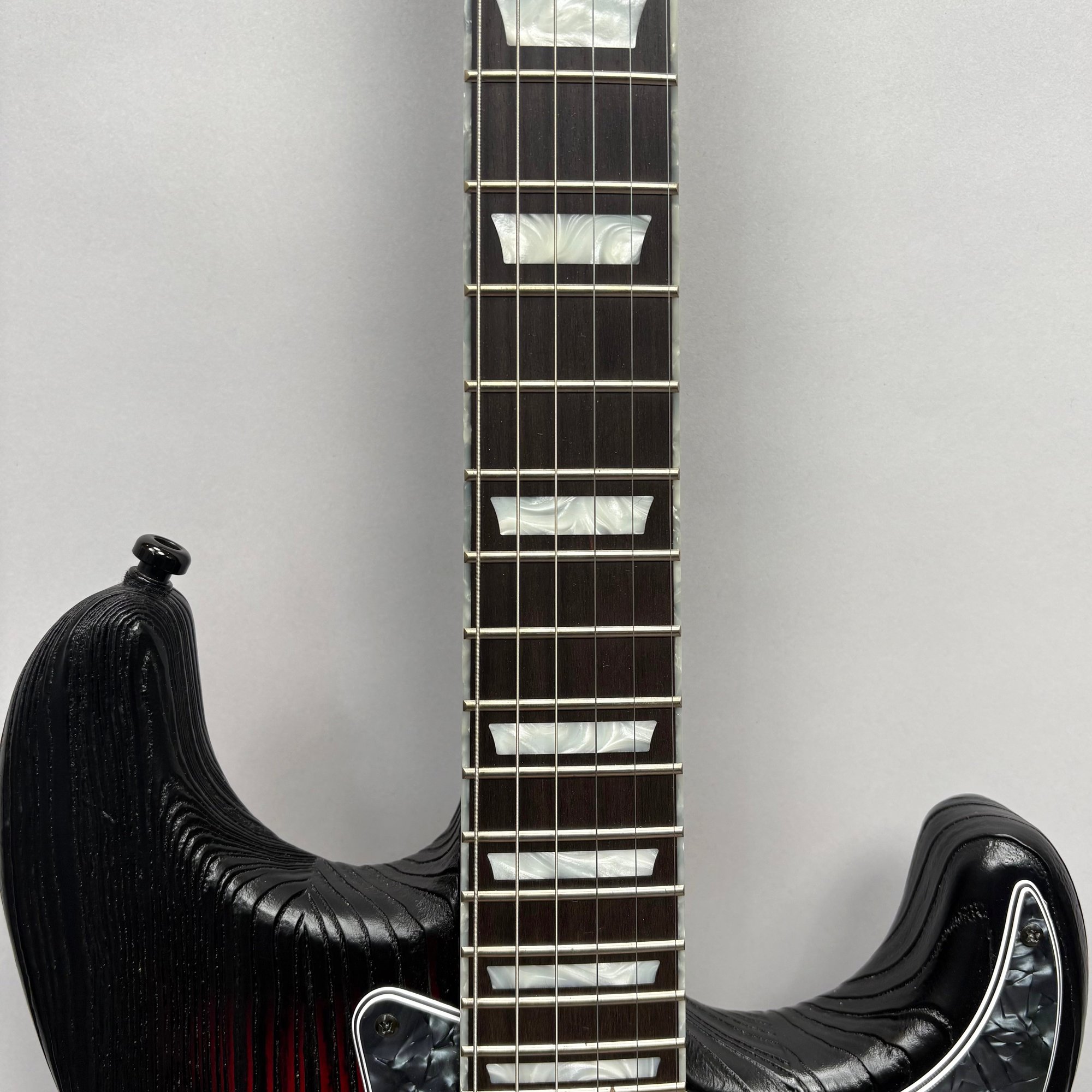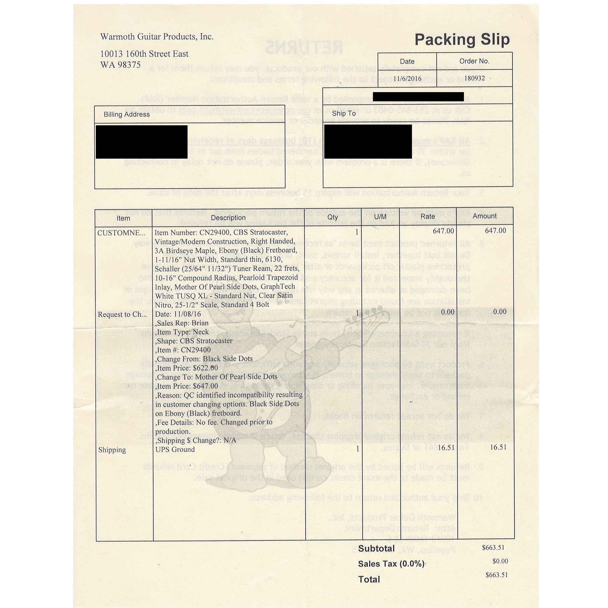 Fender Musical Instruments Corp. Custom Built Sandblasted Black Swamp Ash Stratocaster, Serial Number US15054520, Model Number FS16649, 2015, and Case. Right-handed, rosewood fretboard inlaid with pearloid frets and bindings, the grey and black "graphical" pickguard and matching tremolo cover plate in high gloss plastic, marked on the chrome neck plate "Fender/ STRATOCASTER/ CB/ CUSTOM BUILT/ FS16649;" also including an owner's manual, Fender RoHS inspection tag, warranty card, Sweetwater guitar evaluation signed by Matt Nelson and Brian Rutan (?), tools, information sheets and cards for controls and volume, adjustment of the truss rod, "Mag-Lok Tremolo Anti-Deflection Device" card, empty "FRETWRAPS" envelope, brass stick marked ".010 @ 8th Fret," "FAT '50s" Strat boxed set of three pickups, empty envelope for a replacement neck for a Fender or Squire by Fender guitar or bass, Fender polishing cloth, Fender bookmark and bumper sticker, a packing slip from Warmoth Guitar Products, Inc. for changes to the custom order, a Rothko & Frost Ltd. Custom Shop 70s curve style guitar headstock waterslide decal transfer-sheet, printed in gold on a pale blue field "Fender STRATOCASTER/ BLACK SANDBLASTED/ ORIGINAL/ Contour/ Body" with sales receipt, and a black hardshell case lined in black velvet and with two keys, G. & G. (Ben Germain and Efren Guzman) Quality Cases made for Fender Limited Editions, affixed with a black and silver "Fender" nameplate under the handle, and an oval silver logo badge on the interior printed "G & G/ The Original Vintage/ Case Co./ MADE IN U.S.A.," and a boxed Schaller security lock. Together with a Gruv Gear "Ernie Ball" Solostrap black Neoprene guitar strap, the chrome fasteners each marked "GRUVGEAR/ MAKE LIFE GRUV," and a bookmark.
