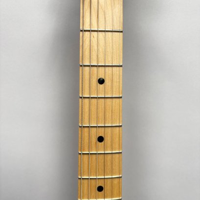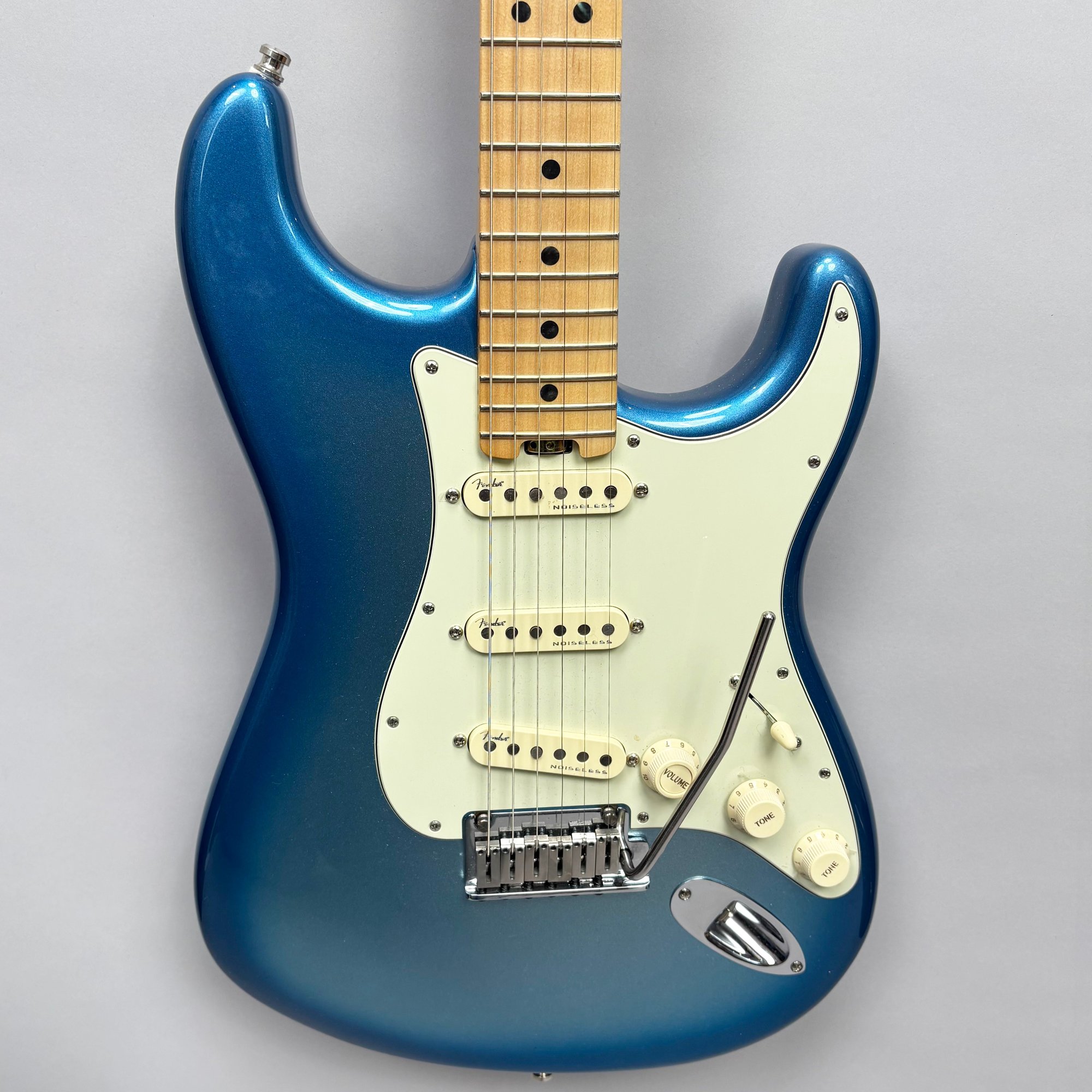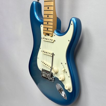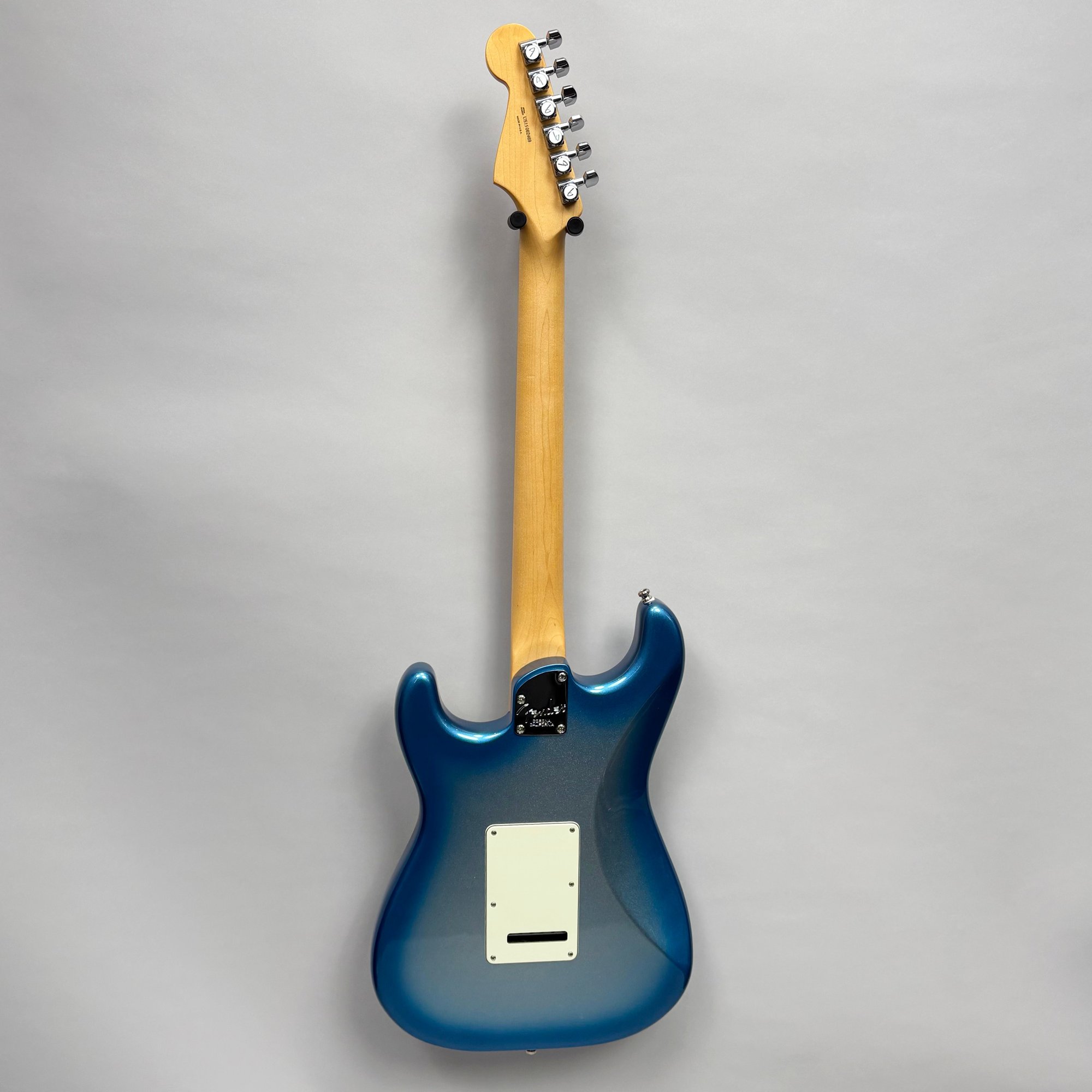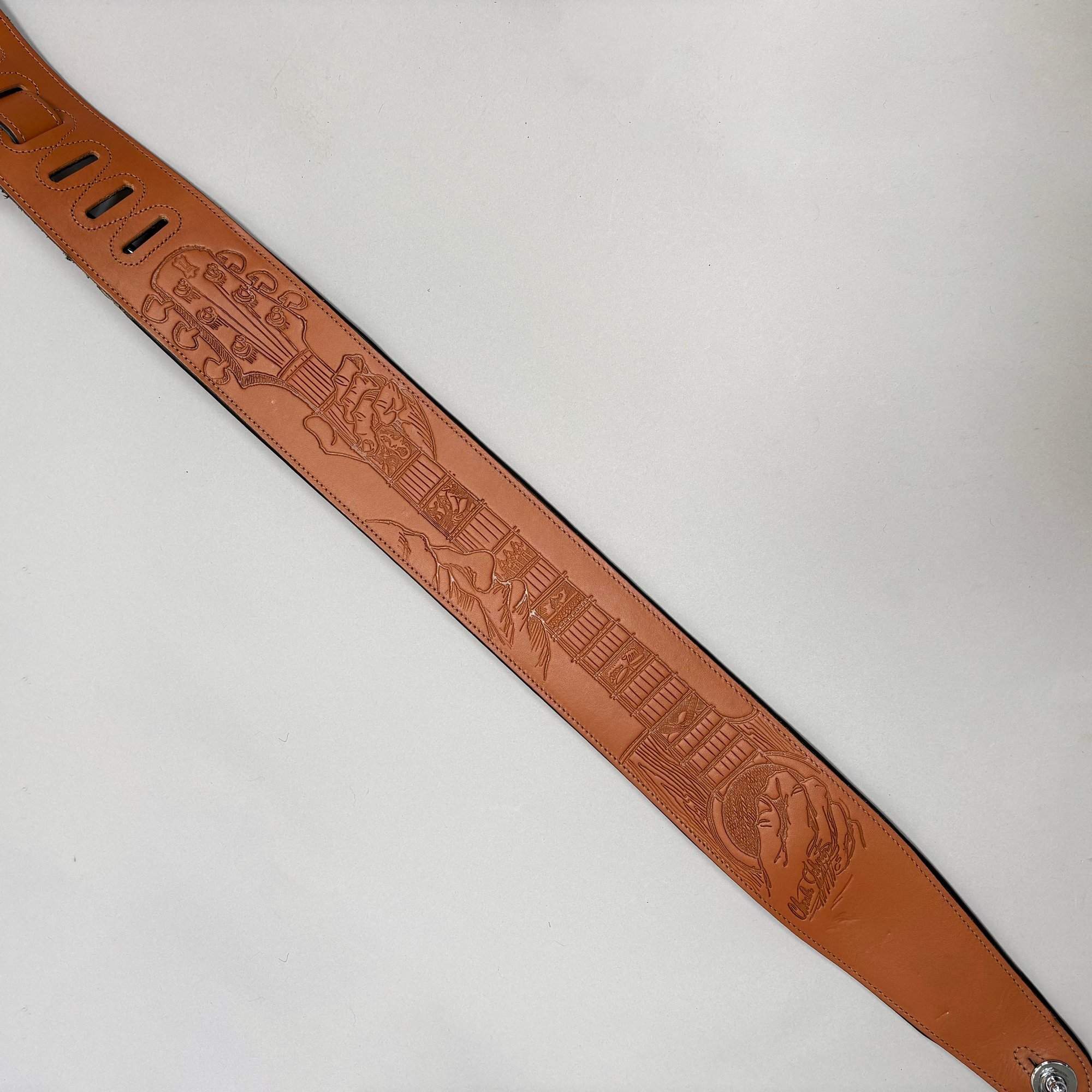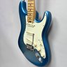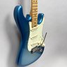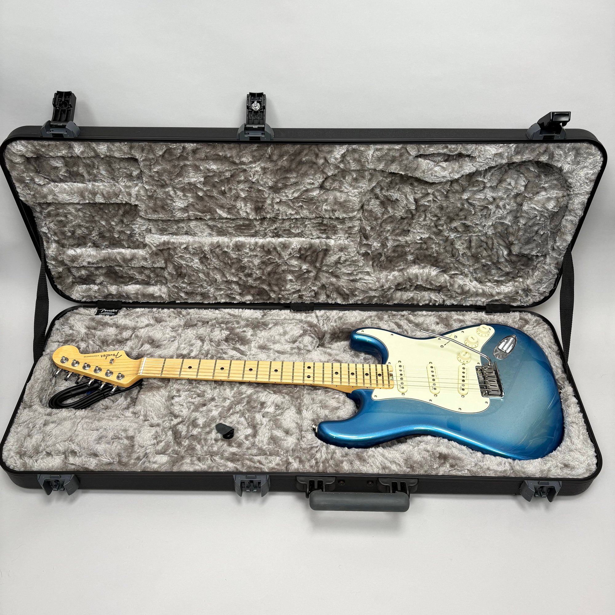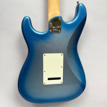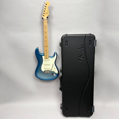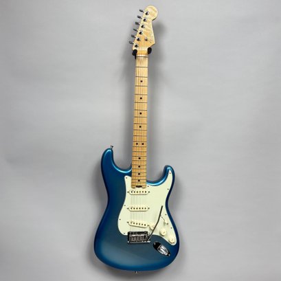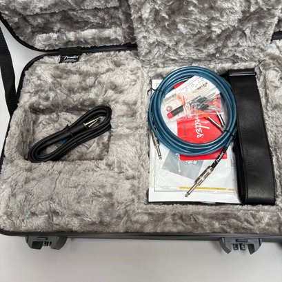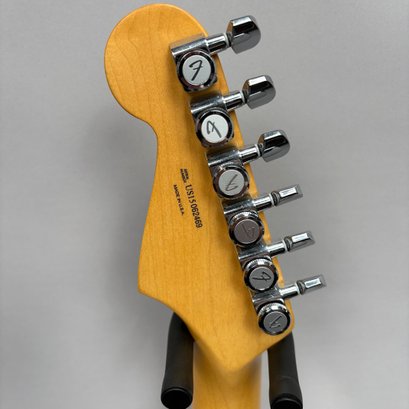 Fender Musical Instruments Corp. Elite Skyburst Metallic Stratocaster MN SBM, Serial Number US15062469, Model Number 0114002-736, Corona, California, 2015, and Case. Right-handed, classic Strat alder body with maple neck, each of the 4th generation noiseless bridge pickups marked "Fender/ NOISELESS," the pickguard four-ply aged white pearloid, marked on the front of the headstock "Fender STRATOCASTER," and on the back "SERIAL NUMBER US15062469/ MADE IN U.S.A." and "Fender/ CORONA/ CALIFORNIA" on the chrome neck plate, also including an owner's manual, Fender RoHS inspection tag, warranty card, pass certificate dated October 12, 2015, "Control Description" and "Parts Layout" information sheets, two Fender instrument cables in black and blue, tools, a blue "Fender/ THIN" pick, Fender bumper sticker, a Fender black leather guitar strap, and the original Fender molded black hardshell case with locking center latch, molded "Fender," with grey polyester plush interior and two keys, case tag printed "Fender/ A PRODUCT OF/ FENDER MUSICAL/ INSTRUMENTS CORP/ CORONA, CA U.S.A./ MADE IN CHINA." Together with a Levy's, Canada, veg-tan leather guitar strap embossed with a partial face in profile with one hand around the neck and the other hand over the sound hole, the frets depicting various views of musicians playing and singing, signed on the bottom hand "Charles Johnston/ C5," "L/ LEVY"S" brand on the front and white label on the reverse, the chrome hook marked "Fender" three times.