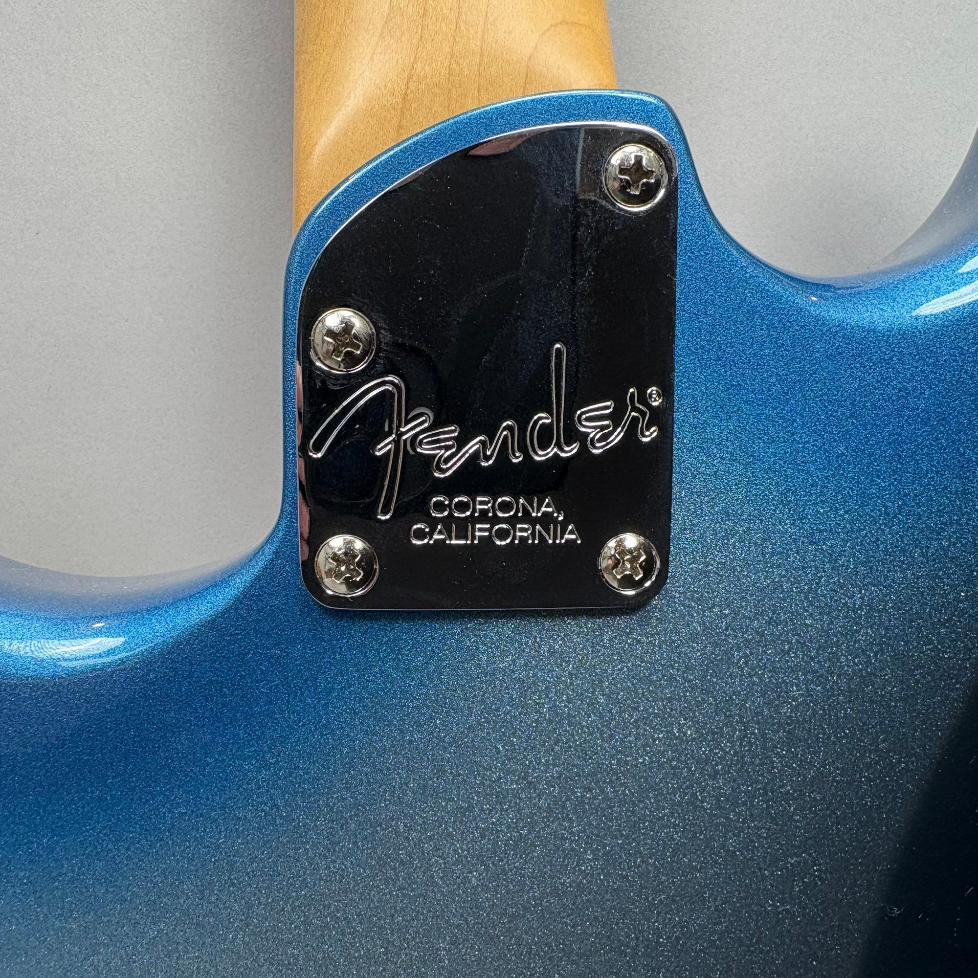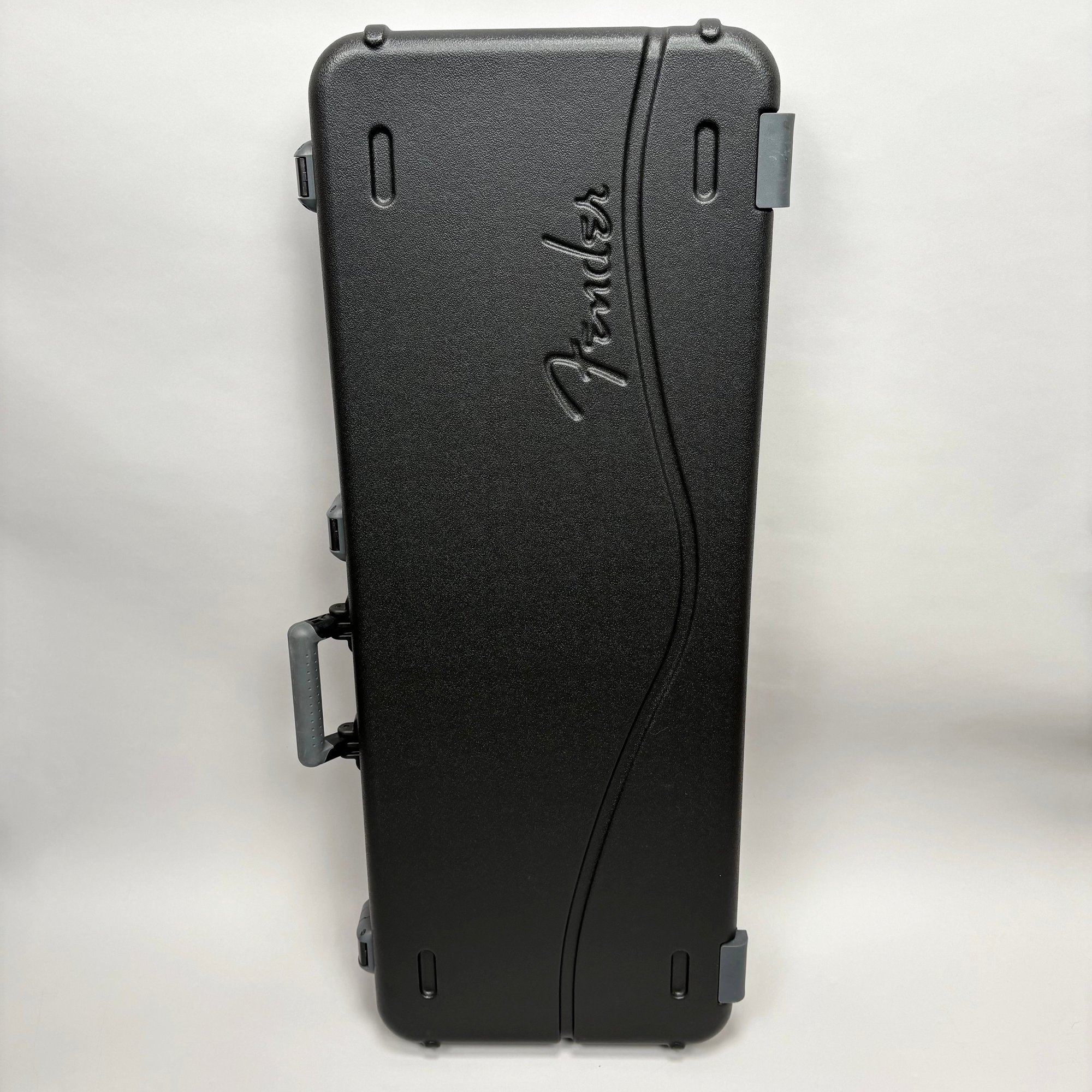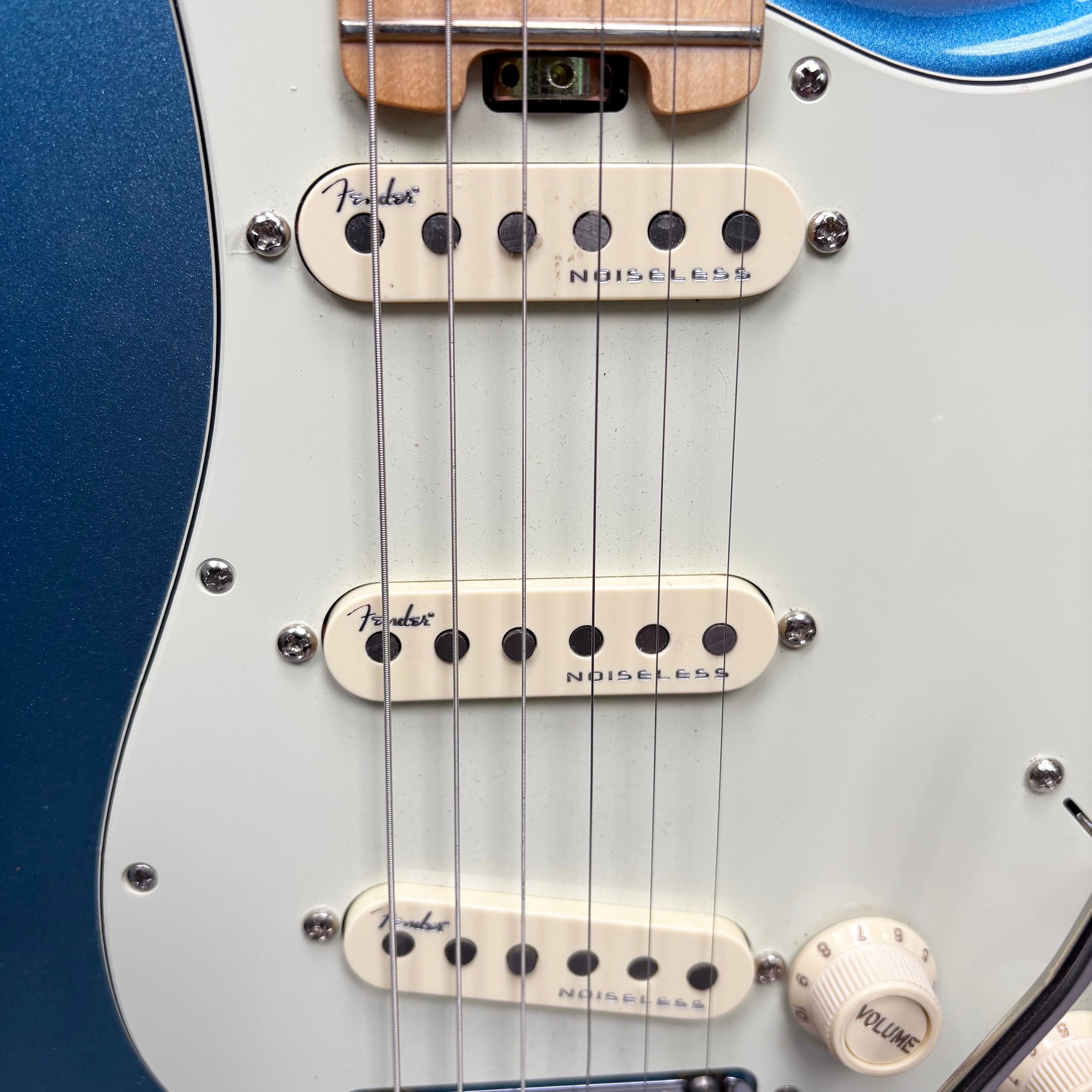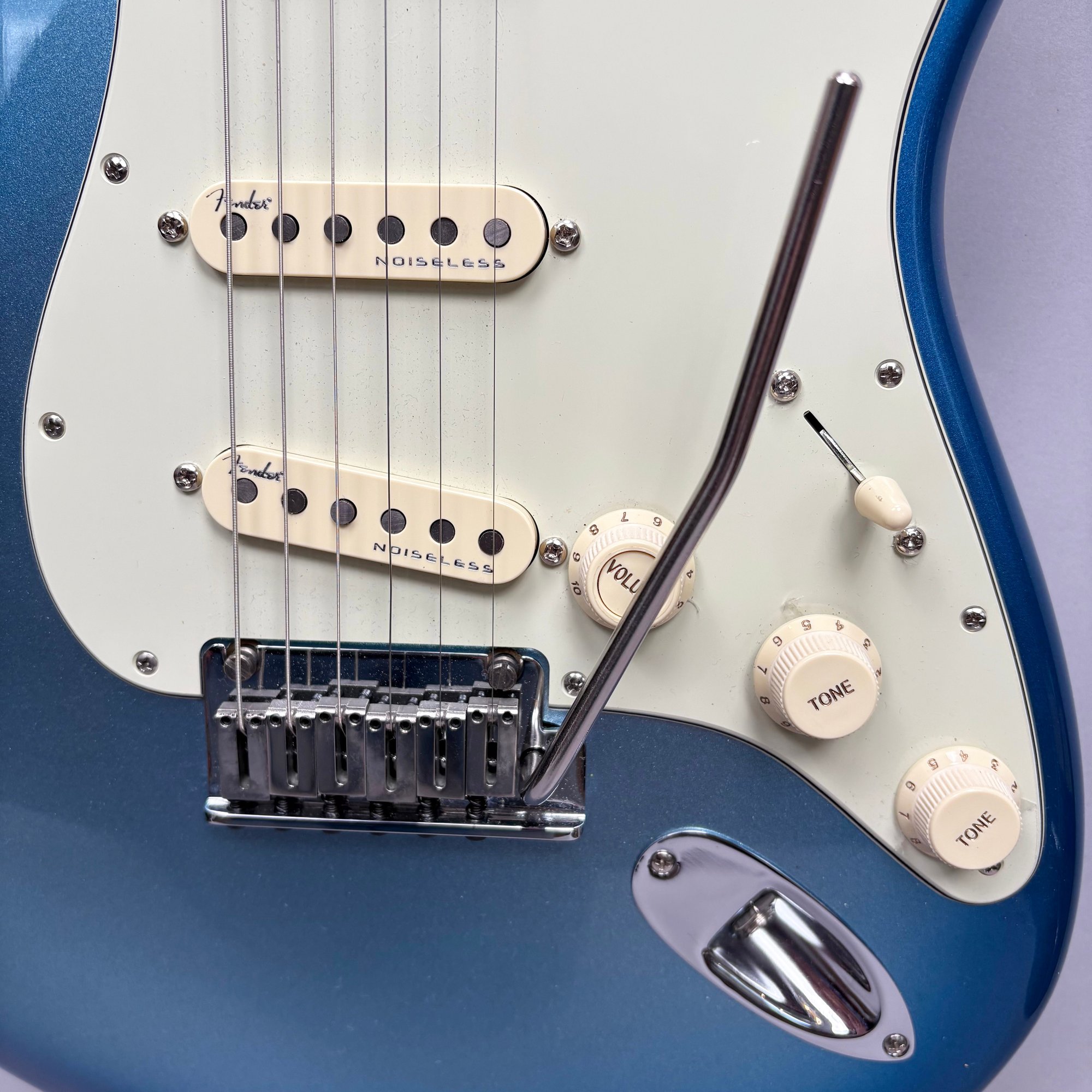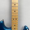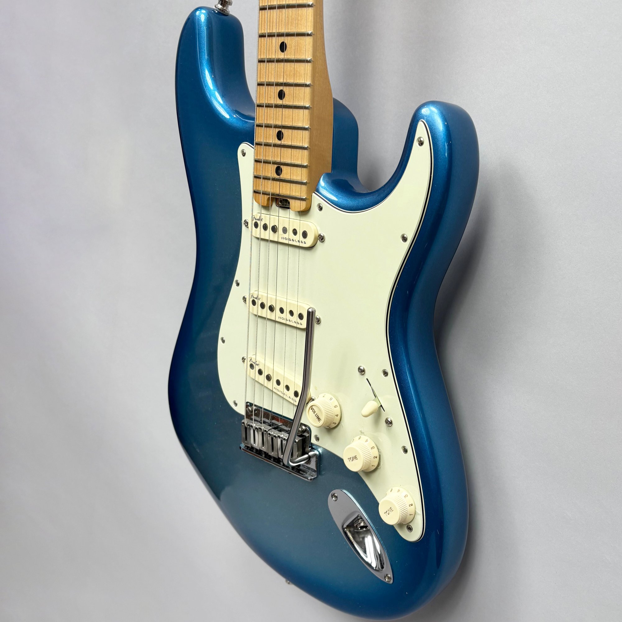 Fender Musical Instruments Corp. Elite Skyburst Metallic Stratocaster MN SBM, Serial Number US15062469, Model Number 0114002-736, Corona, California, 2015, and Case. Right-handed, classic Strat alder body with maple neck, each of the 4th generation noiseless bridge pickups marked "Fender/ NOISELESS," the pickguard four-ply aged white pearloid, marked on the front of the headstock "Fender STRATOCASTER," and on the back "SERIAL NUMBER US15062469/ MADE IN U.S.A." and "Fender/ CORONA/ CALIFORNIA" on the chrome neck plate, also including an owner's manual, Fender RoHS inspection tag, warranty card, pass certificate dated October 12, 2015, "Control Description" and "Parts Layout" information sheets, two Fender instrument cables in black and blue, tools, a blue "Fender/ THIN" pick, Fender bumper sticker, a Fender black leather guitar strap, and the original Fender molded black hardshell case with locking center latch, molded "Fender," with grey polyester plush interior and two keys, case tag printed "Fender/ A PRODUCT OF/ FENDER MUSICAL/ INSTRUMENTS CORP/ CORONA, CA U.S.A./ MADE IN CHINA." Together with a Levy's, Canada, veg-tan leather guitar strap embossed with a partial face in profile with one hand around the neck and the other hand over the sound hole, the frets depicting various views of musicians playing and singing, signed on the bottom hand "Charles Johnston/ C5," "L/ LEVY"S" brand on the front and white label on the reverse, the chrome hook marked "Fender" three times.