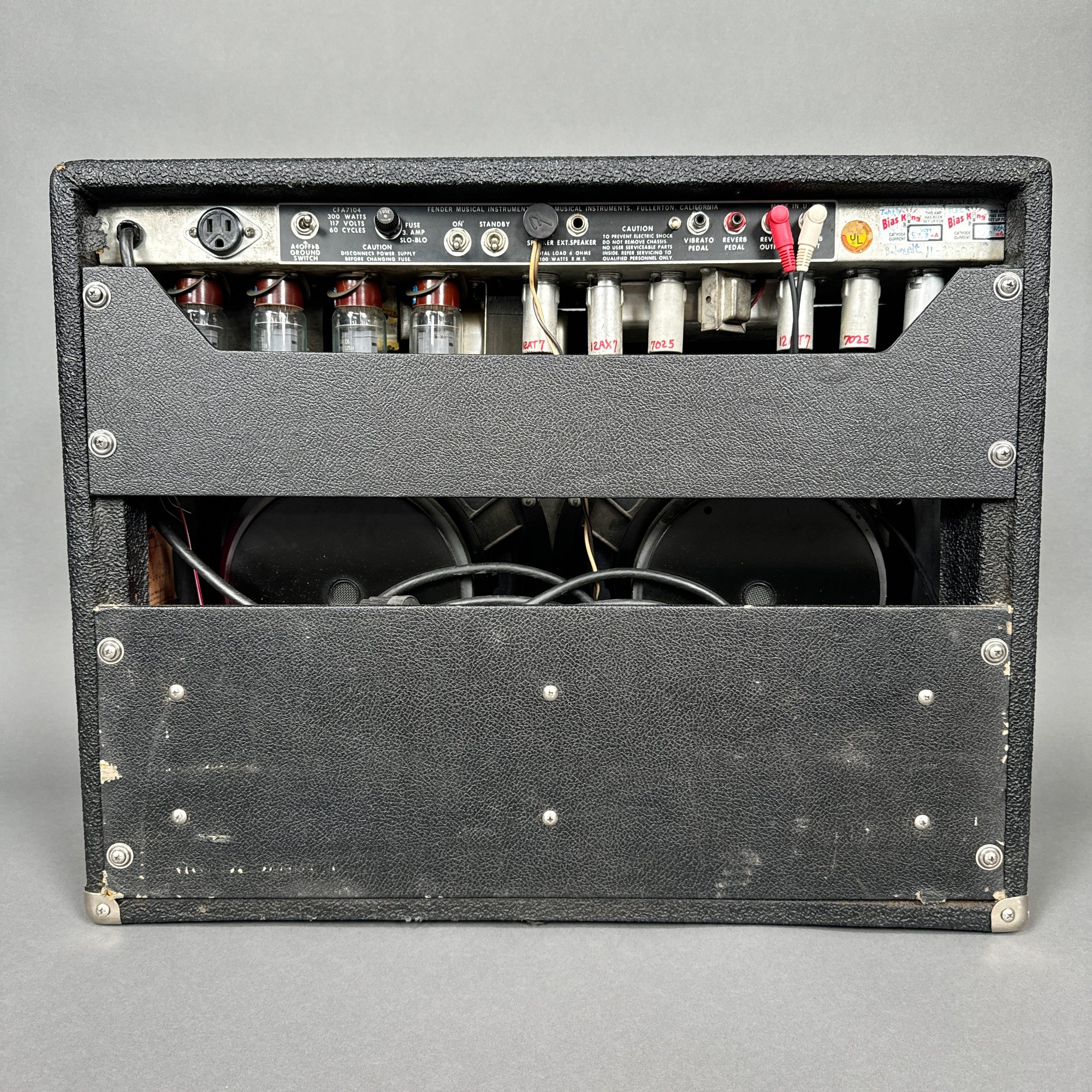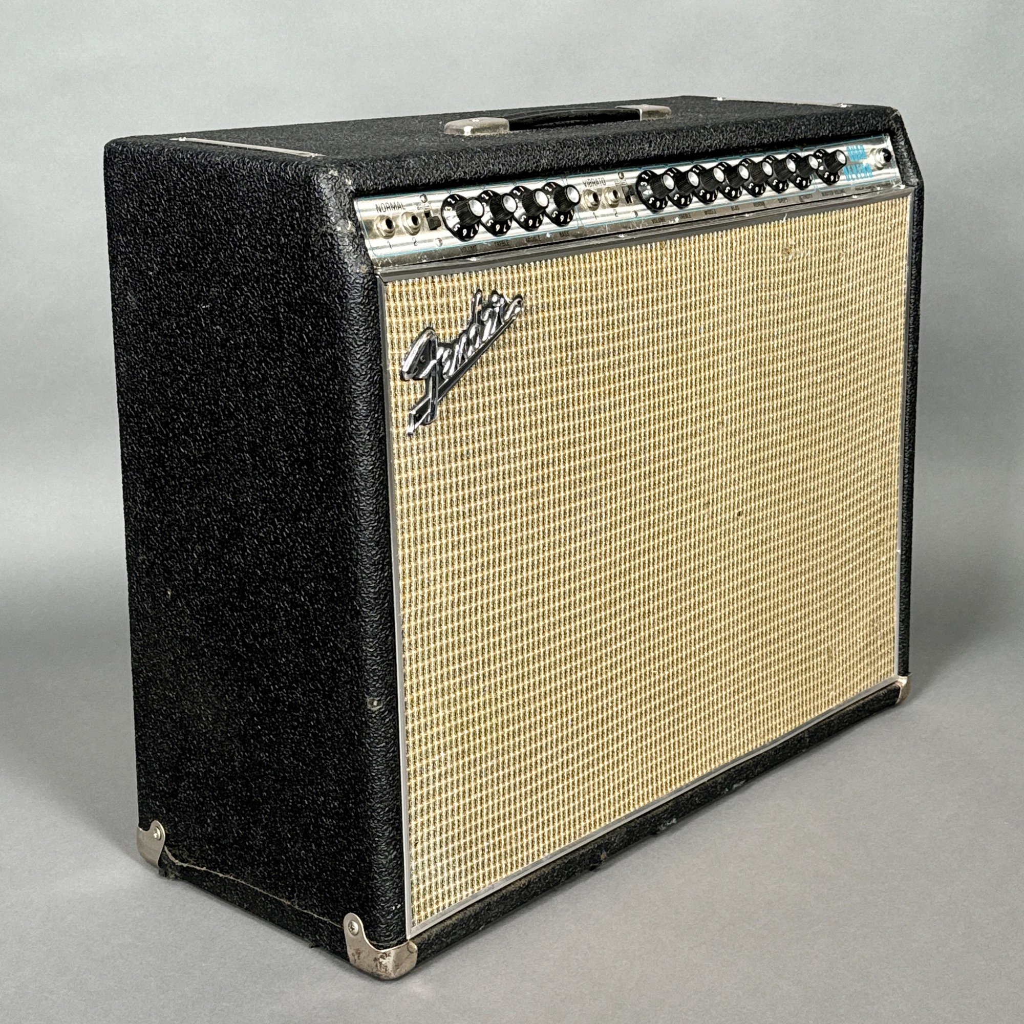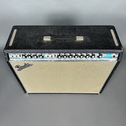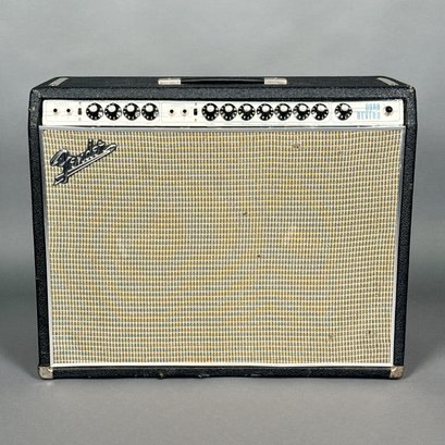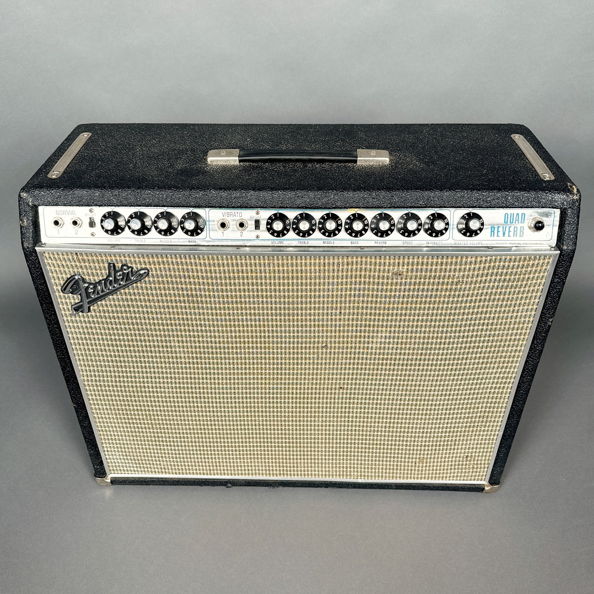 H: 20.5 in, W: 26.25 in., D: 9.5 in.Fender Musical Instruments Corp. Quad Reverb Amplifier, No Serial Number Located. With accessories, and including a Fender black cover signed "Fender."