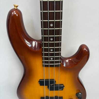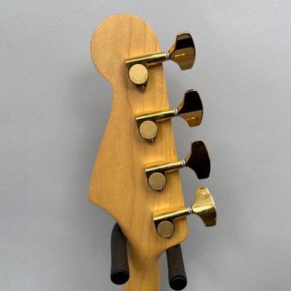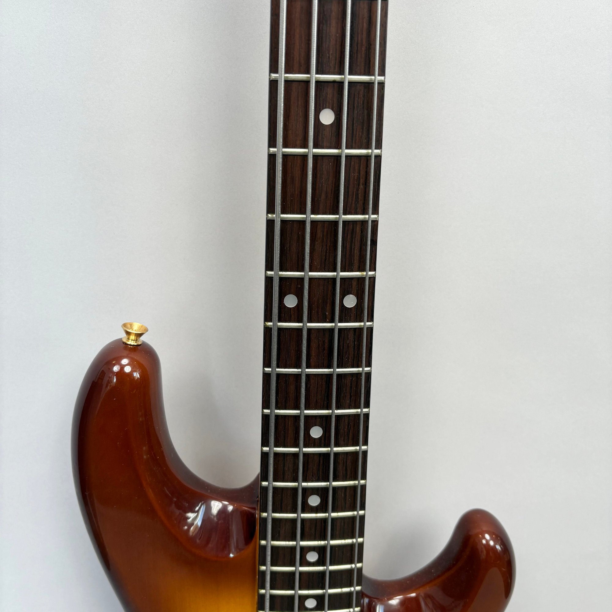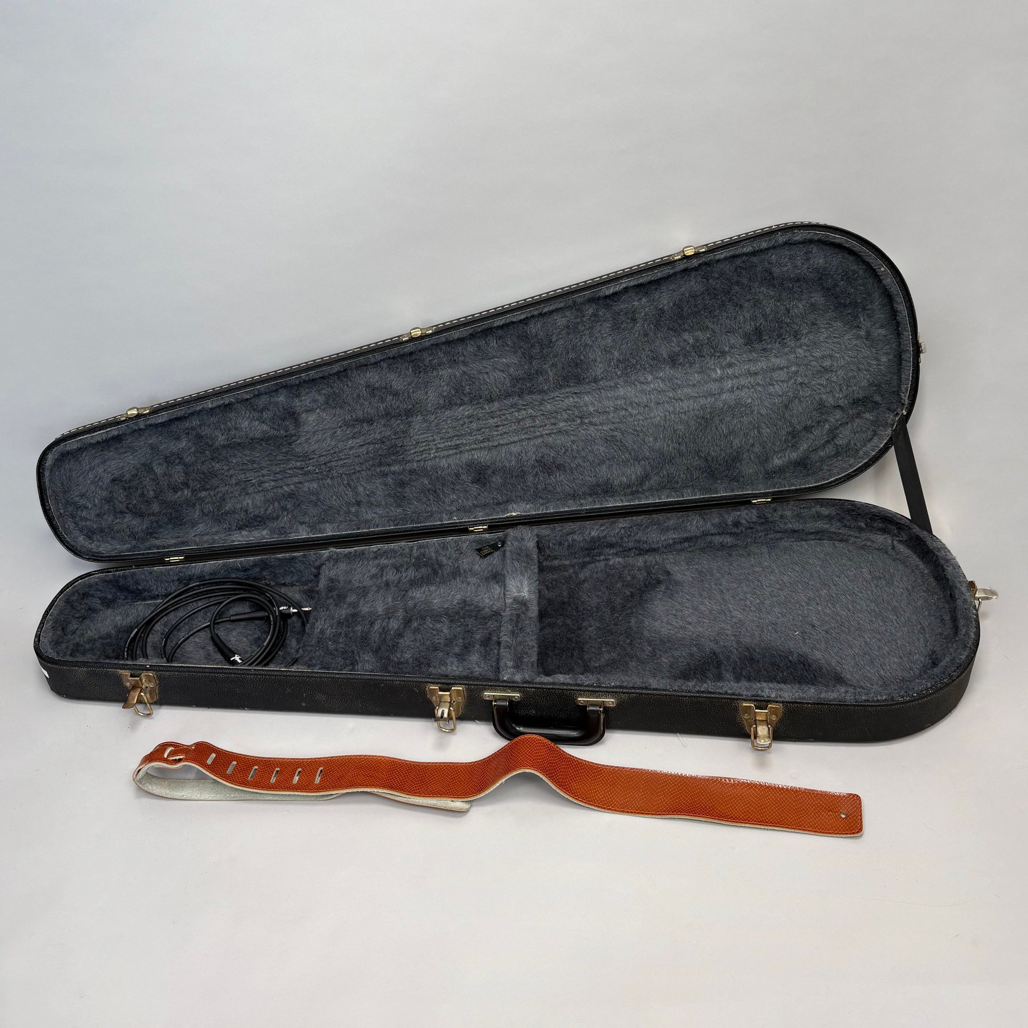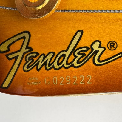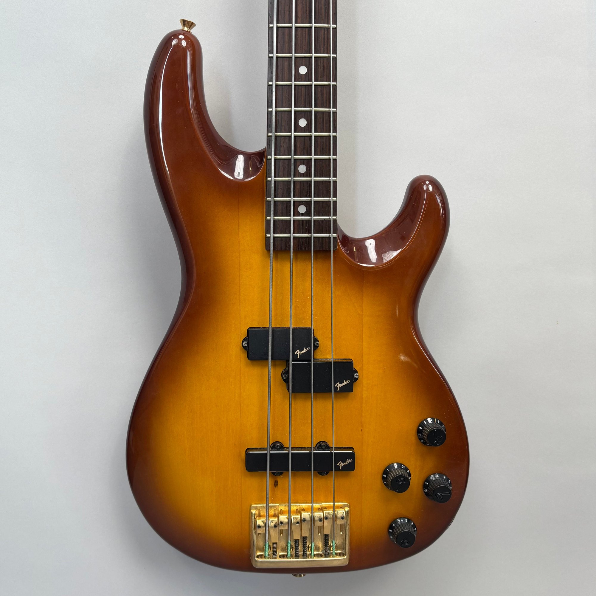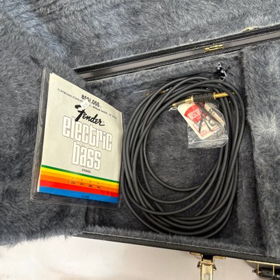 Fender Violin Burst Precision Bass "Lyte" Guitar, Serial Number C029222, Fuji-Gen Plant, Japan, 1985-1986, and Case. Right handed, double cutaway alder body in Violin Burst, the matching headstock with gold-plated hardware, decals on the front printed "Fender PRECISION BASS Lyte/ SERIAL NUMBER C029222/ MADE IN JAPAN," rosewood fretboard with pearloid dots, gold-plated neckplate signed "Fender," gold-plated hardware and black knobs; also including two instrument cables, hardware, empty Fender electric bass strings plastic envelope, white "Fender/ THIN" guitar pick, and a black hardshell case with dark grey plush interior, the plastic pull tab inside the case stamped "CASE/ made in/ CANADA." Together with a brown leather guitar strap, impressed "GENUINE LEATHER/ MADE IN CANADA."