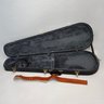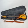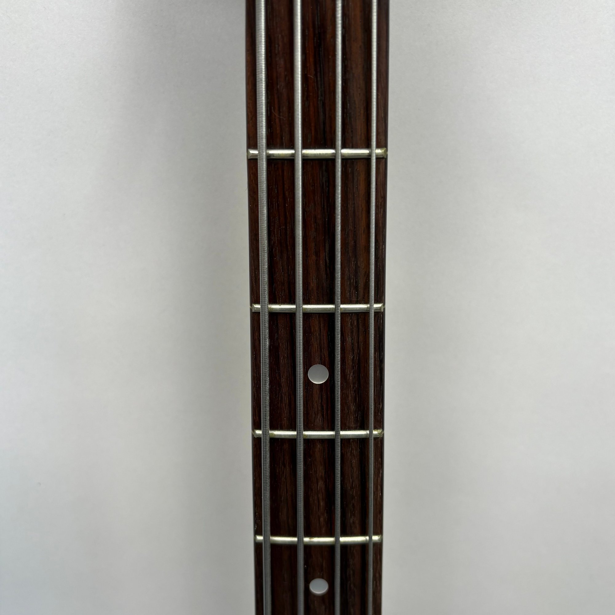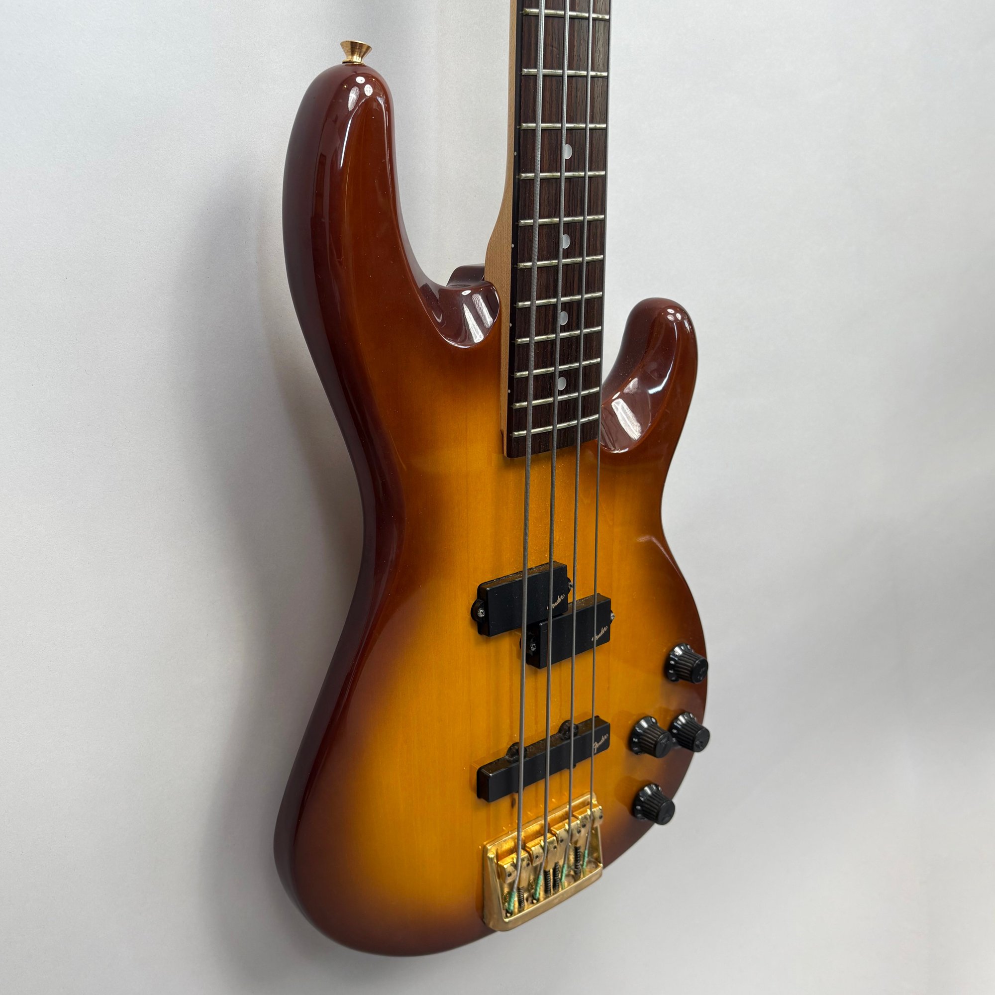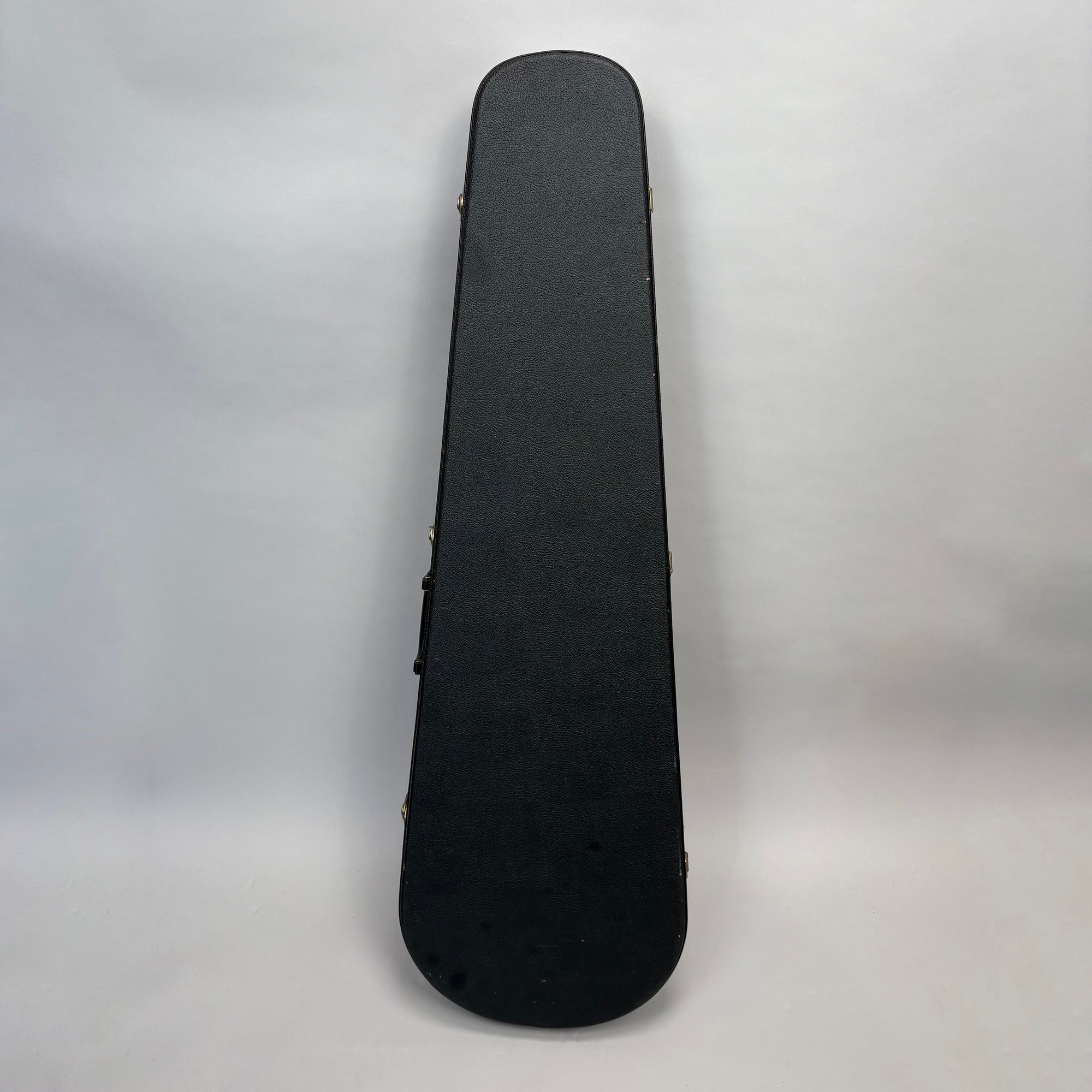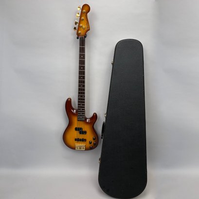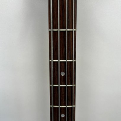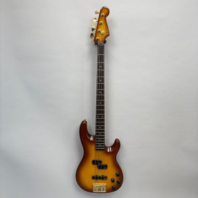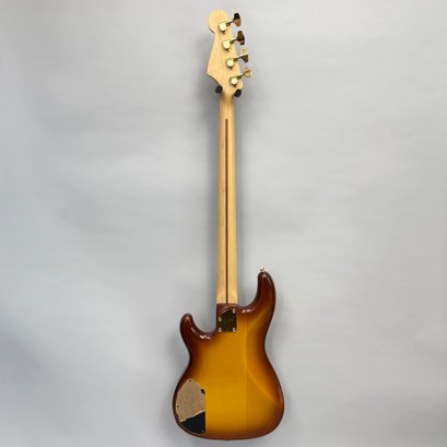 Fender Violin Burst Precision Bass "Lyte" Guitar, Serial Number C029222, Fuji-Gen Plant, Japan, 1985-1986, and Case. Right handed, double cutaway alder body in Violin Burst, the matching headstock with gold-plated hardware, decals on the front printed "Fender PRECISION BASS Lyte/ SERIAL NUMBER C029222/ MADE IN JAPAN," rosewood fretboard with pearloid dots, gold-plated neckplate signed "Fender," gold-plated hardware and black knobs; also including two instrument cables, hardware, empty Fender electric bass strings plastic envelope, white "Fender/ THIN" guitar pick, and a black hardshell case with dark grey plush interior, the plastic pull tab inside the case stamped "CASE/ made in/ CANADA." Together with a brown leather guitar strap, impressed "GENUINE LEATHER/ MADE IN CANADA."