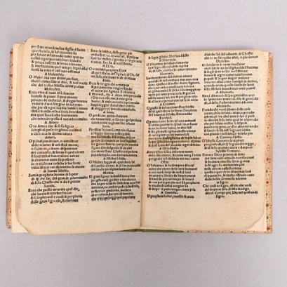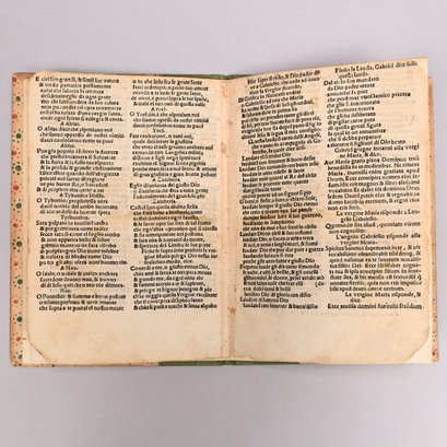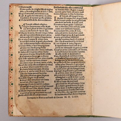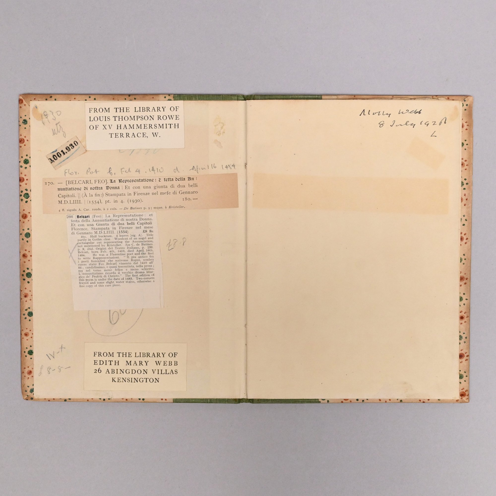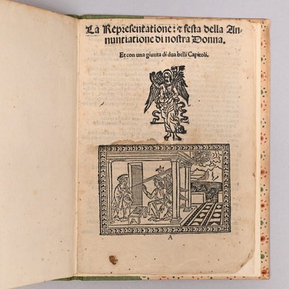Feo Belcari. "La Representatione: et festa della Annuntiatione di nostra Donna. Et con una Giunta di dua belli Capitoli," Florence. Stampata in Firenze nel mese di Geearo MDLIIII (1554). Title partly in Gothic characters, with woodcut of an angel above a representation of the Annunciation. 4to, half buckram, 4 leaves.