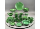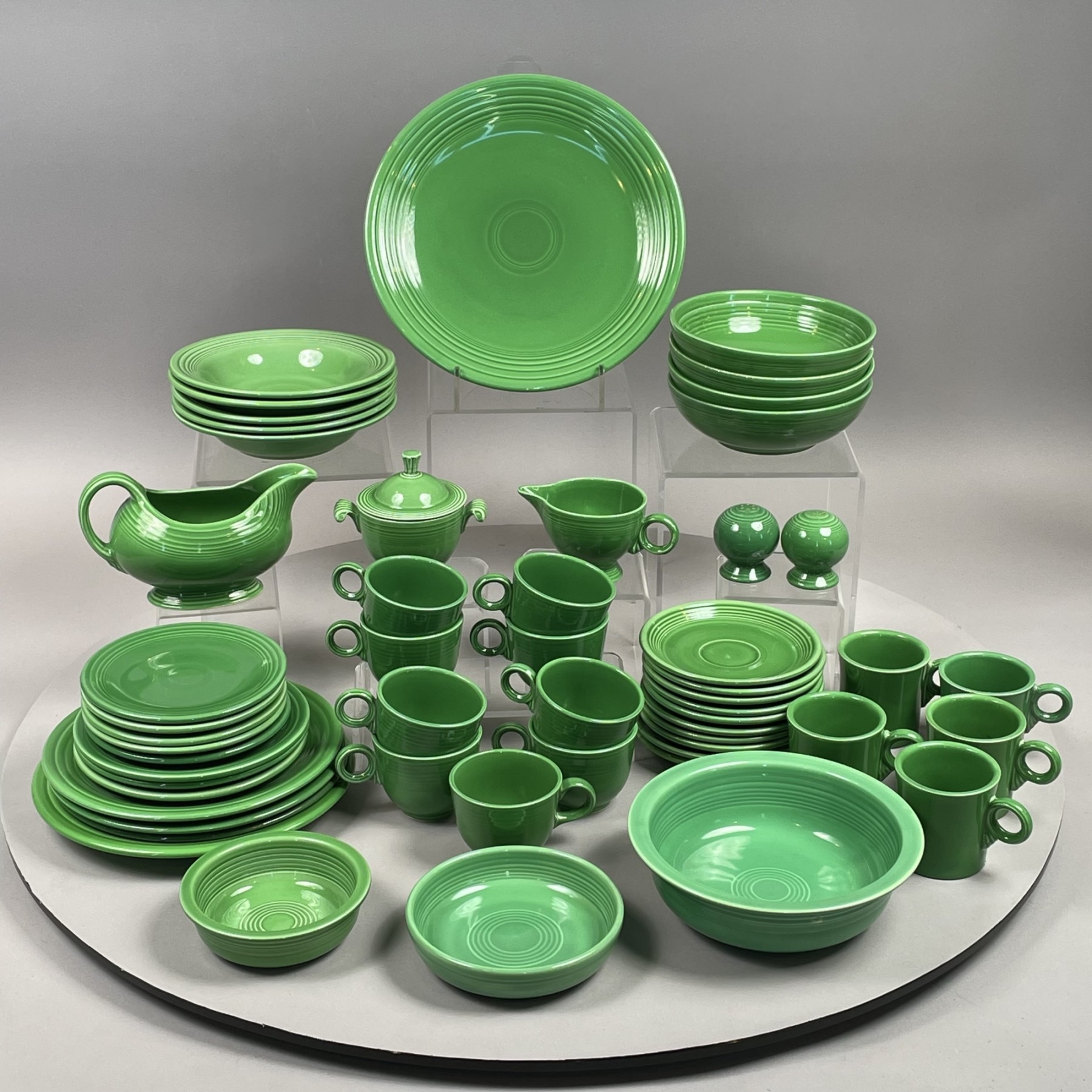 Comprising a 12.25 in. chop plate, 8.5 in. nappy, sauce boat, pair of salt and pepper shakers, 5.5 in. fruit bowl, five rim soup bowls, four 7.5 individual salad bowls, five 6.25 bread and butter plates, three 9.5 in. dinner plates, three 7.375 in. dessert plates, 6.25 dessert bowl, sugar bowl, regular cream pitcher, eight teacups and ten saucers, five Tom and Jerry (coffee mugs), impressed "fiesta MADE IN USA HLC," "HLC fiesta MADE IN U.S.A.," or stamped "GENUINE fiesta HLC USA." (52)