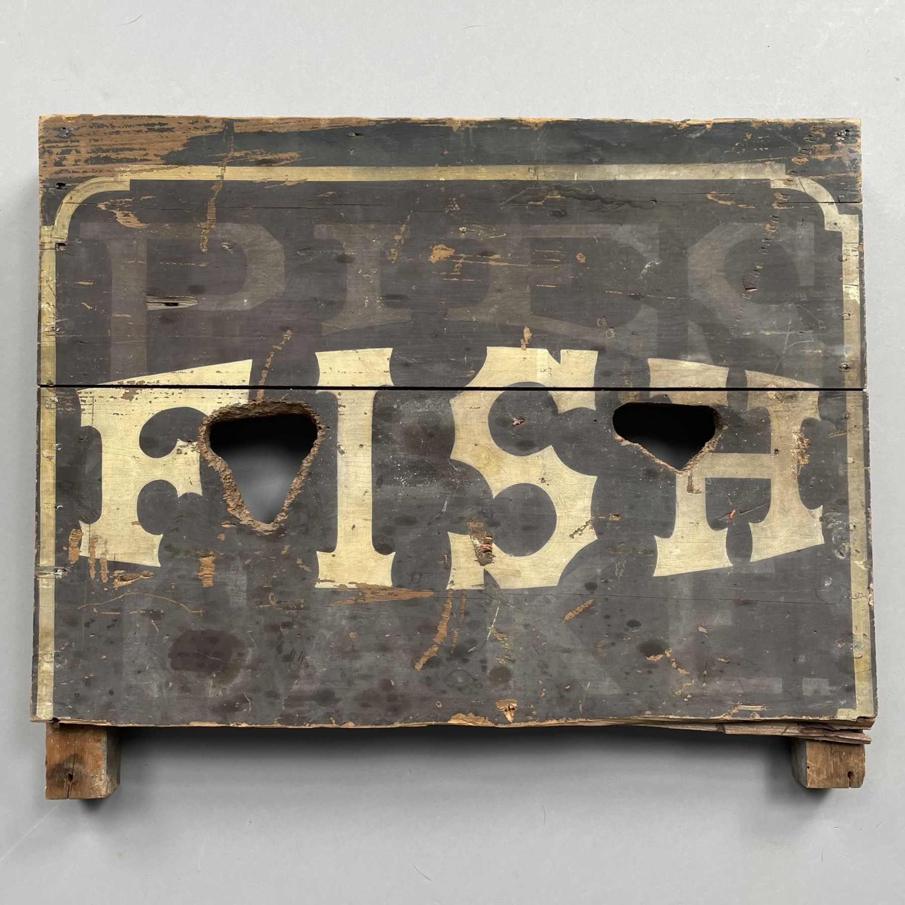 In Gothic white lettering, superimposed over "PIES & CAKES" in faint white letters, on a black ground.