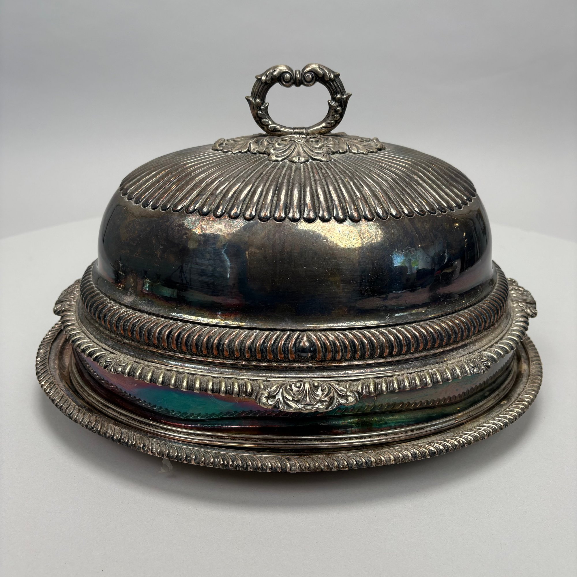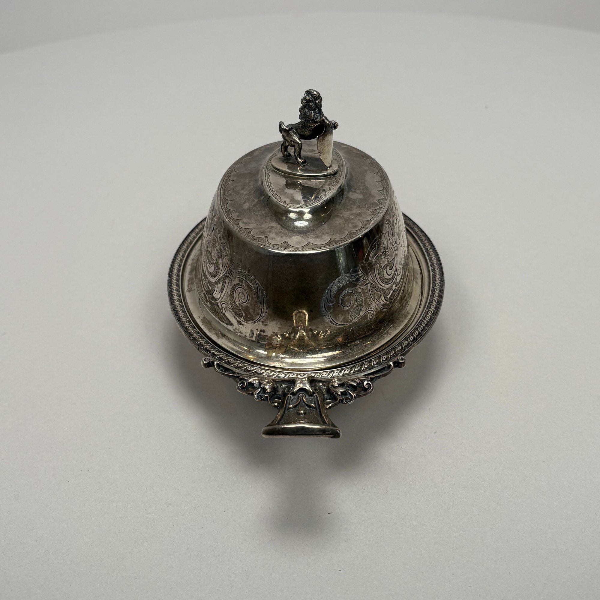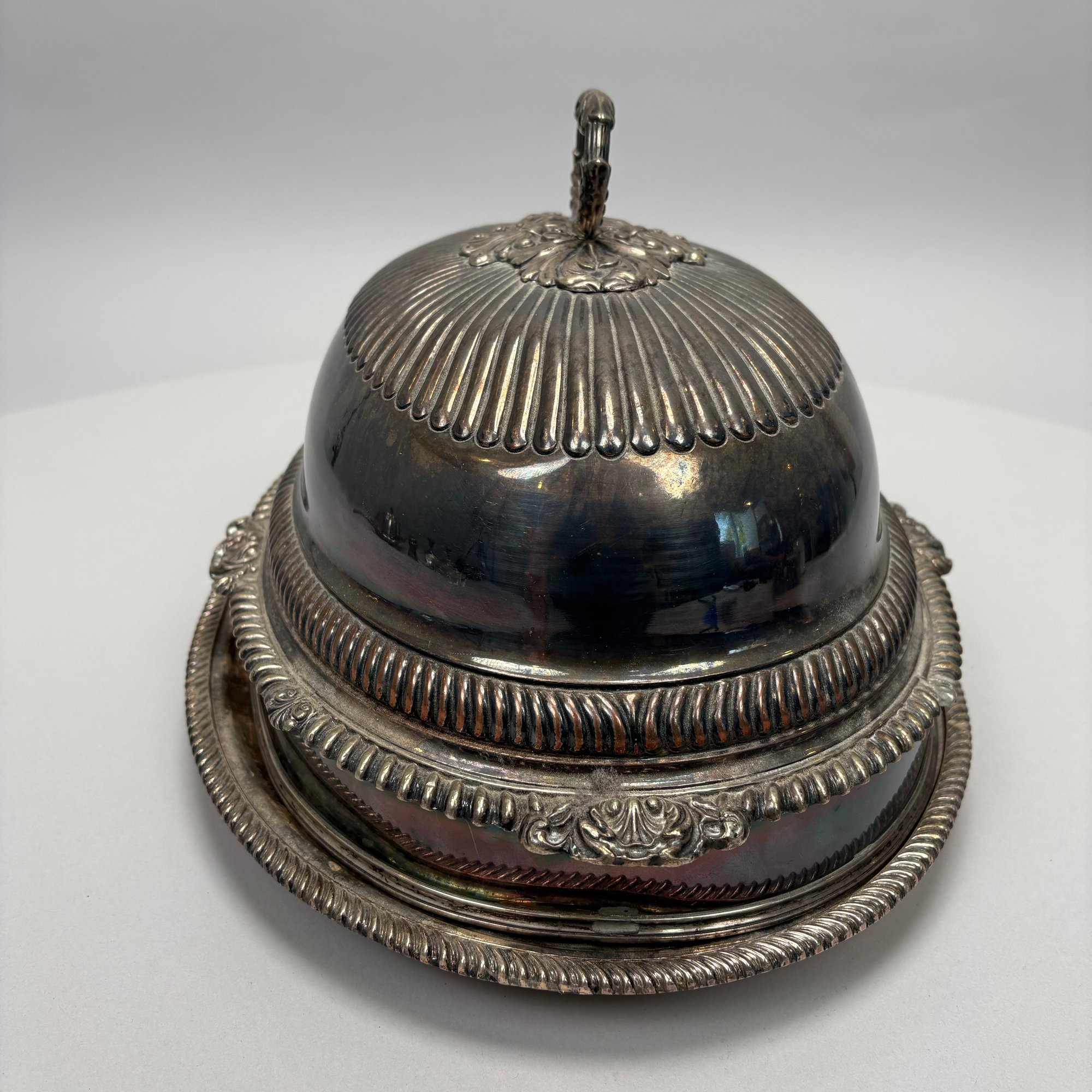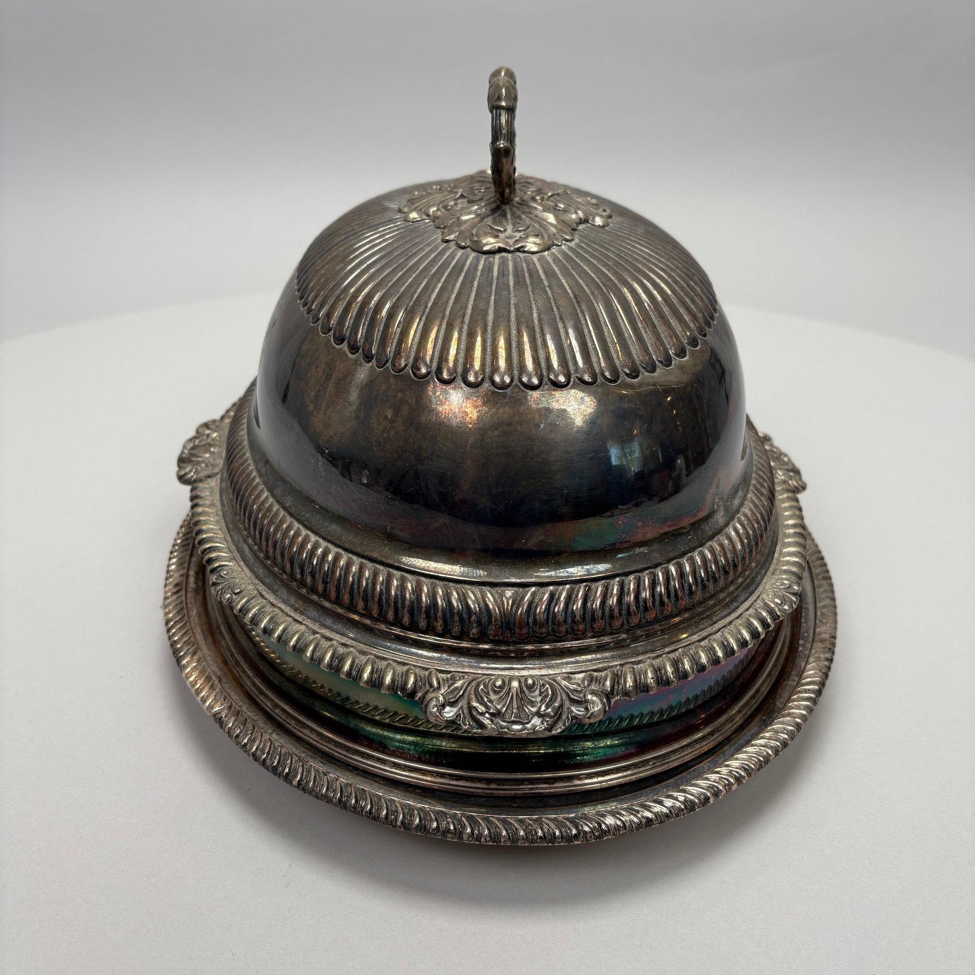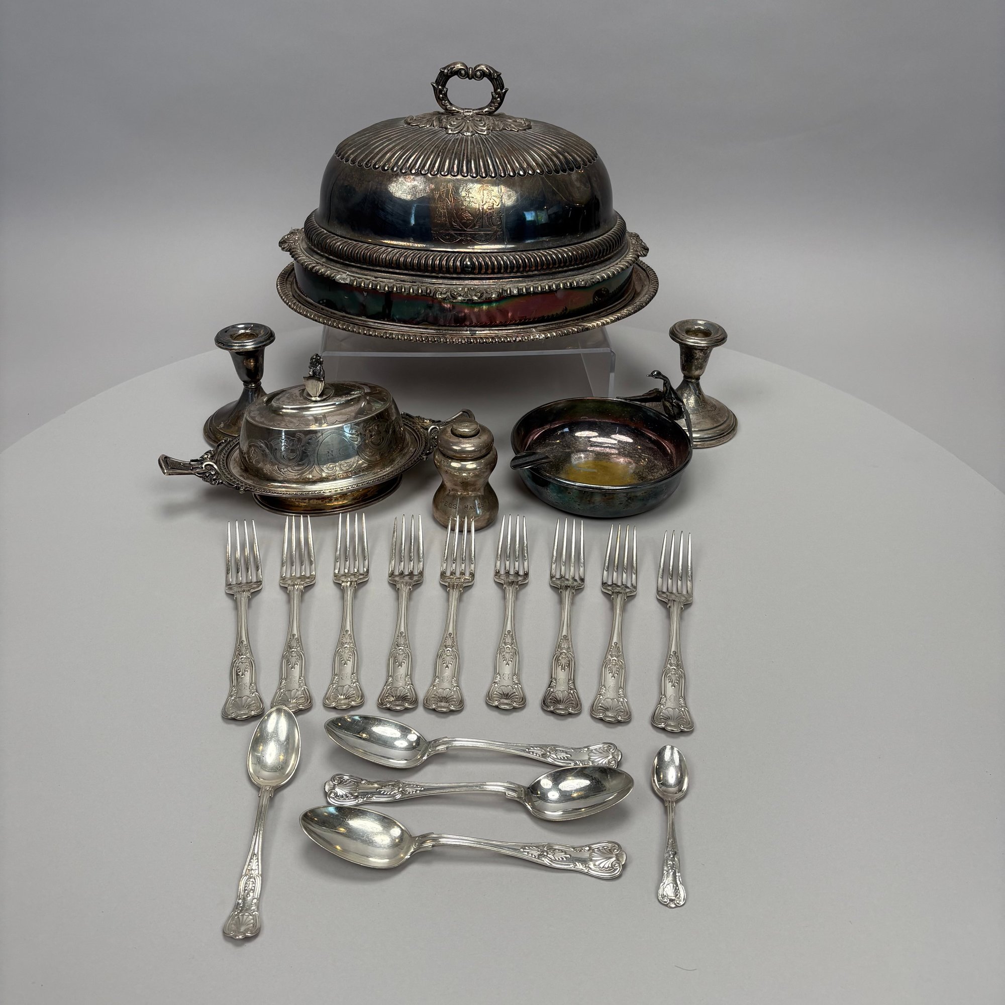 Five American and English Silverplate Tablewares and a Regency Silverplate Meat Dome. The silverplate comprising a set of King's pattern flatware with three cream soup spoons, nine dinner forks, one teaspoon and one demitasse spoon, and a butter dish and cover in Renaissance Revival style, all Gorham Mfg. Co.; and a silverplate sporting ashtray with duck handle, a pepper caster or mill and a pair of weighted silver candlesticks, the Regency Sheffield Plate armorial meat dome and liner within gadrooned rims. (20)