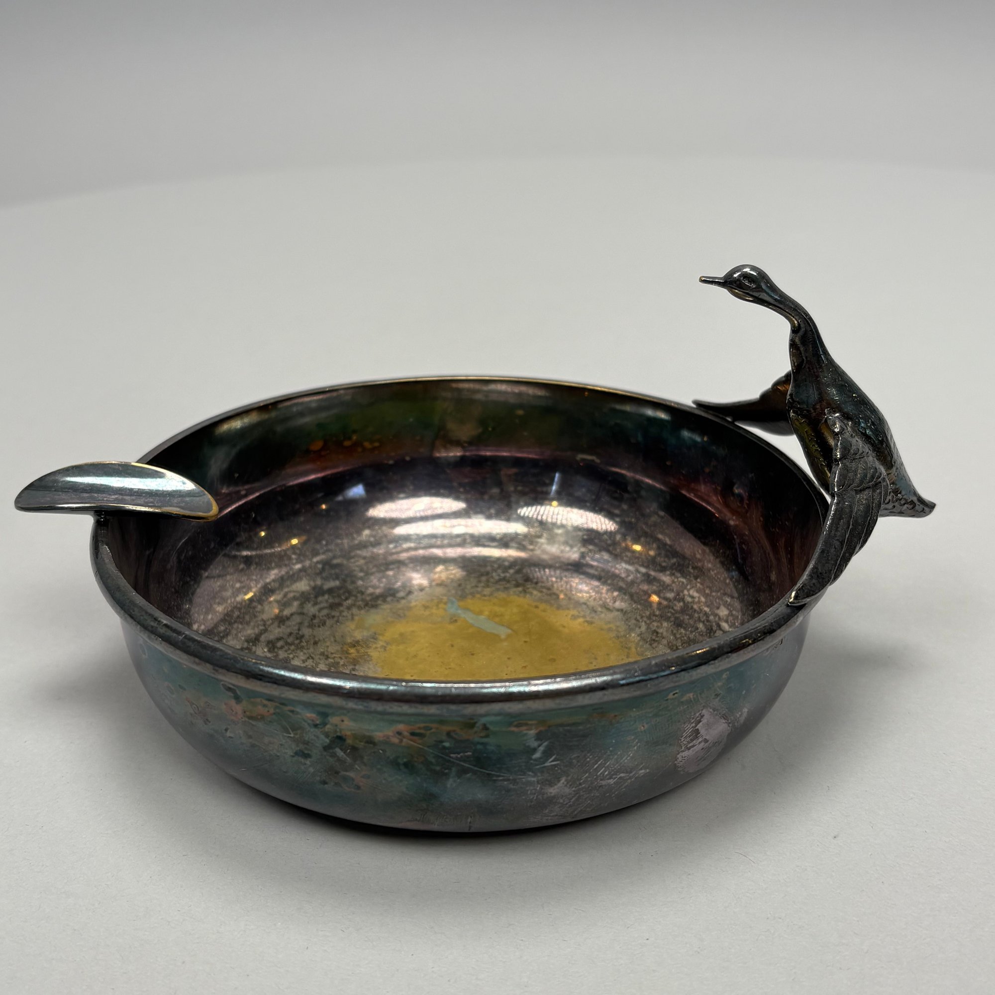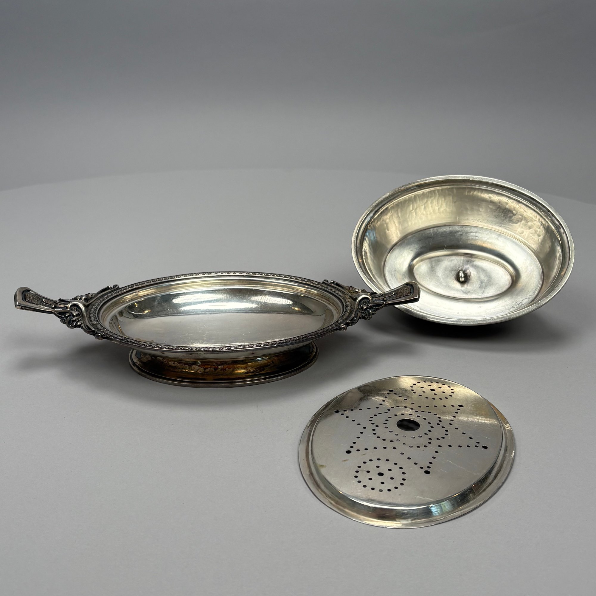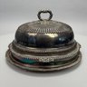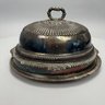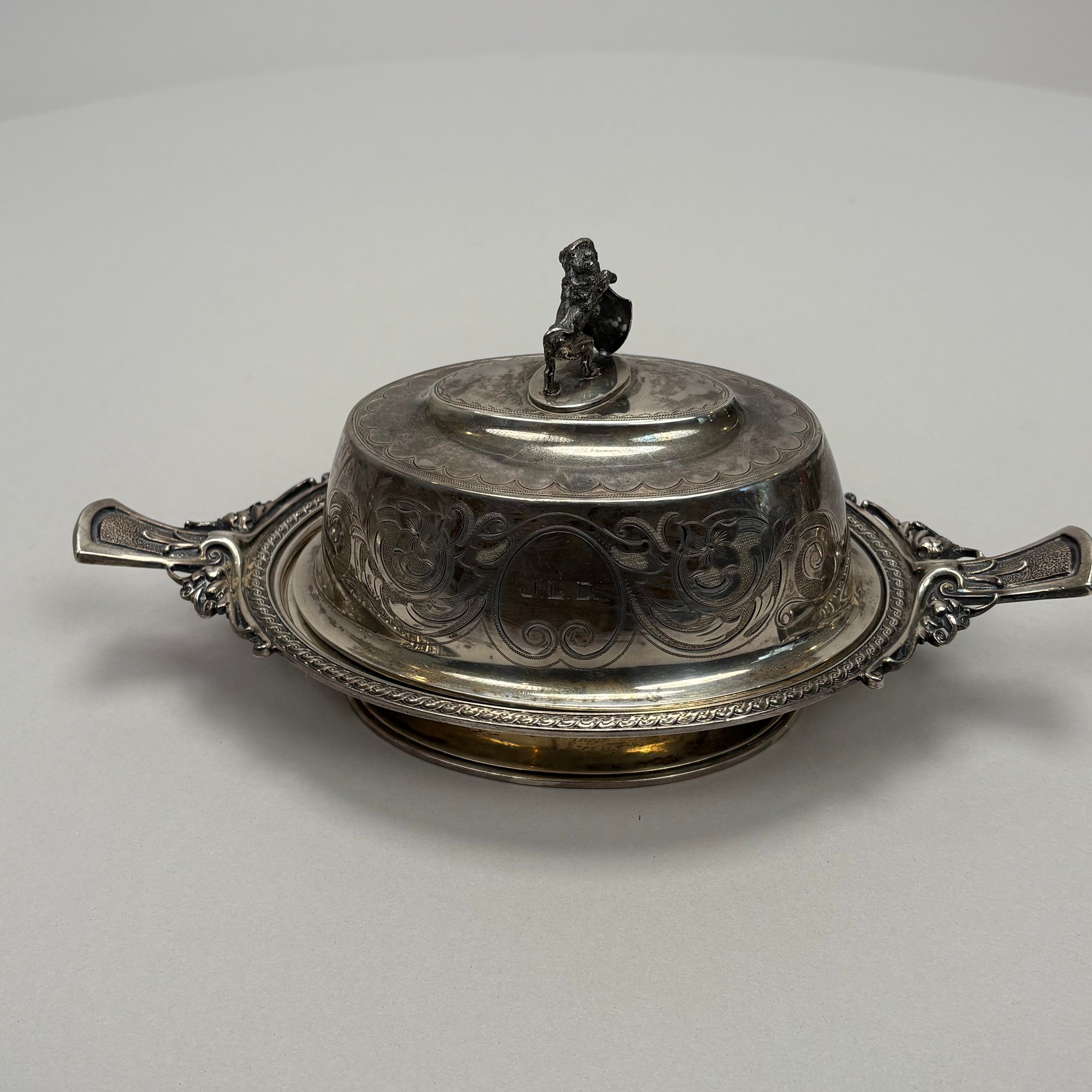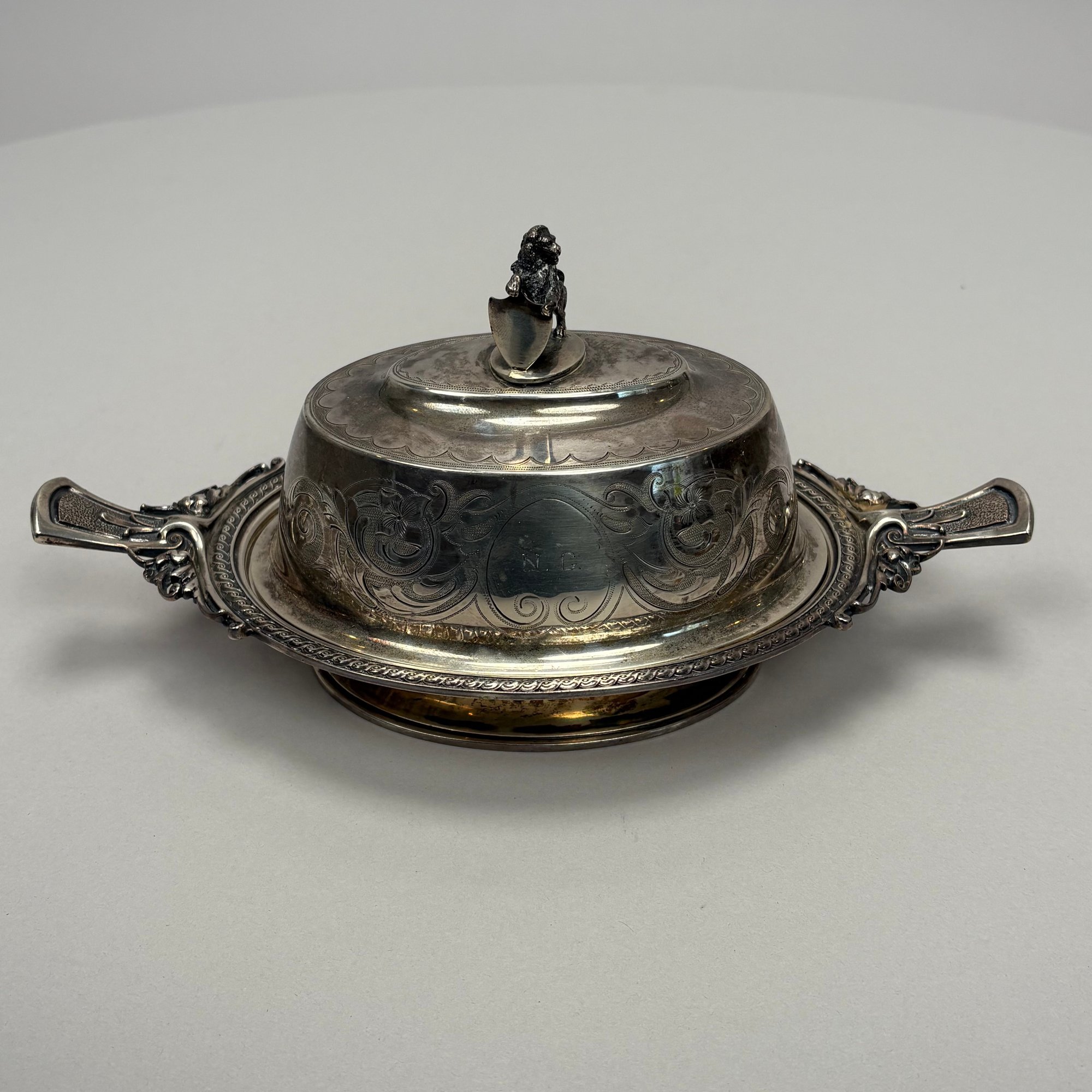 Five American and English Silverplate Tablewares and a Regency Silverplate Meat Dome. The silverplate comprising a set of King's pattern flatware with three cream soup spoons, nine dinner forks, one teaspoon and one demitasse spoon, and a butter dish and cover in Renaissance Revival style, all Gorham Mfg. Co.; and a silverplate sporting ashtray with duck handle, a pepper caster or mill and a pair of weighted silver candlesticks, the Regency Sheffield Plate armorial meat dome and liner within gadrooned rims. (20)