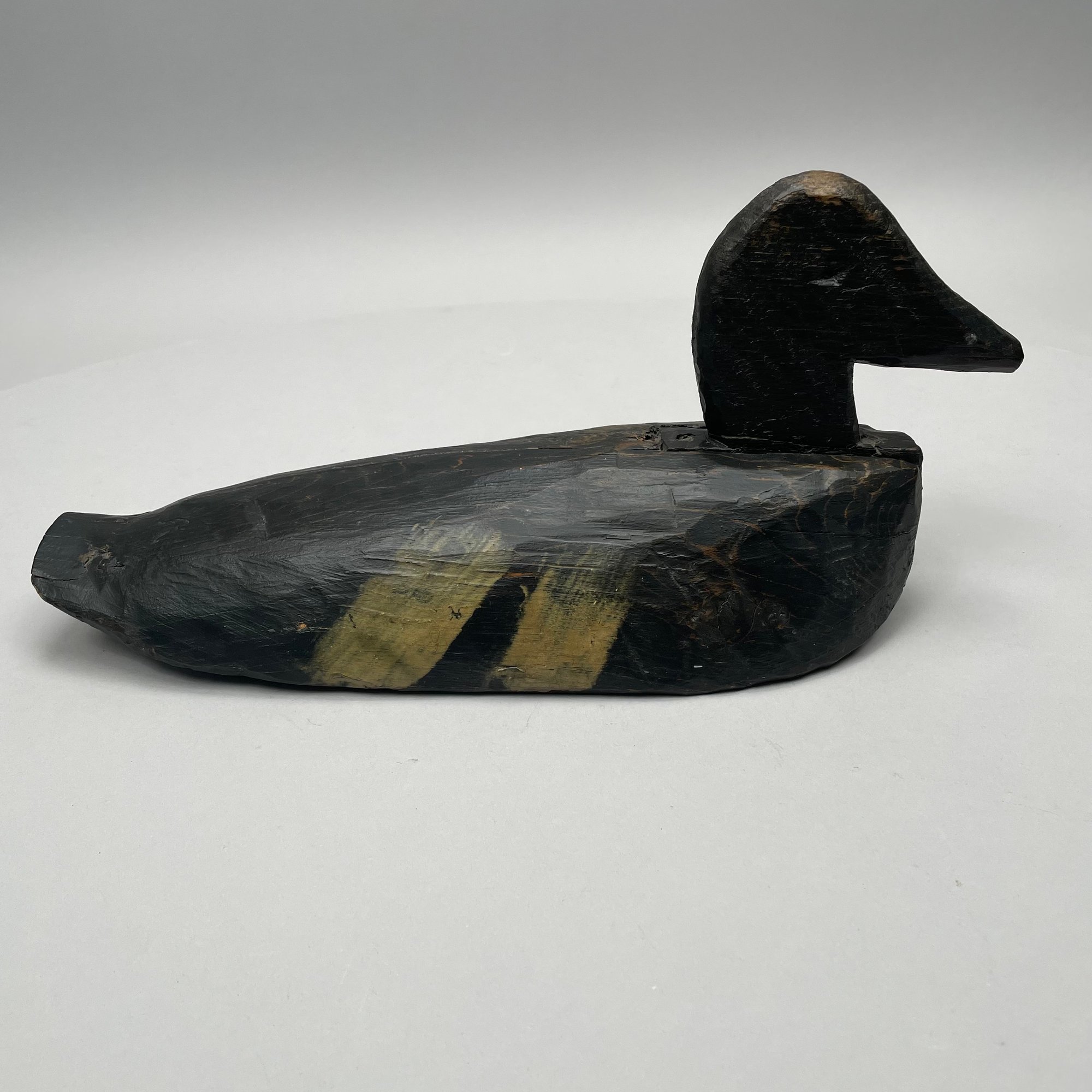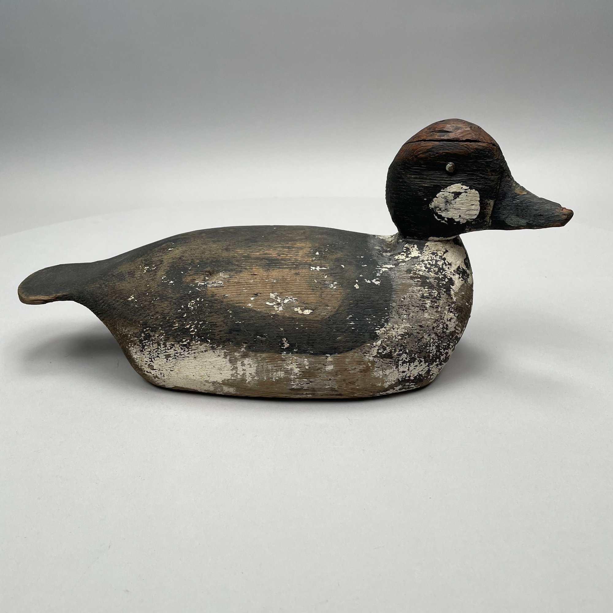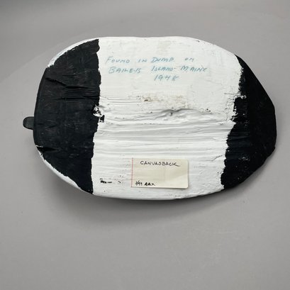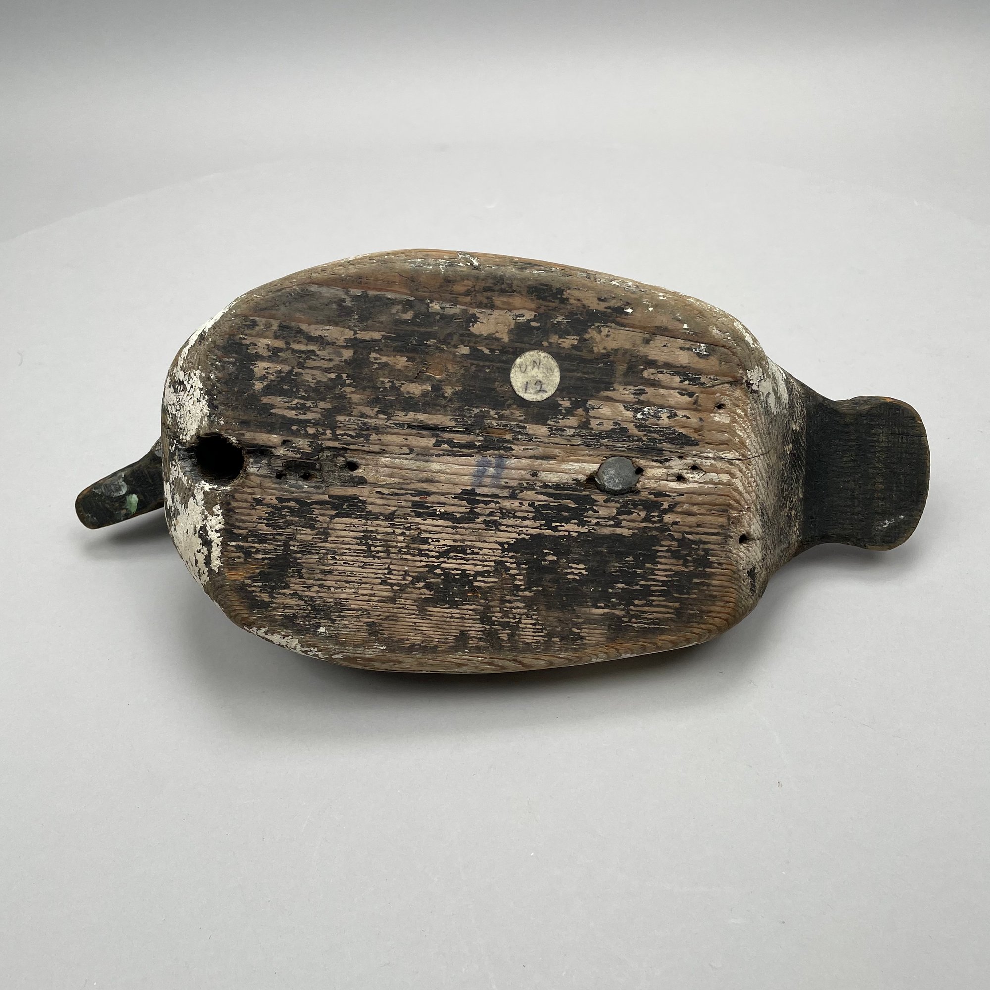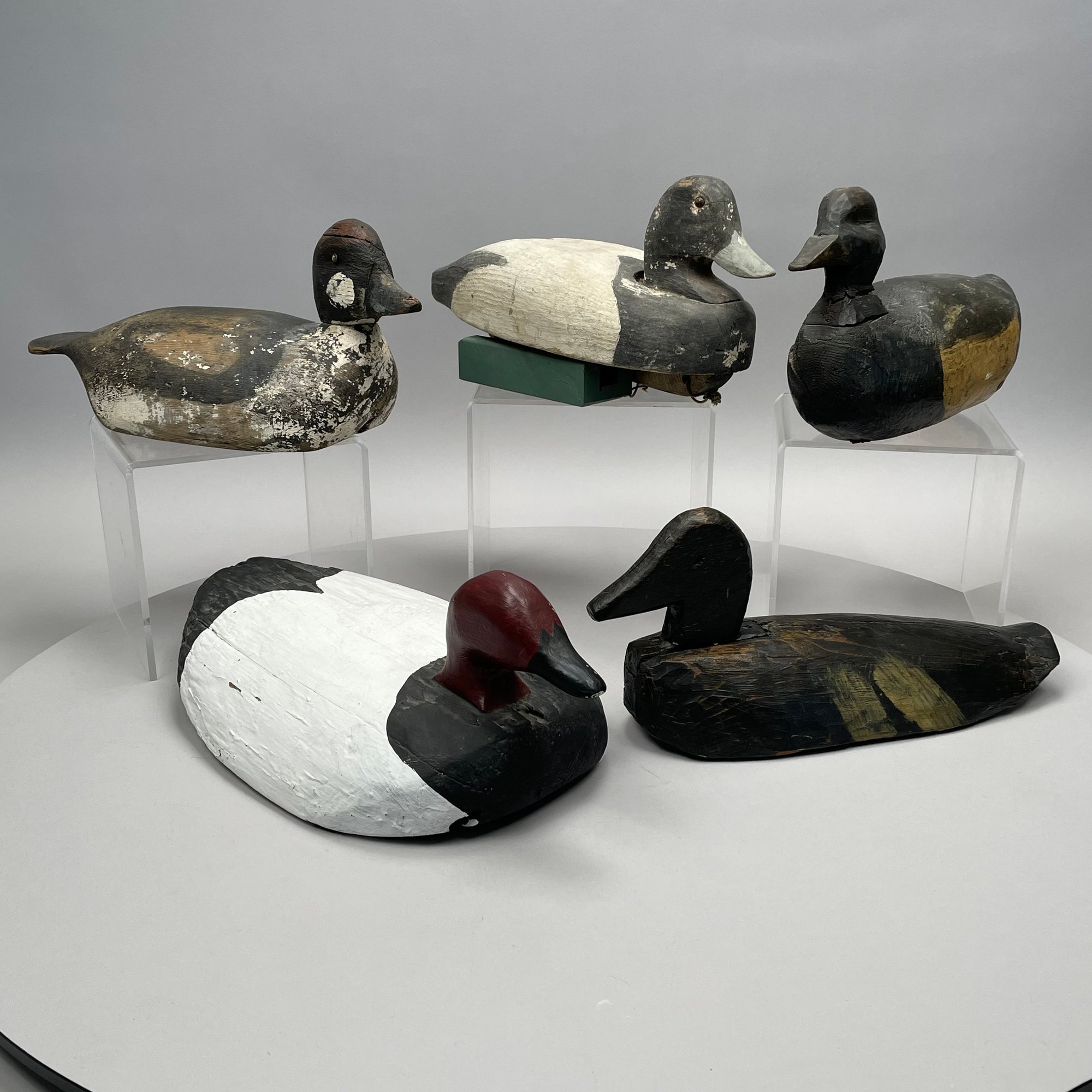 Five American Carved and Painted Duck Decoys. One with glass eyes and one with tack eyes, two purchased fom Teel Auctions, February 1999, and one Canvasback inscribed beneath "FOUND IN DUMP ON BAILEYS ISLAND - MAINE/ 1948," purchased "AAX," March 1999.