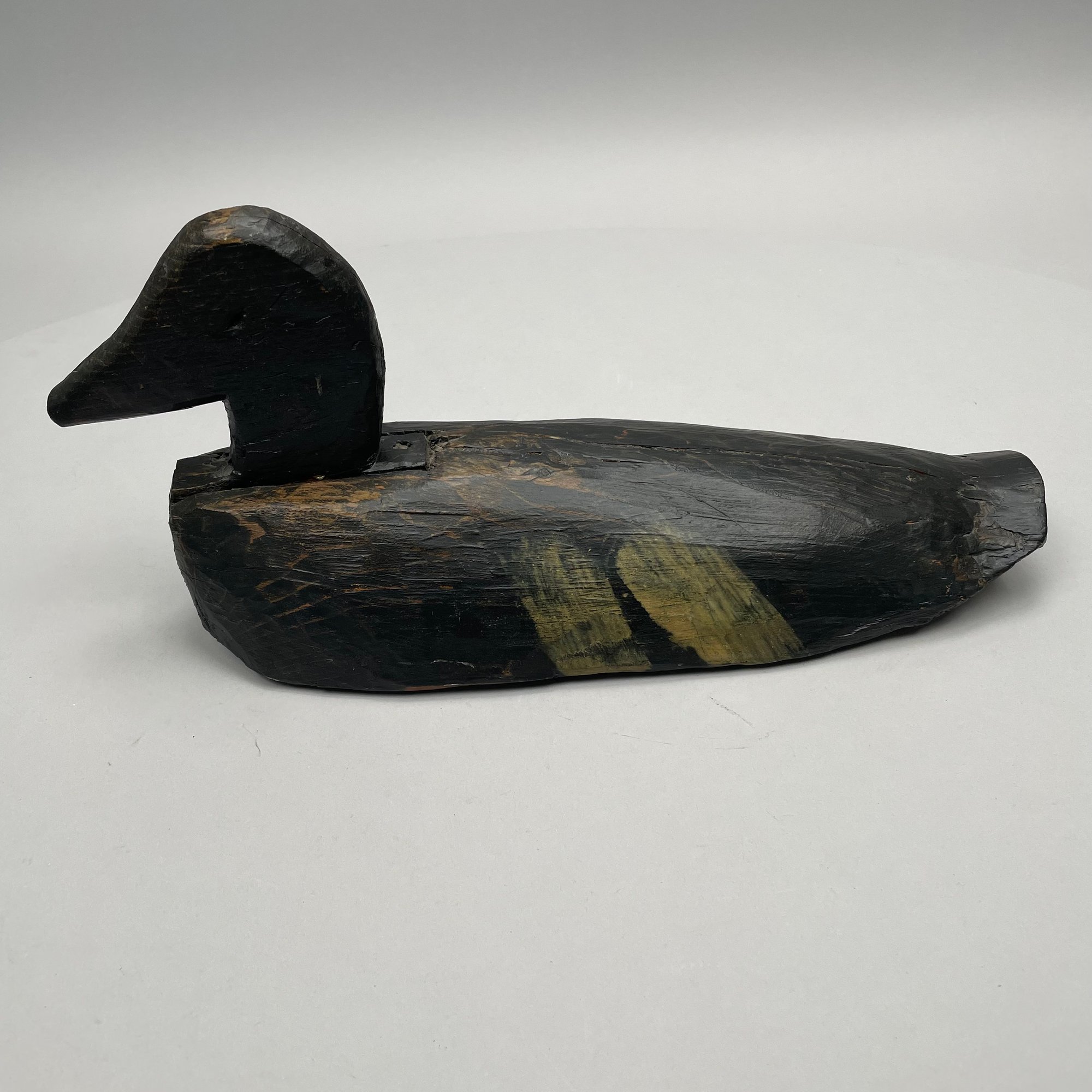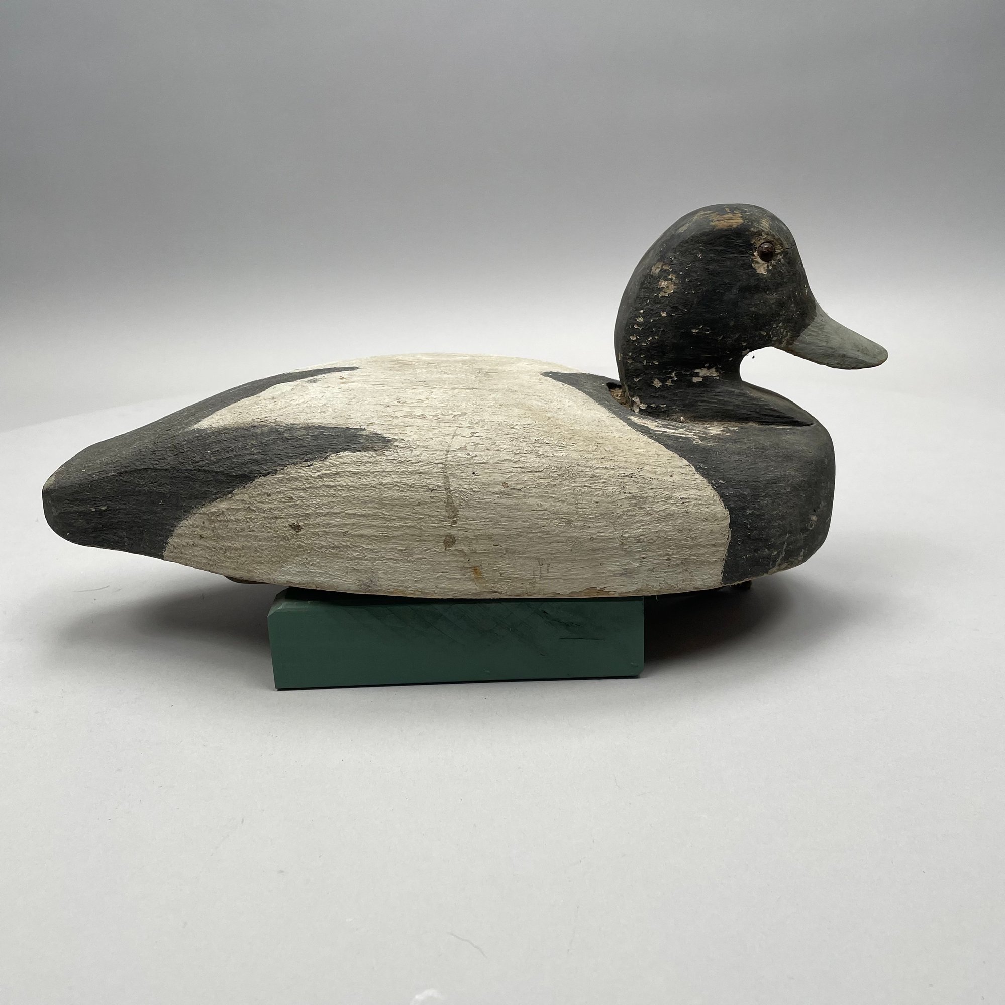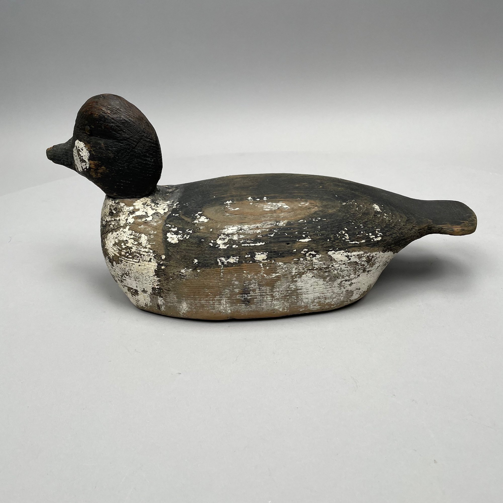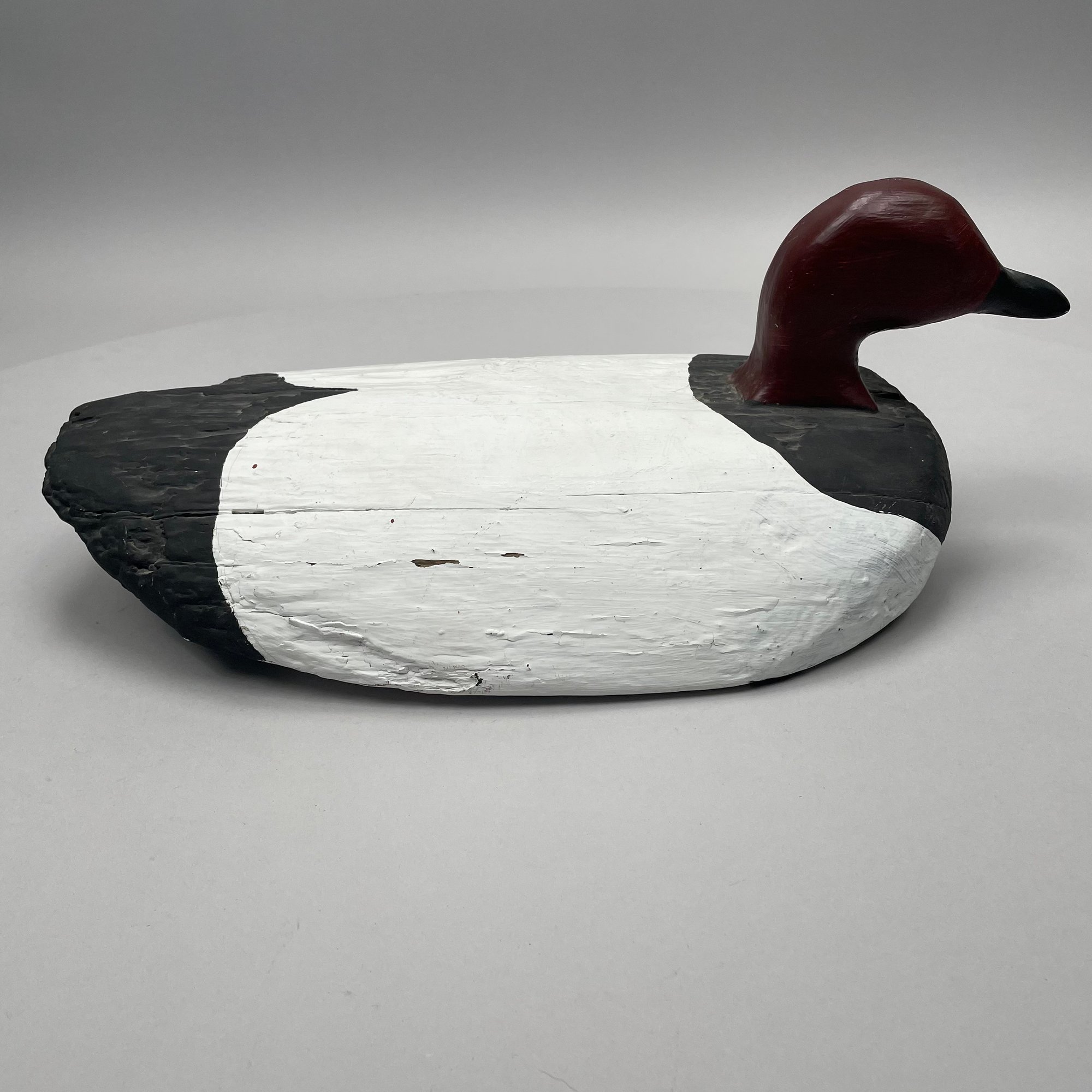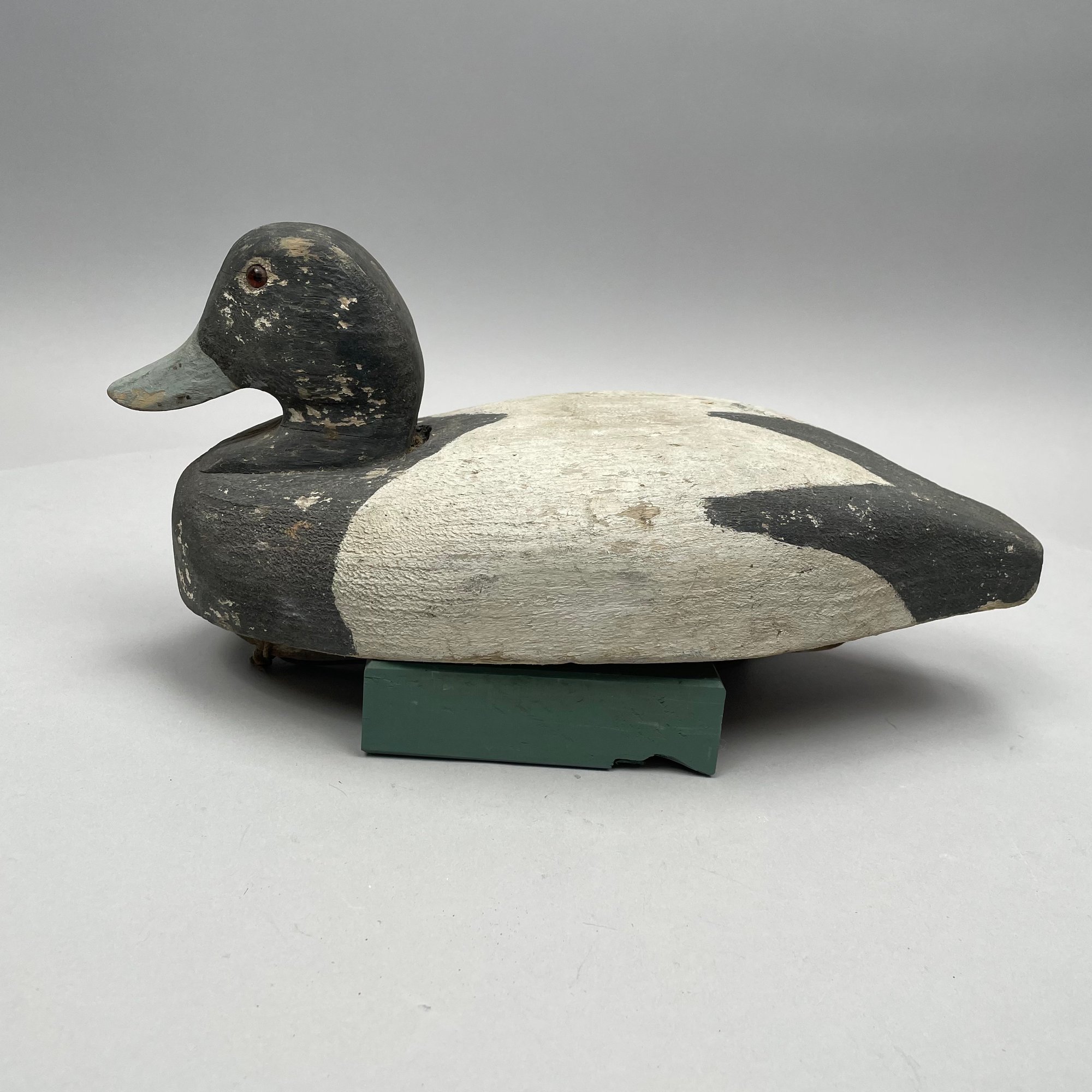 Five American Carved and Painted Duck Decoys. One with glass eyes and one with tack eyes, two purchased fom Teel Auctions, February 1999, and one Canvasback inscribed beneath "FOUND IN DUMP ON BAILEYS ISLAND - MAINE/ 1948," purchased "AAX," March 1999.