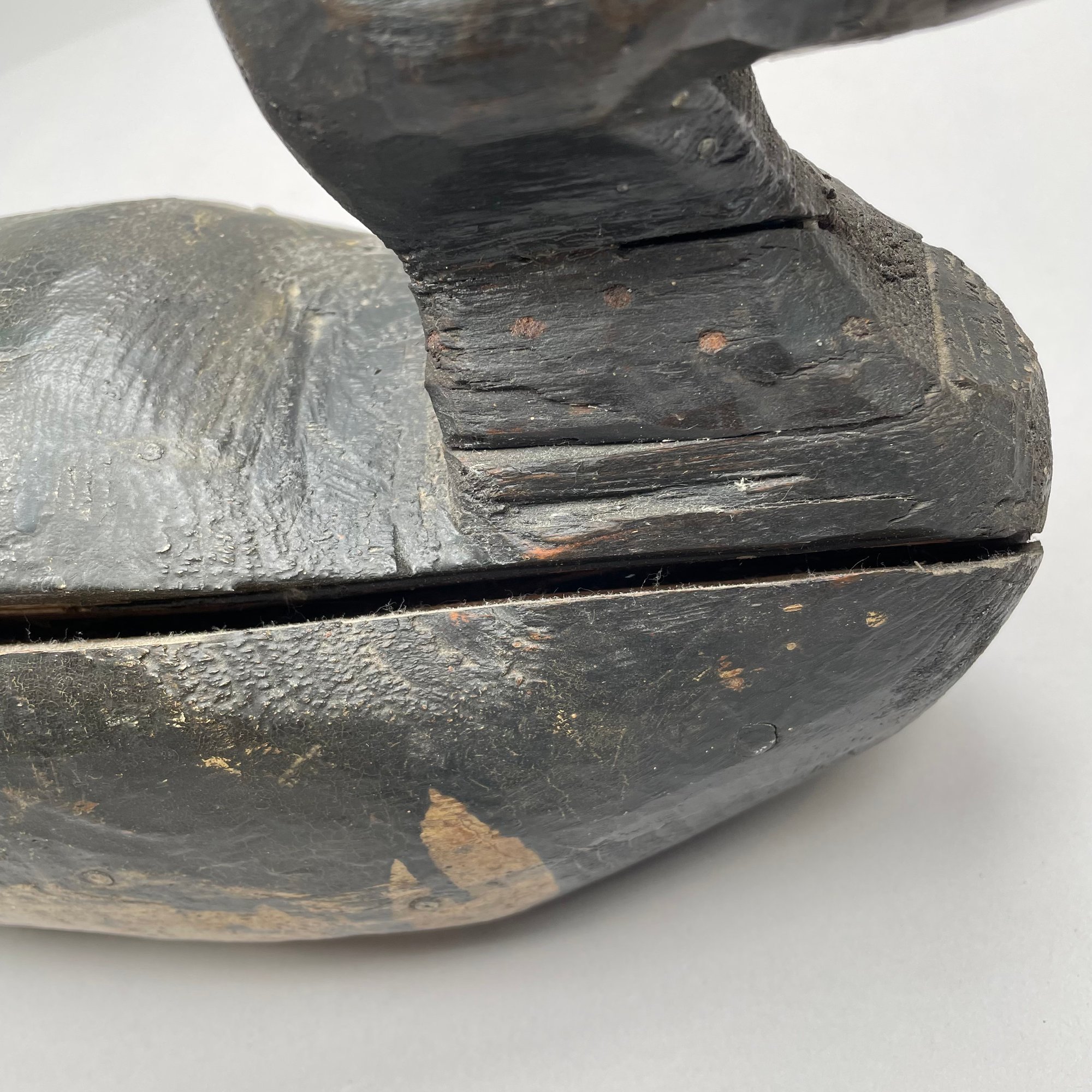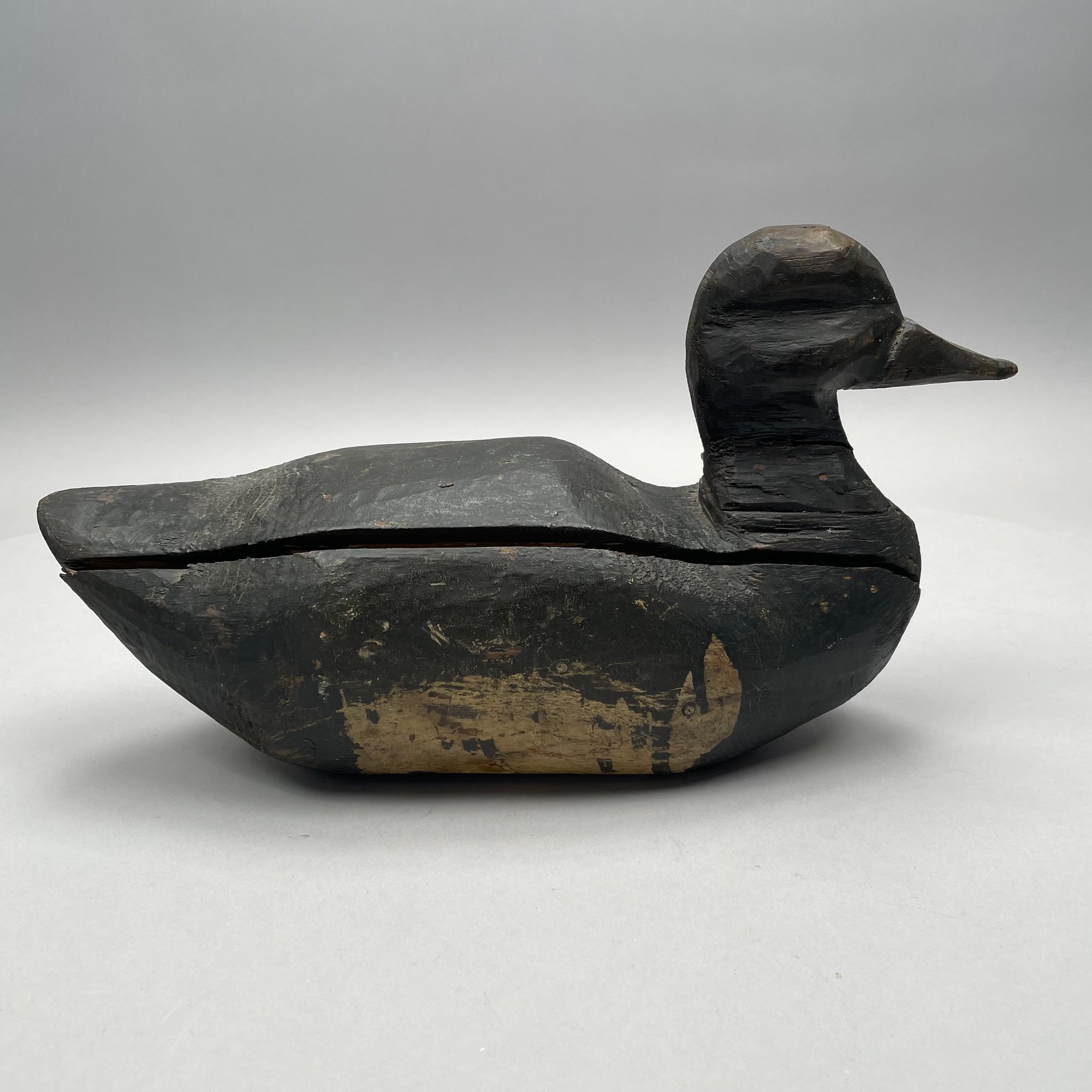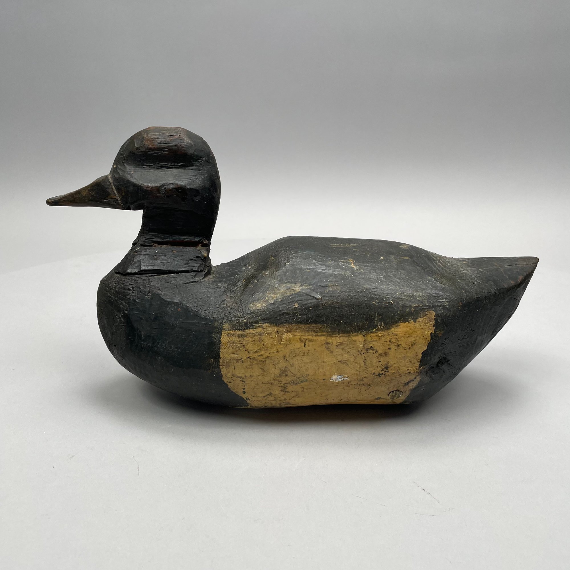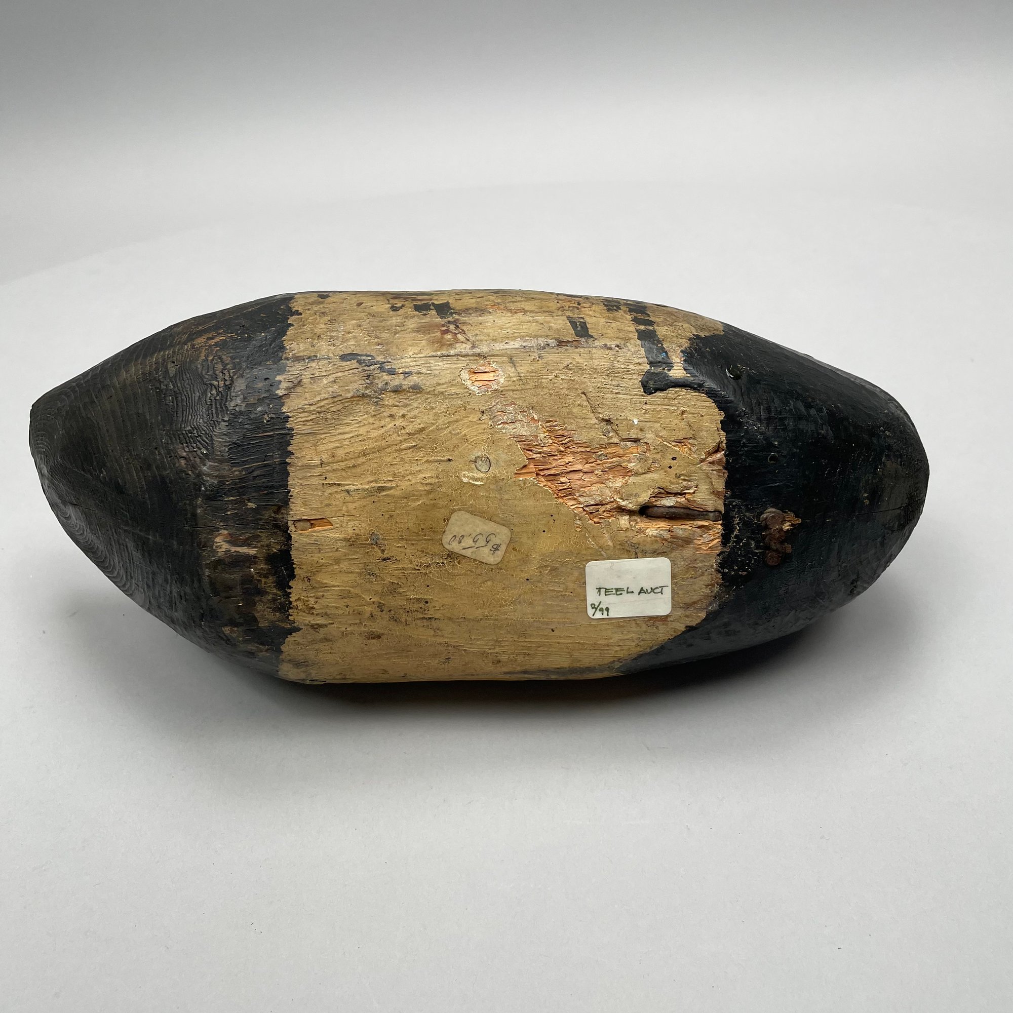 Five American Carved and Painted Duck Decoys. One with glass eyes and one with tack eyes, two purchased fom Teel Auctions, February 1999, and one Canvasback inscribed beneath "FOUND IN DUMP ON BAILEYS ISLAND - MAINE/ 1948," purchased "AAX," March 1999.