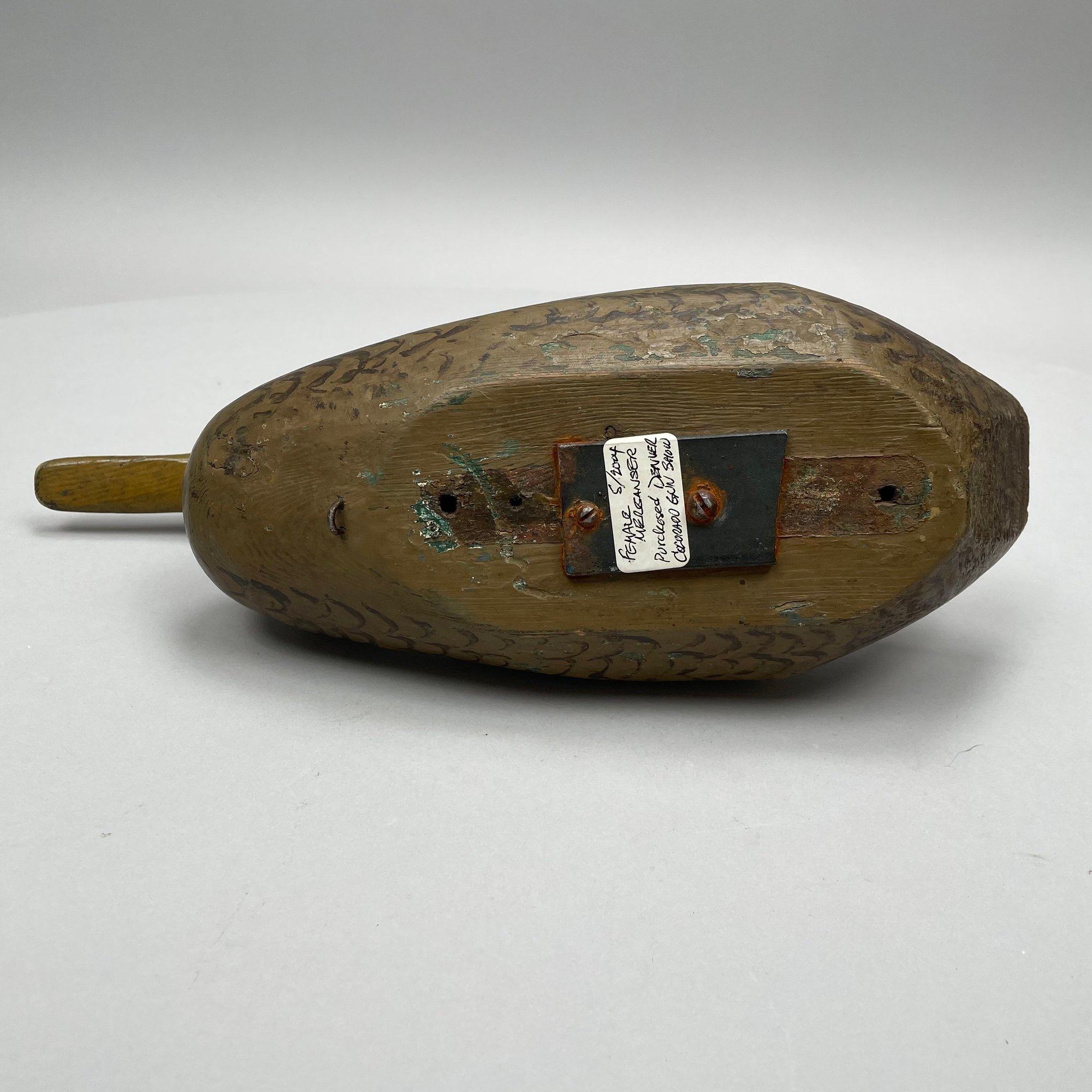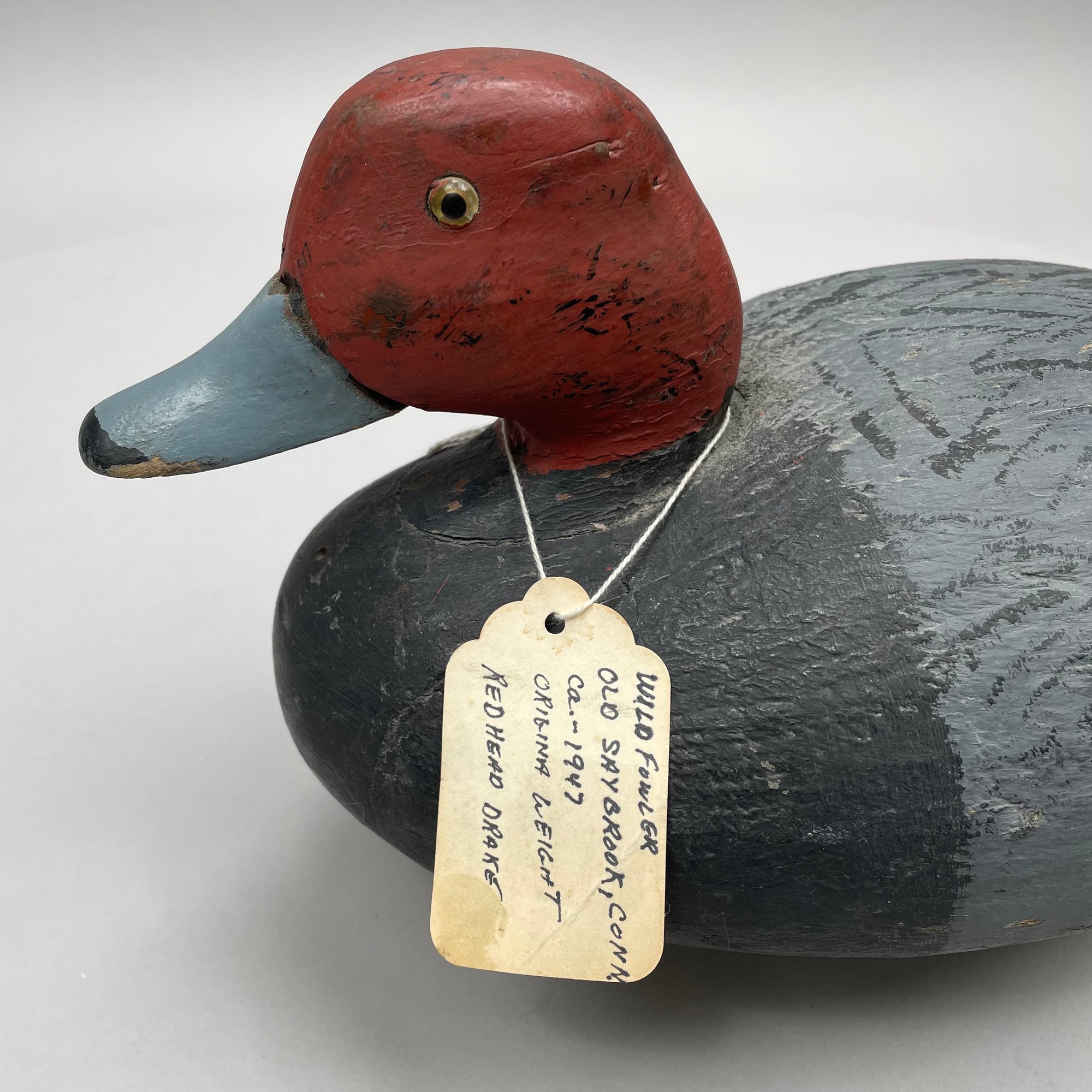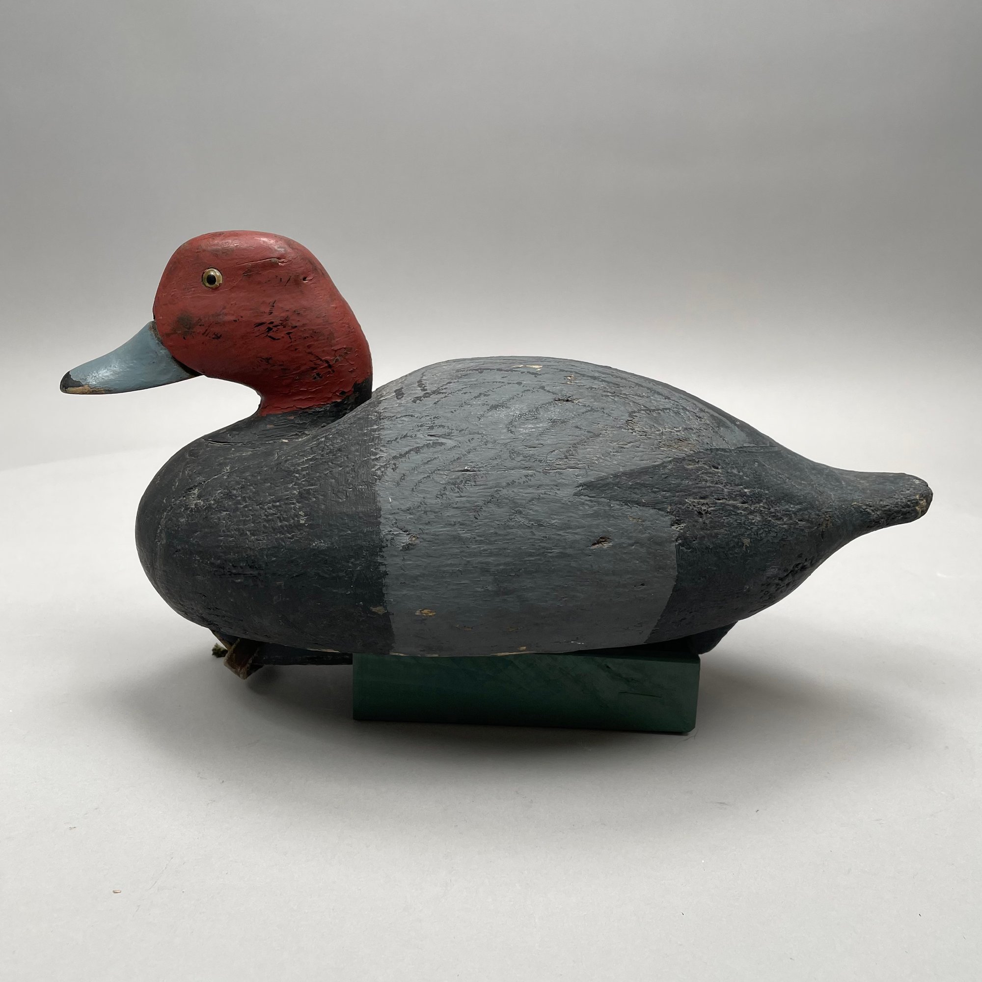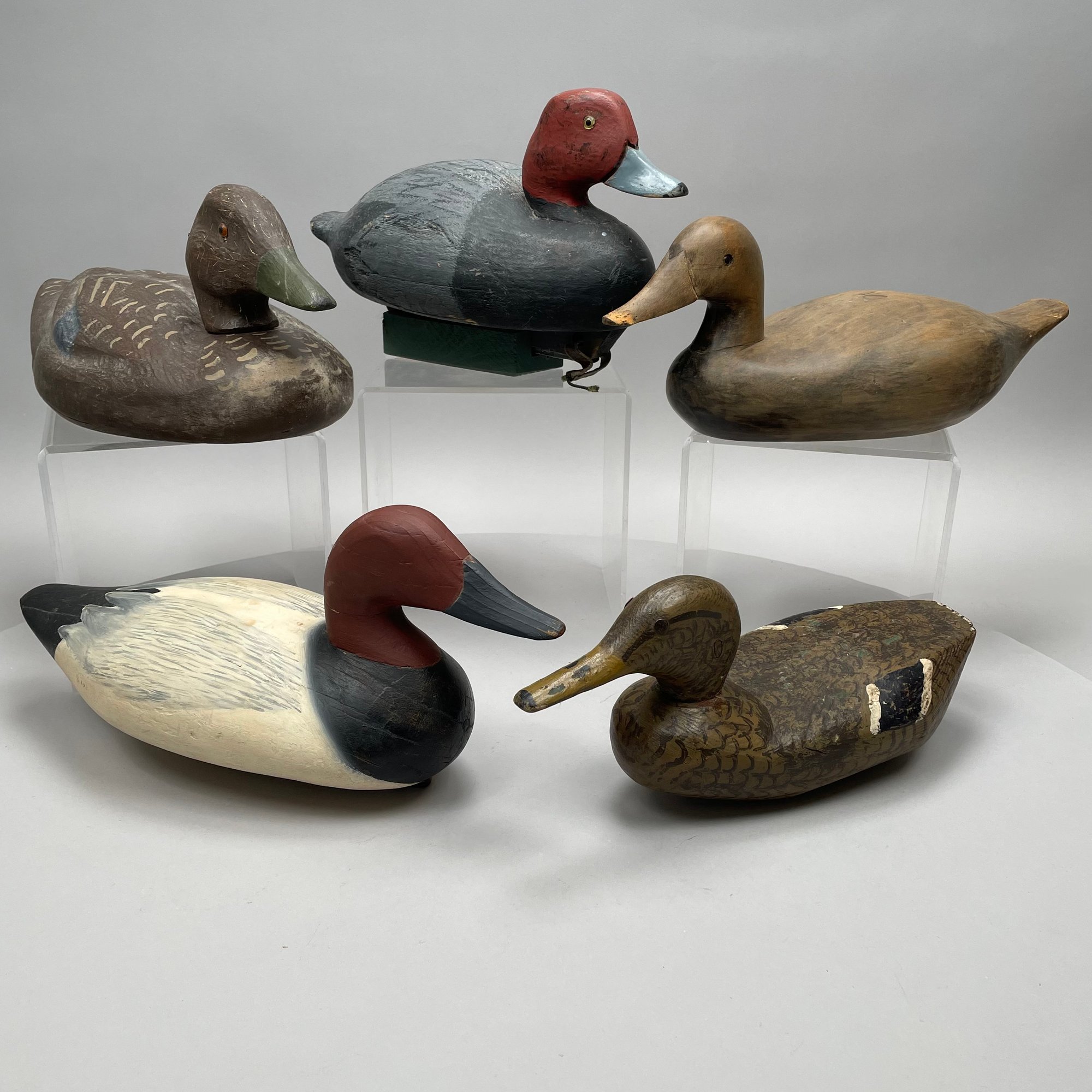 Five American Carved and Painted Duck Decoys. Three with glass eyes, including a female Merganser with tack eyes, purchased at the Denver, Colorado Gun Show; and a Redhead Drake, purchased at Wild Fowler, Old Saybrook, Connecticut, circa 1947.