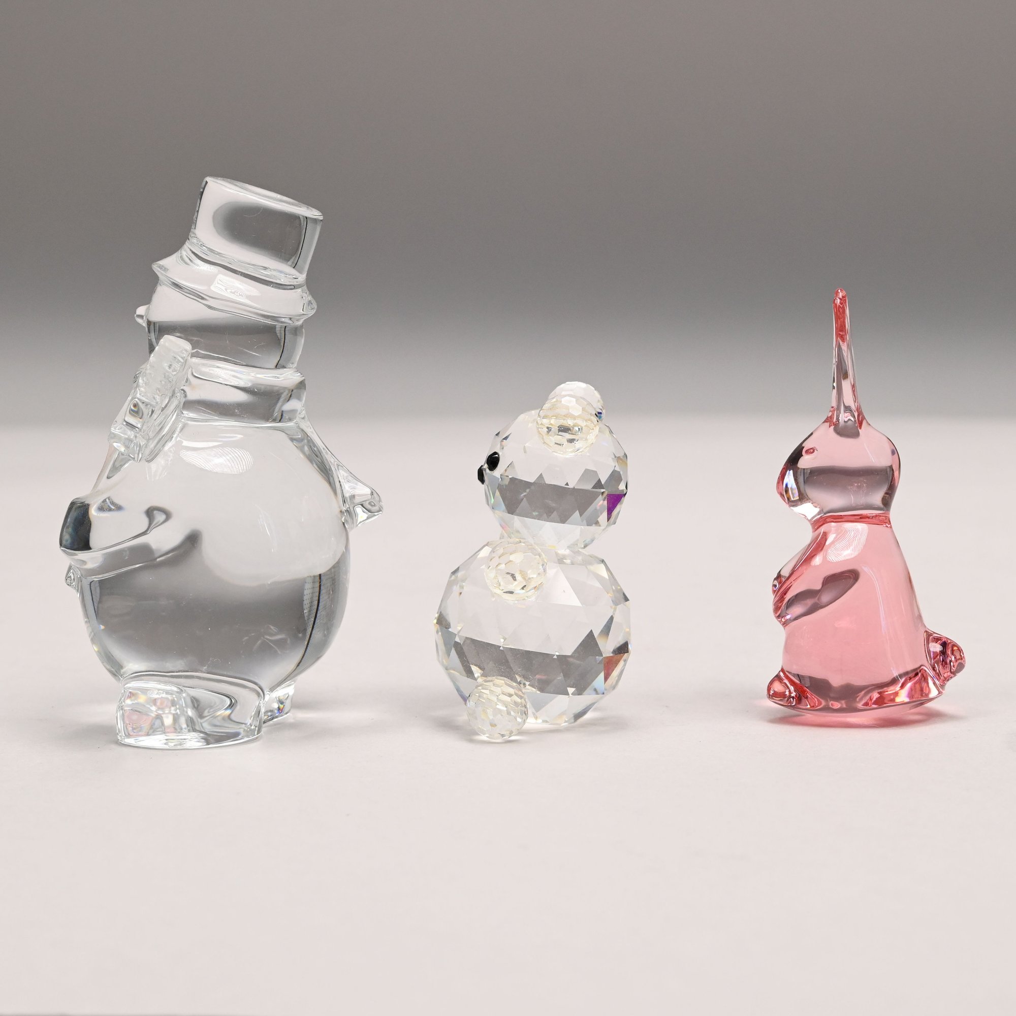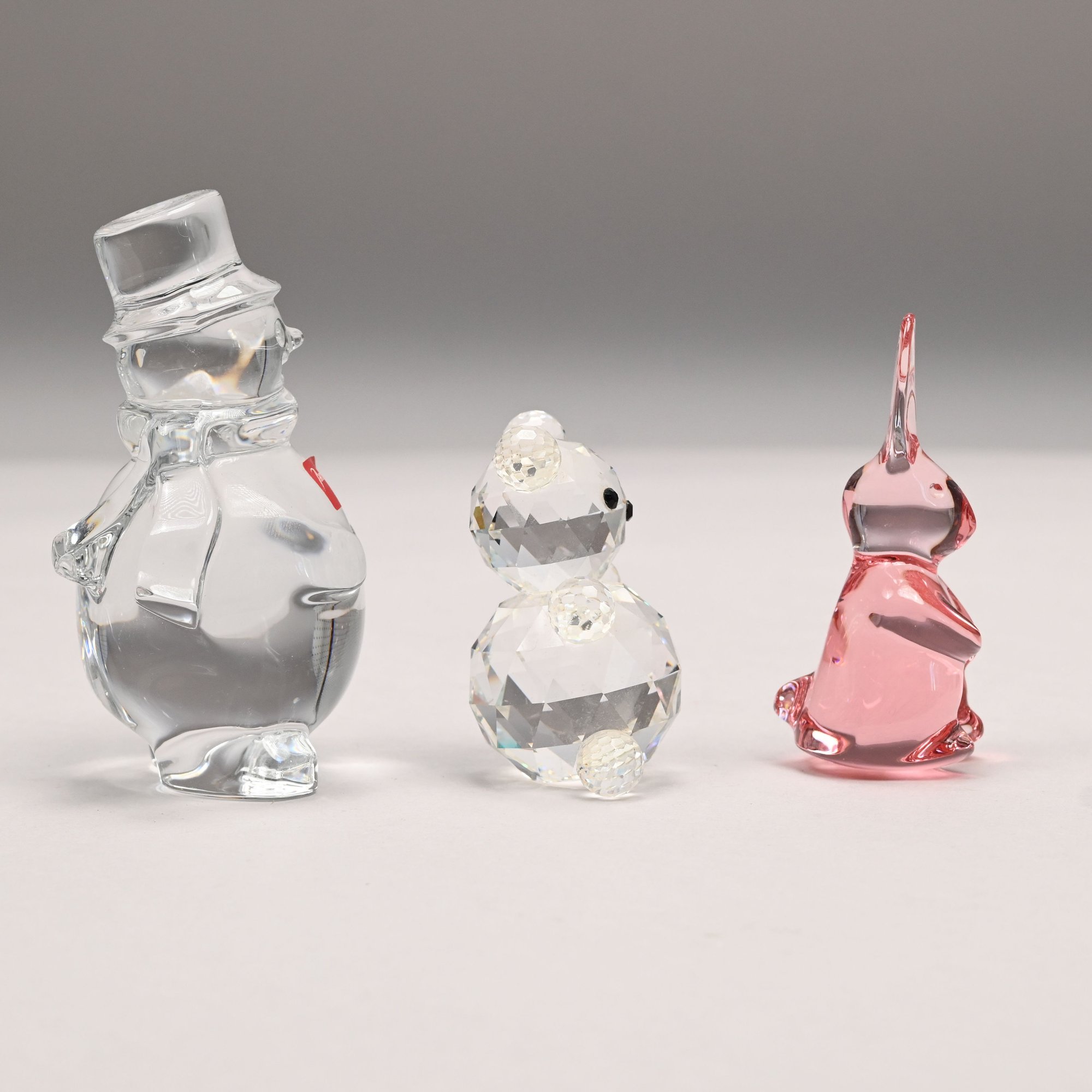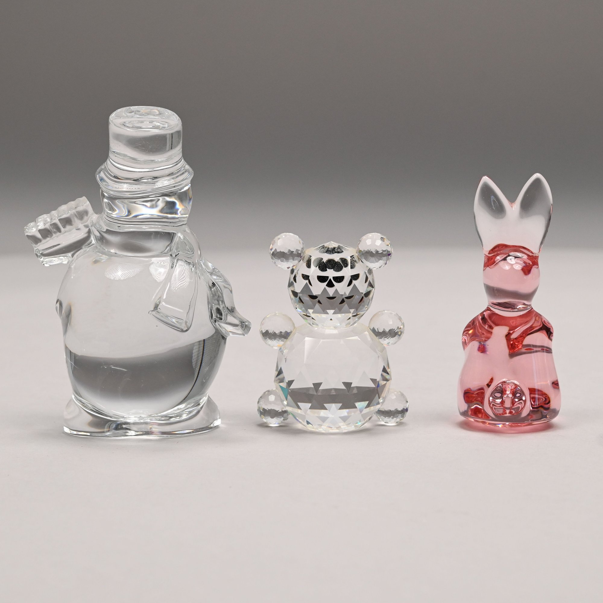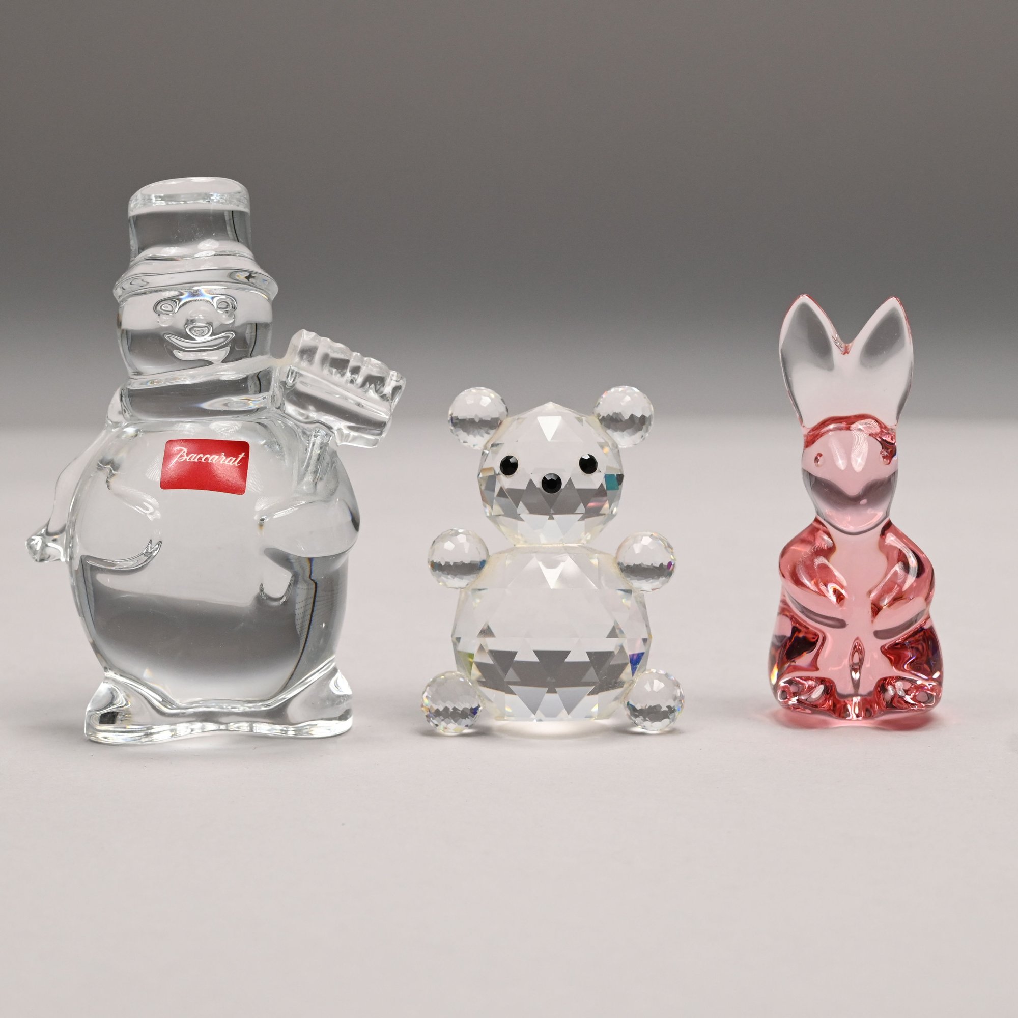 Five Baccarat Molded Colorless and Pink Glass Figures and a Faceted Colorless Glass Bear, 20th Century. The Baccarat figures comprising two parrots, a pink spinning bunny, a pale yellow fish and a noel snowman, each etched "BACCARAT FRANCE" centering a goblet, carafe and wine glass, the snowman also engraved "Baccarat" and affixed with a factory label; the sitting bear unmarked.