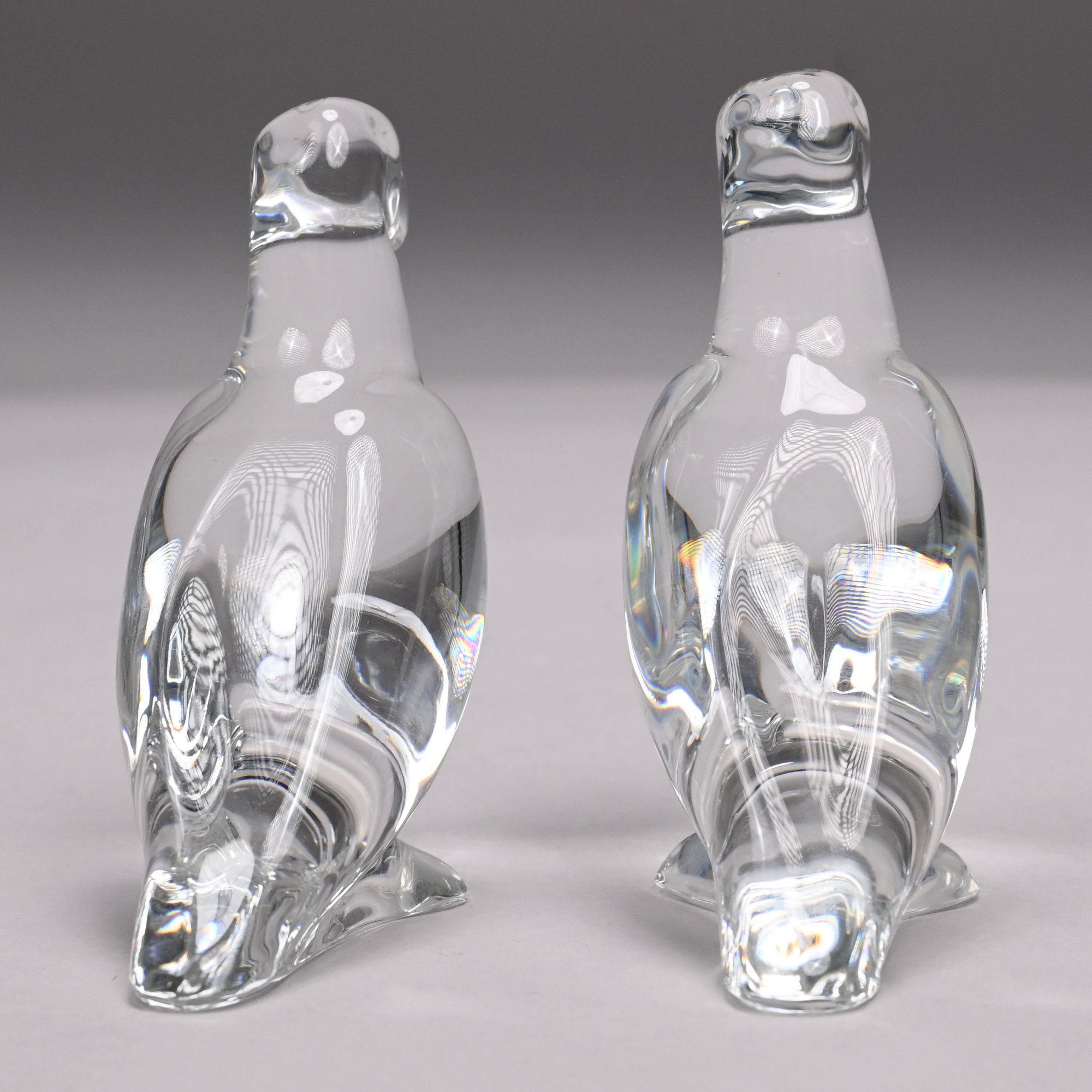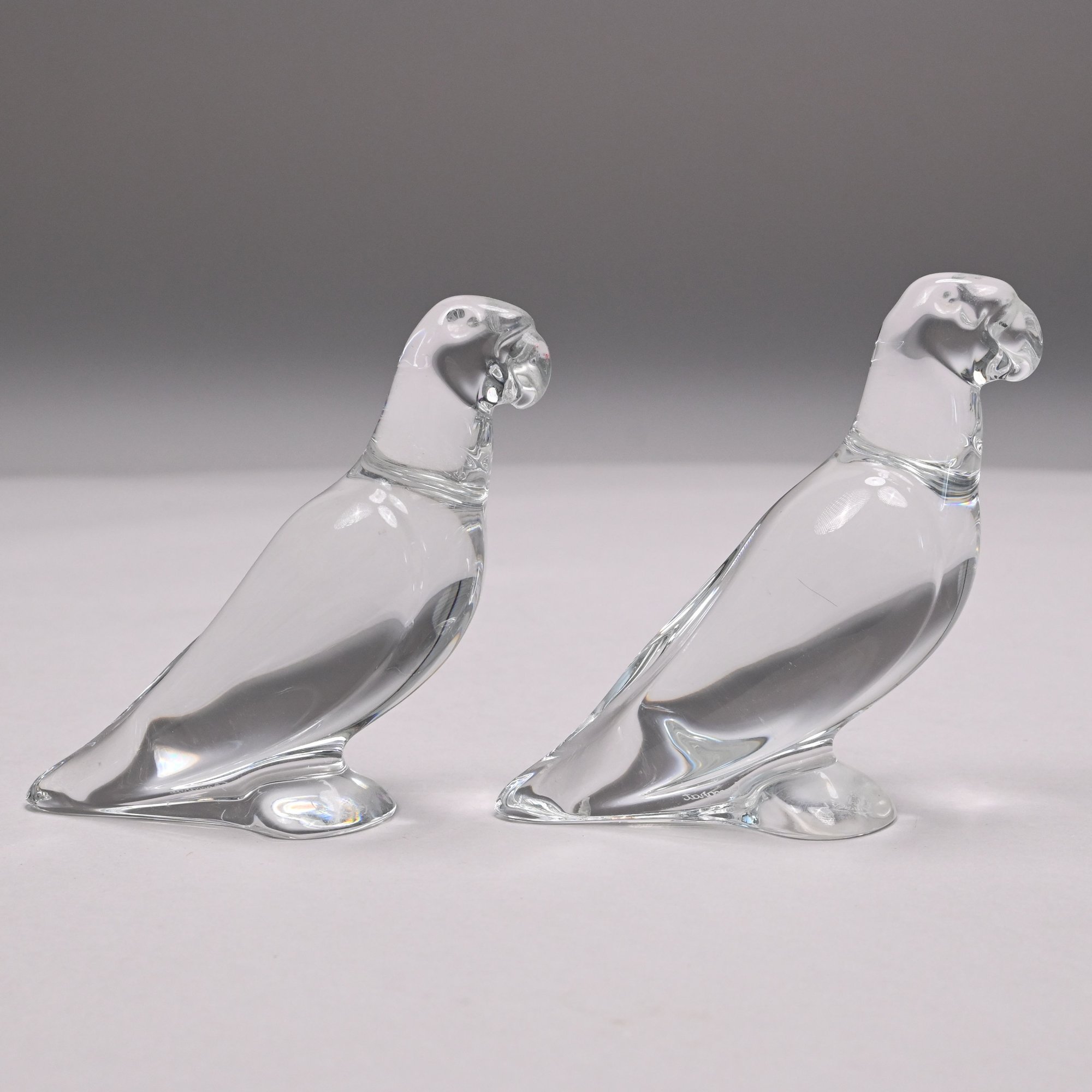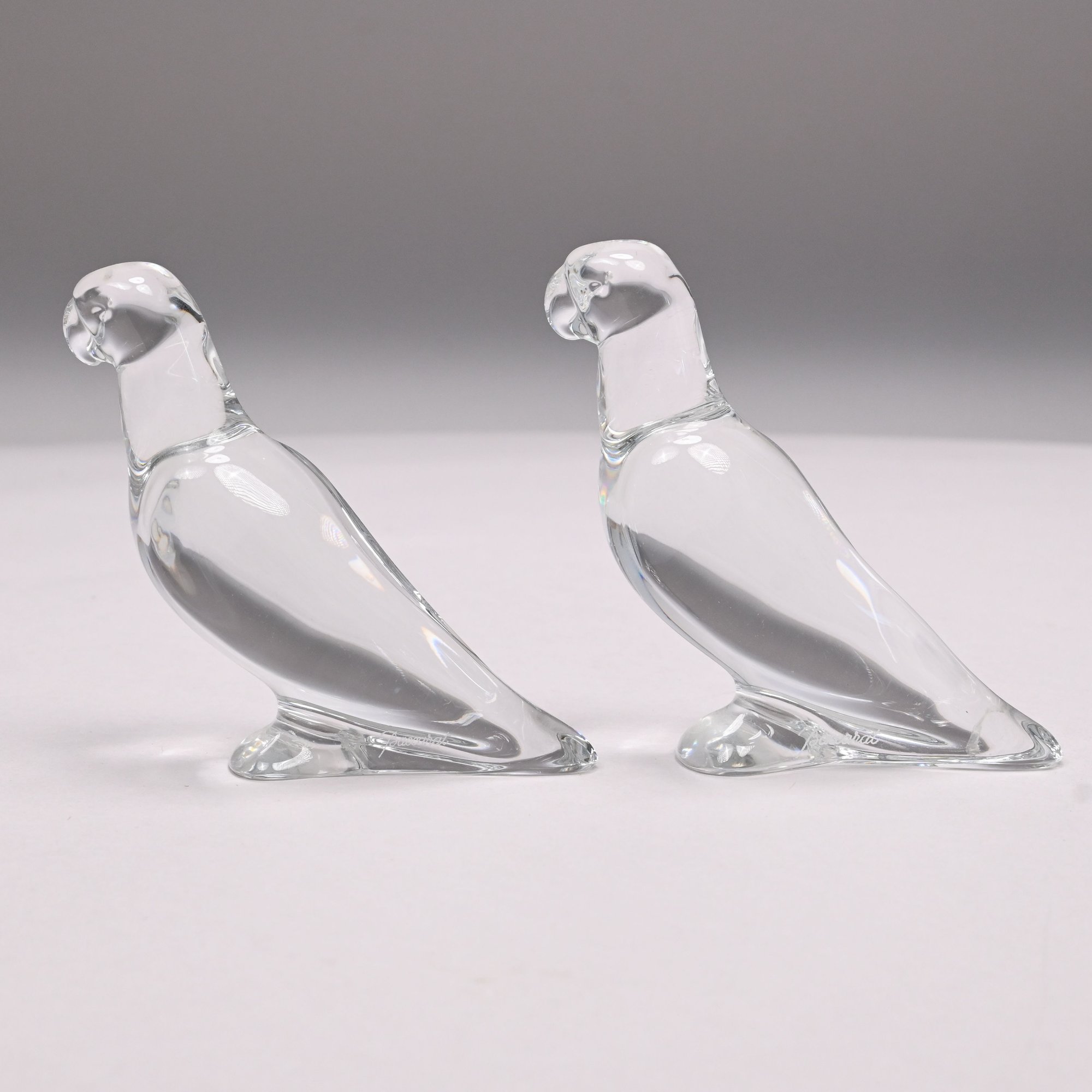 Five Baccarat Molded Colorless and Pink Glass Figures and a Faceted Colorless Glass Bear, 20th Century. The Baccarat figures comprising two parrots, a pink spinning bunny, a pale yellow fish and a noel snowman, each etched "BACCARAT FRANCE" centering a goblet, carafe and wine glass, the snowman also engraved "Baccarat" and affixed with a factory label; the sitting bear unmarked.
