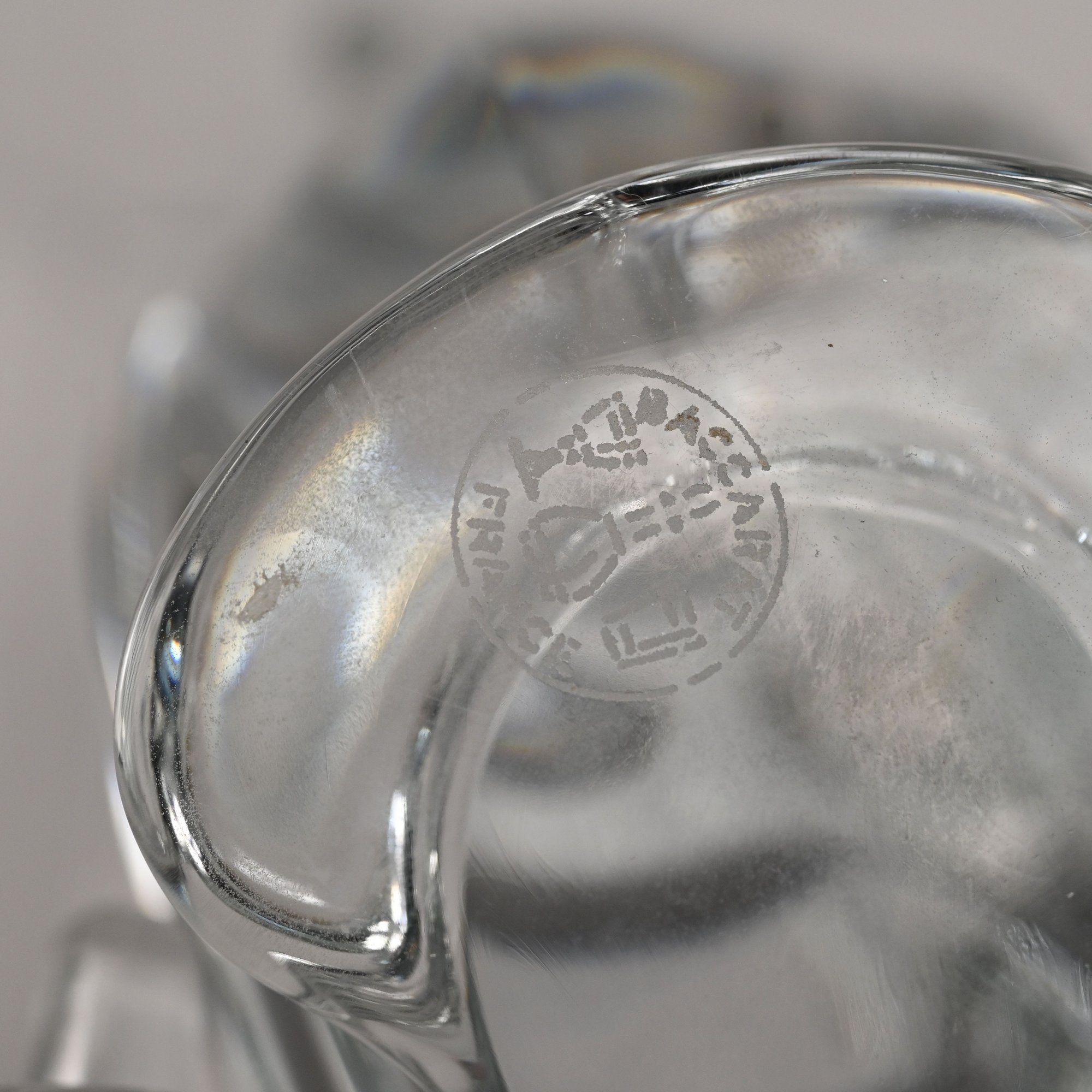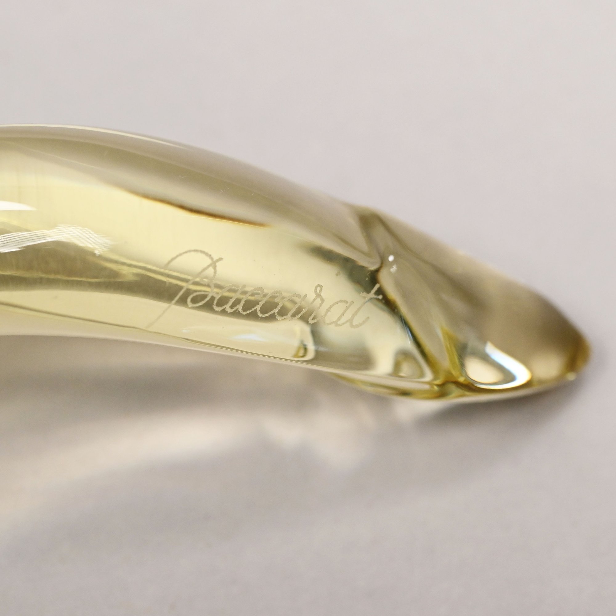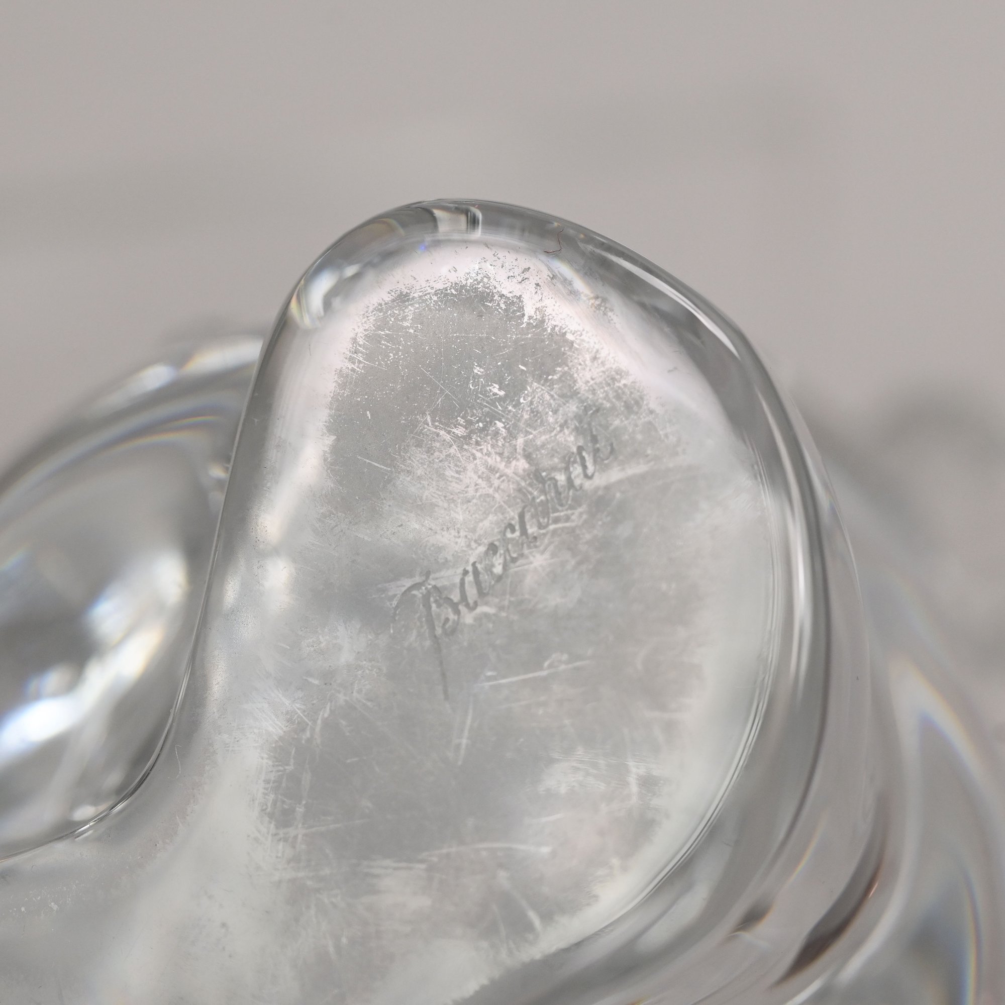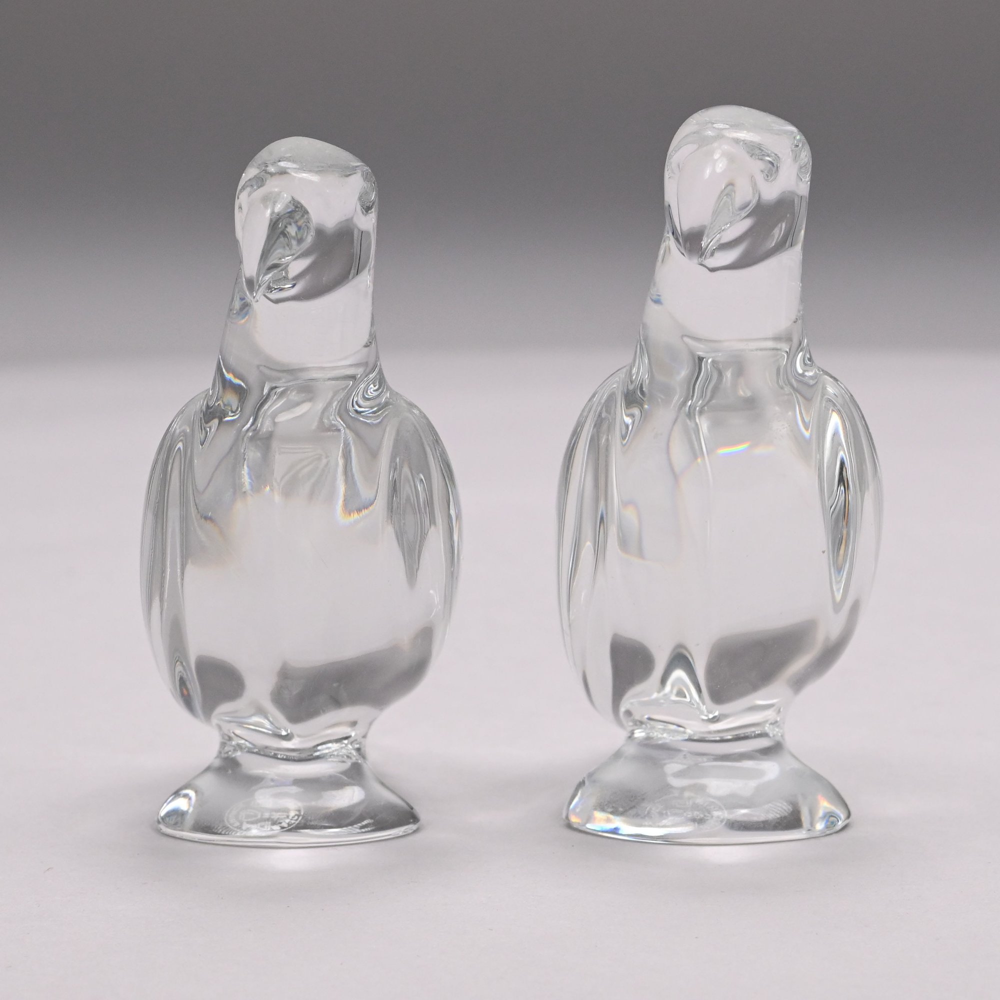 Five Baccarat Molded Colorless and Pink Glass Figures and a Faceted Colorless Glass Bear, 20th Century. The Baccarat figures comprising two parrots, a pink spinning bunny, a pale yellow fish and a noel snowman, each etched "BACCARAT FRANCE" centering a goblet, carafe and wine glass, the snowman also engraved "Baccarat" and affixed with a factory label; the sitting bear unmarked.
