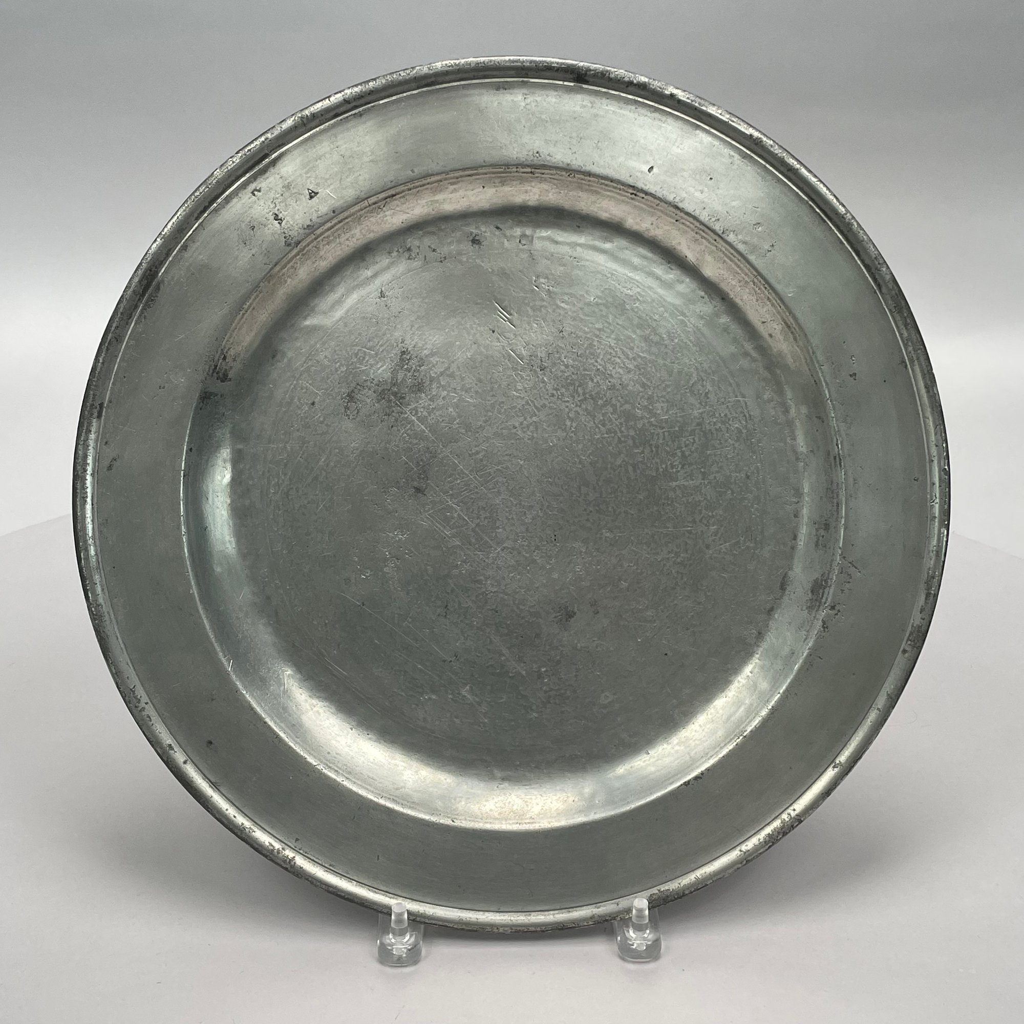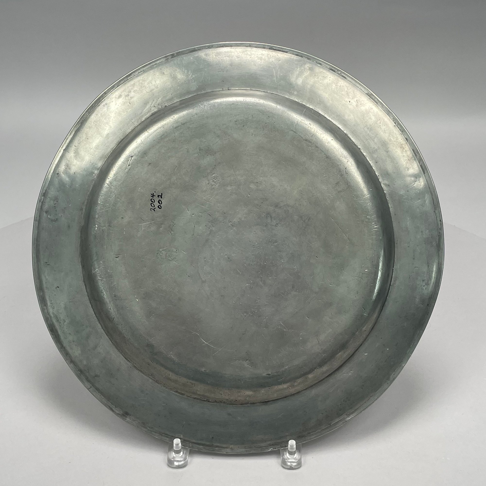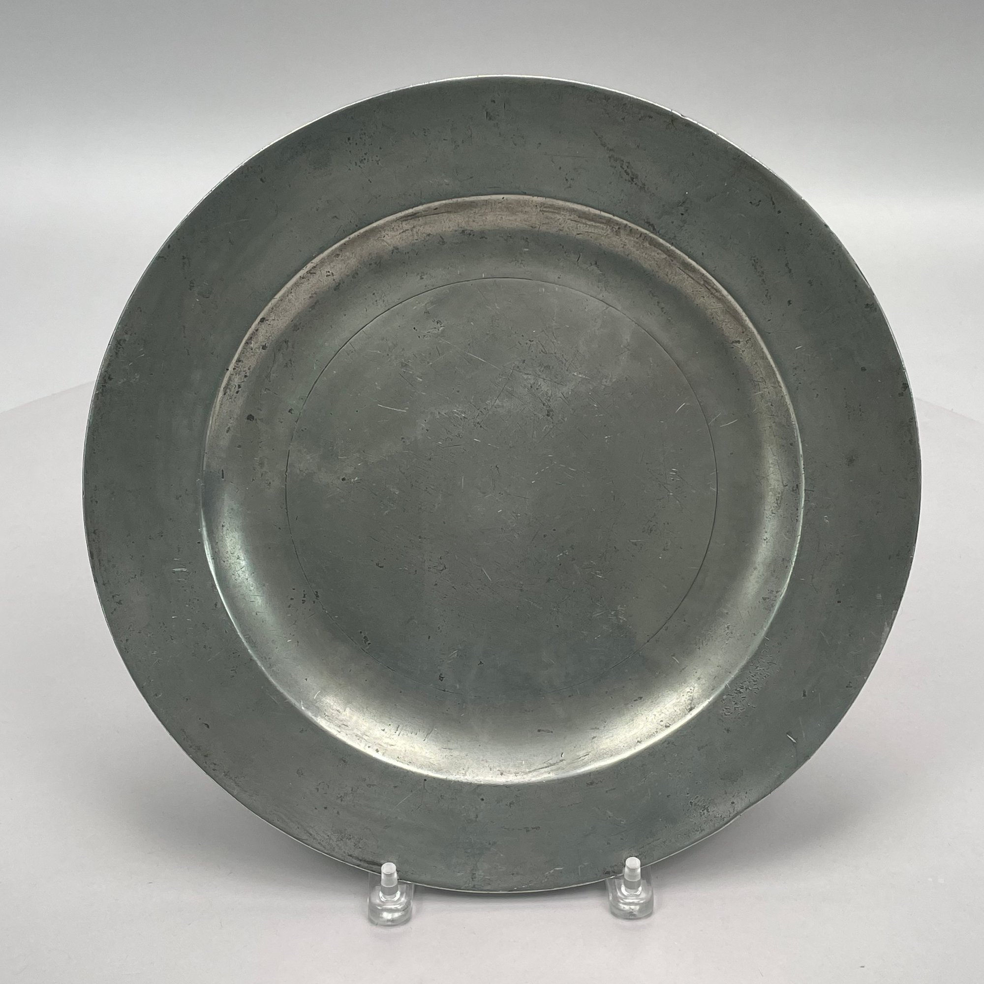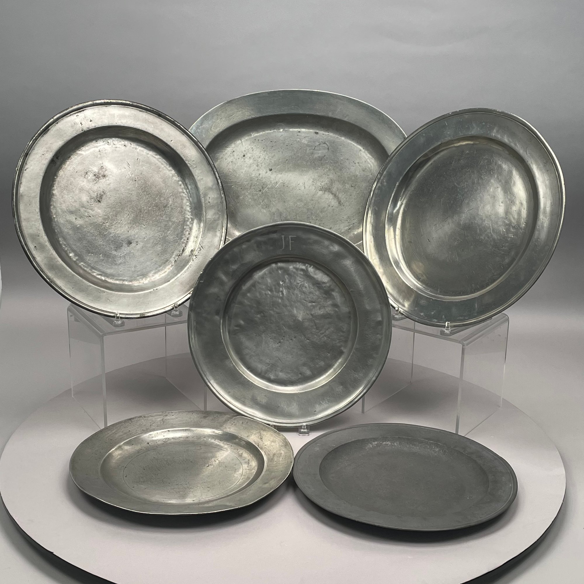 Five British Pewter Chargers and a Platter, Various Makers, Eighteenth and Nineteenth Century. Various touchmarks.
