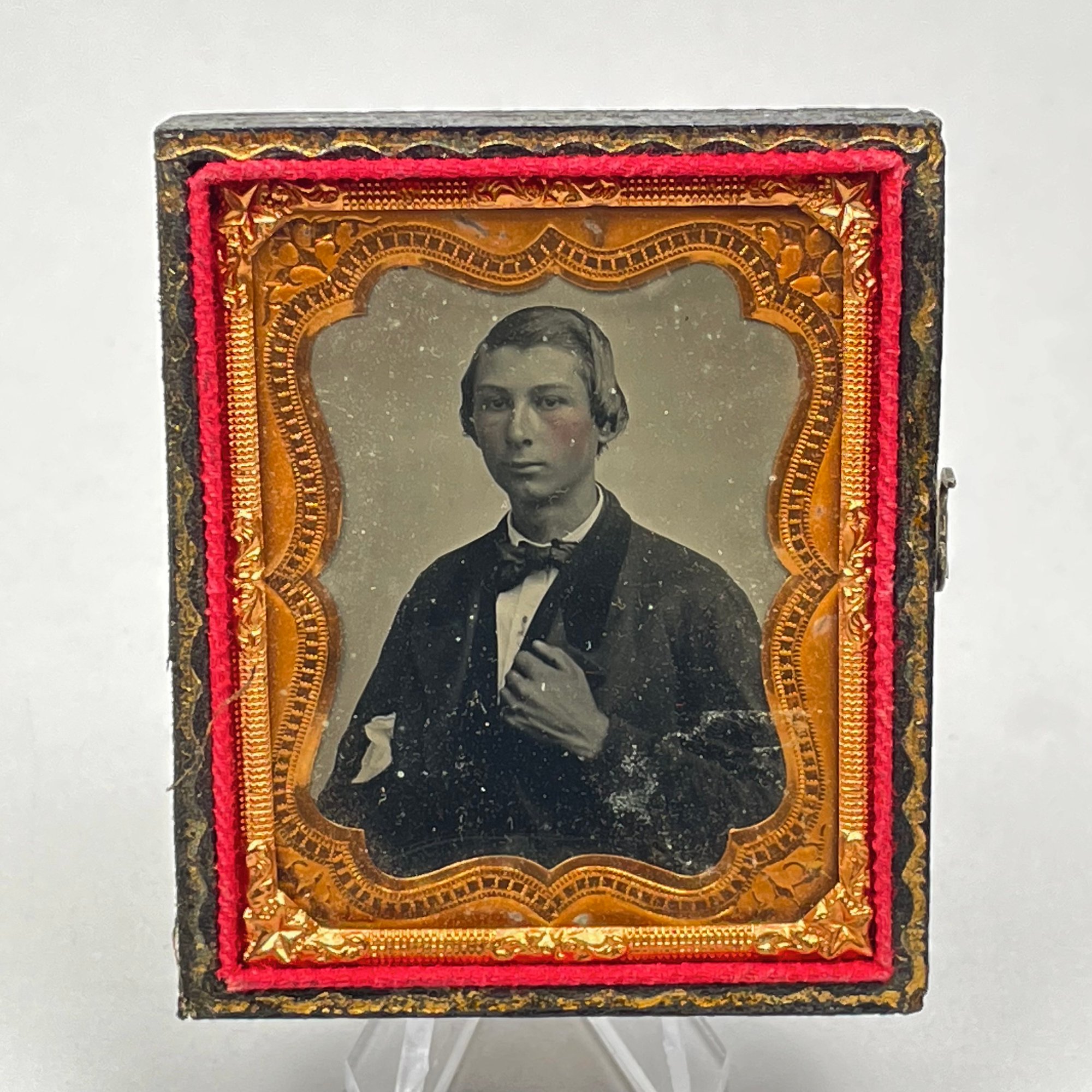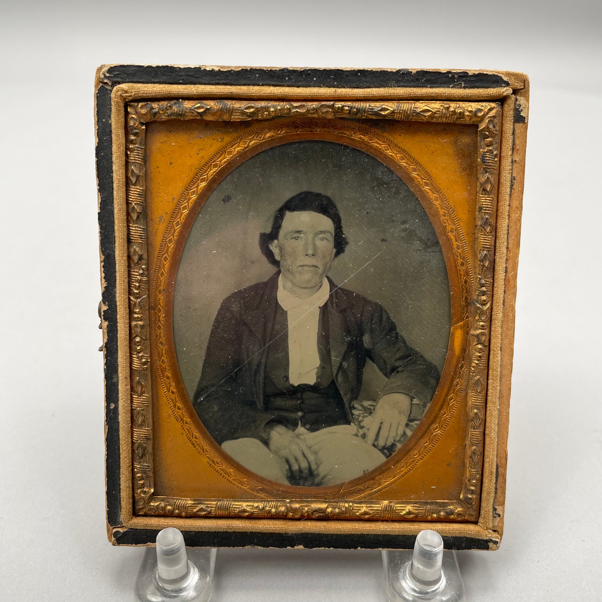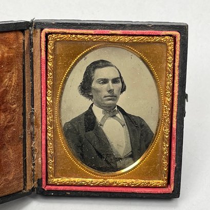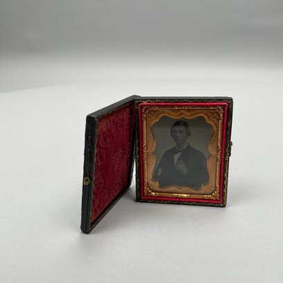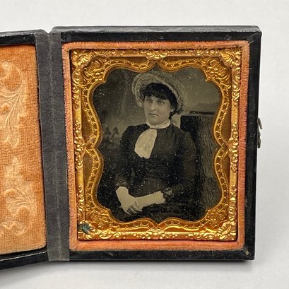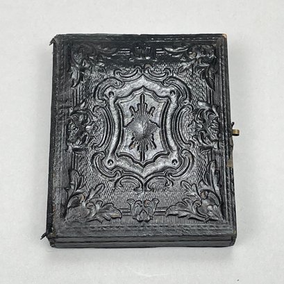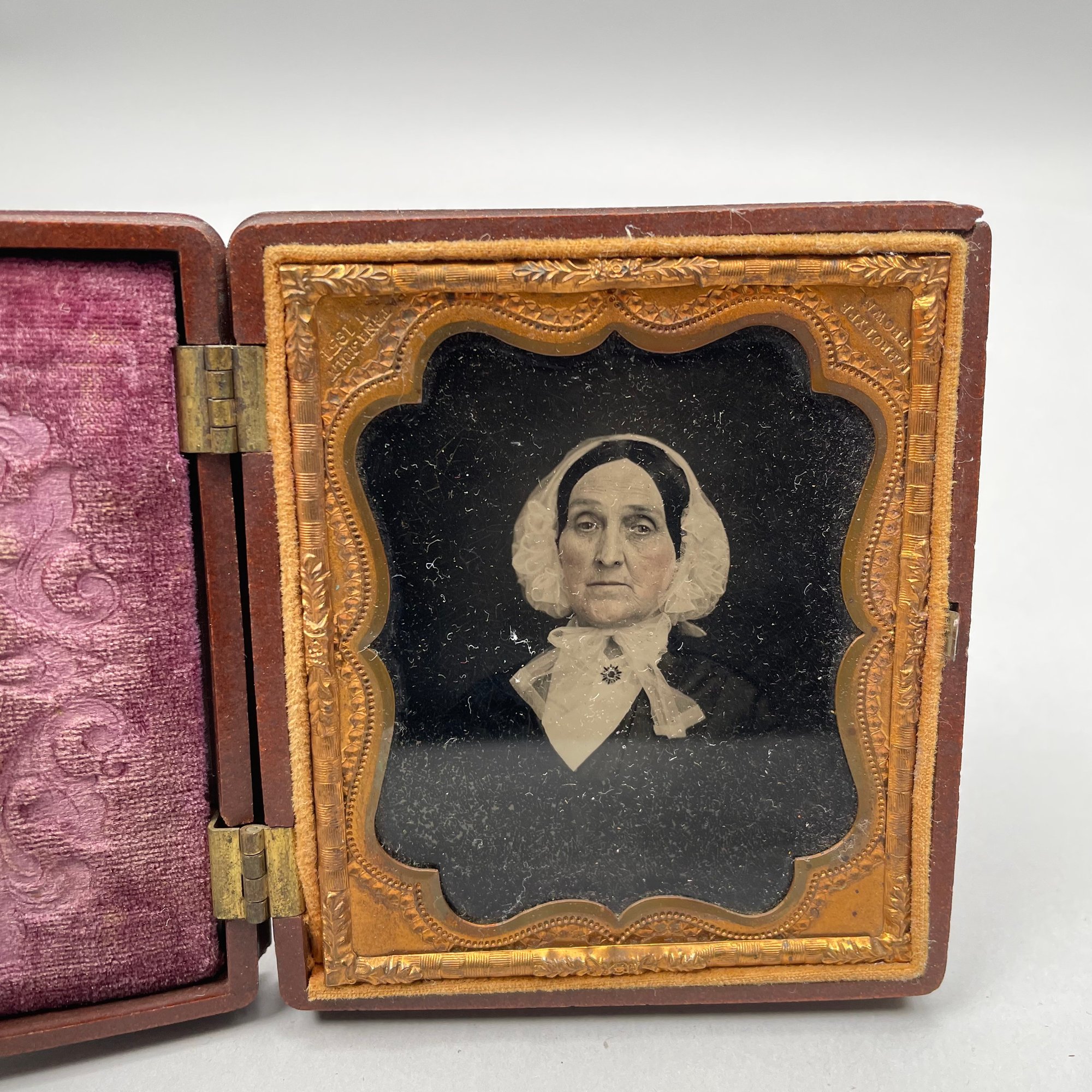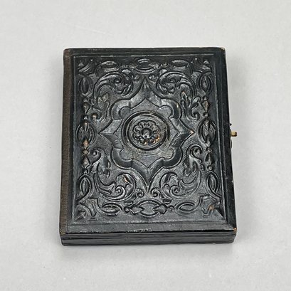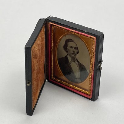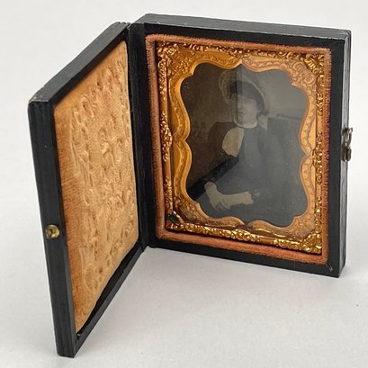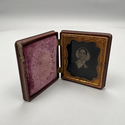 Five Cased Photographs, Nineteenth Century. Three each in an embossed leather case, the largest photograph of an elderly woman, housed in a brown Union or thermoplastic case; one in the remnants of a case.