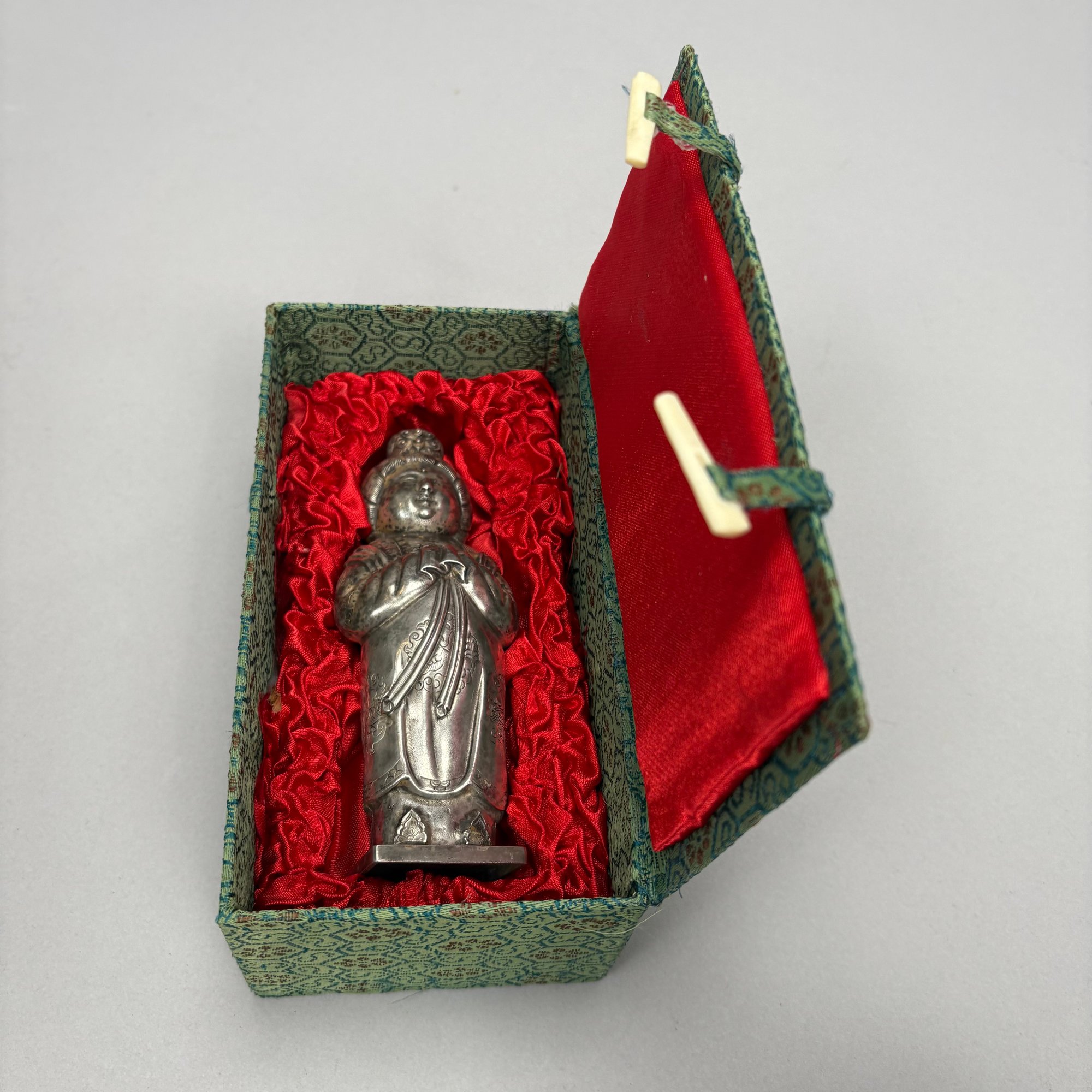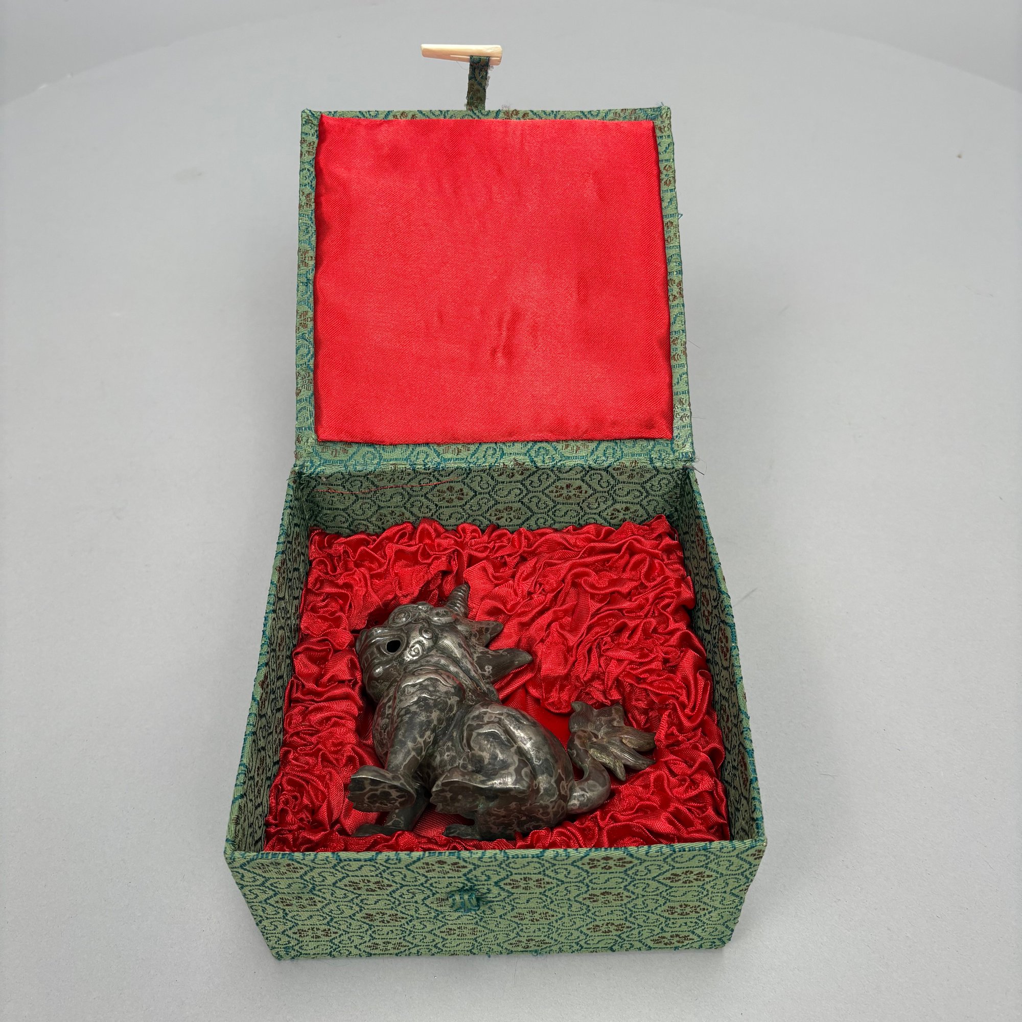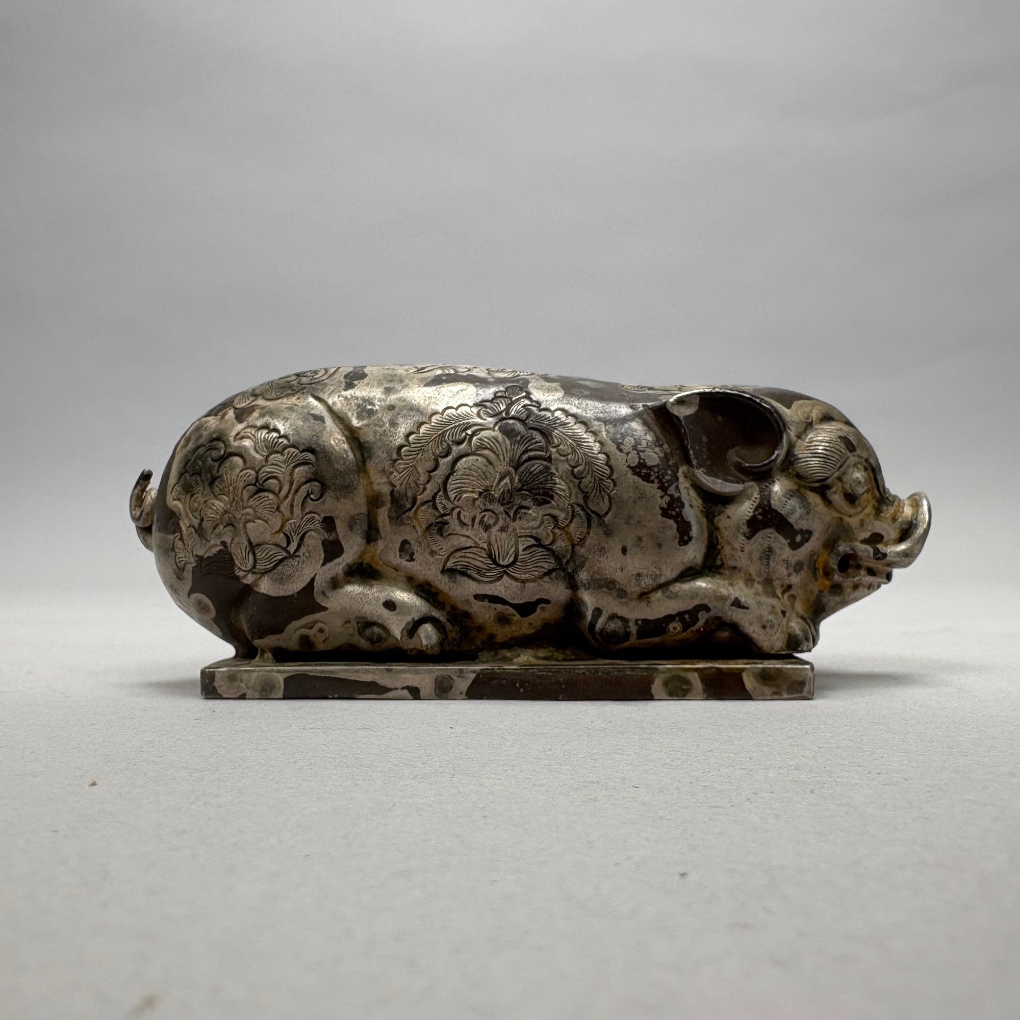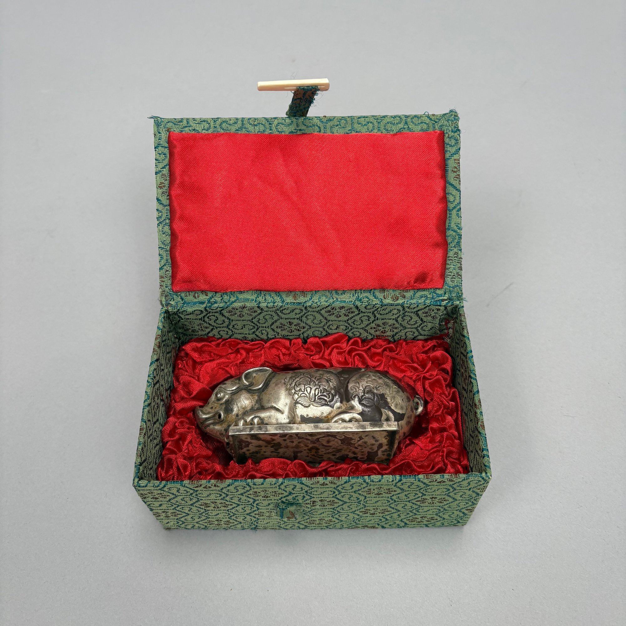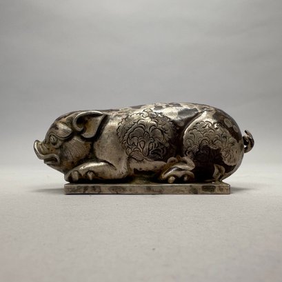 Five Chinese Silver Figures, Each with Fitted Box. Comprising a pig, water buffalo, Kylin, a figure wearing a Daoist topknot and a Daoist priest.