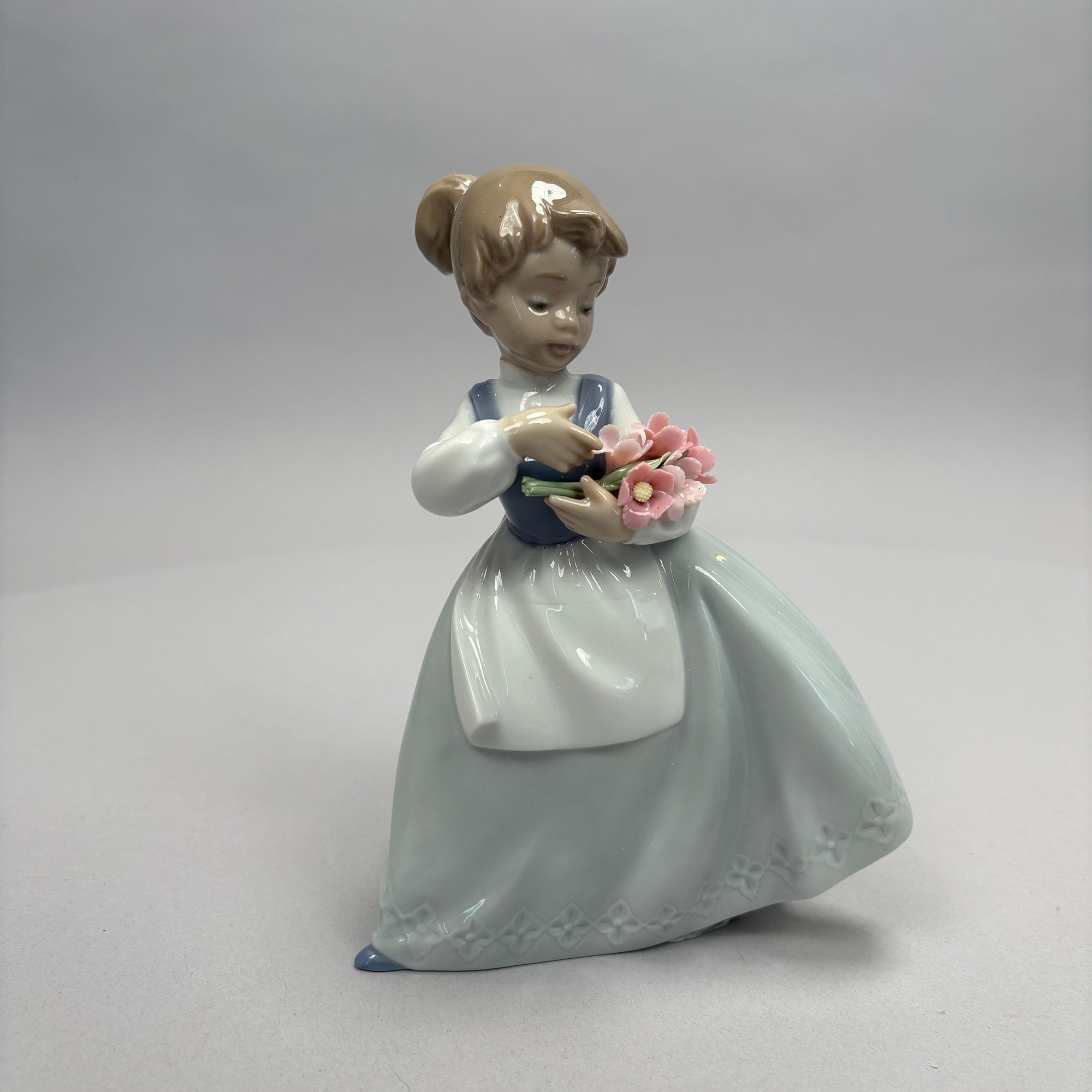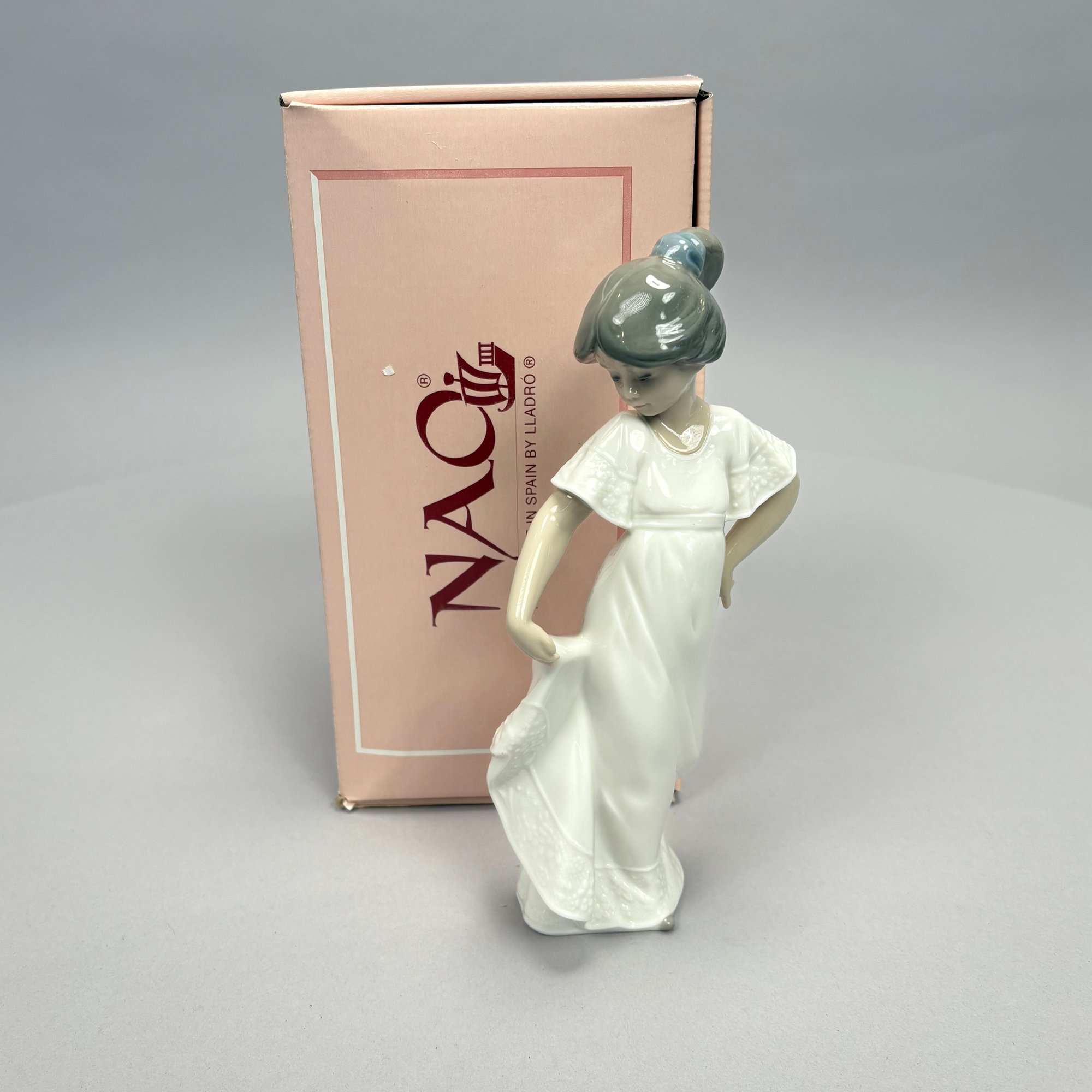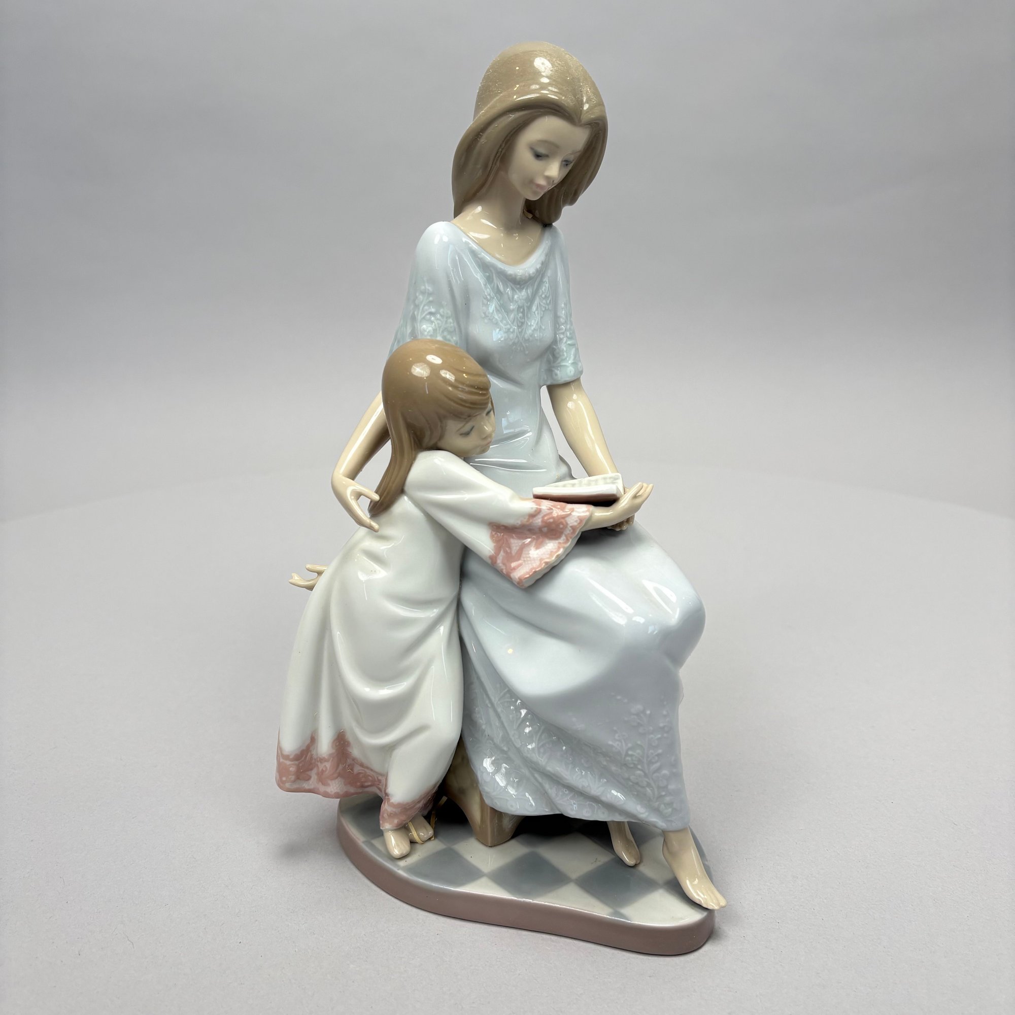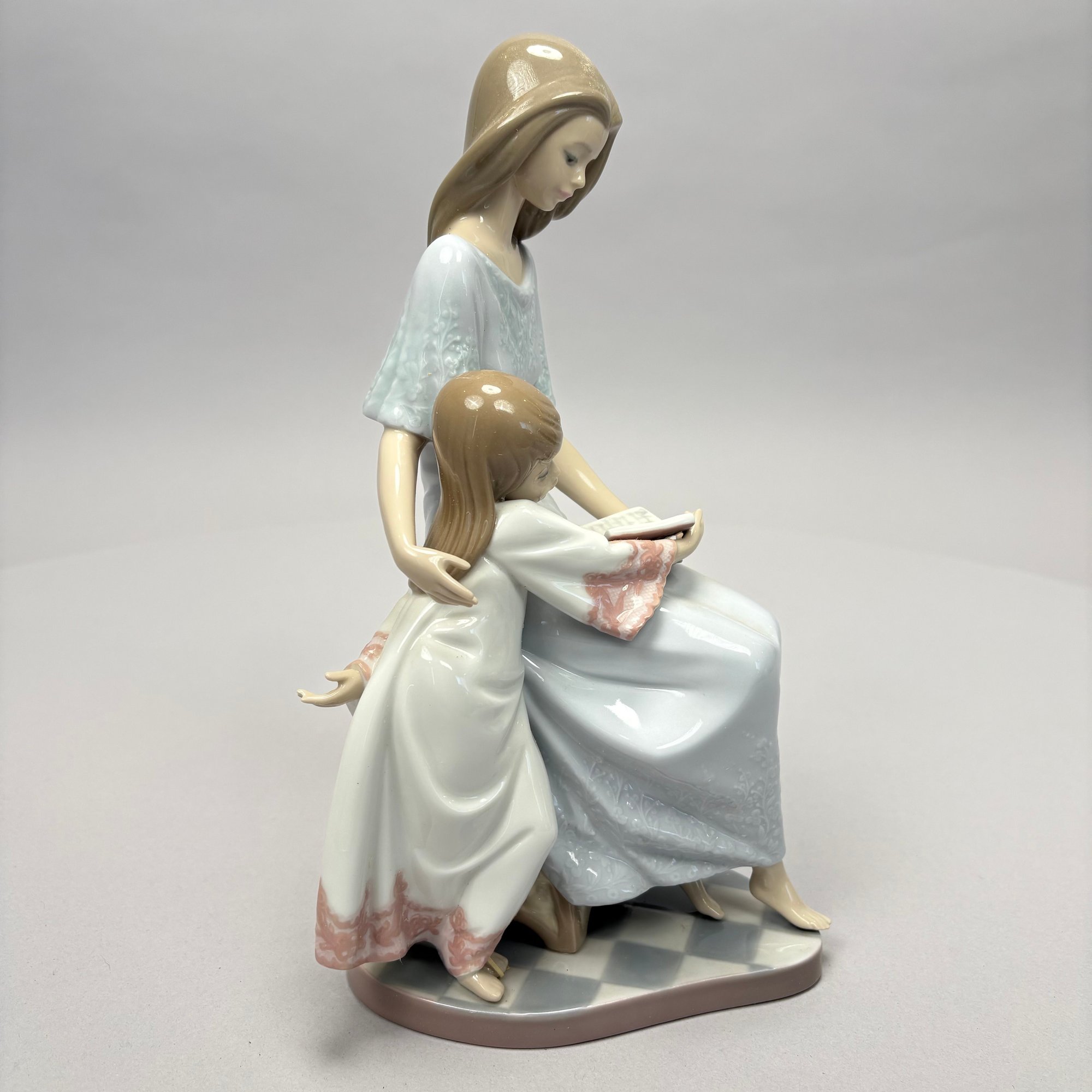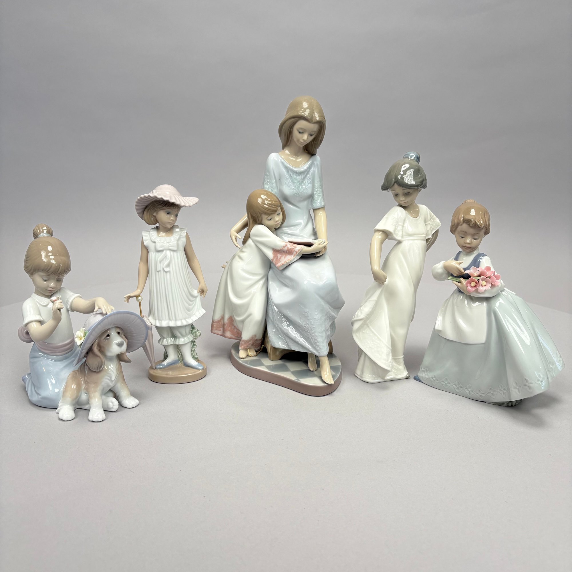 Comprising a Lladro #5457 "Bedtime Story" figure, a Lladro #010.06862 "An Elegant Touch" figure, a Nao by Lladro #495 "Senorita Campestre Ramo", a Nao by Lladro #1110 "Camison con Vuelo" figure, and a Nao by Lladro #1126 "Nina con Paraguas" figure; each housed in the original box.