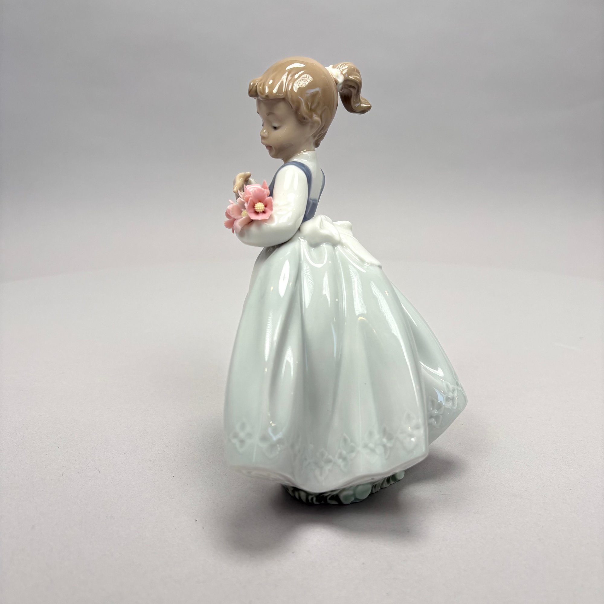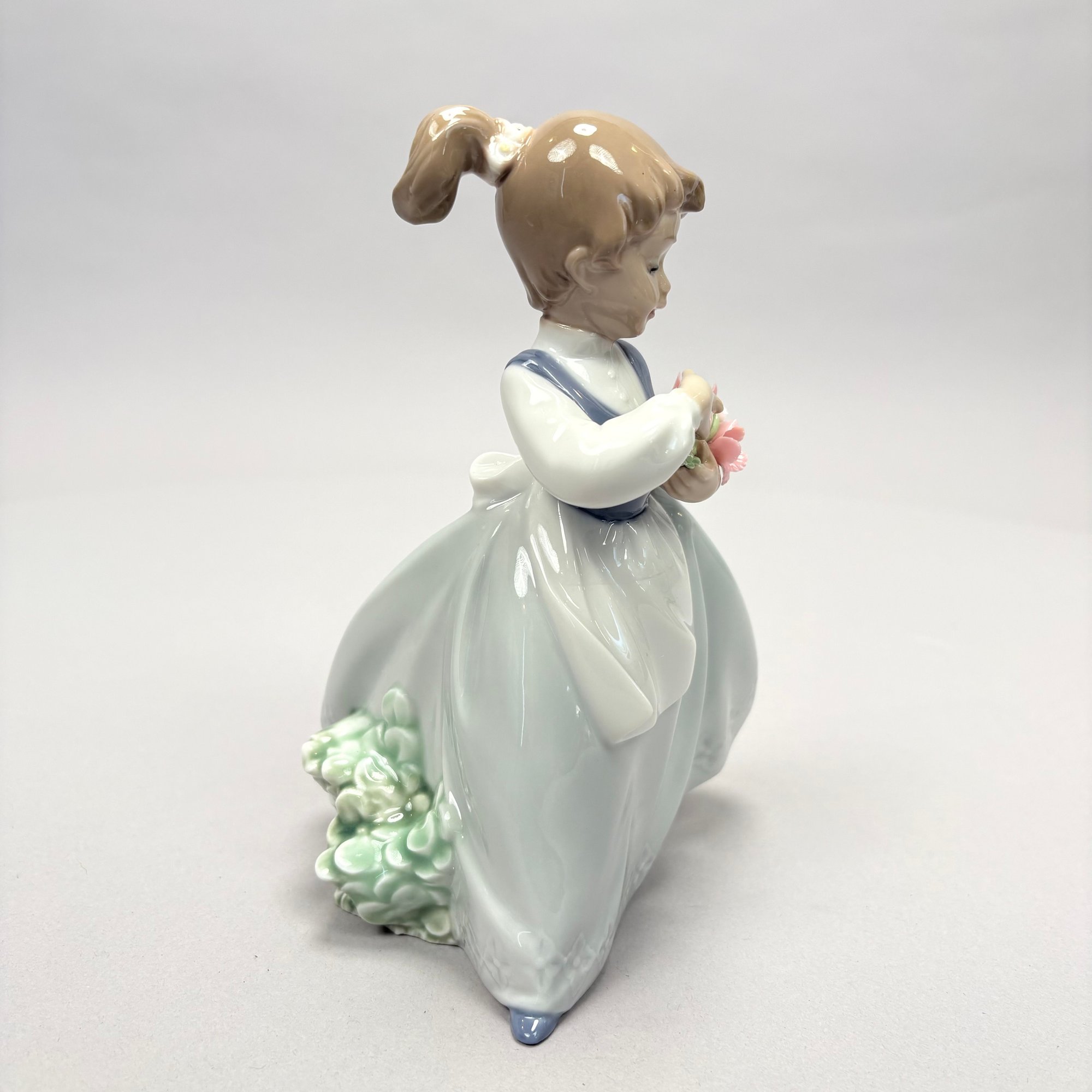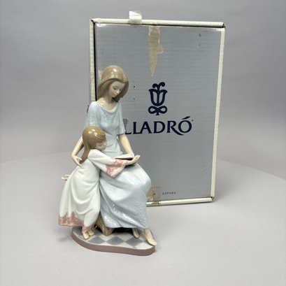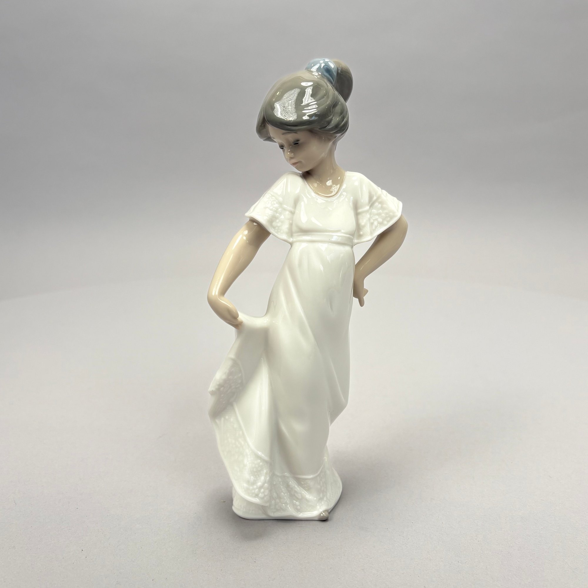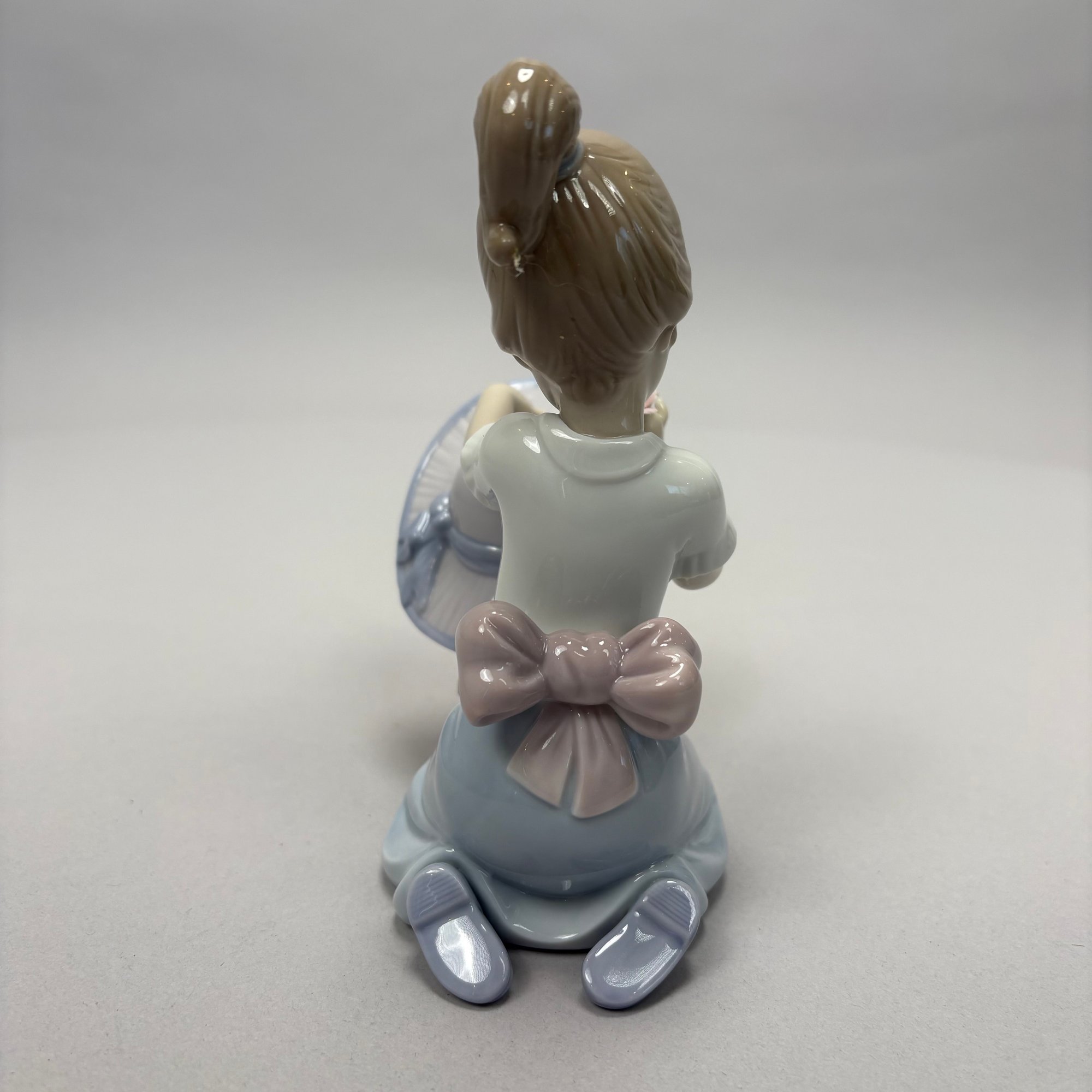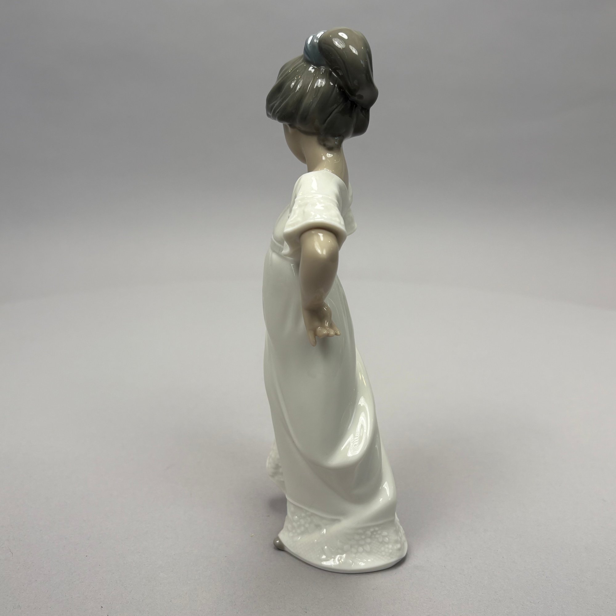 Comprising a Lladro #5457 "Bedtime Story" figure, a Lladro #010.06862 "An Elegant Touch" figure, a Nao by Lladro #495 "Senorita Campestre Ramo", a Nao by Lladro #1110 "Camison con Vuelo" figure, and a Nao by Lladro #1126 "Nina con Paraguas" figure; each housed in the original box.