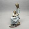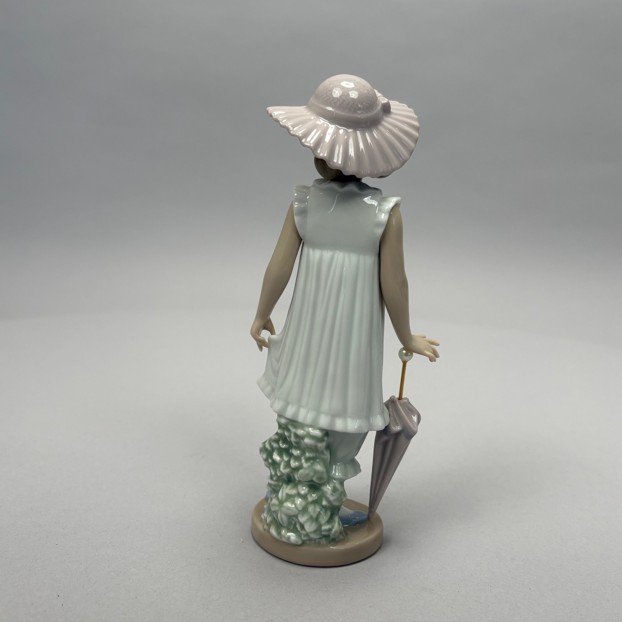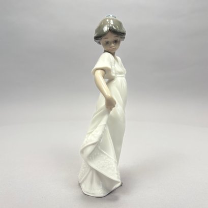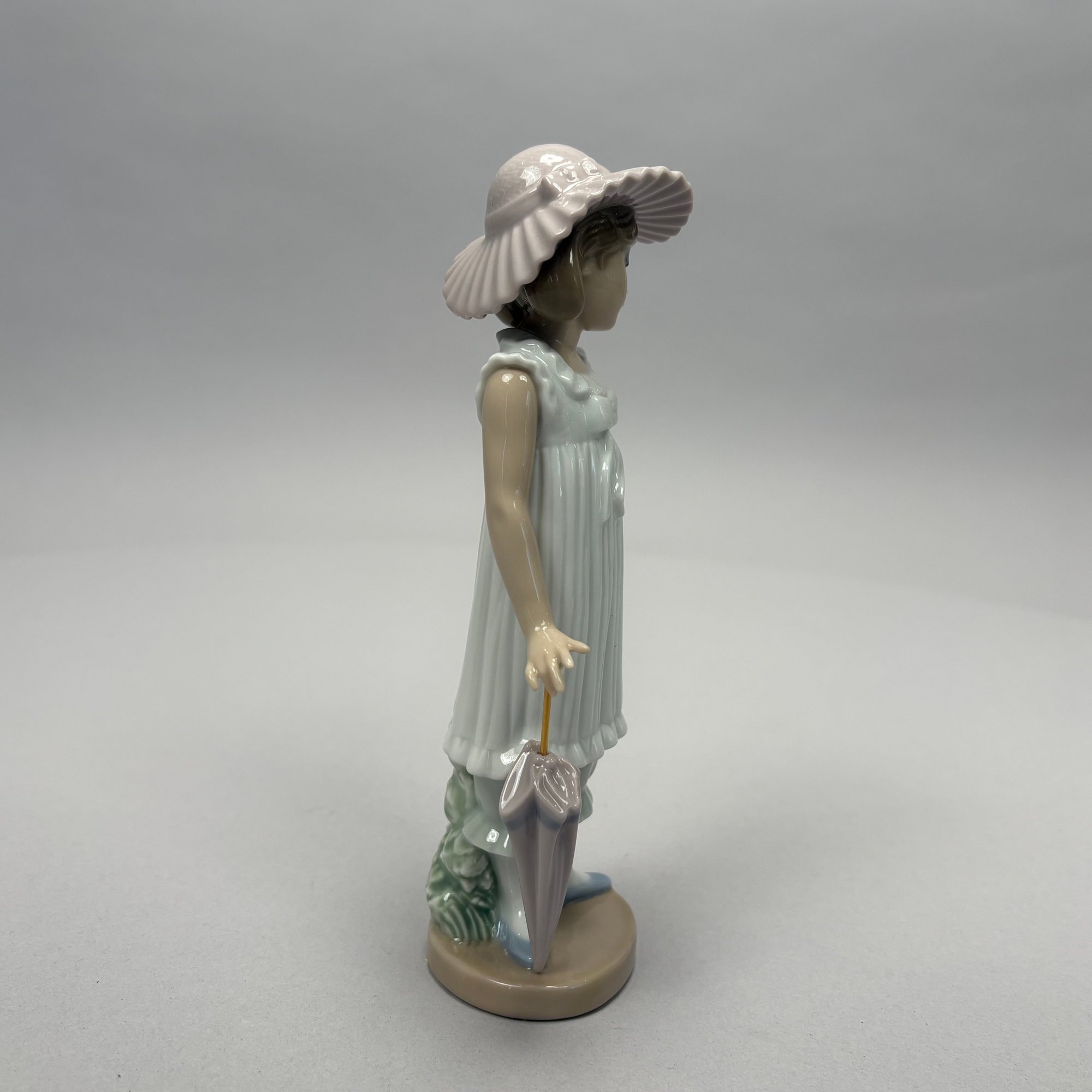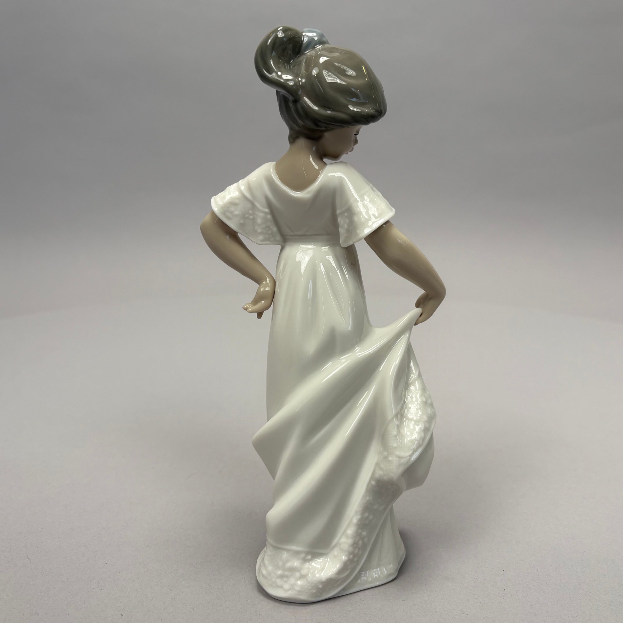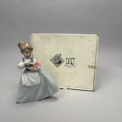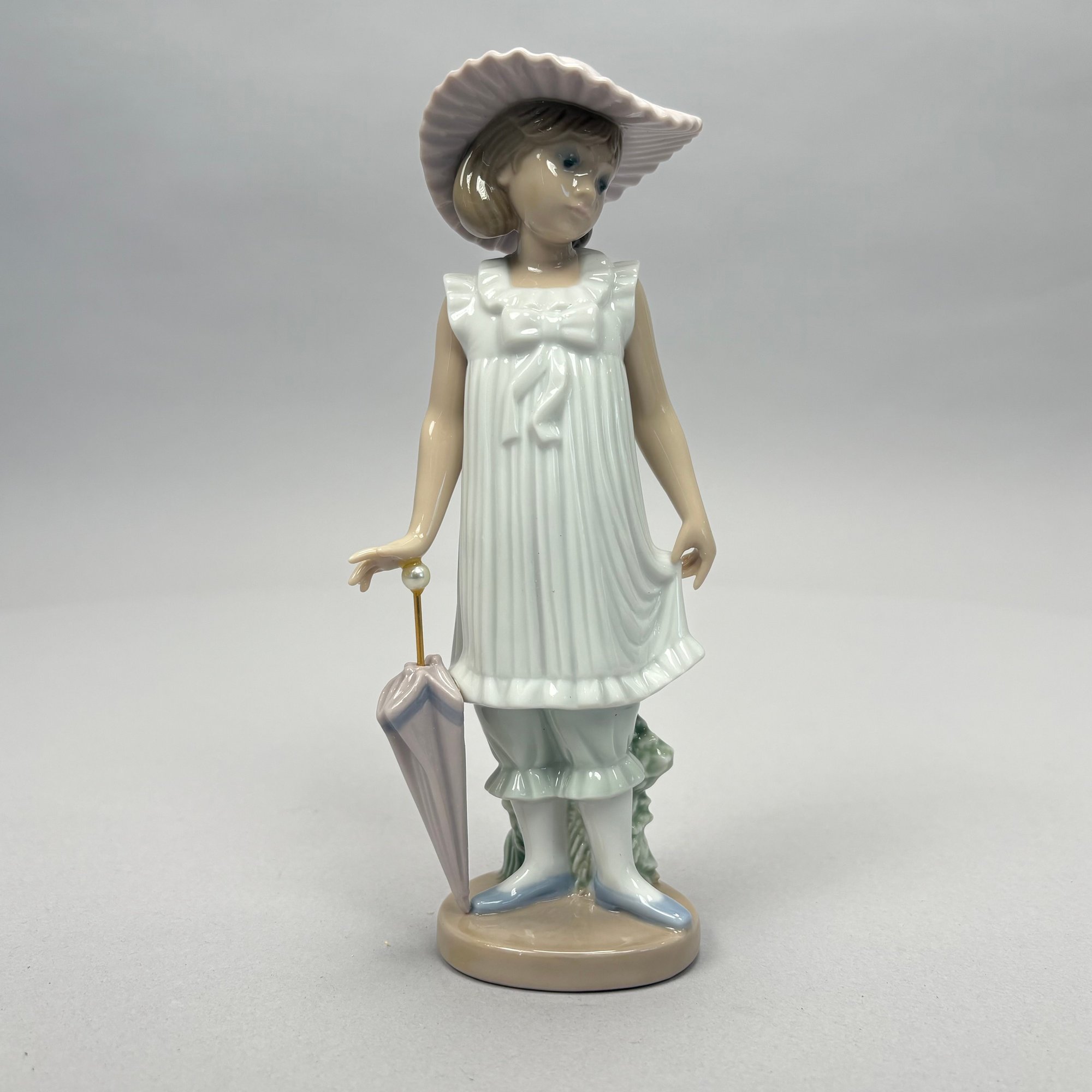 Comprising a Lladro #5457 "Bedtime Story" figure, a Lladro #010.06862 "An Elegant Touch" figure, a Nao by Lladro #495 "Senorita Campestre Ramo", a Nao by Lladro #1110 "Camison con Vuelo" figure, and a Nao by Lladro #1126 "Nina con Paraguas" figure; each housed in the original box.