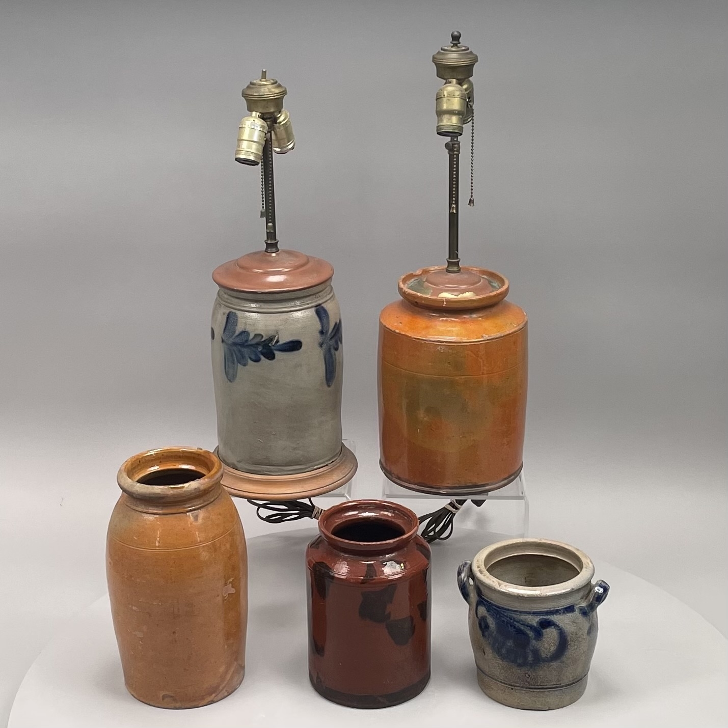 The smallest with applied lug handles and painted on two sides in cobalt blue with a berry flourish, one redware jar spotted in manganese brown.