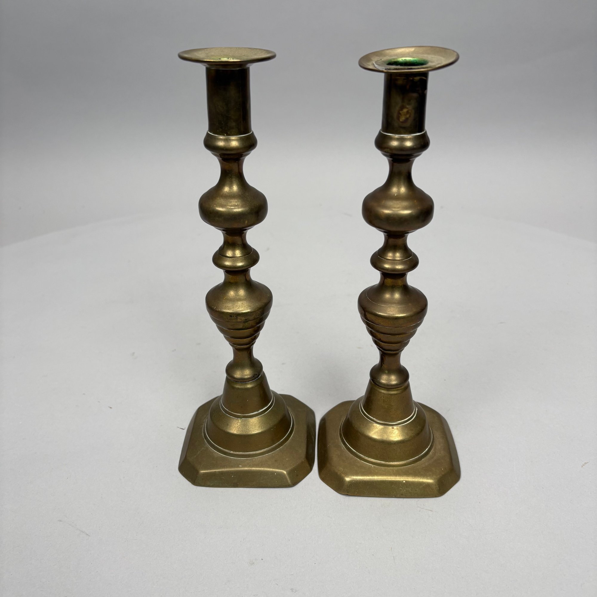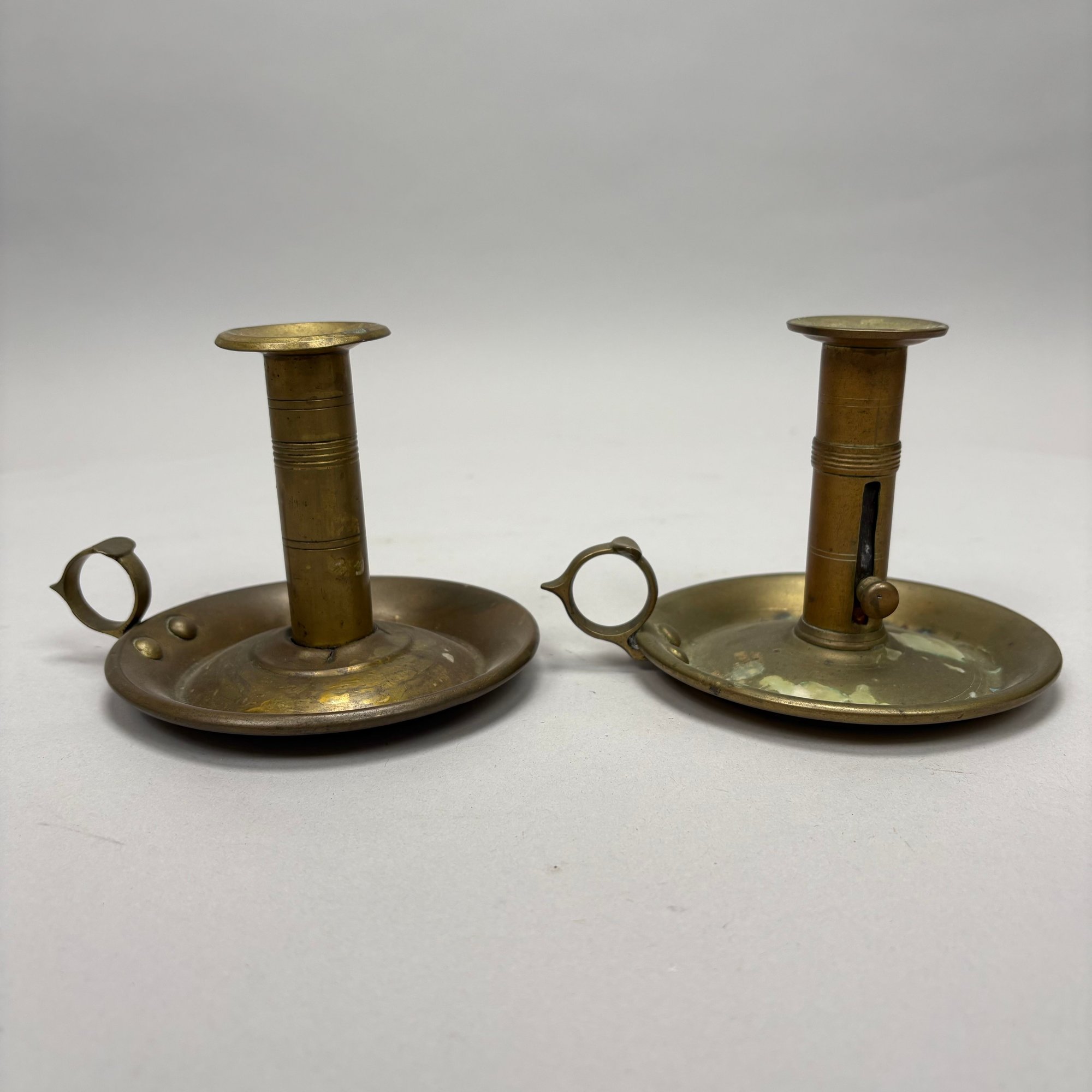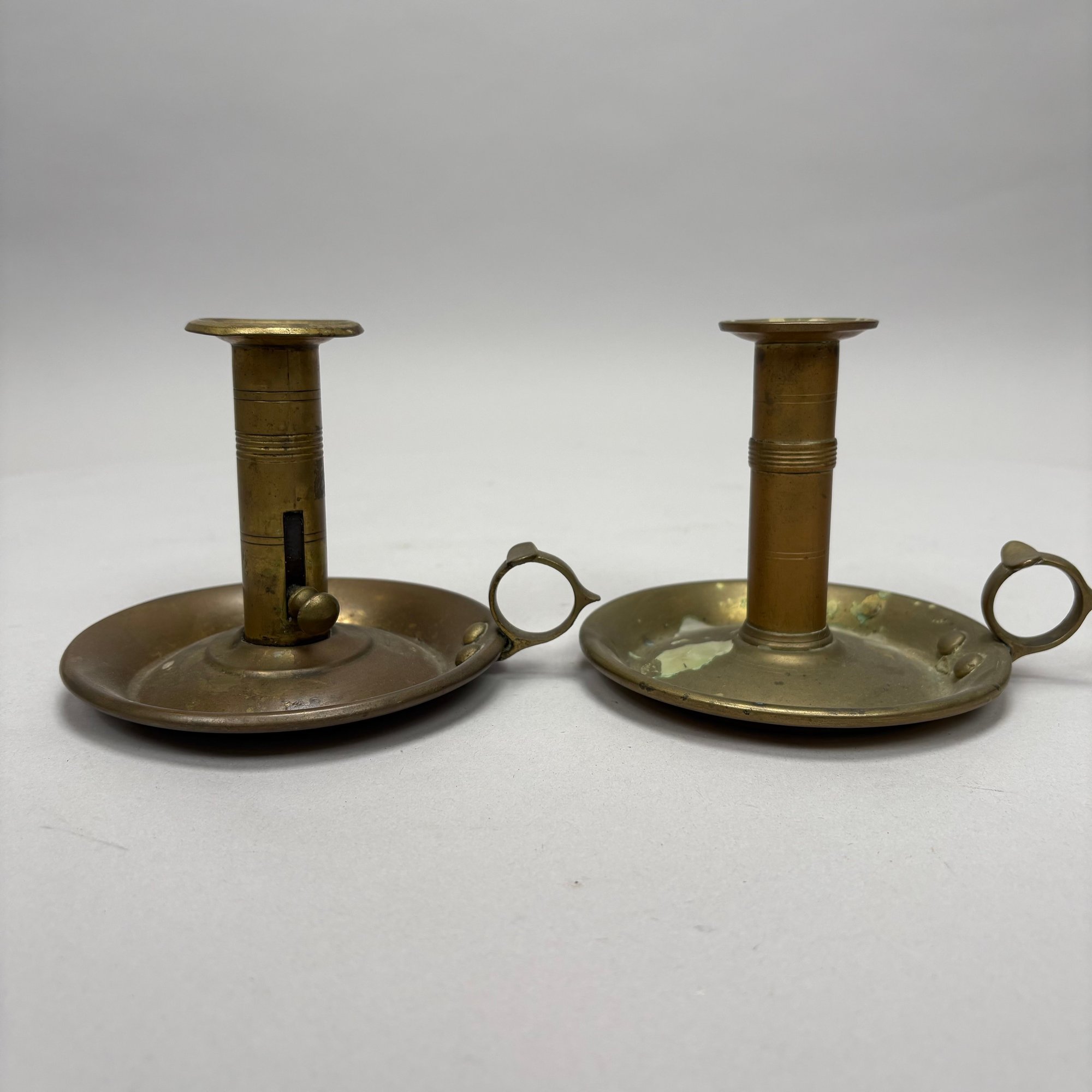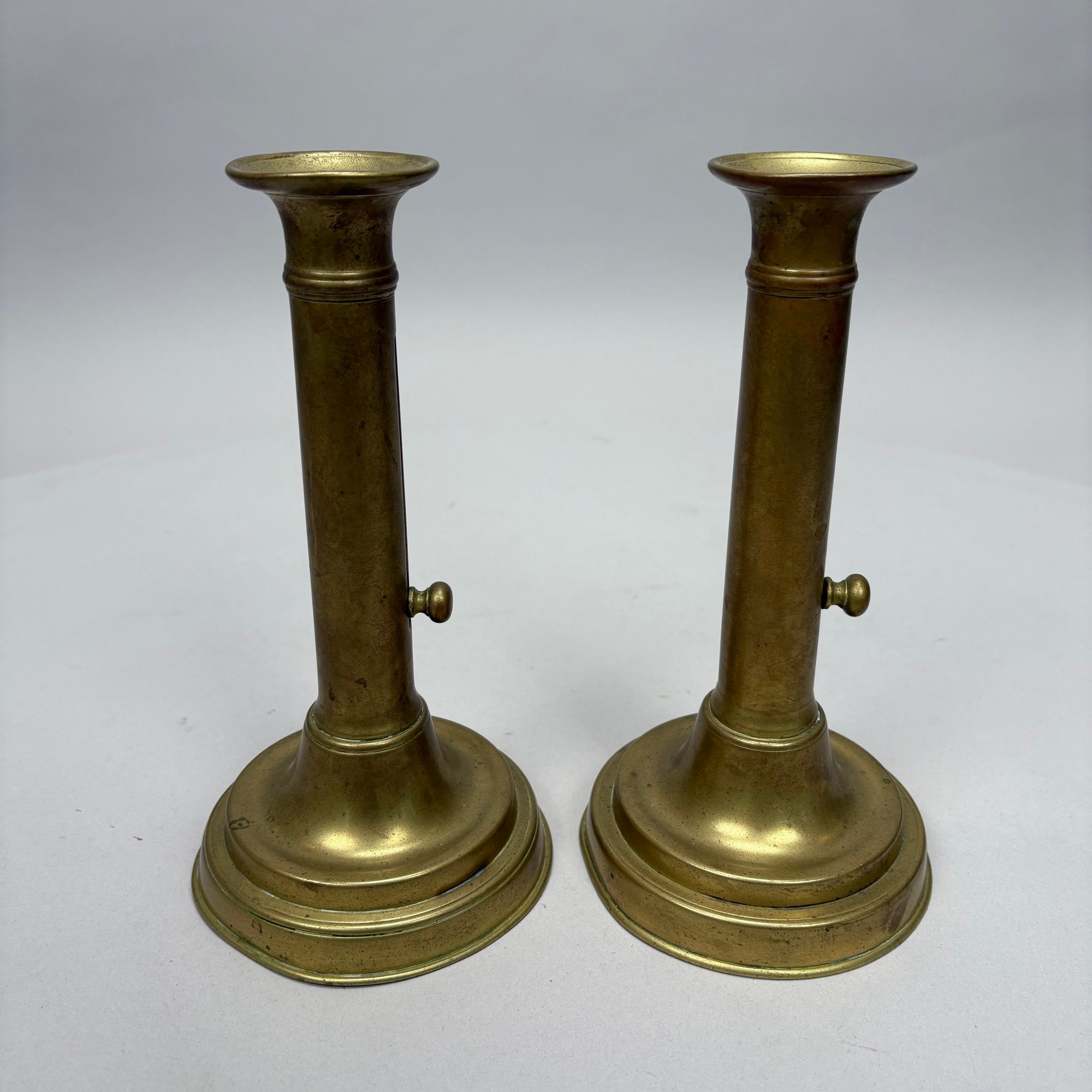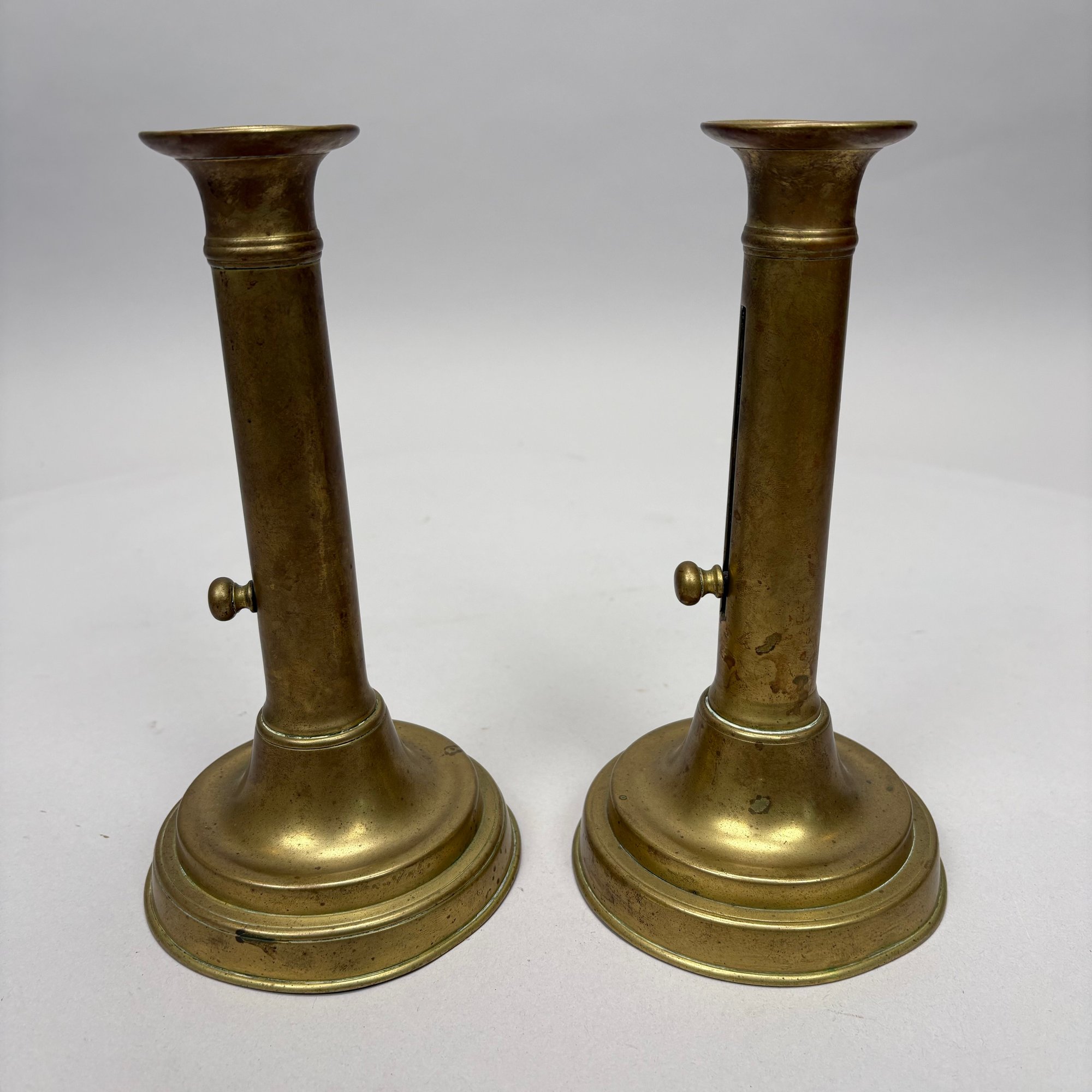 Five Pairs of English Brass Candlesticks. Comprising four push-up candlesticks and a pair of push-up chambersticks.
