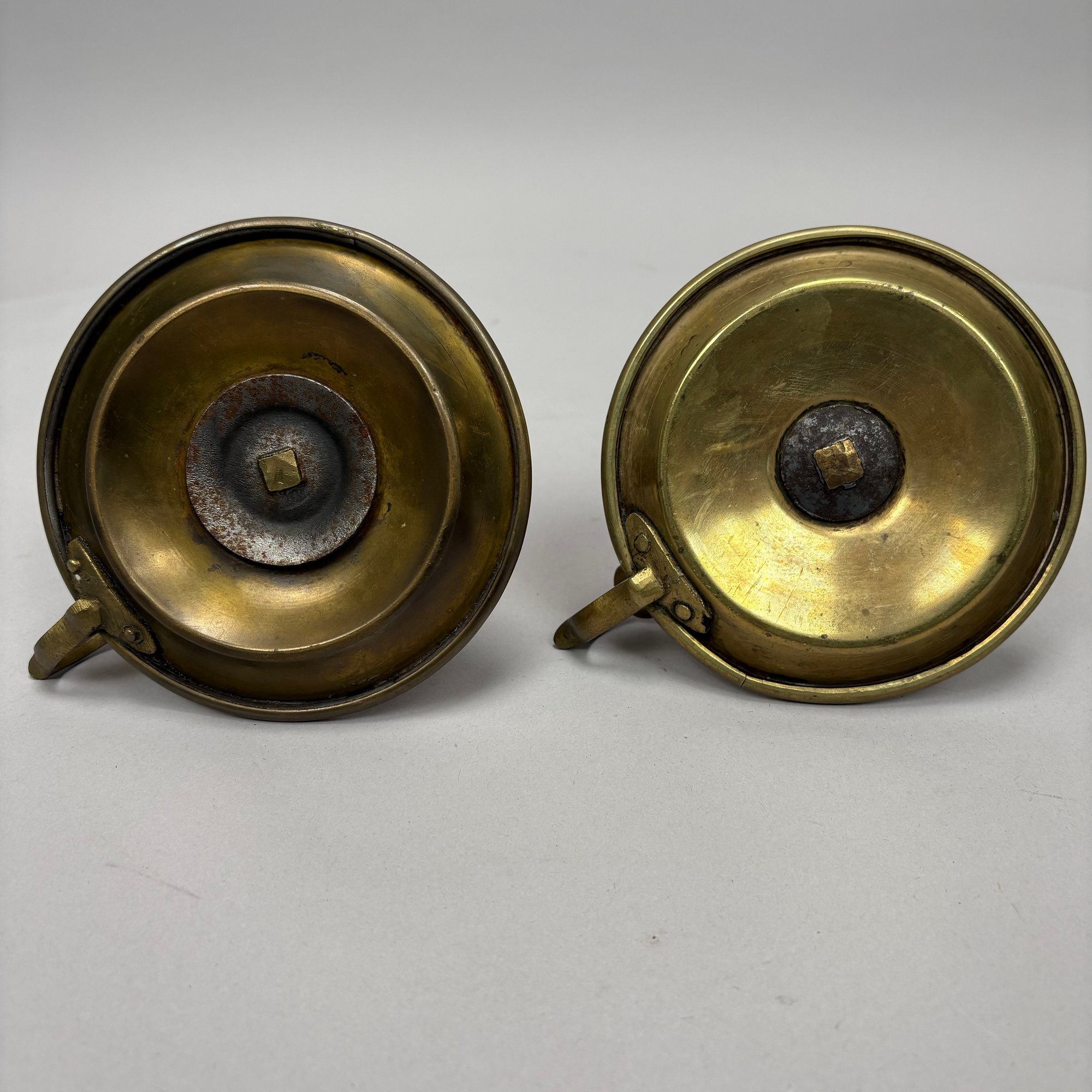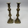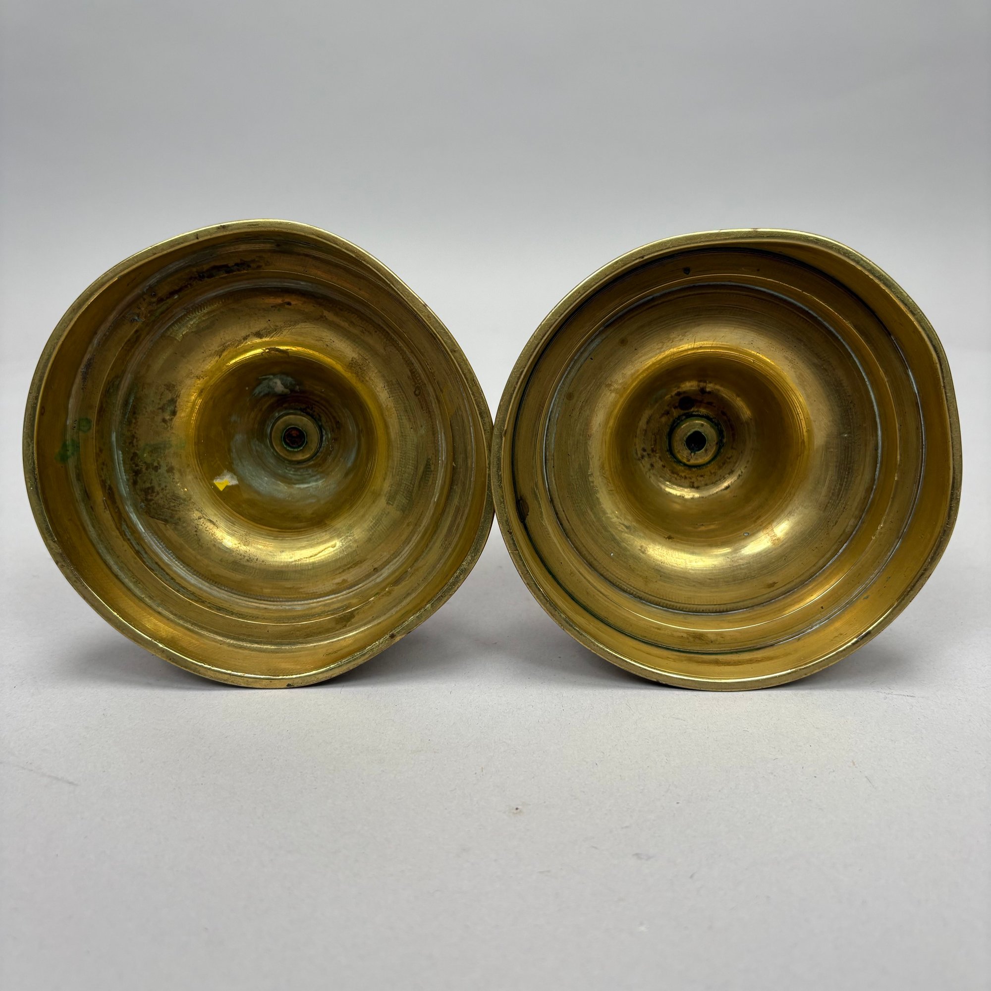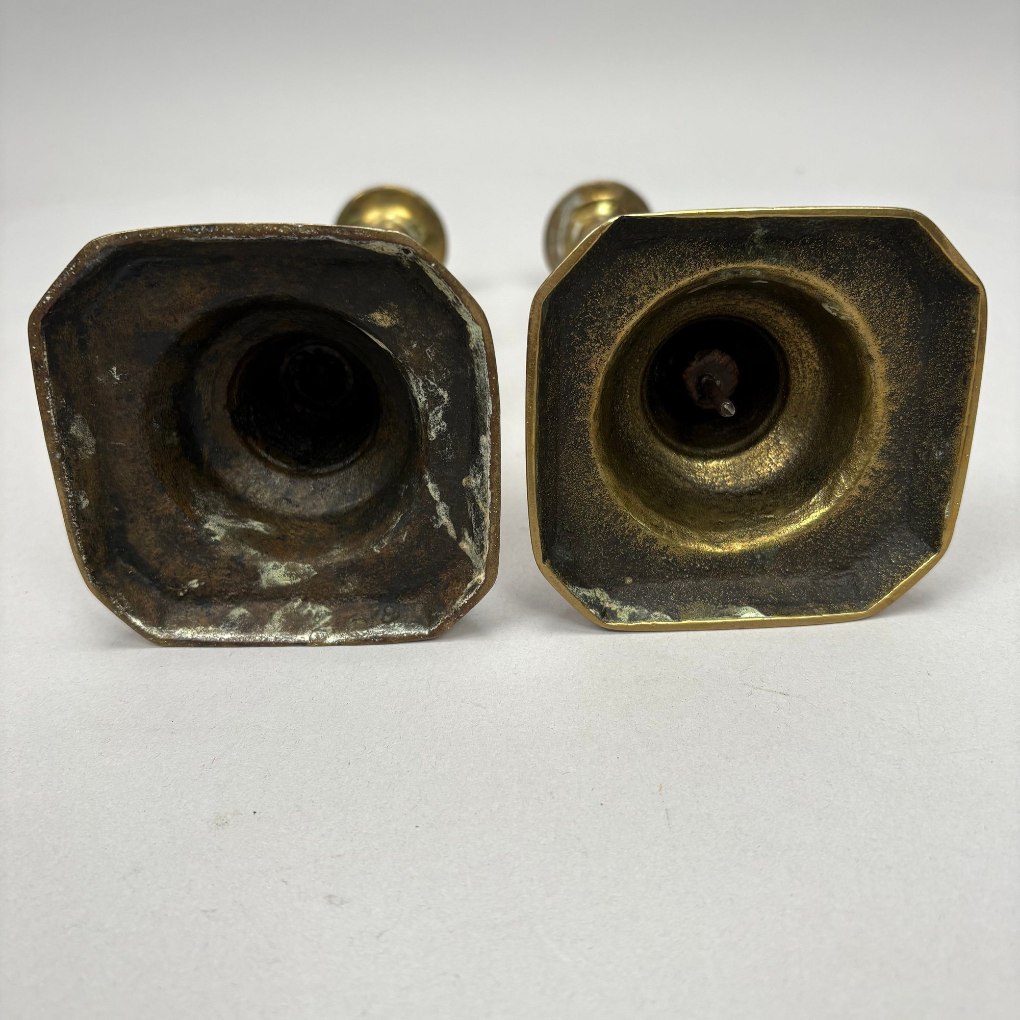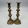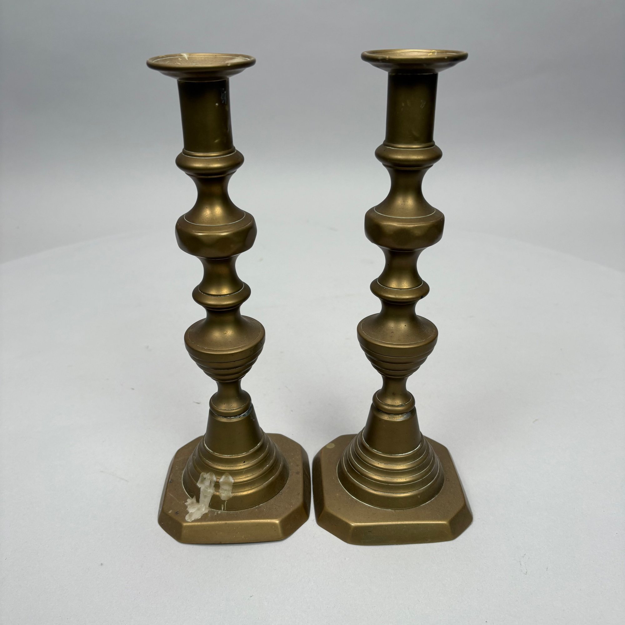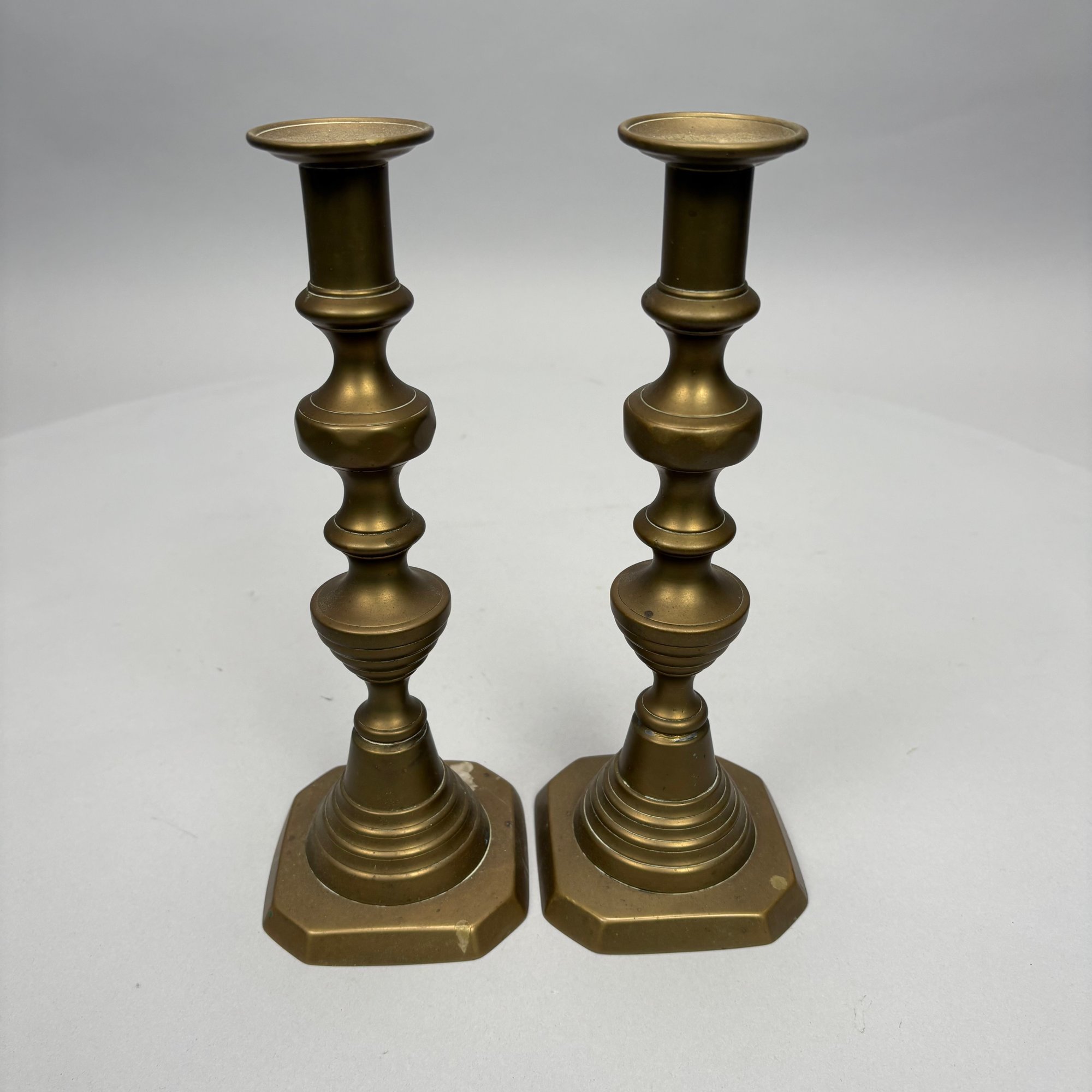 Five Pairs of English Brass Candlesticks. Comprising four push-up candlesticks and a pair of push-up chambersticks.