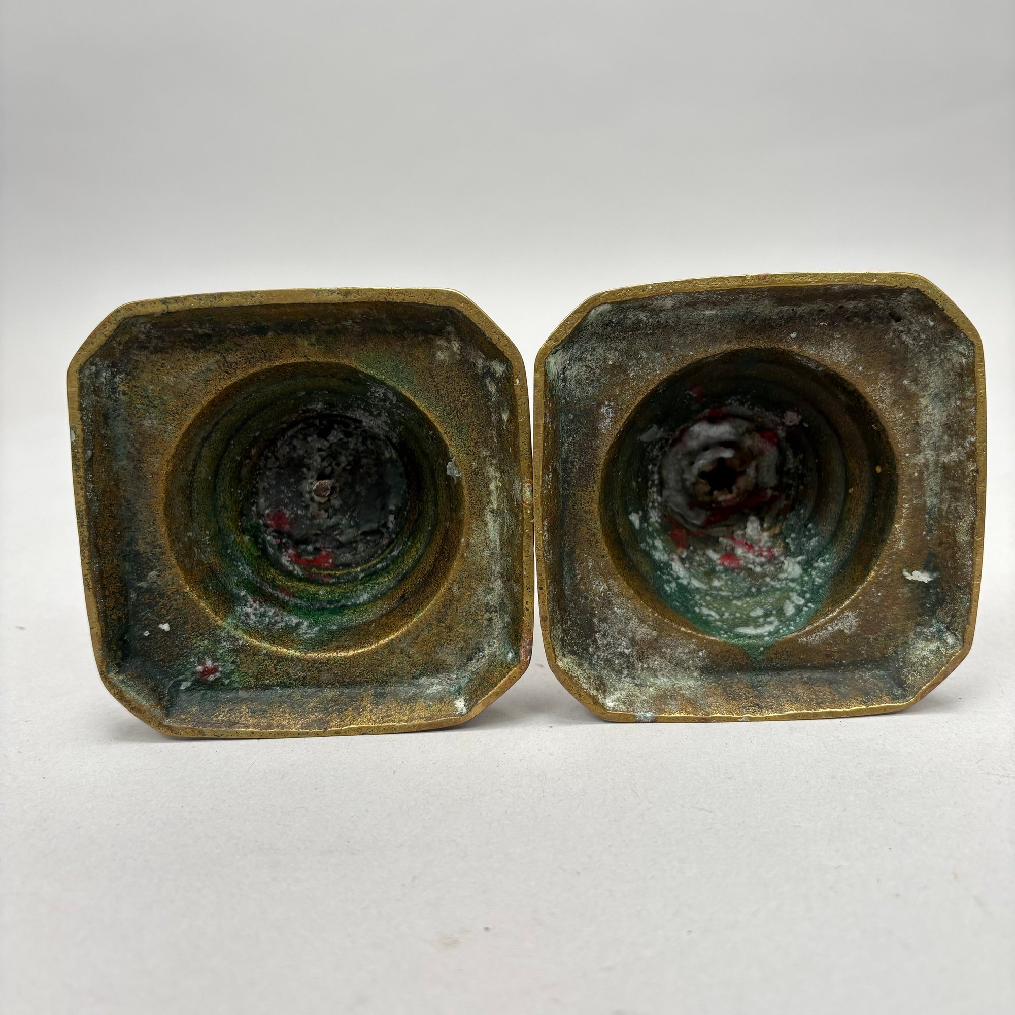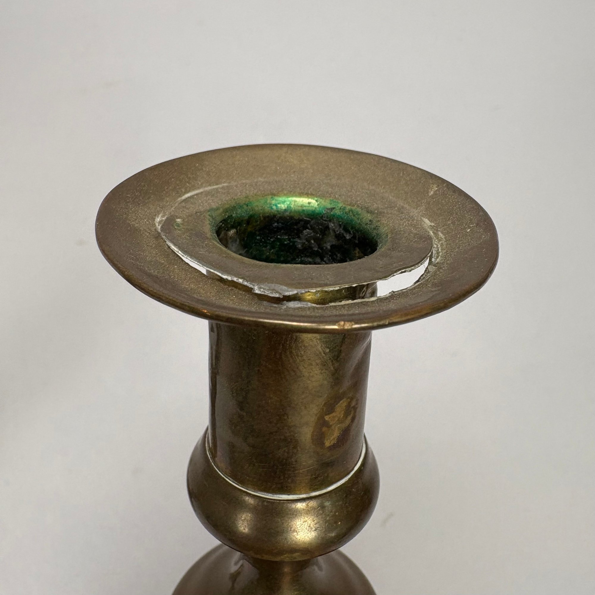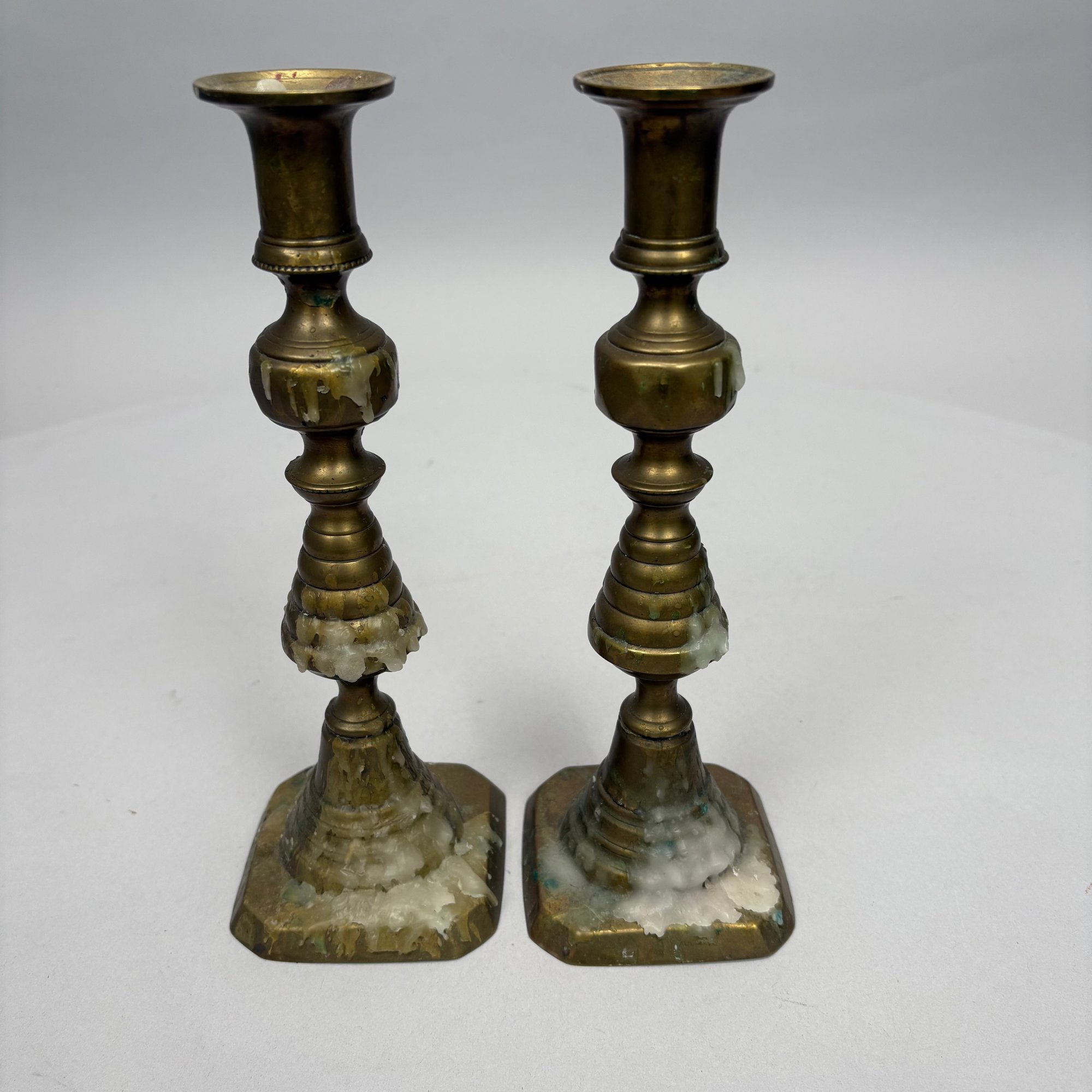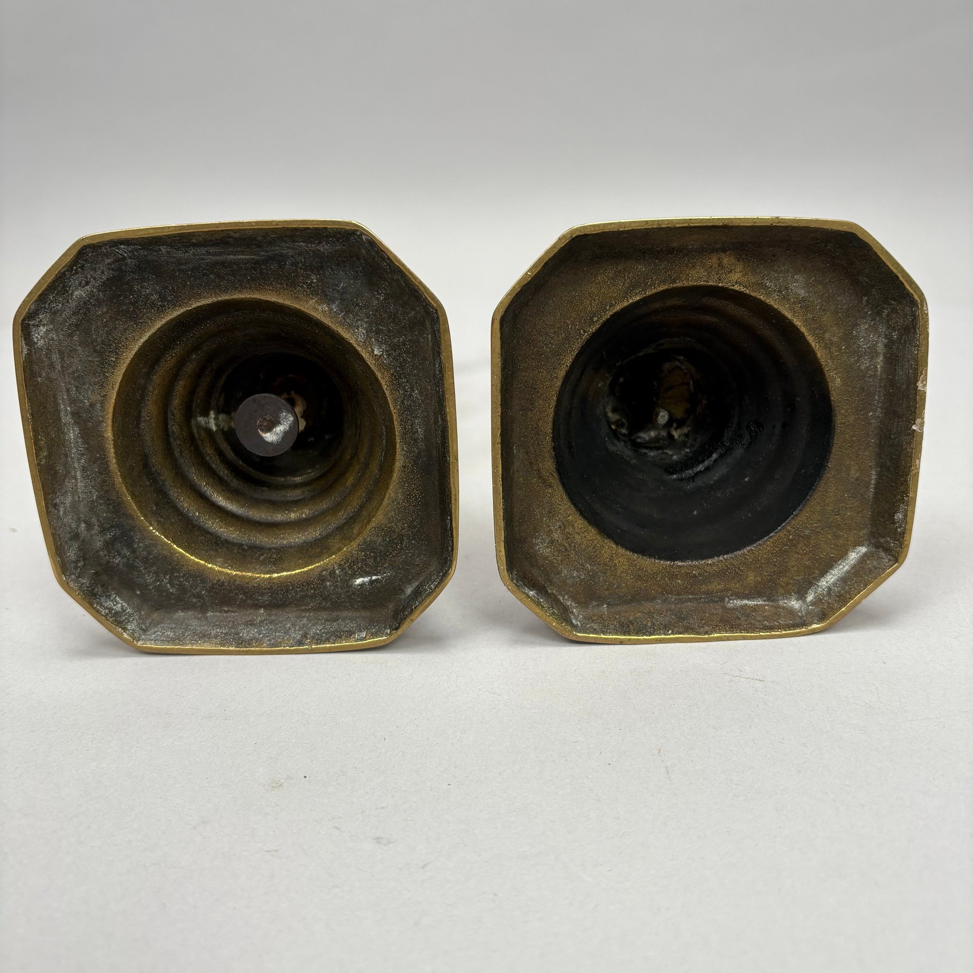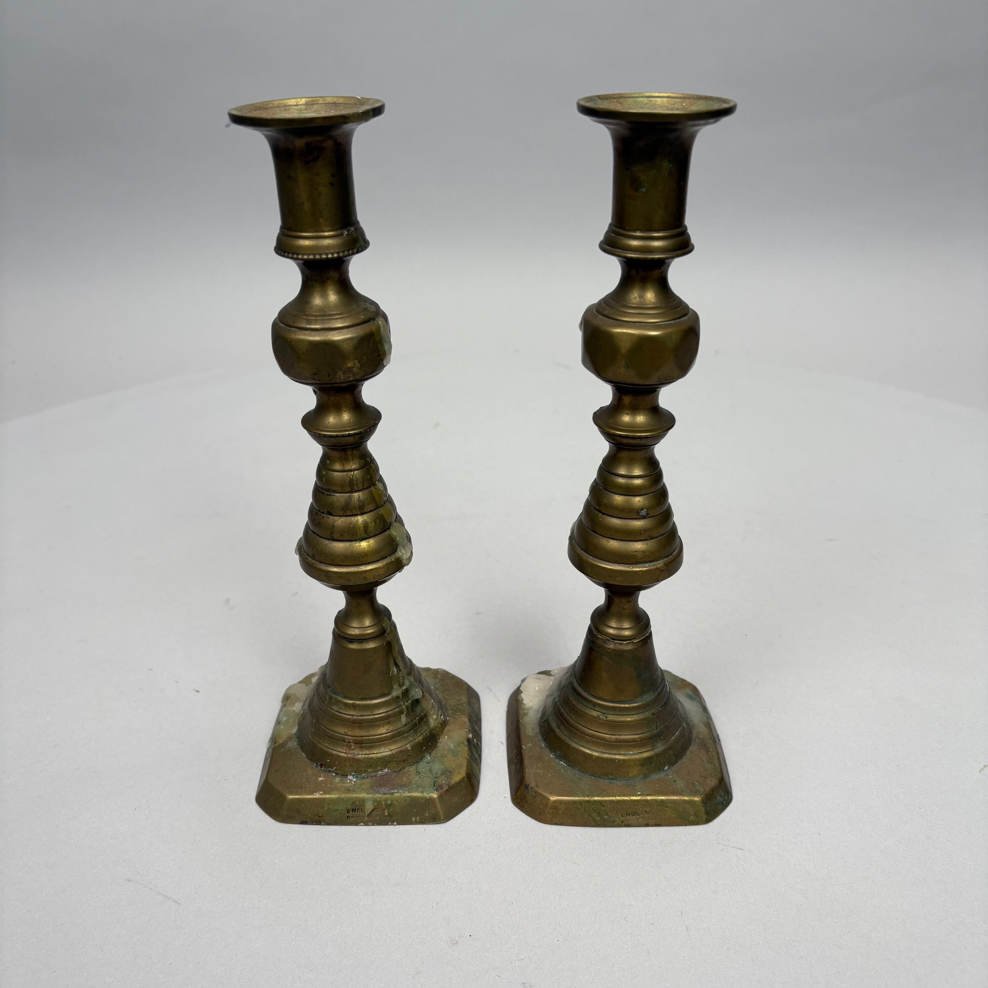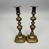 Five Pairs of English Brass Candlesticks. Comprising four push-up candlesticks and a pair of push-up chambersticks.