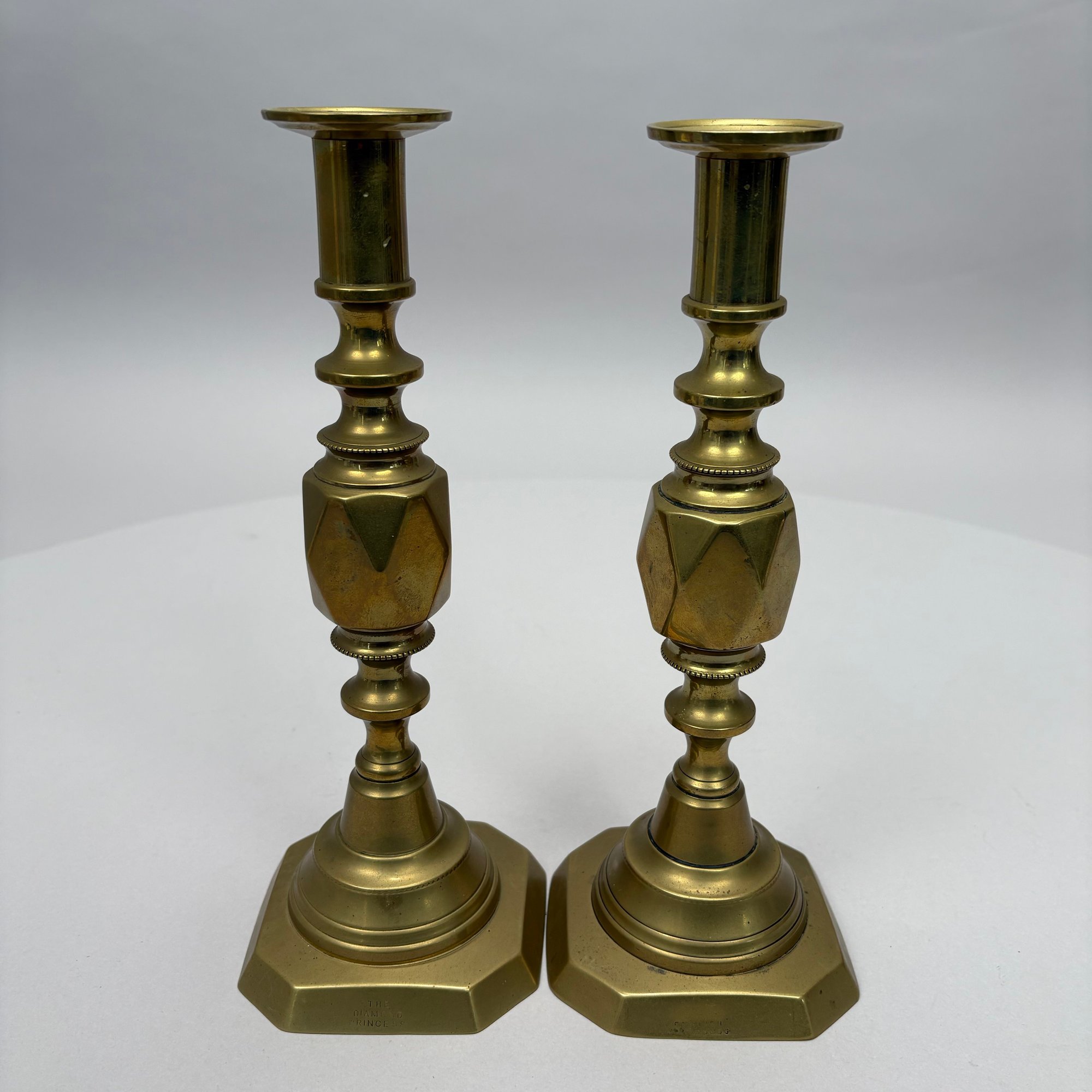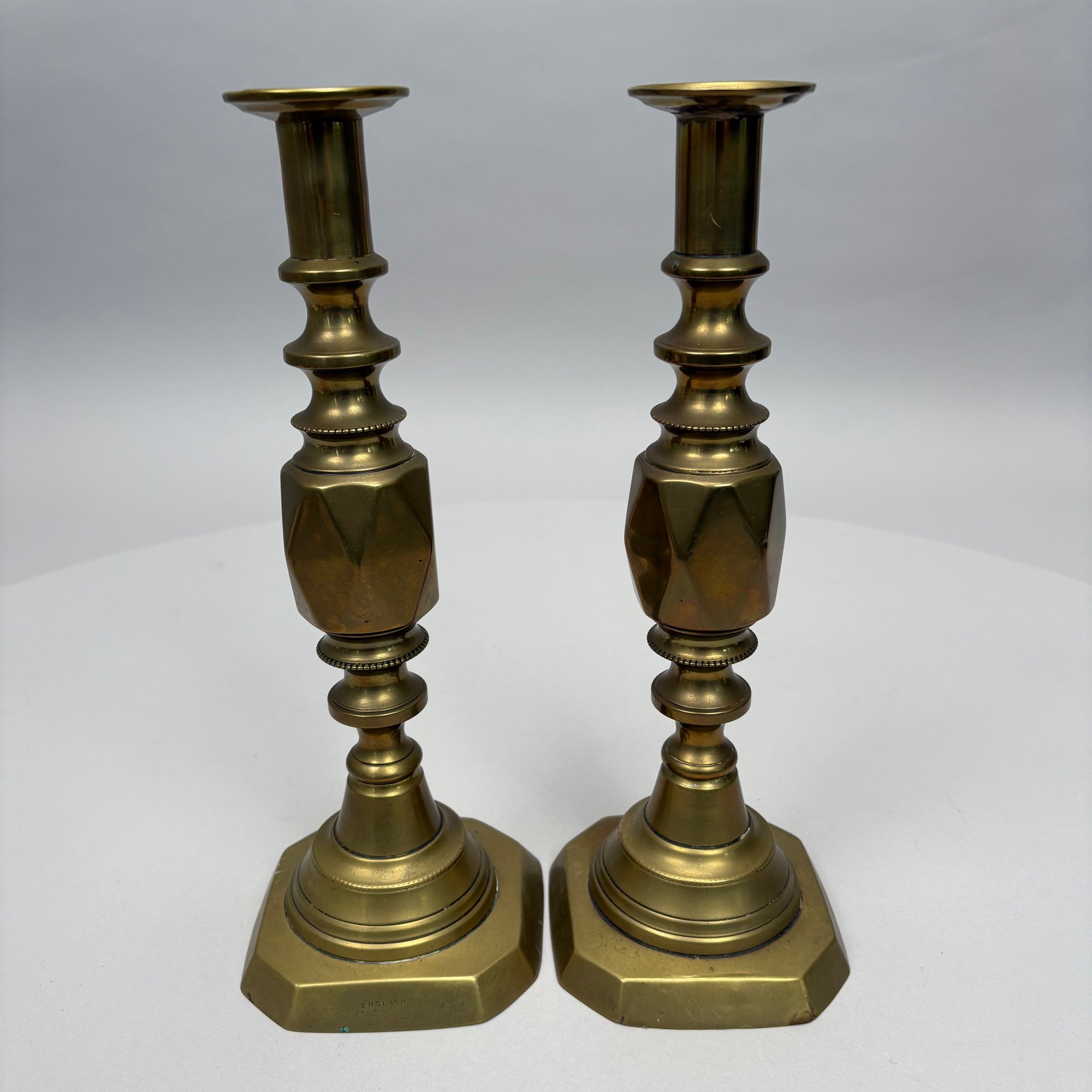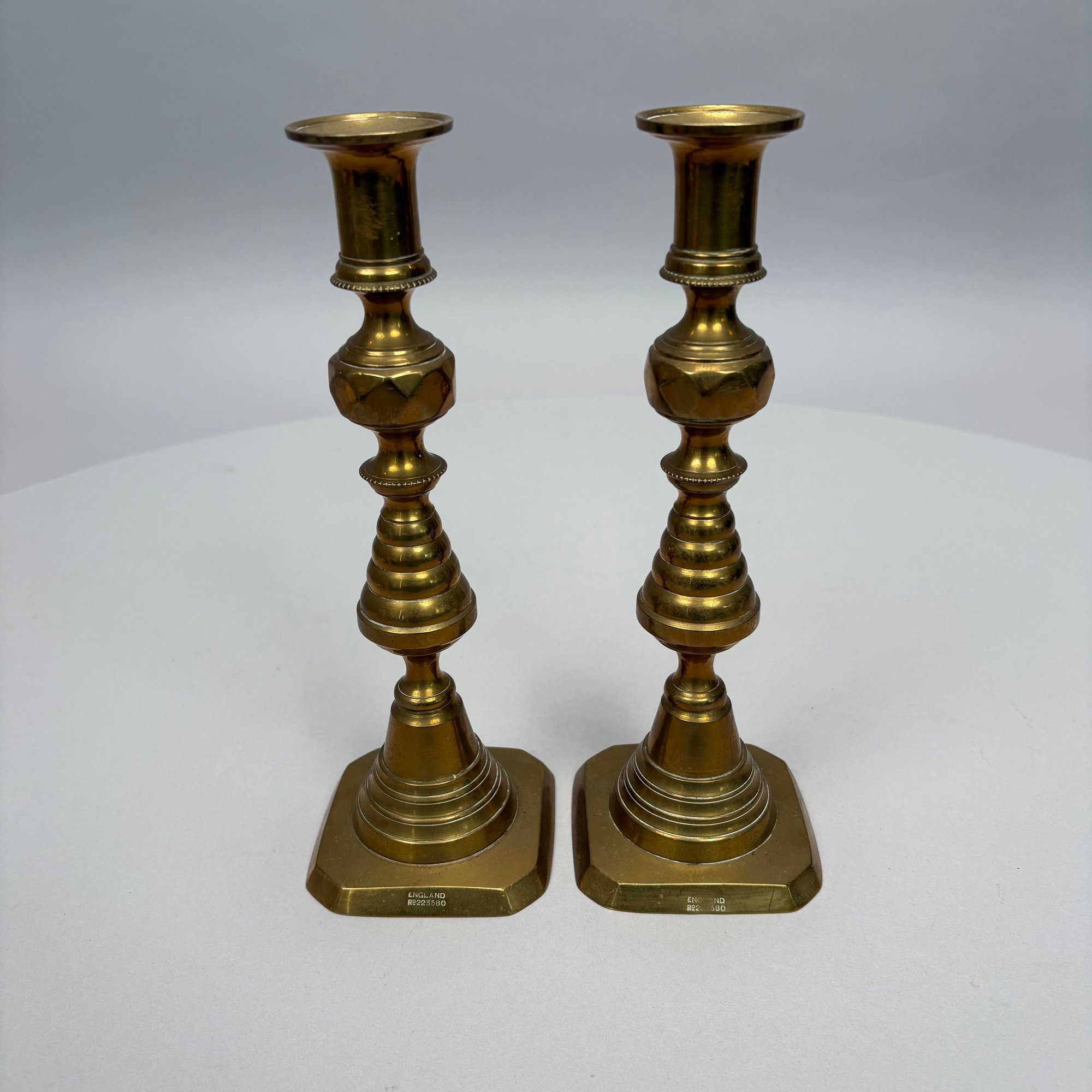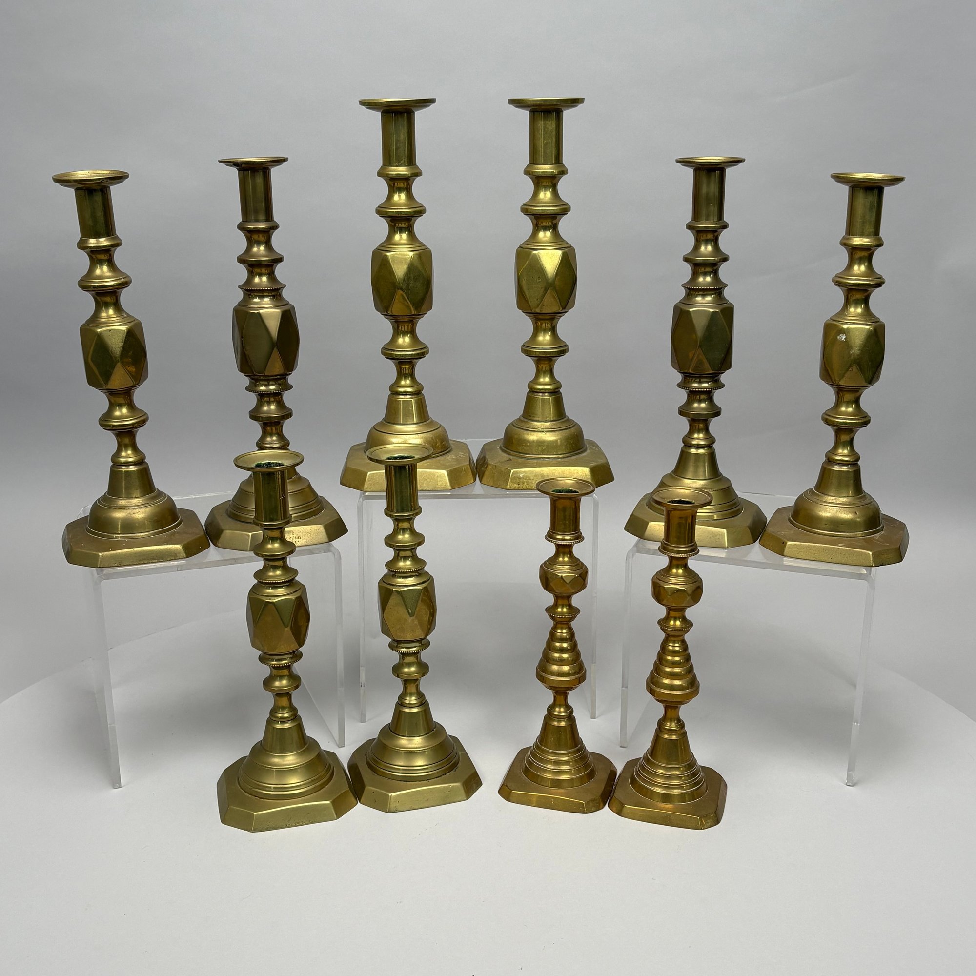 Five Pairs of English Brass Push-Up Candlesticks, 1897-1940. Comprising a pair marked "THE KING OF DIAMONDS," a pair marked "THE QUEEN OF DIAMONDS," a pair marked "THE DIAMOND PRINCE" and a pair marked "THE DIAMOND PRINCESS," the last two pairs with worn maker's marks "ENGLISH/ RD385856;" and a pair of 'Beehive' candlesticks, each marked "ENGLAND/ RD223580."