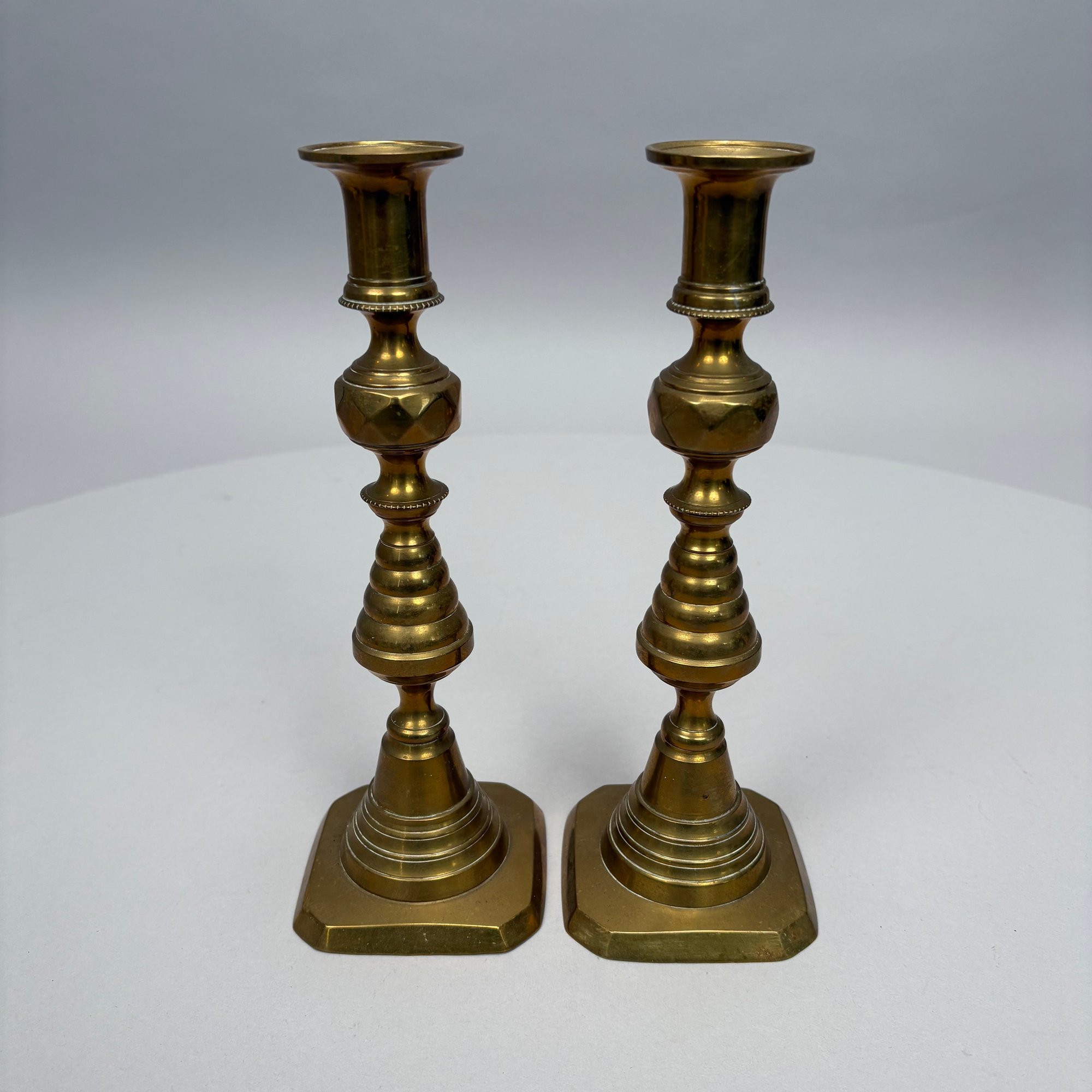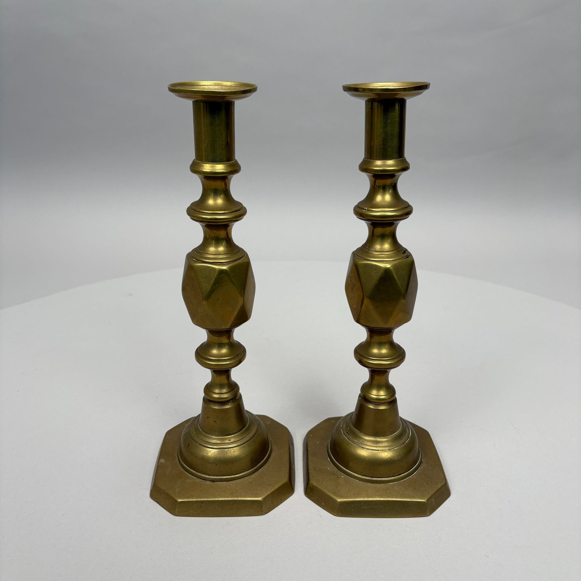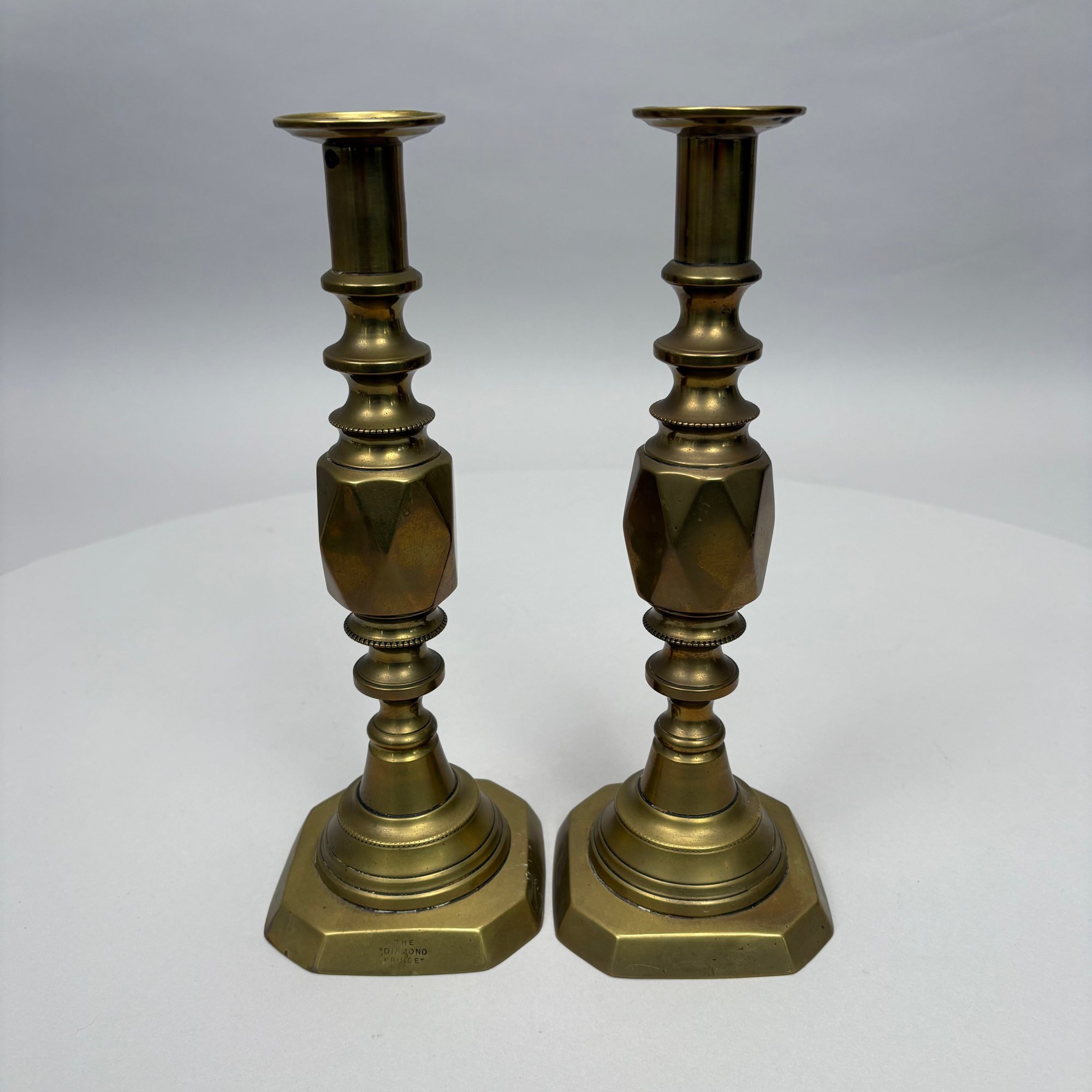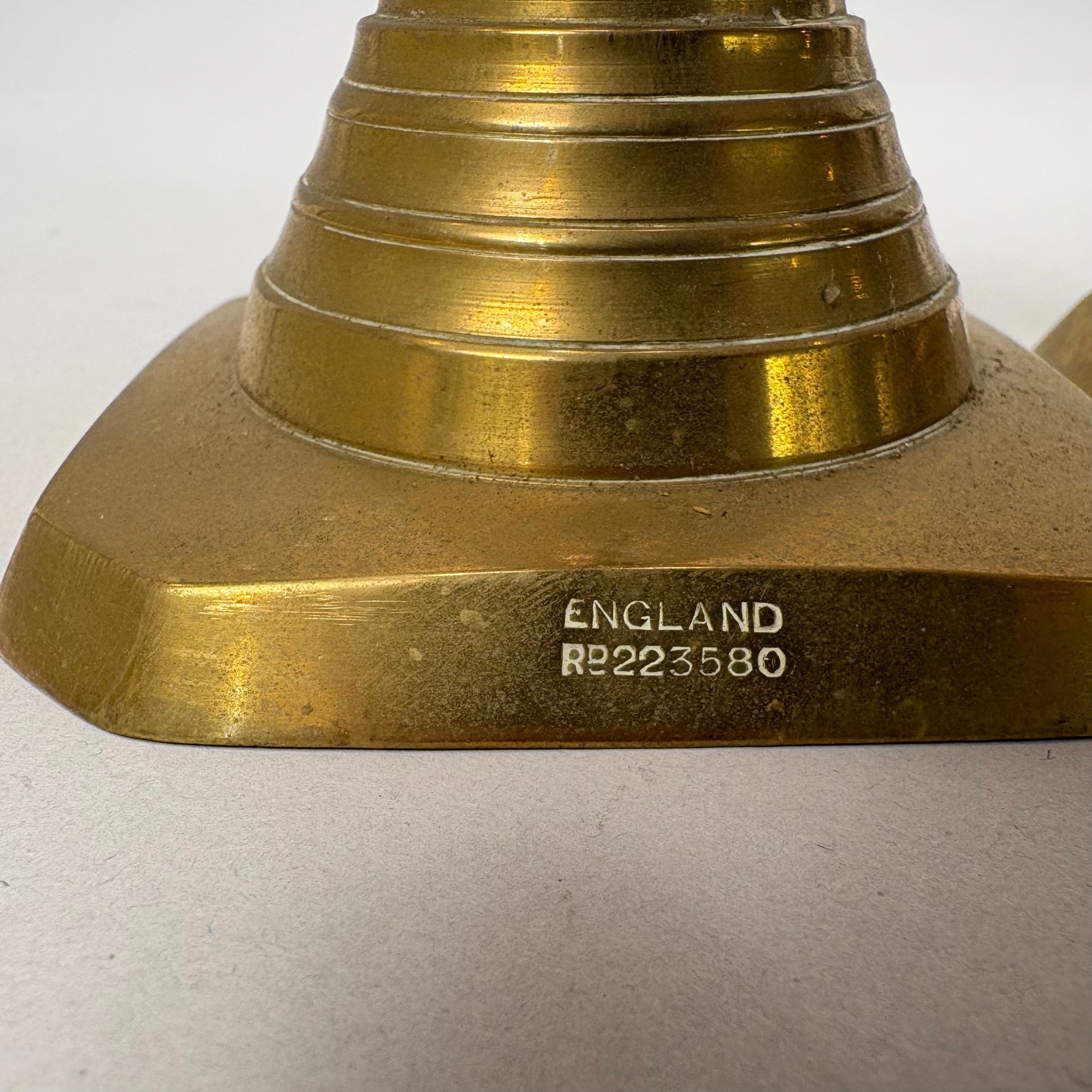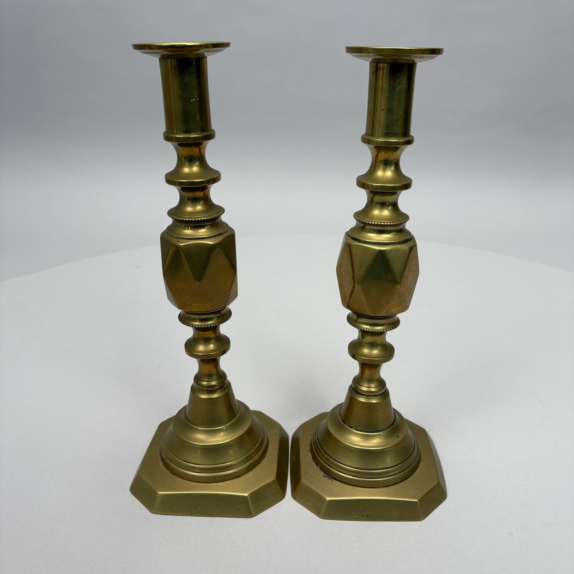 Five Pairs of English Brass Push-Up Candlesticks, 1897-1940. Comprising a pair marked "THE KING OF DIAMONDS," a pair marked "THE QUEEN OF DIAMONDS," a pair marked "THE DIAMOND PRINCE" and a pair marked "THE DIAMOND PRINCESS," the last two pairs with worn maker's marks "ENGLISH/ RD385856;" and a pair of 'Beehive' candlesticks, each marked "ENGLAND/ RD223580."