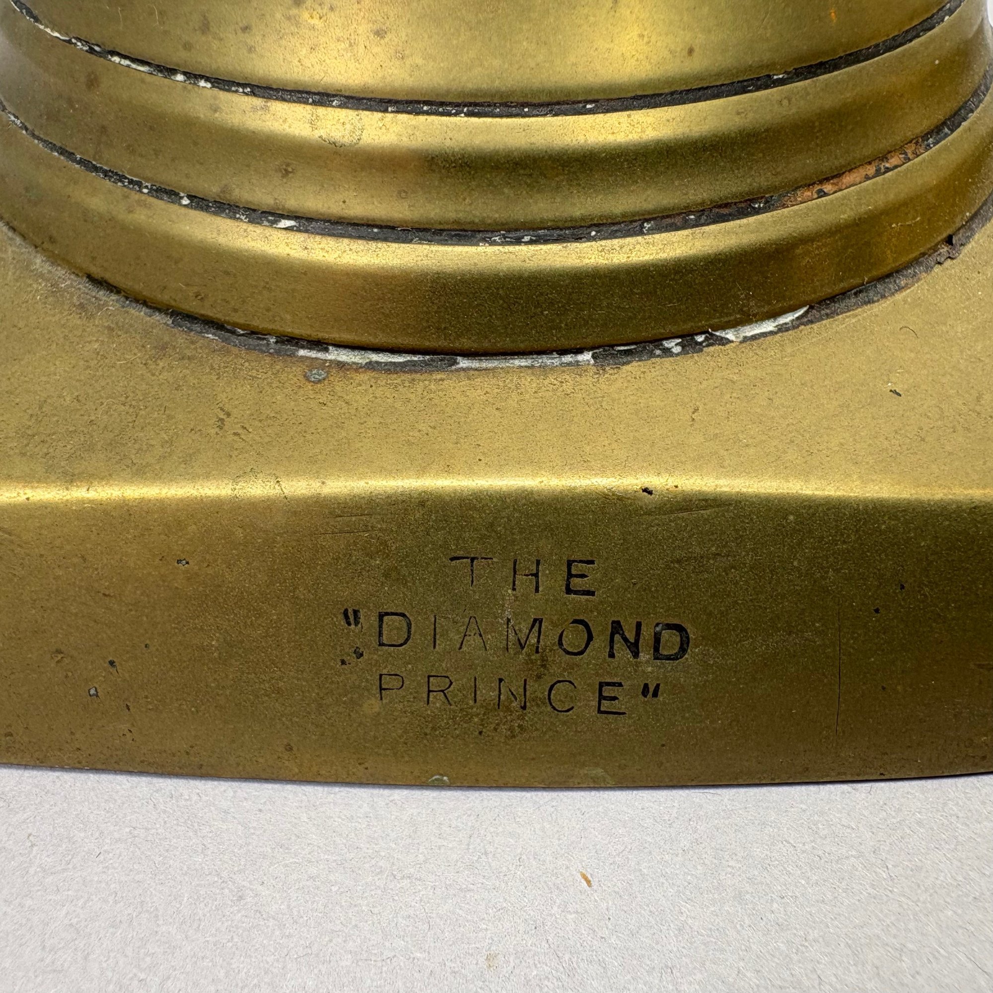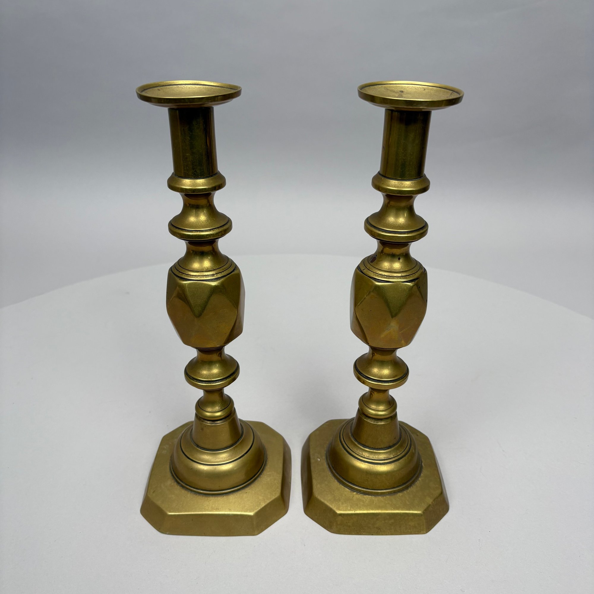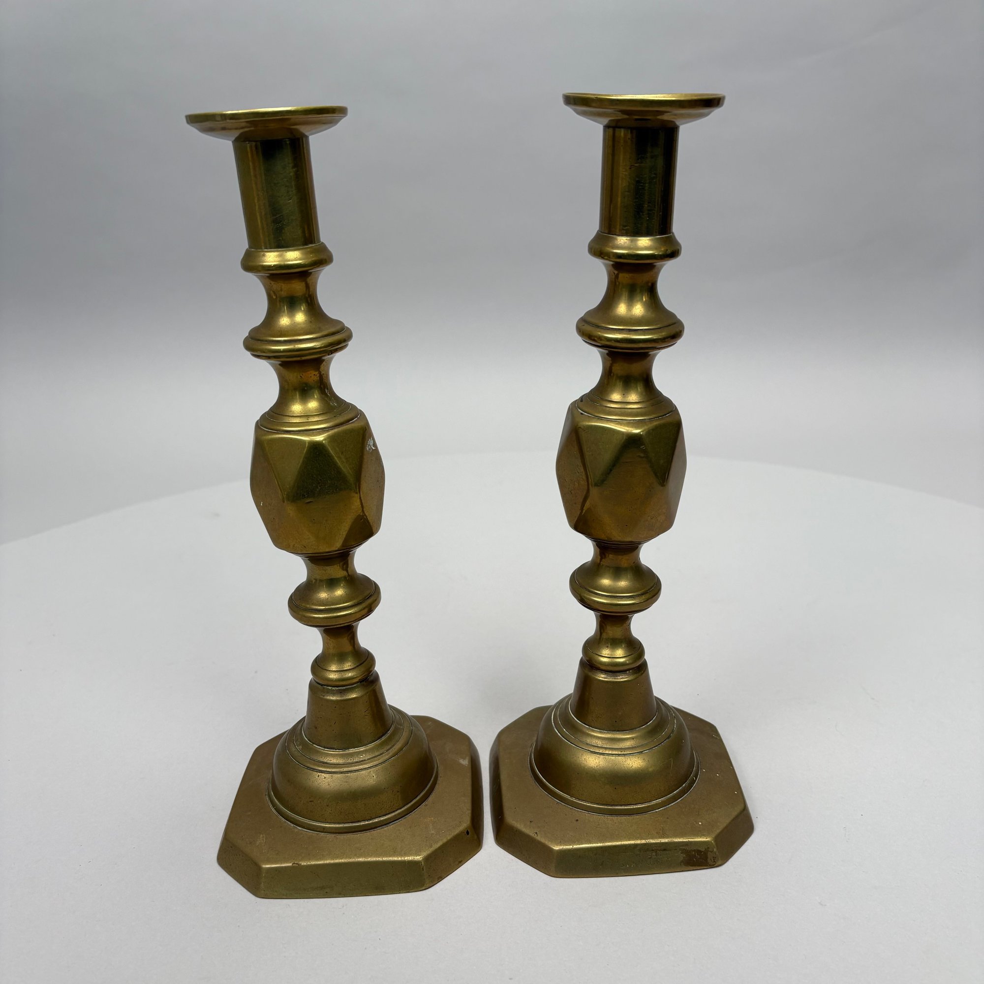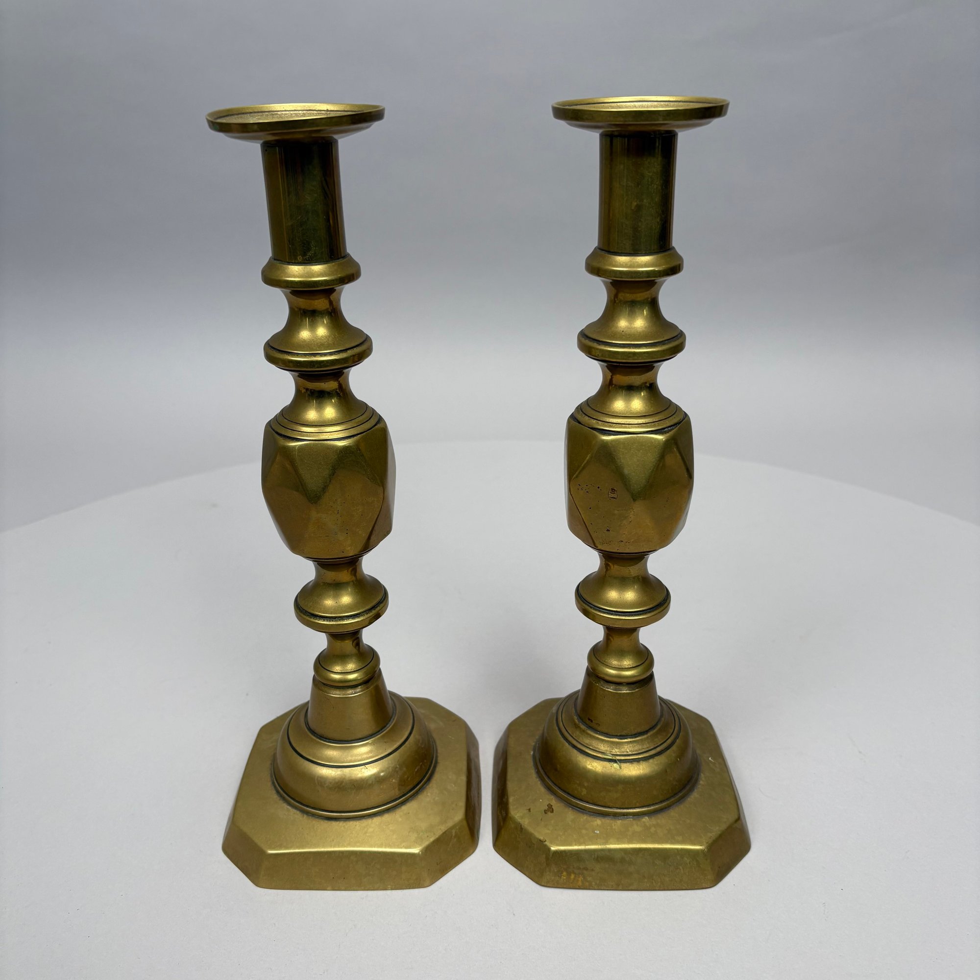 Five Pairs of English Brass Push-Up Candlesticks, 1897-1940. Comprising a pair marked "THE KING OF DIAMONDS," a pair marked "THE QUEEN OF DIAMONDS," a pair marked "THE DIAMOND PRINCE" and a pair marked "THE DIAMOND PRINCESS," the last two pairs with worn maker's marks "ENGLISH/ RD385856;" and a pair of 'Beehive' candlesticks, each marked "ENGLAND/ RD223580."