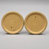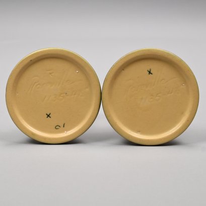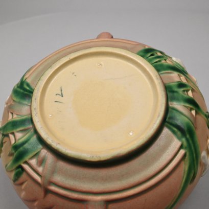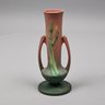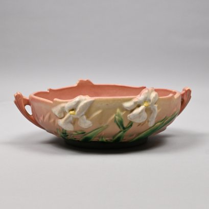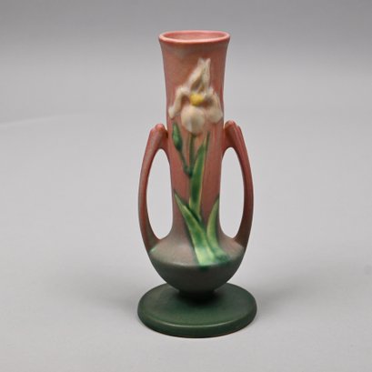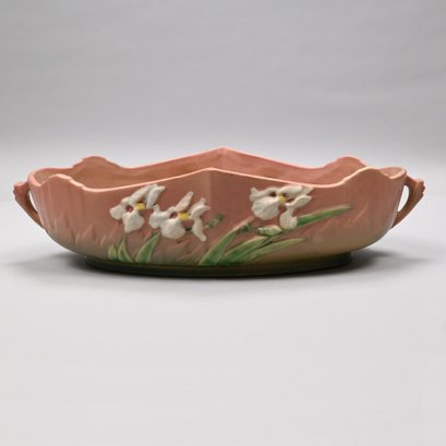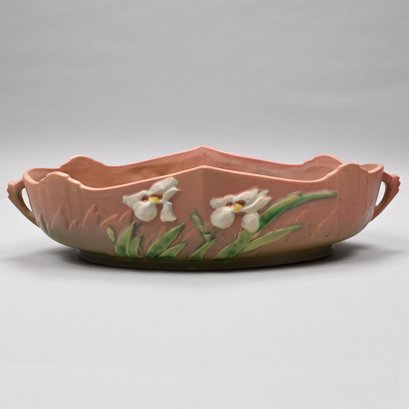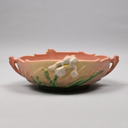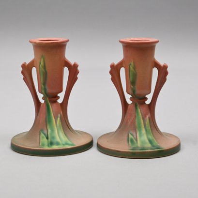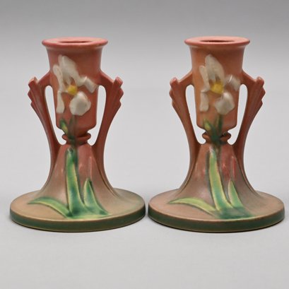 Five Roseville 'Iris' Candleholders, Console Bowls and a Vase, Zanesville, Ohio, Introduced in 1938. In Roseville's pink glaze, comprising a #304-14 console bowl, a #361-8 console bowl, a #918-7 bud vase, and a pair of #1135-4 1/4 candlesticks, each incised "Roseville" and with the above listed shape numbers.