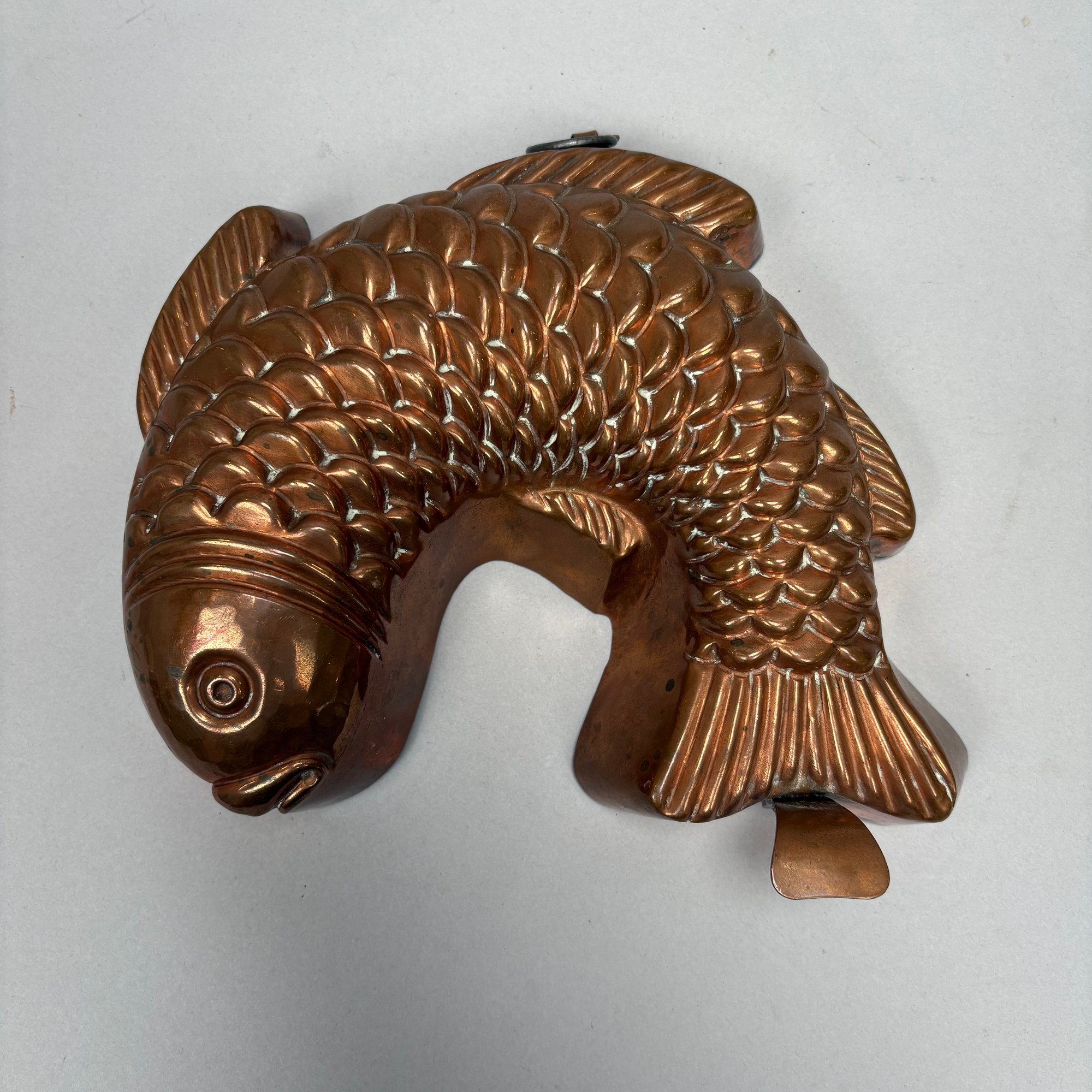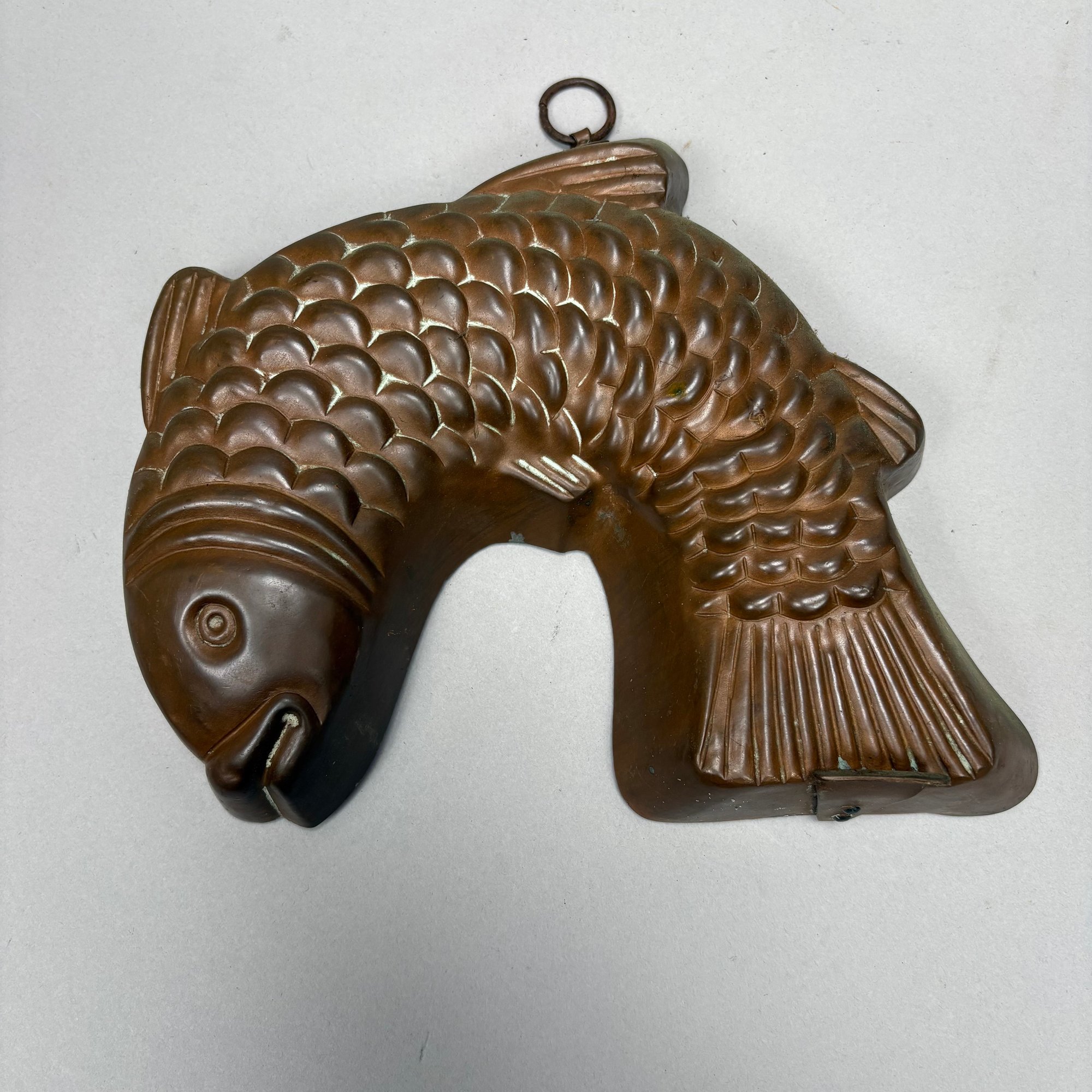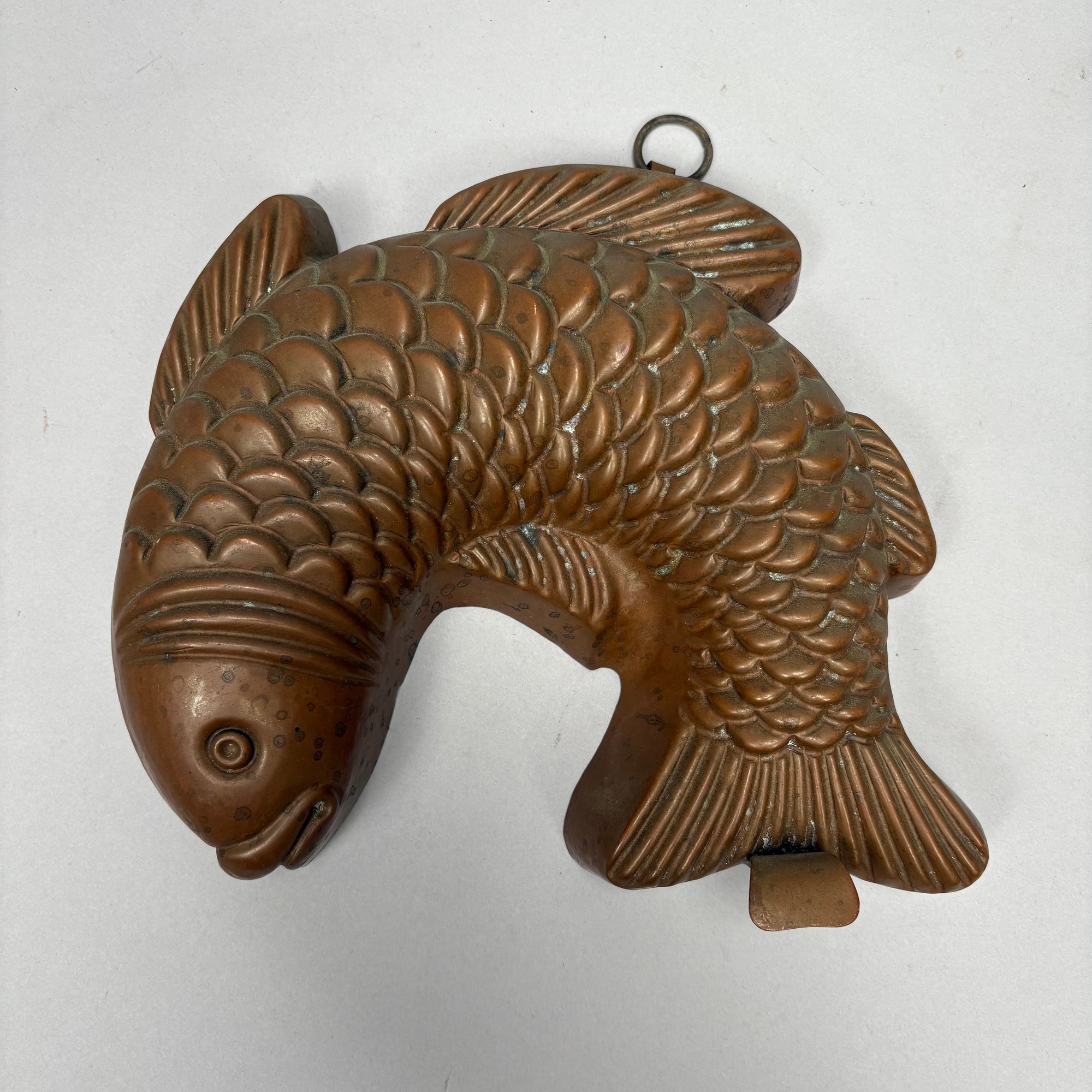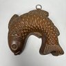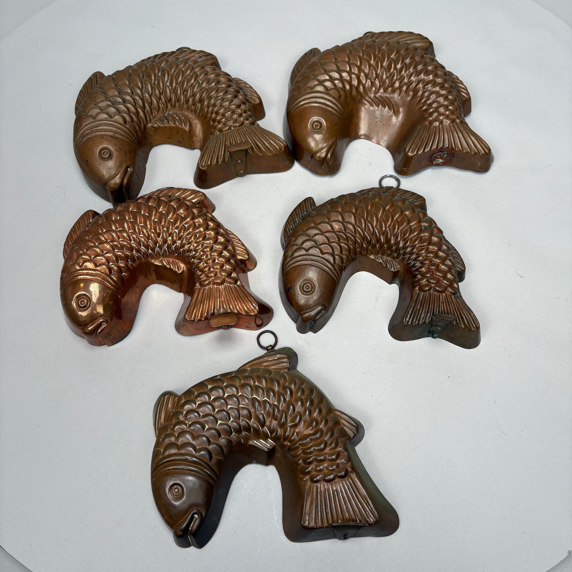 Five Tin-Lined Copper Jumping Fish Molds, 20th Century. Each with a hanging loop and four each with a handle.